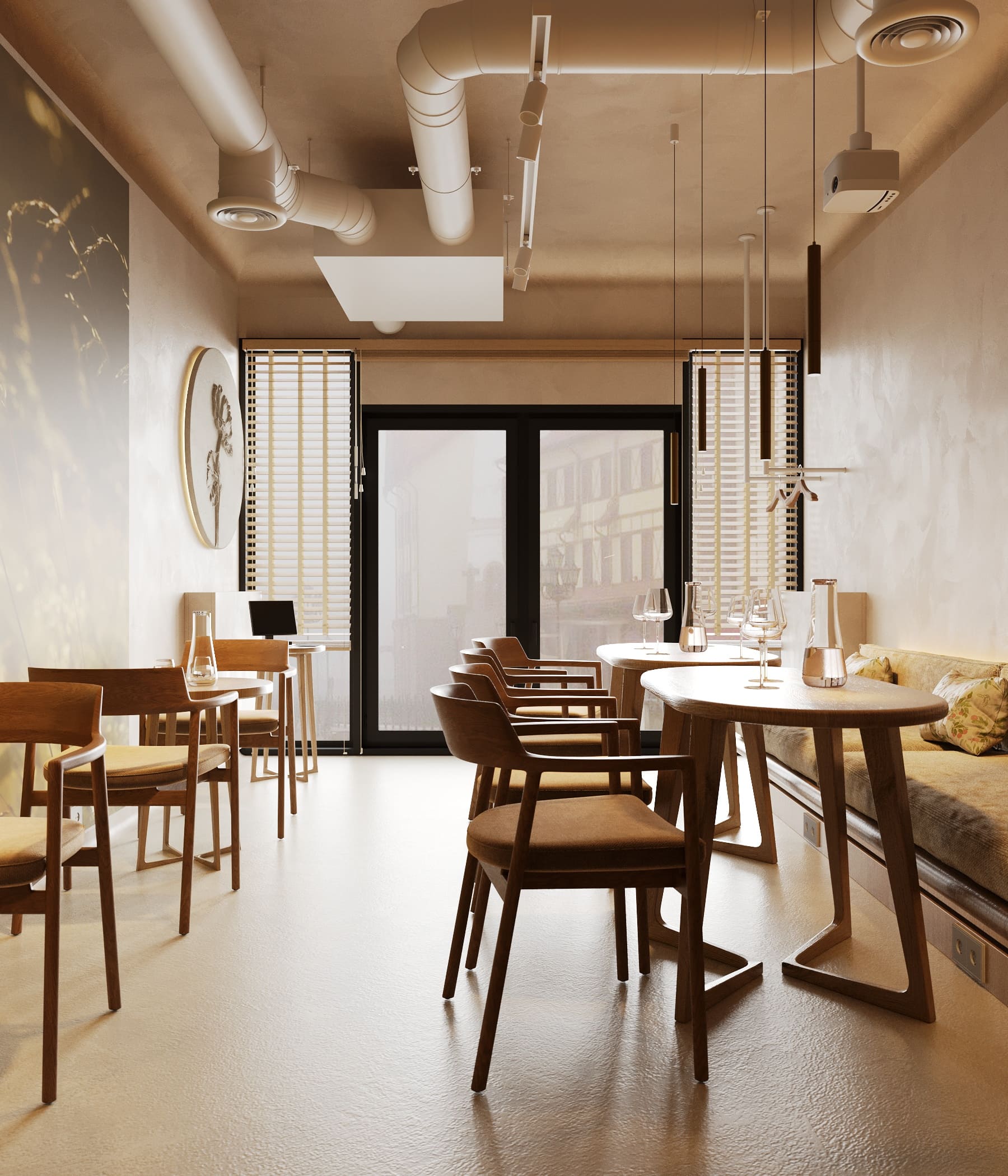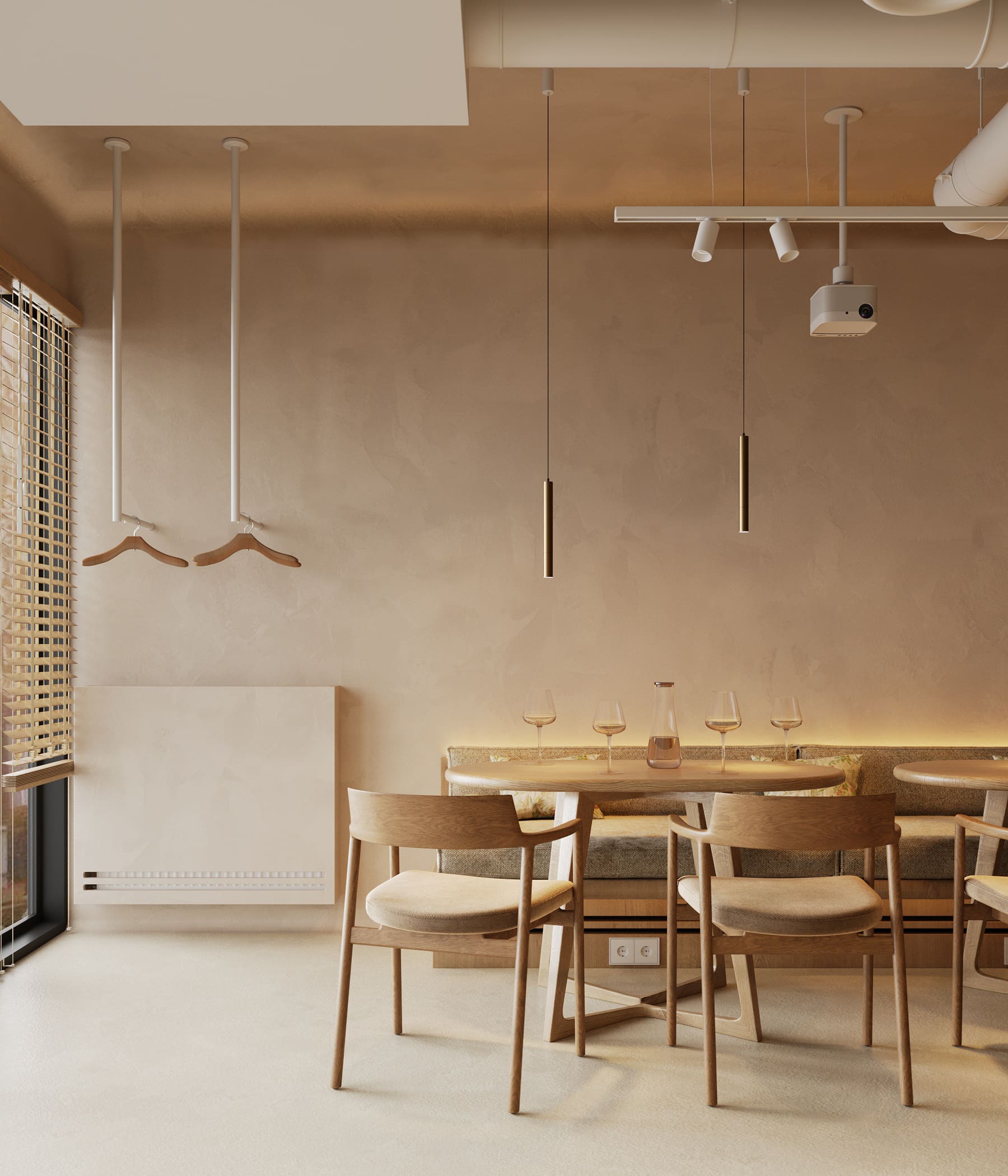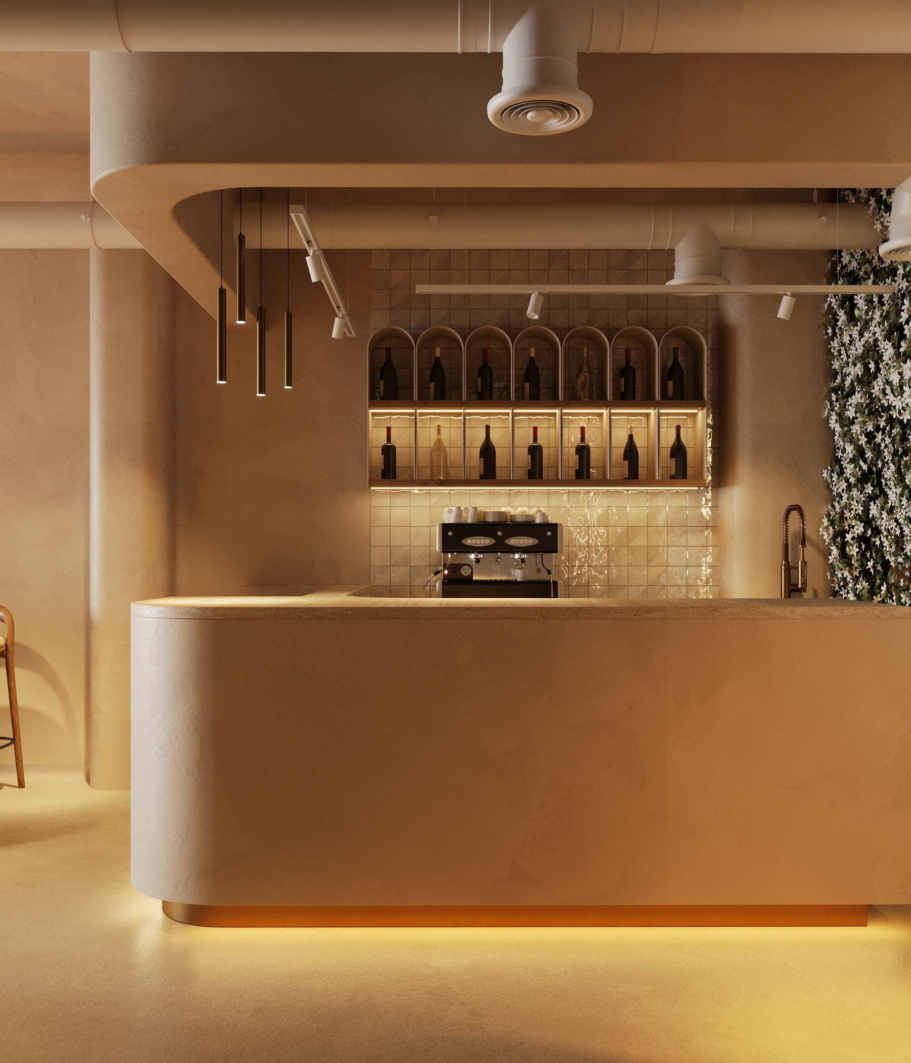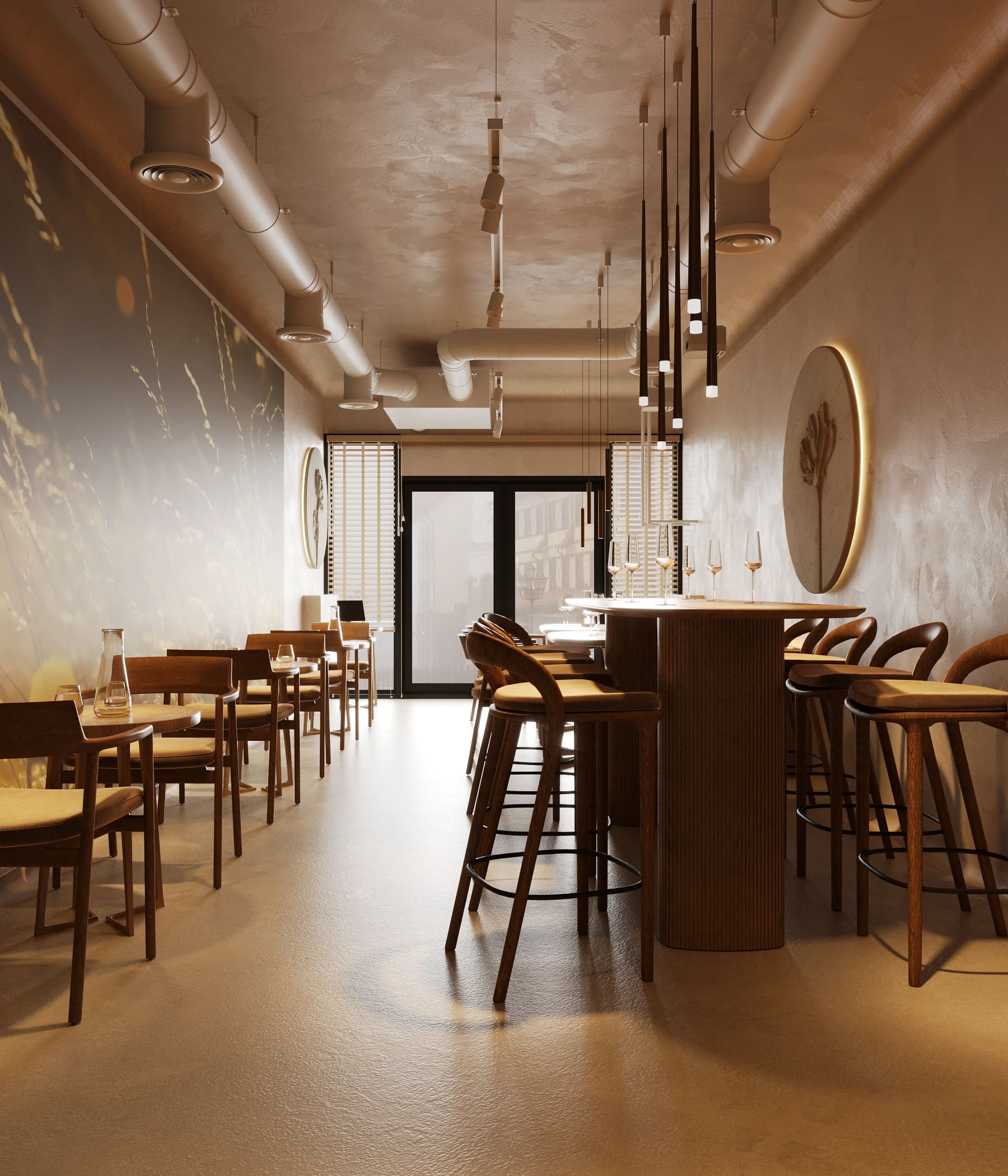 Композиционно пространство выстроено так, чтобы сохранить ощущение открытости, но при этом создать камерные зоны для общения. Декоративные элементы, флористика и арт-детали завершили образ современного бистро, в котором каждый штрих работает на атмосферу лёгкости и тепла.