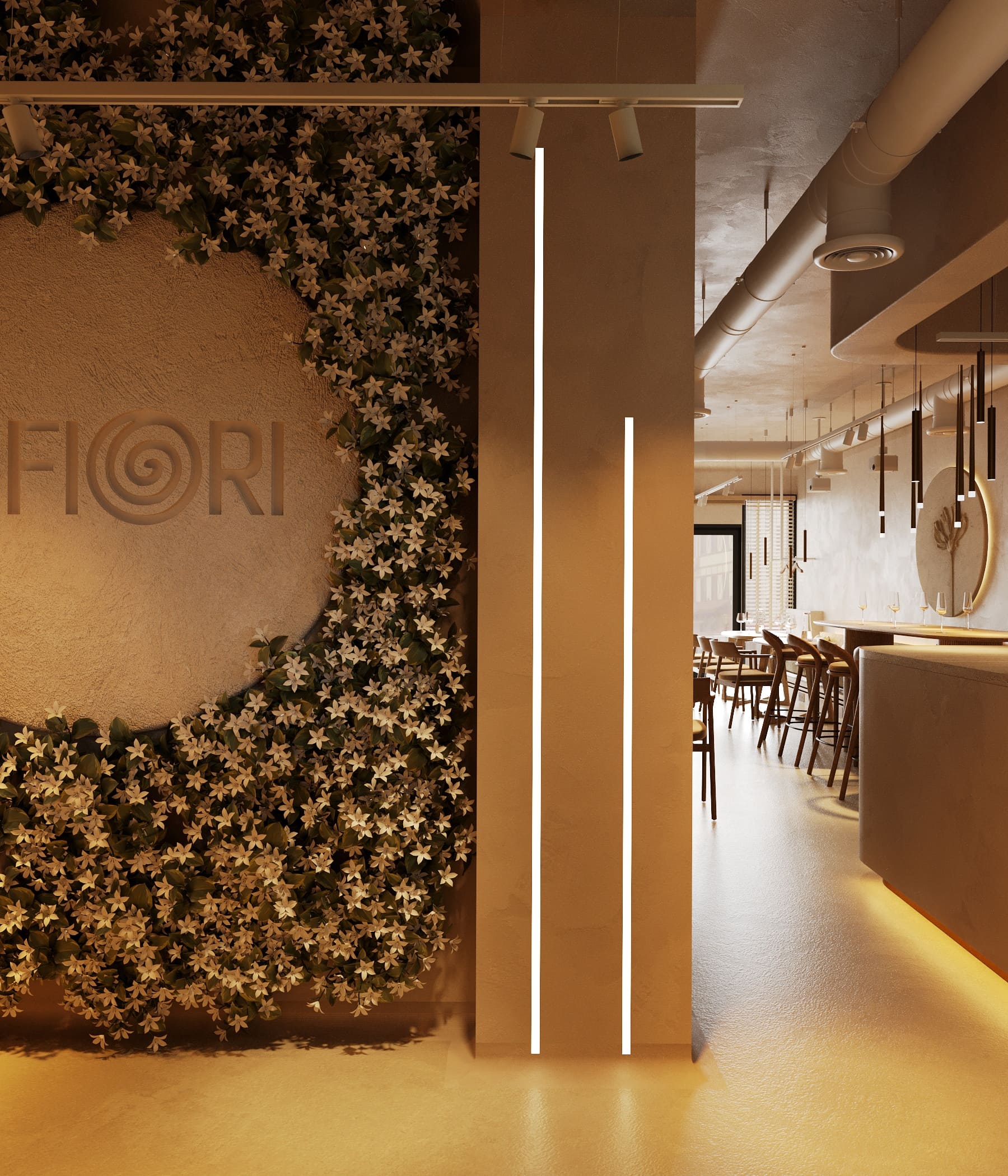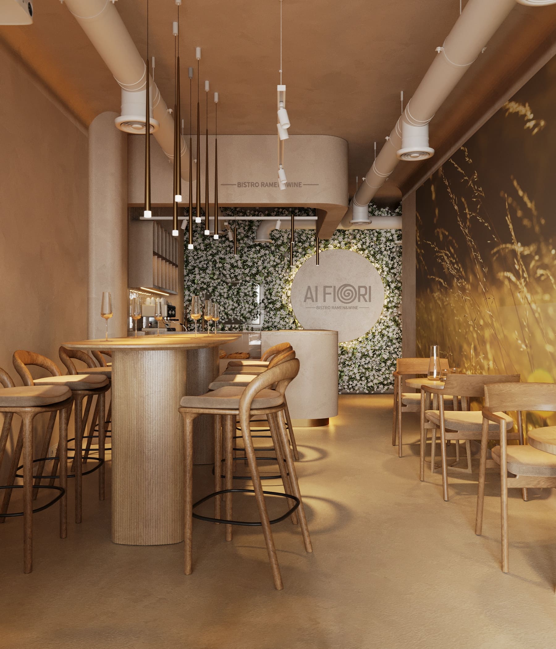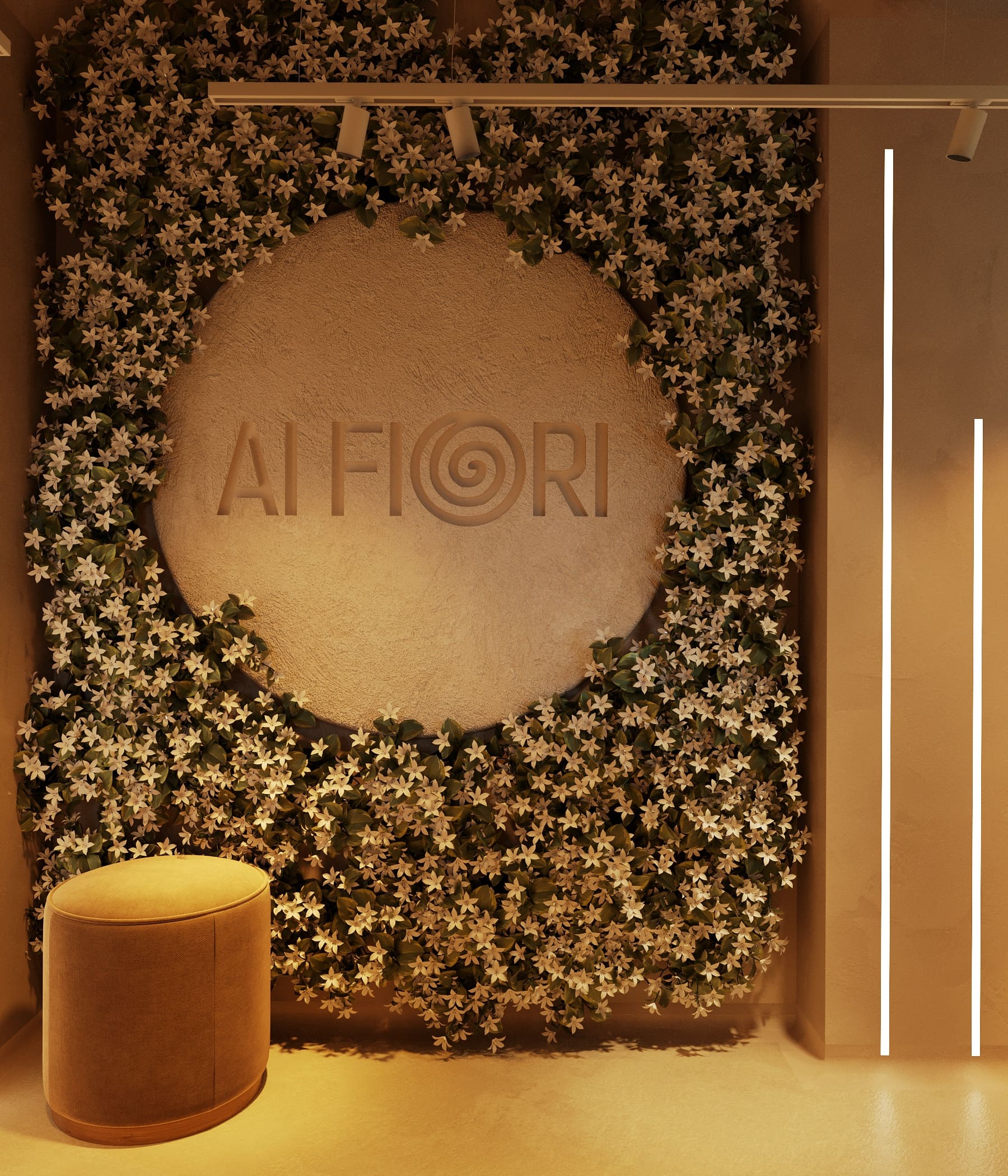 Основная идея проекта — подчеркнуть лёгкость и природность формы. В отделке использованы тёплые оттенки бежевого и песочного, а также натуральное дерево, которое придаёт интерьеру глубину и тактильность. Мягкие световые линии и точечные акценты формируют уютное, почти солнечное свечение, отражающее философию бренда AI FIORI.