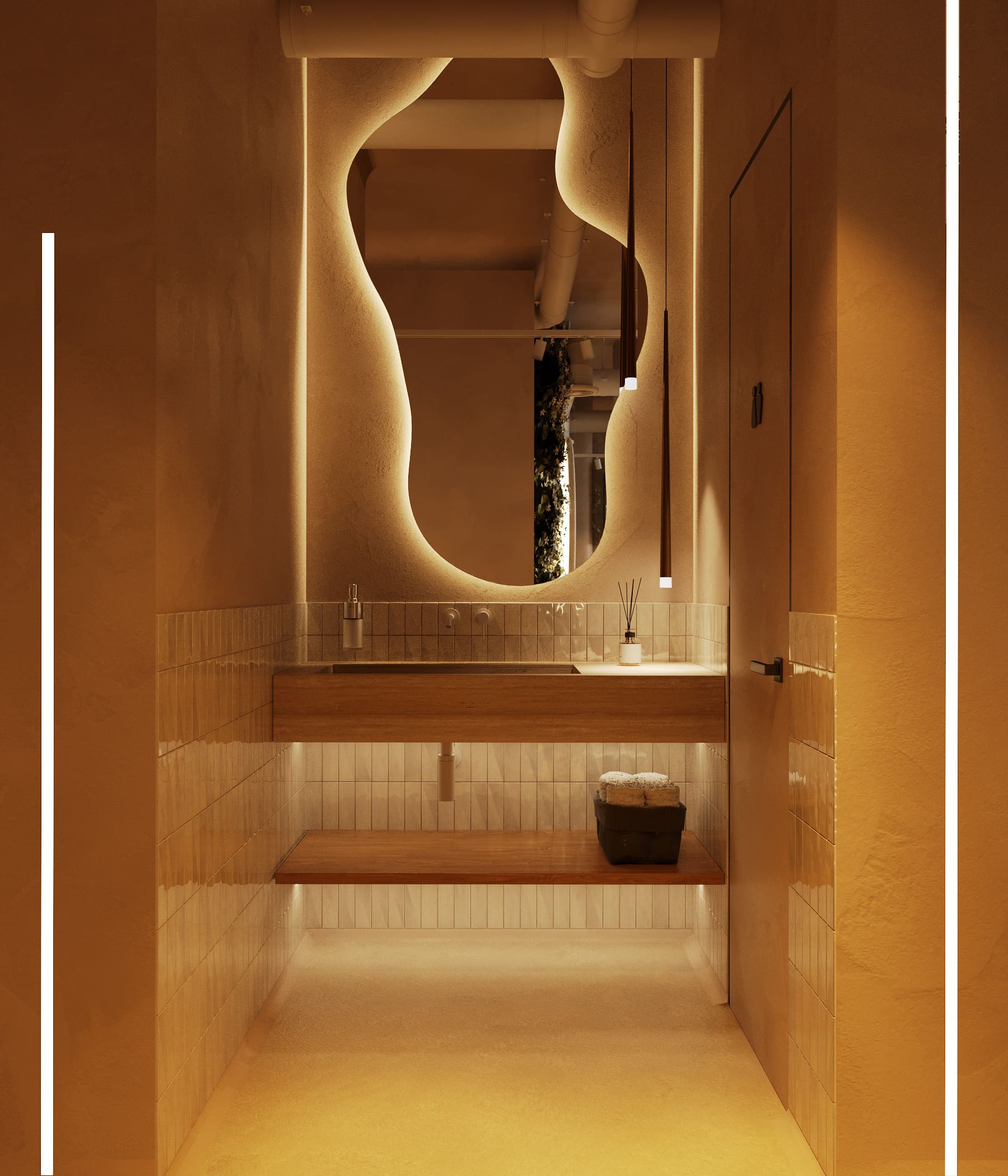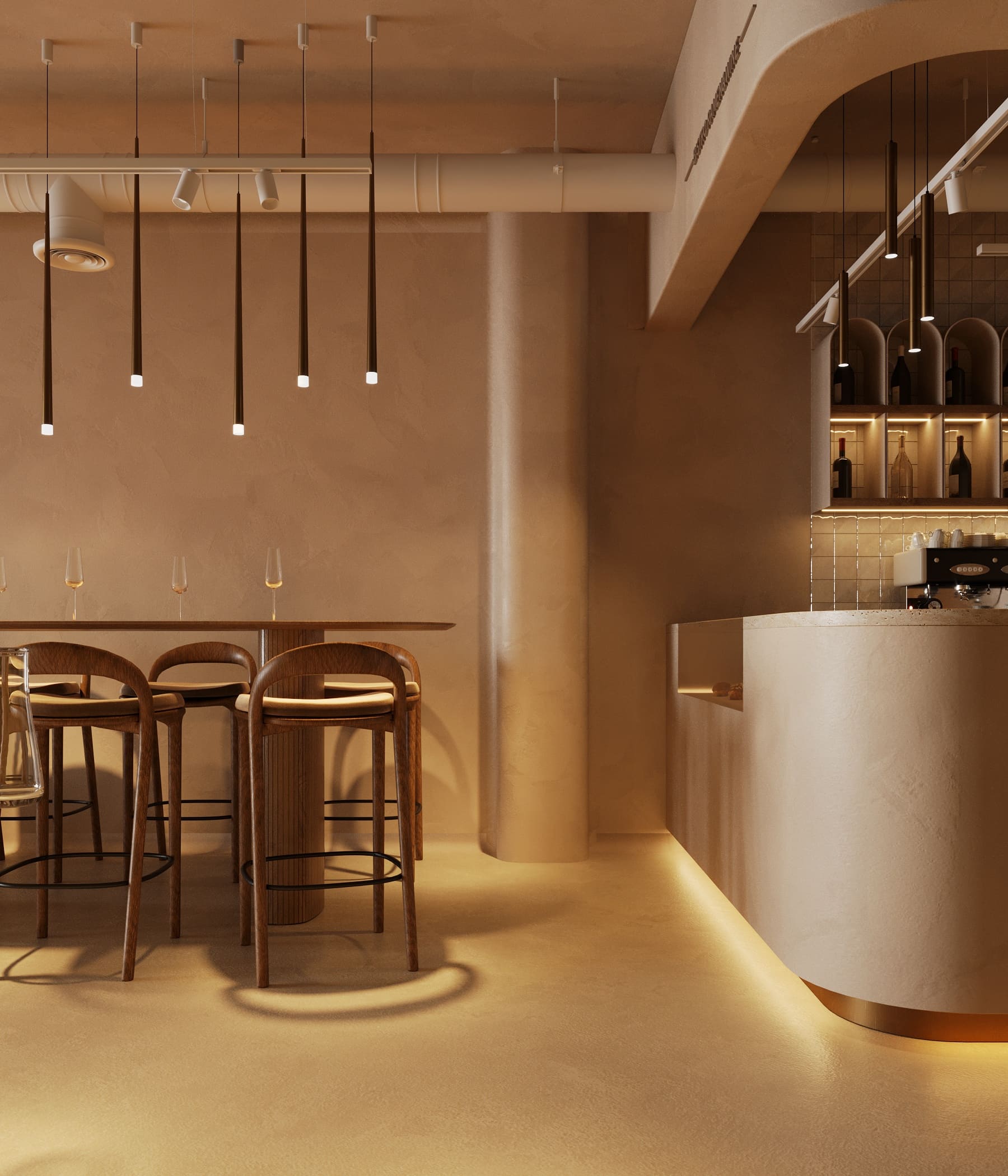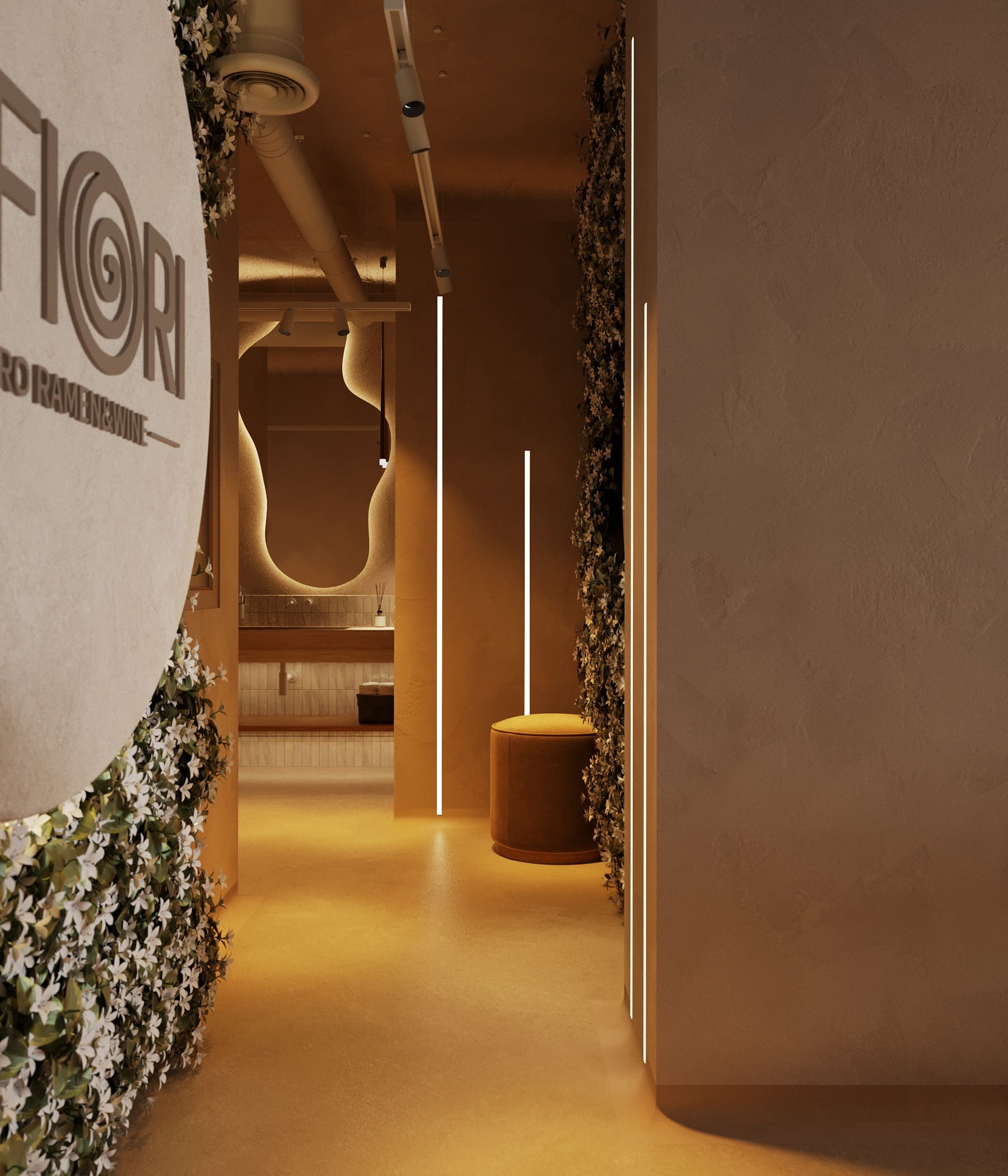 Основная идея проекта — подчеркнуть лёгкость и природность формы. В отделке использованы тёплые оттенки бежевого и песочного, а также натуральное дерево, которое придаёт интерьеру глубину и тактильность. Мягкие световые линии и точечные акценты формируют уютное, почти солнечное свечение, отражающее философию бренда AI FIORI.