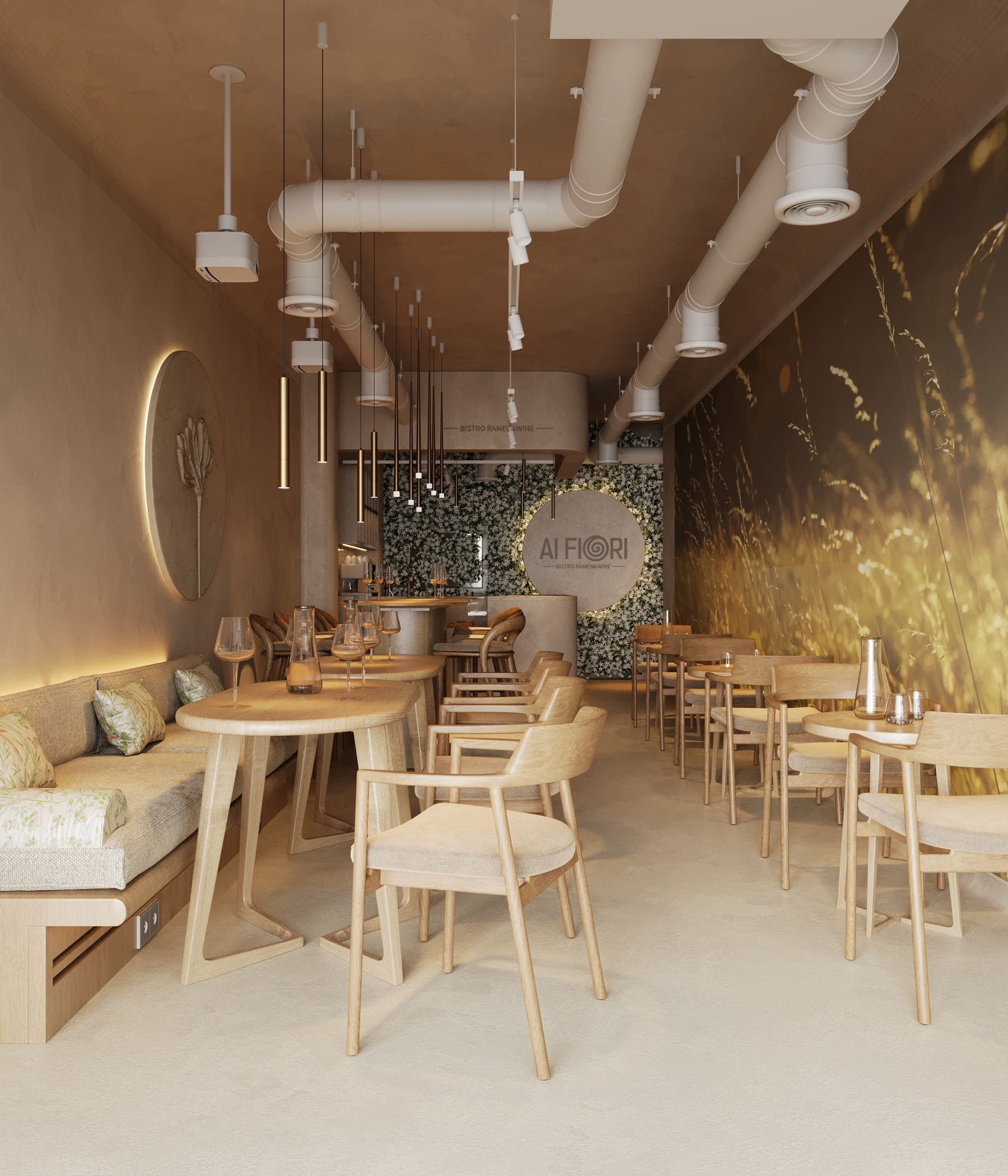 Описание проекта: Ресторан AI FIORI в Калининграде создан студией Onetwohome как пространство света, тепла и естественной гармонии. Интерьер объединяет мягкие природные оттенки, древесные текстуры и приглушённое освещение, создавая ощущение спокойствия и равновесия.