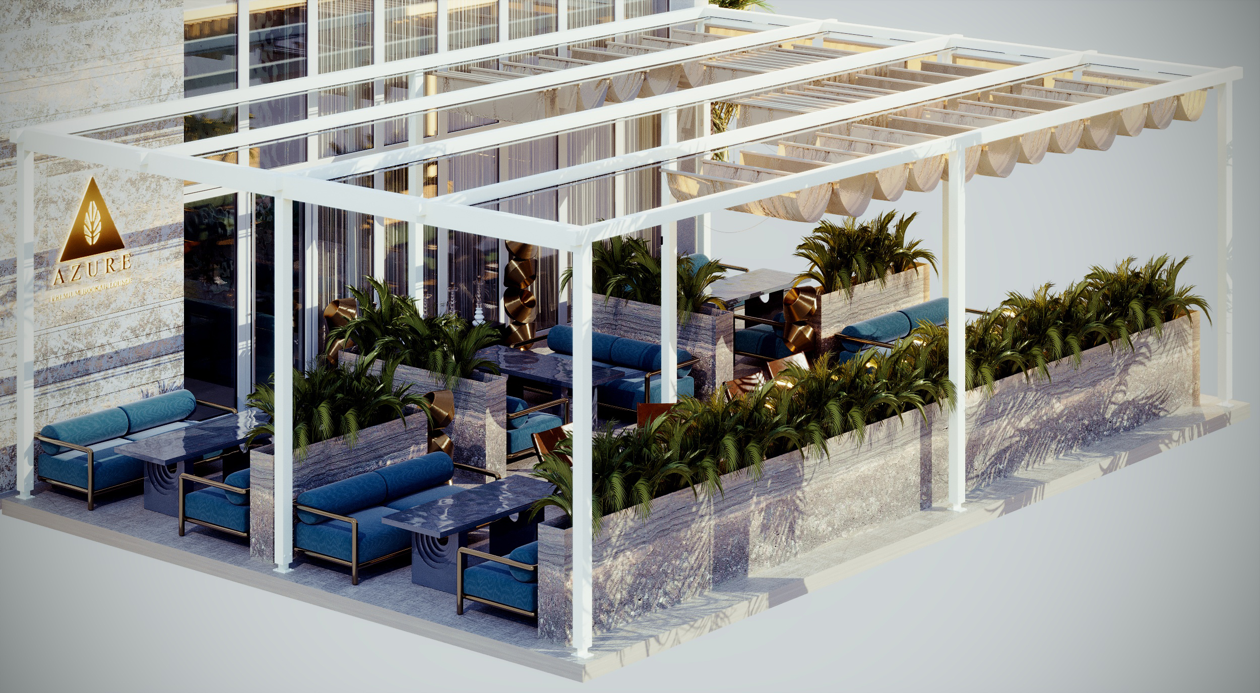 Уличная веранда продолжает общий стиль. Натуральный камень, ткани в сине-голубой гамме, массивы зелени и лёгкая пергола формируют выразительное пространство для гостей. Вечерняя подсветка подчёркивает геометрию мебели и графику бренда.