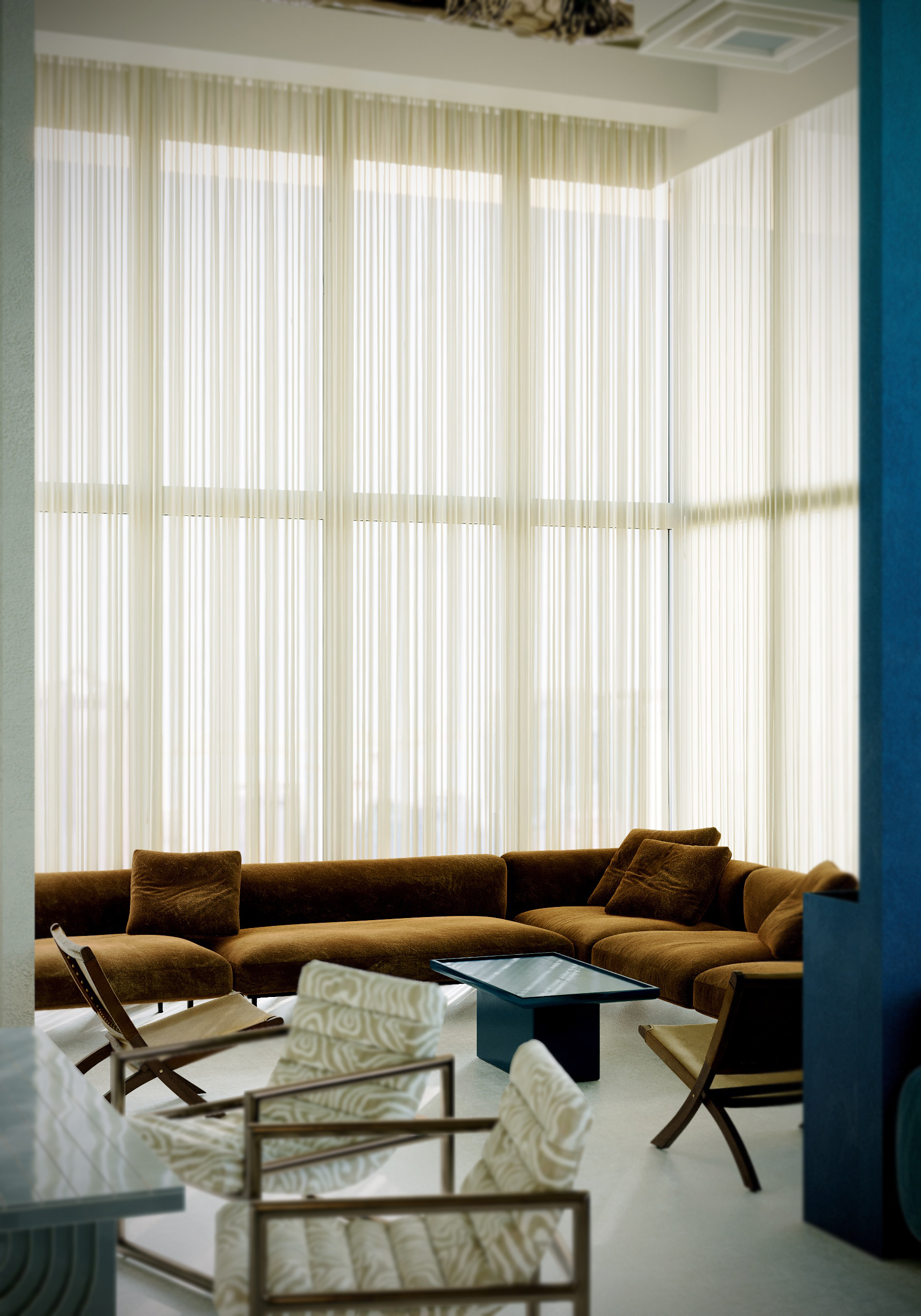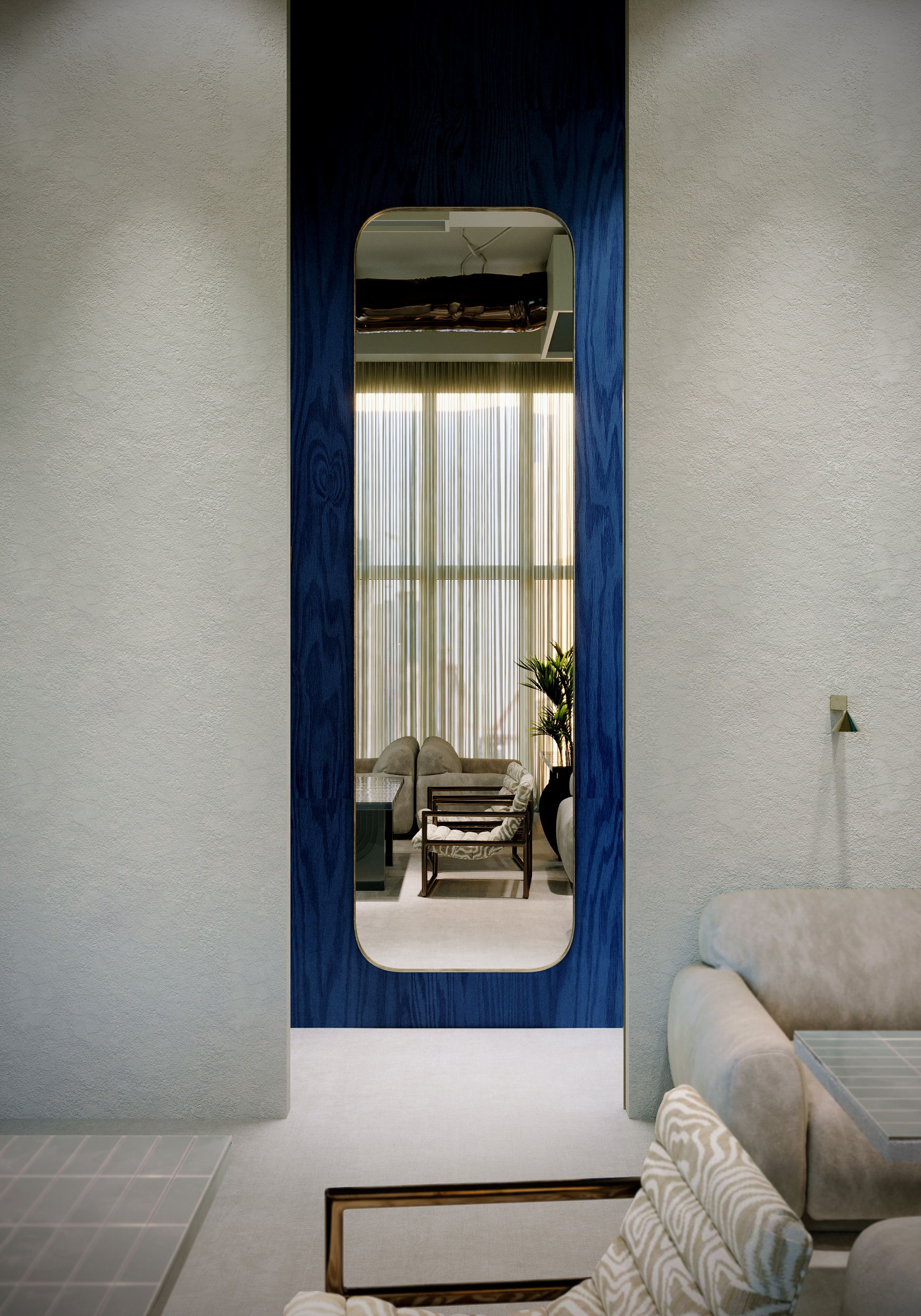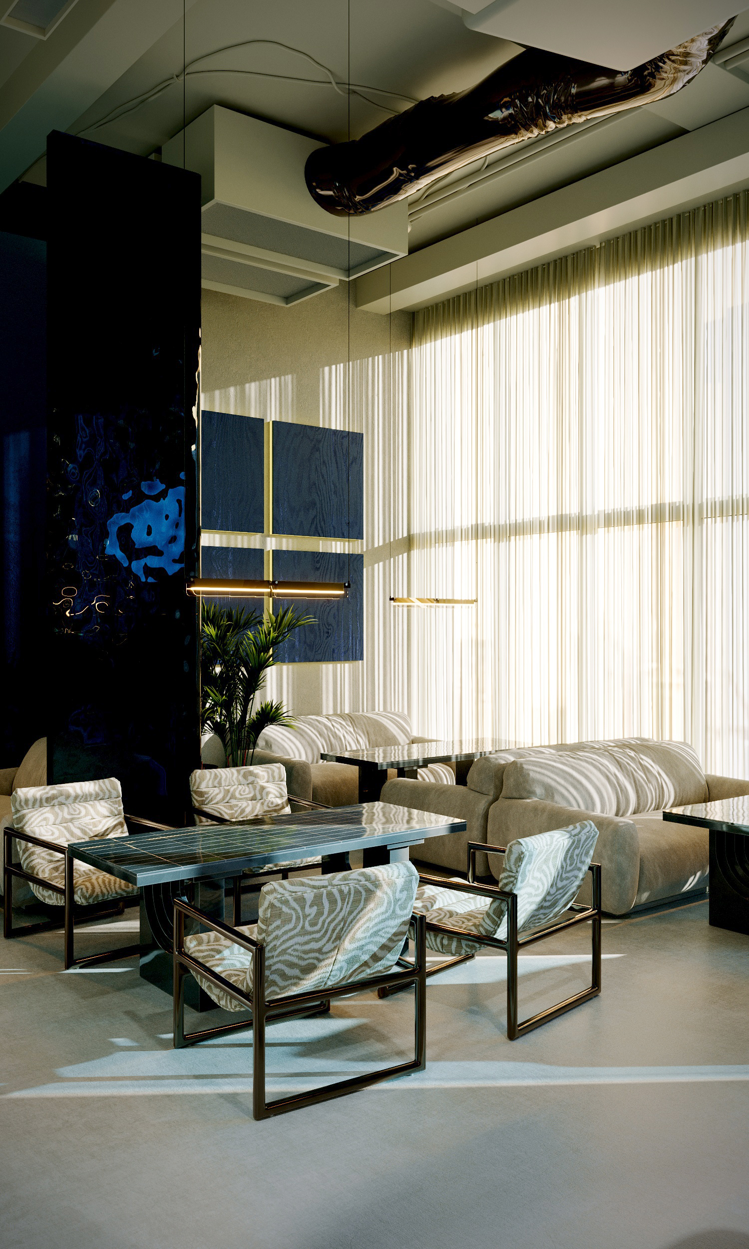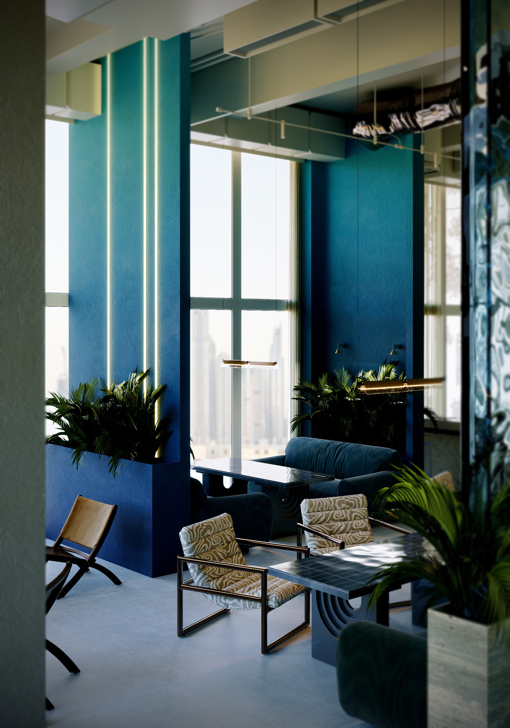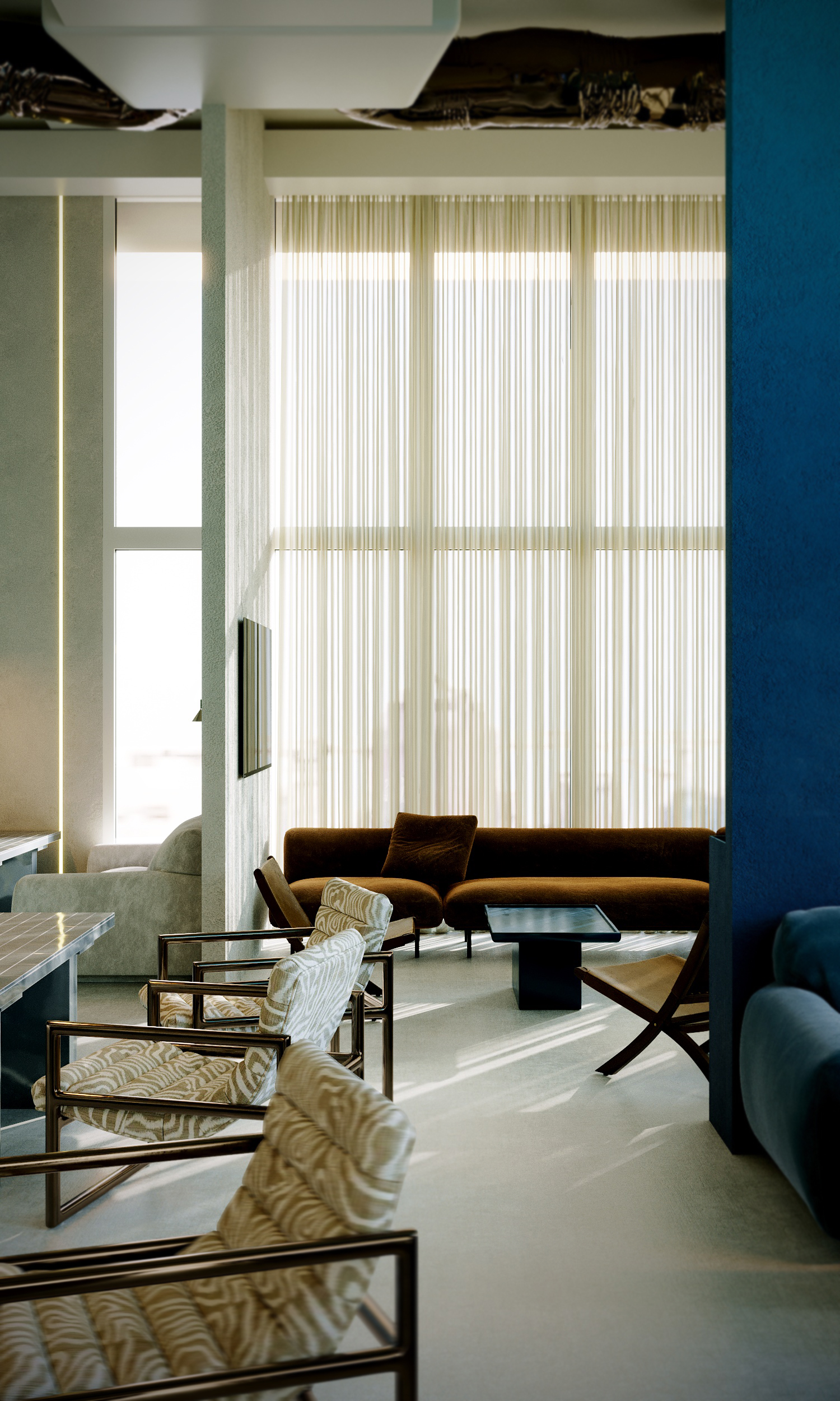 Гостевые зоны построены вокруг мягкой, обволакивающей мебели с глубокими посадками. Спокойные бежево-серые текстуры и сочетающиеся синие диваны создают премиальную, но расслабленную атмосферу. Живые растения обеспечивают приватность и делают интерьер “дышащим”.