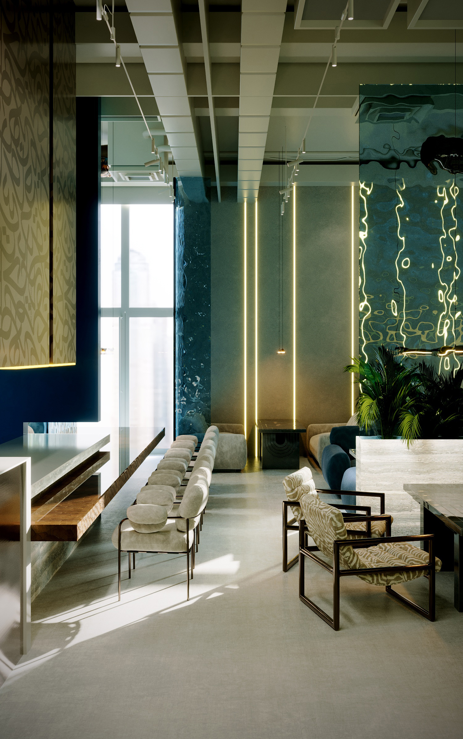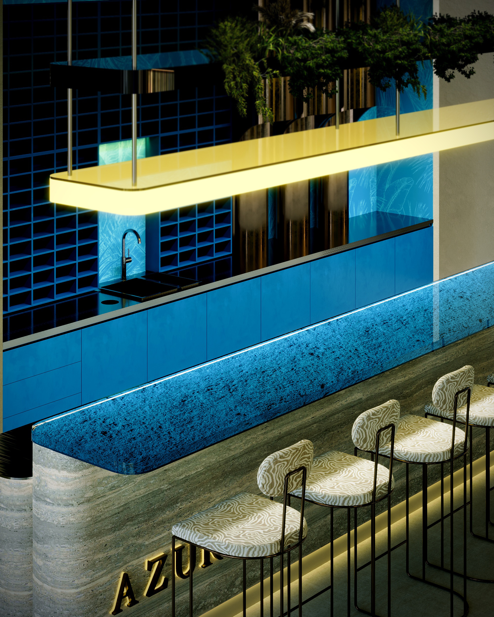 Барная зона выполнена в насыщенном фирменном цвете Azure и дополнена глянцевой столешницей — решение усиливает узнаваемость бренда и делает композицию визуально выразительной. Подвесные световые линии и внедрённые зелёные элементы добавляют динамику и формируют лёгкое lounge-настроение.