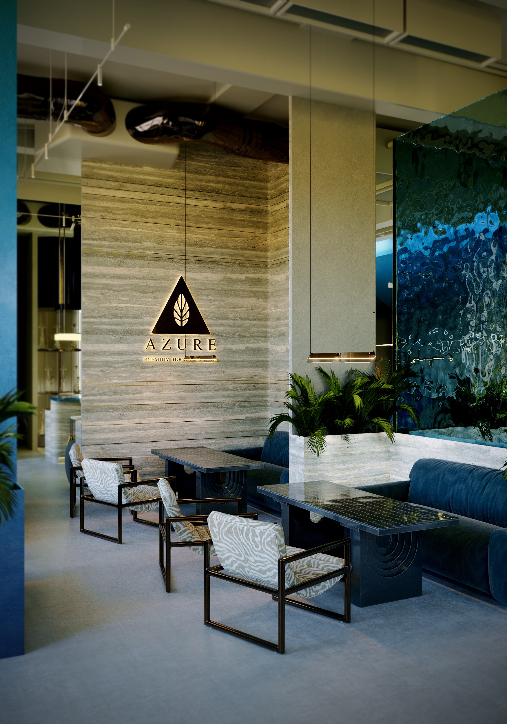 Описание проекта: Мы создали фирменное пространство Azure Lounge Dubai — премиальную кальянную, где дизайн интерьера кальянной стал продолжением эстетики бренда Azure Tobacco. В основе дизайн-проекта кальянной — глубокие оттенки синего, натуральные фактуры и характерные золотые акценты, отсылающие к премиальным линейкам табака.