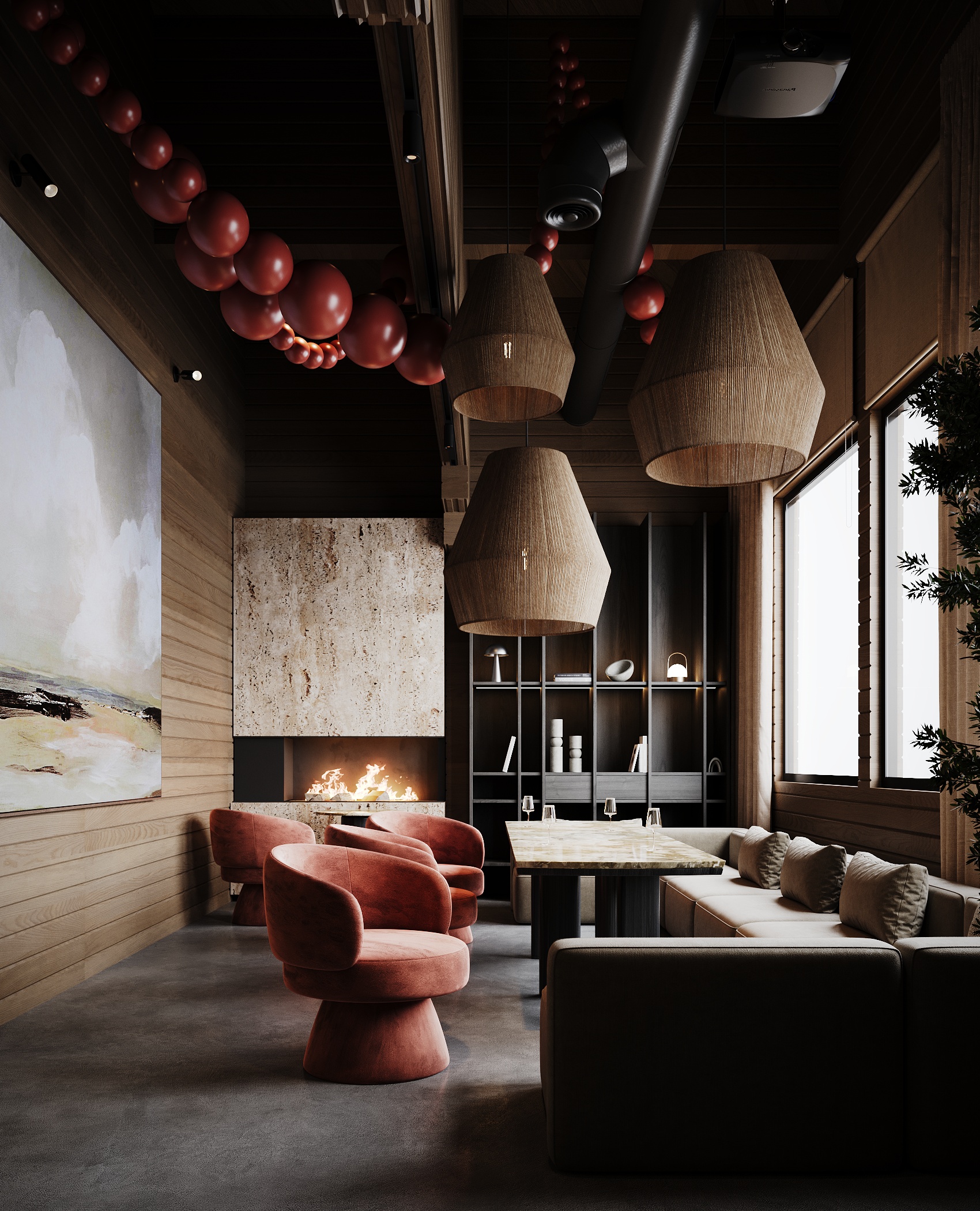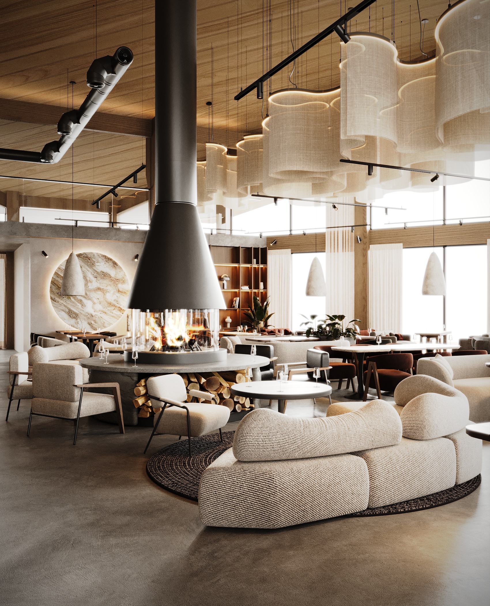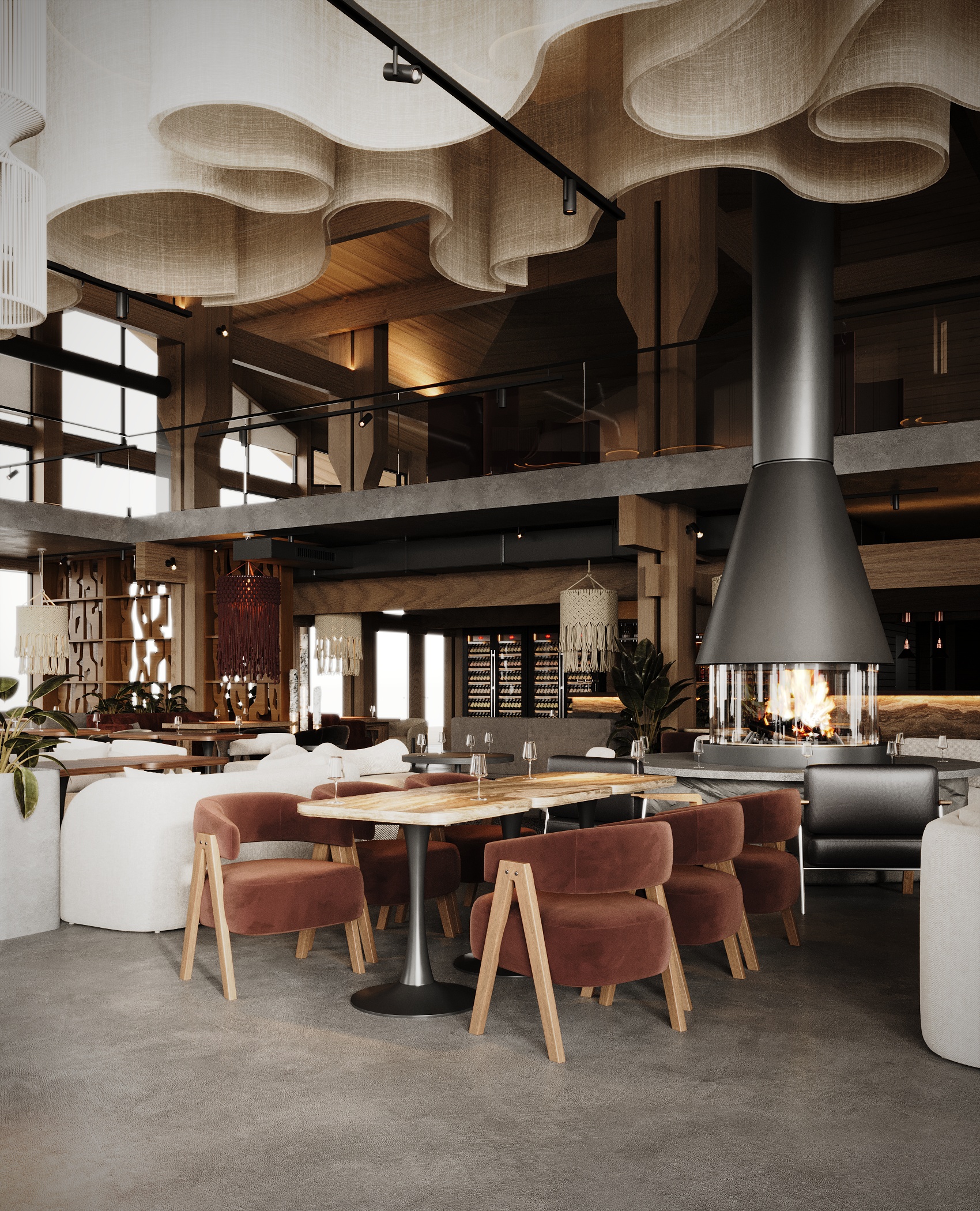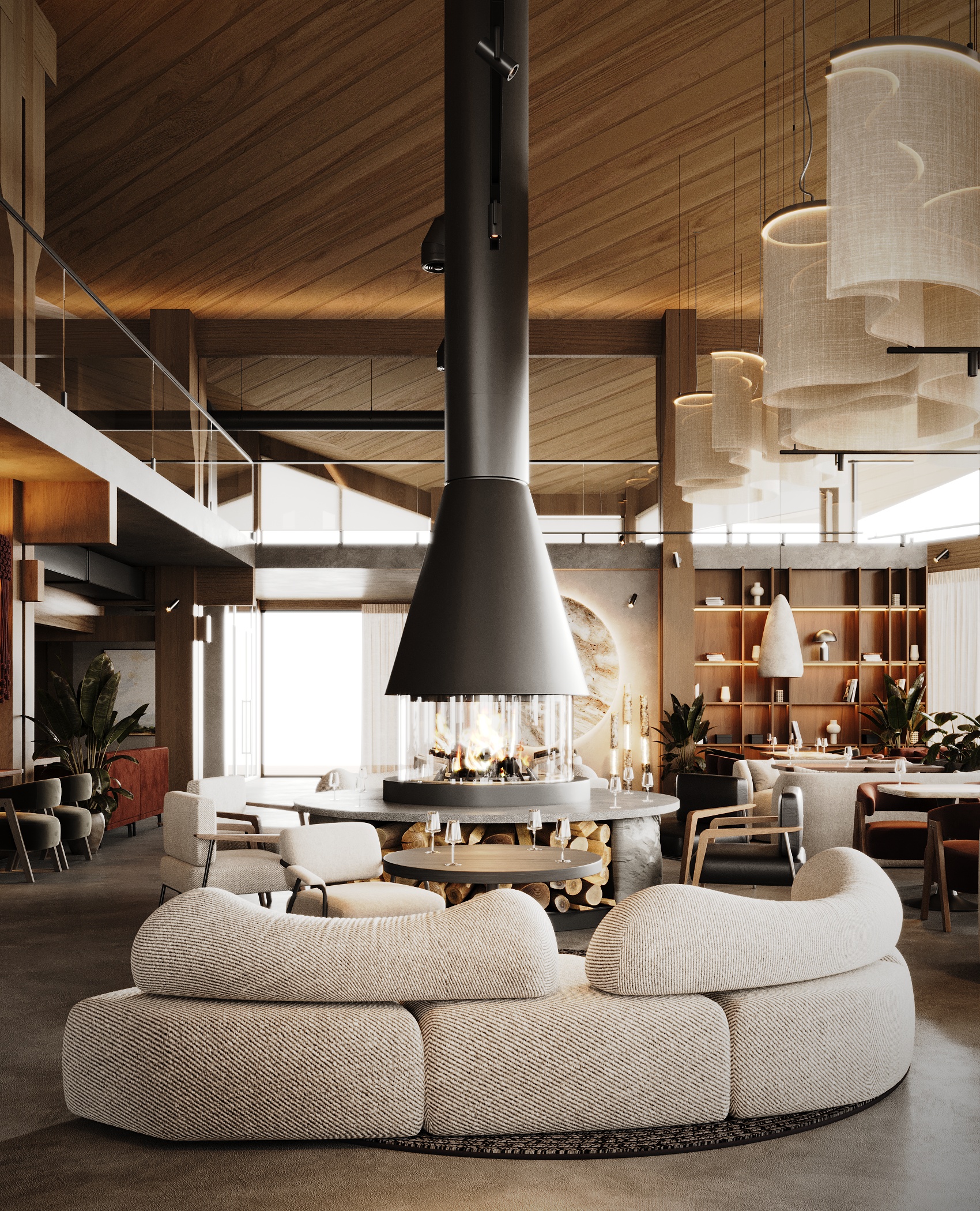 • Центральные камины (включая круглый остров в главном зале) — визуальный и эмоциональный якорь пространства.