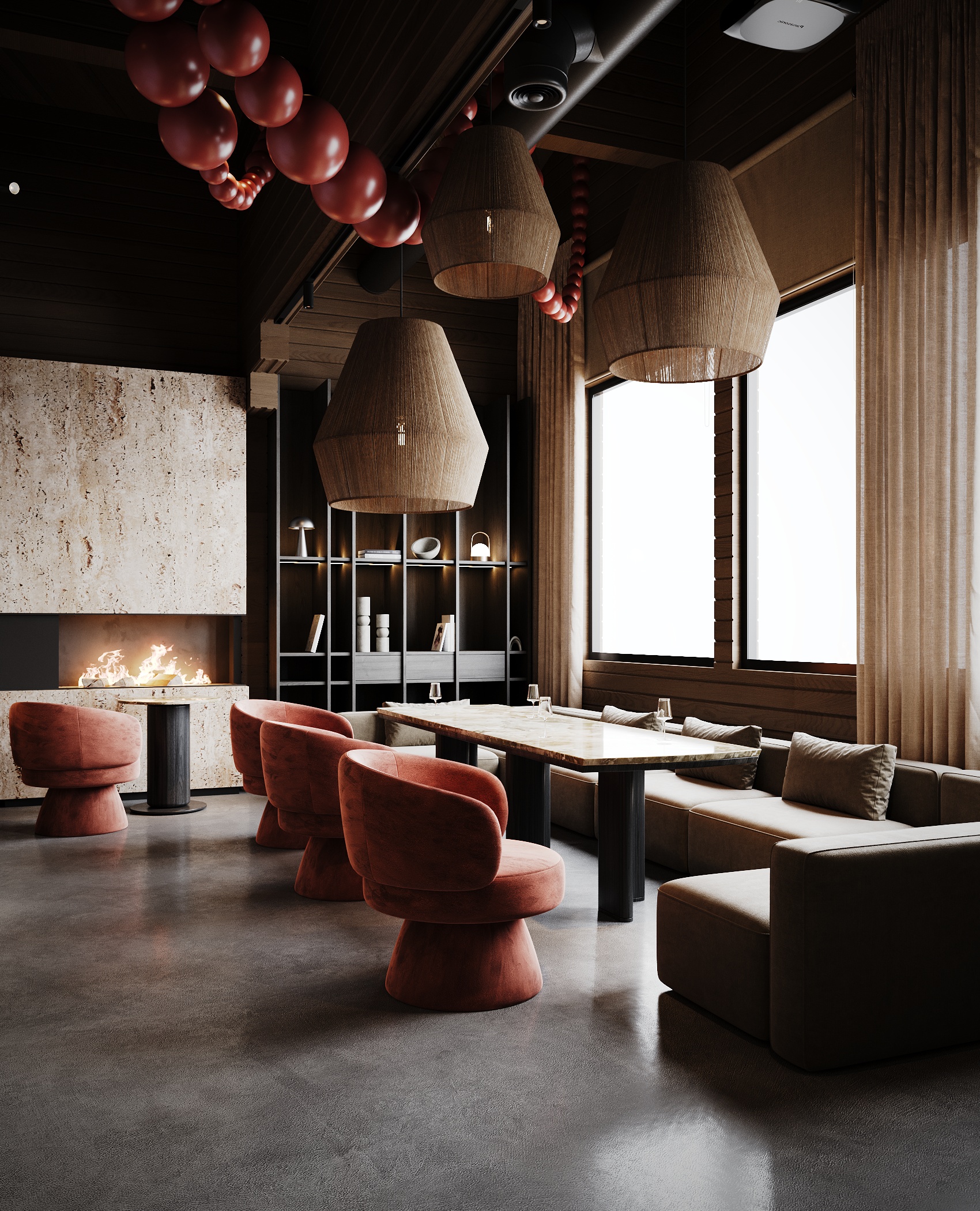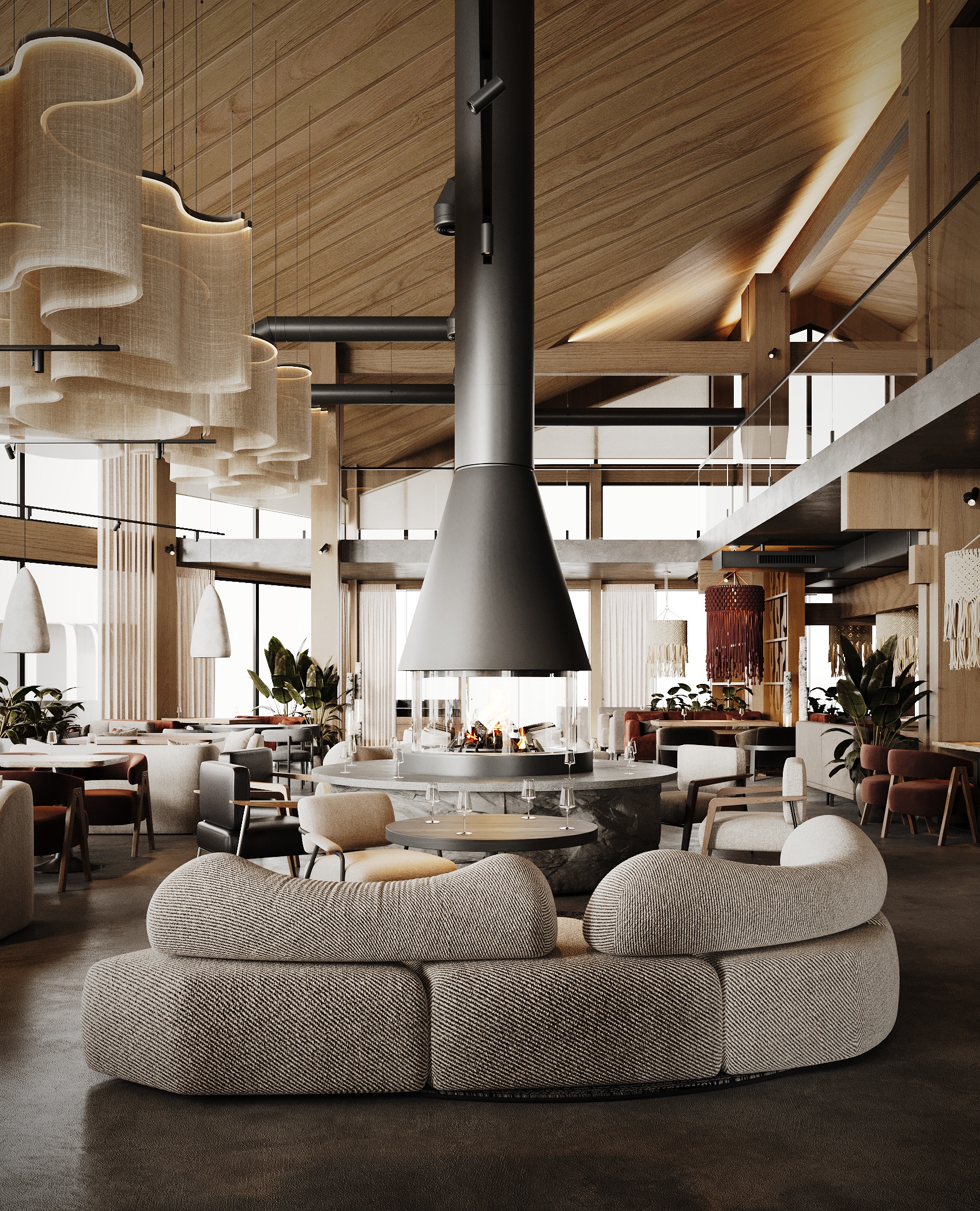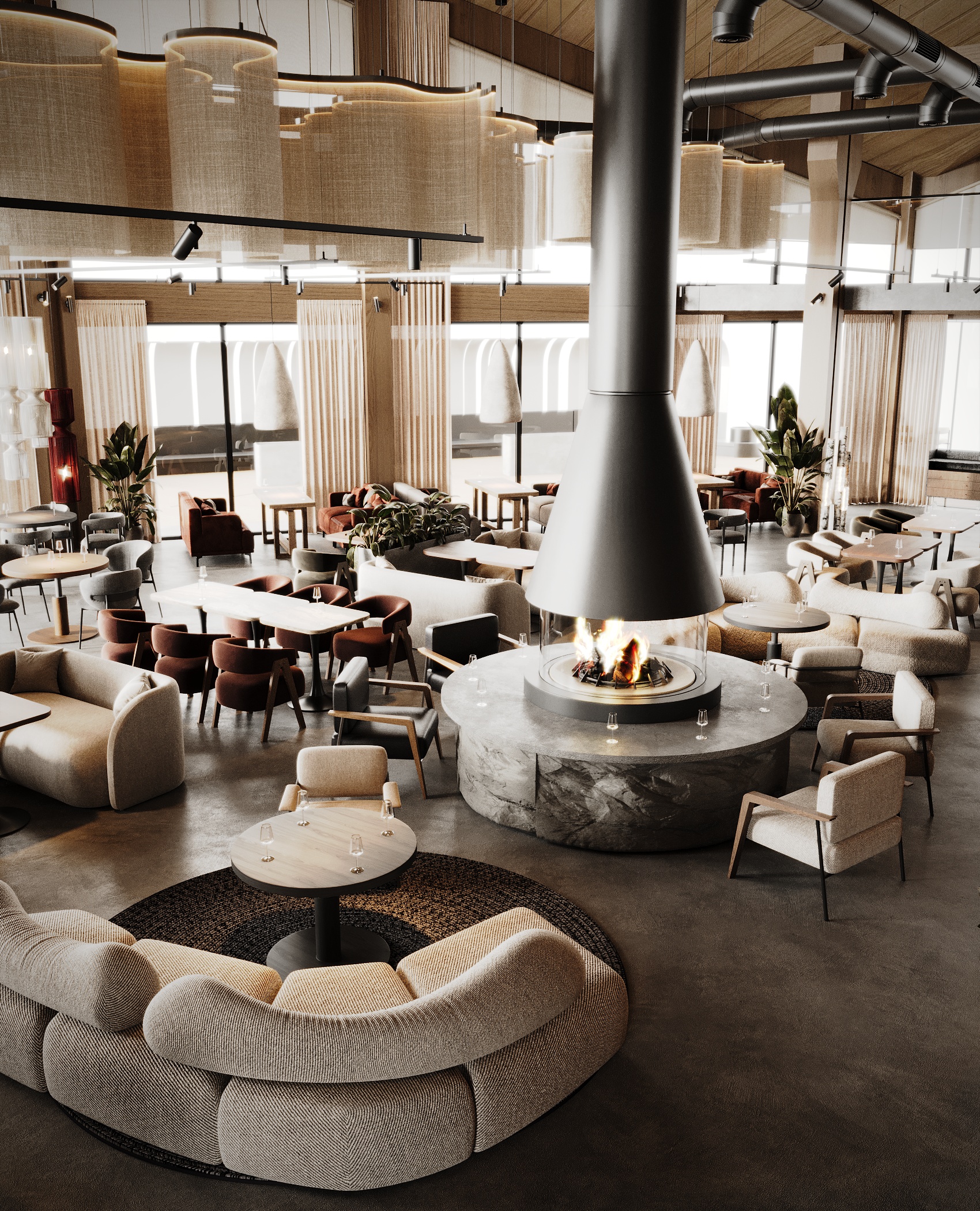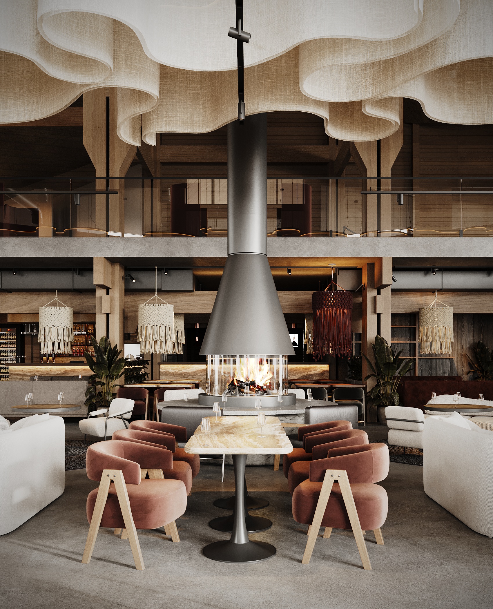 • Центральные камины (включая круглый остров в главном зале) — визуальный и эмоциональный якорь пространства.
