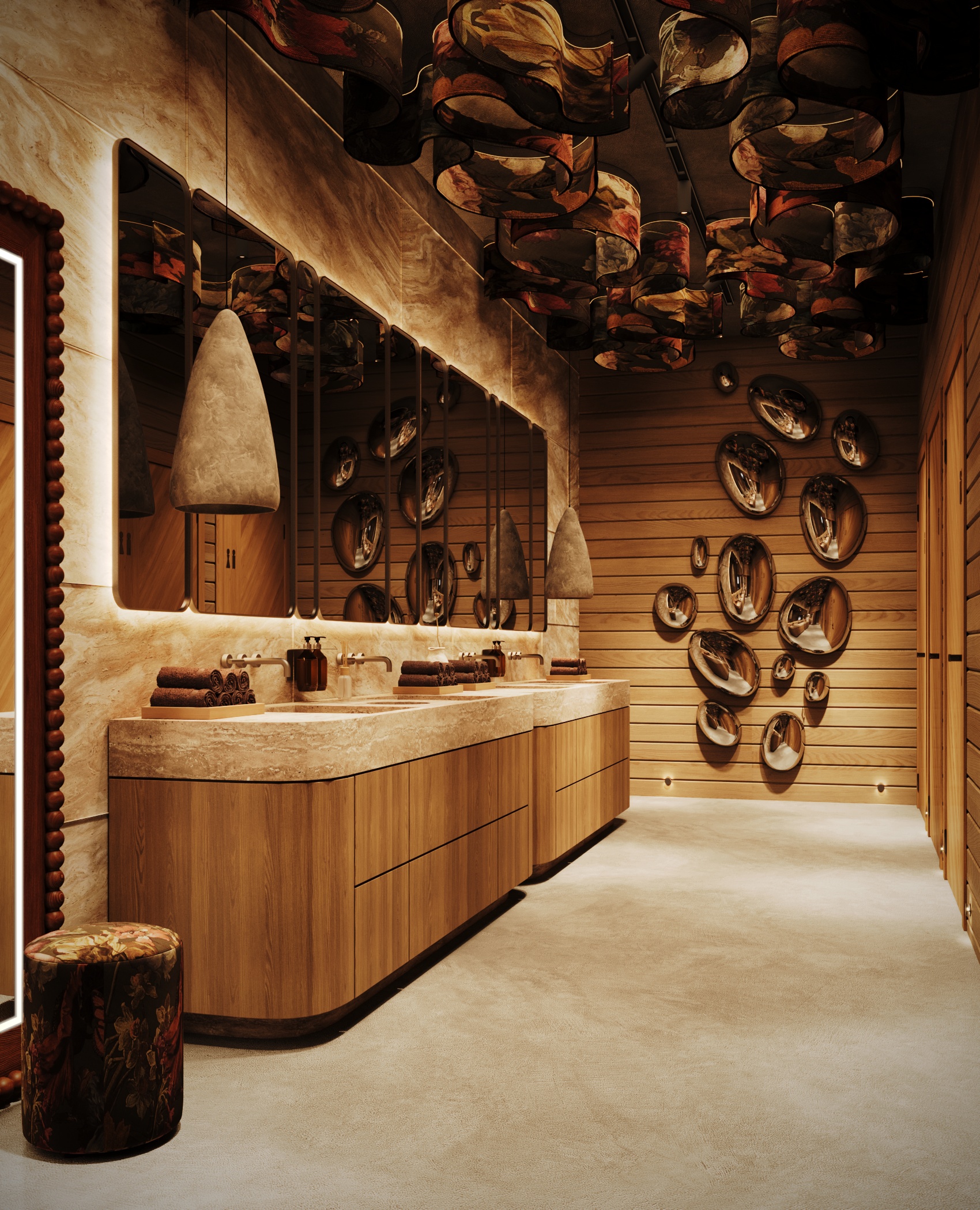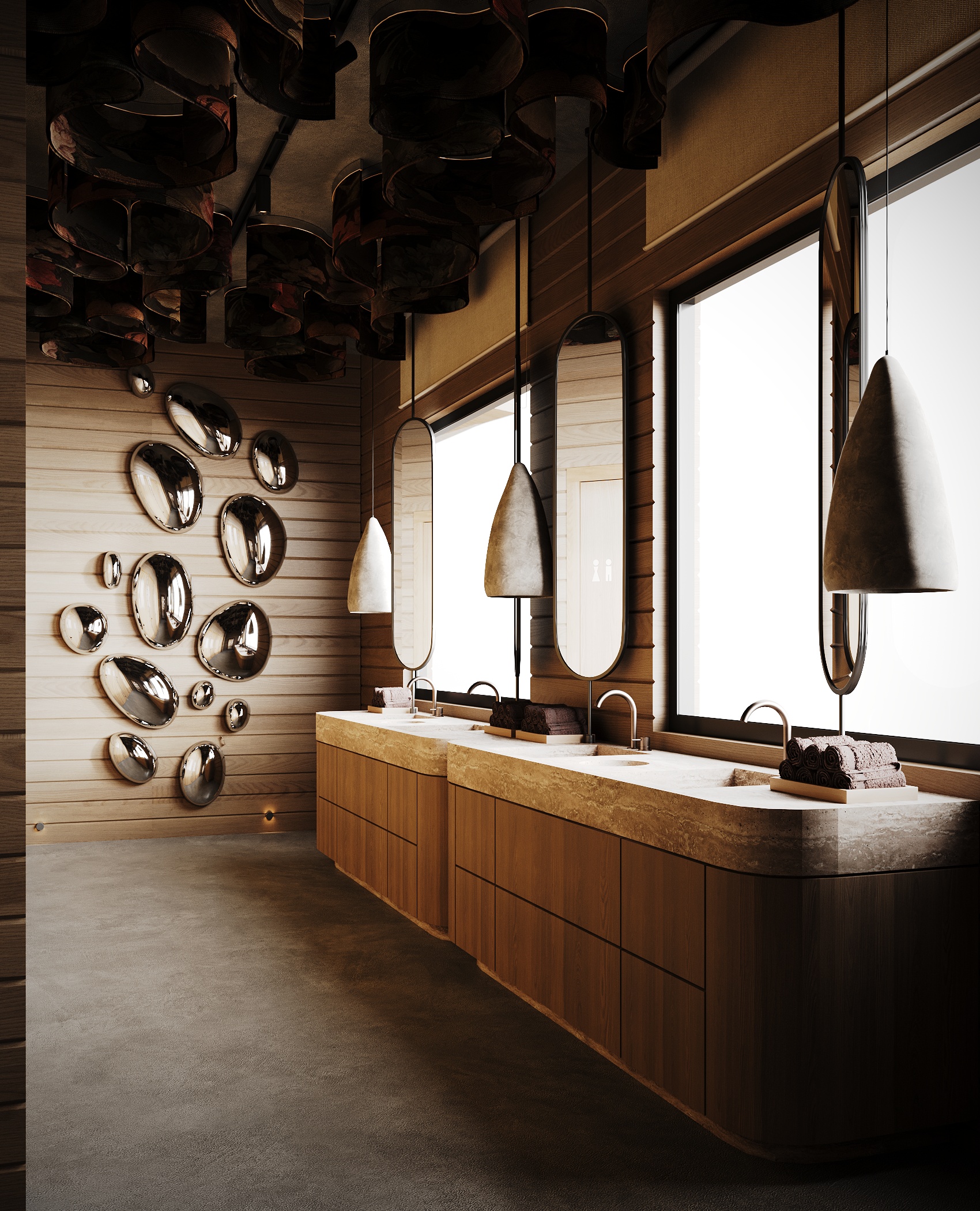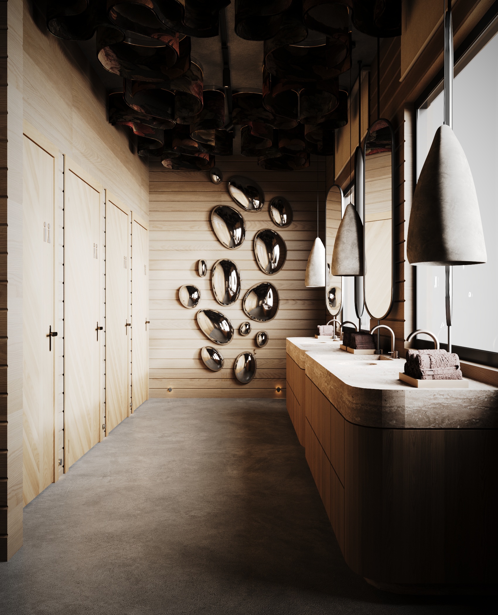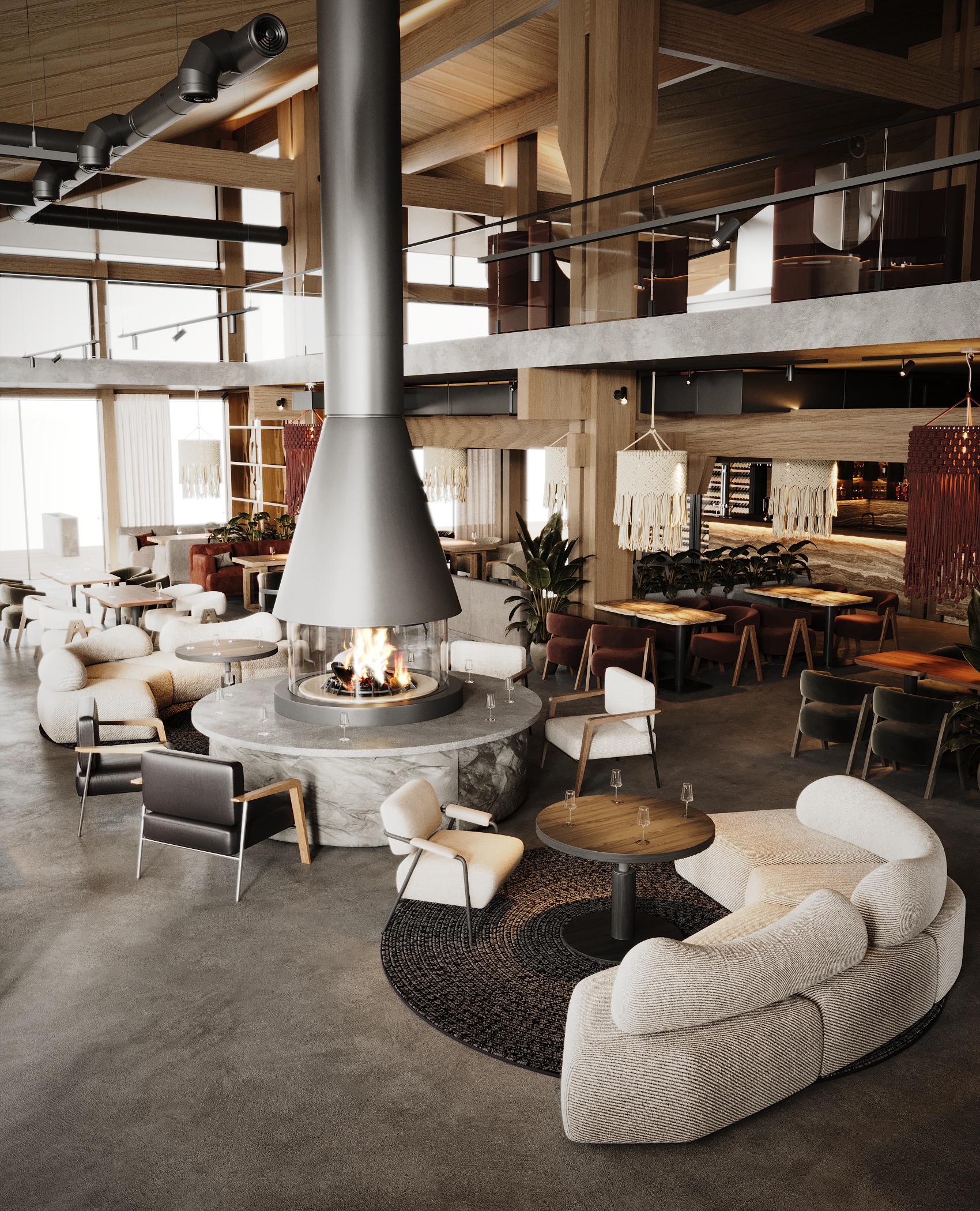 • Центральные камины (включая круглый остров в главном зале) — визуальный и эмоциональный якорь пространства.