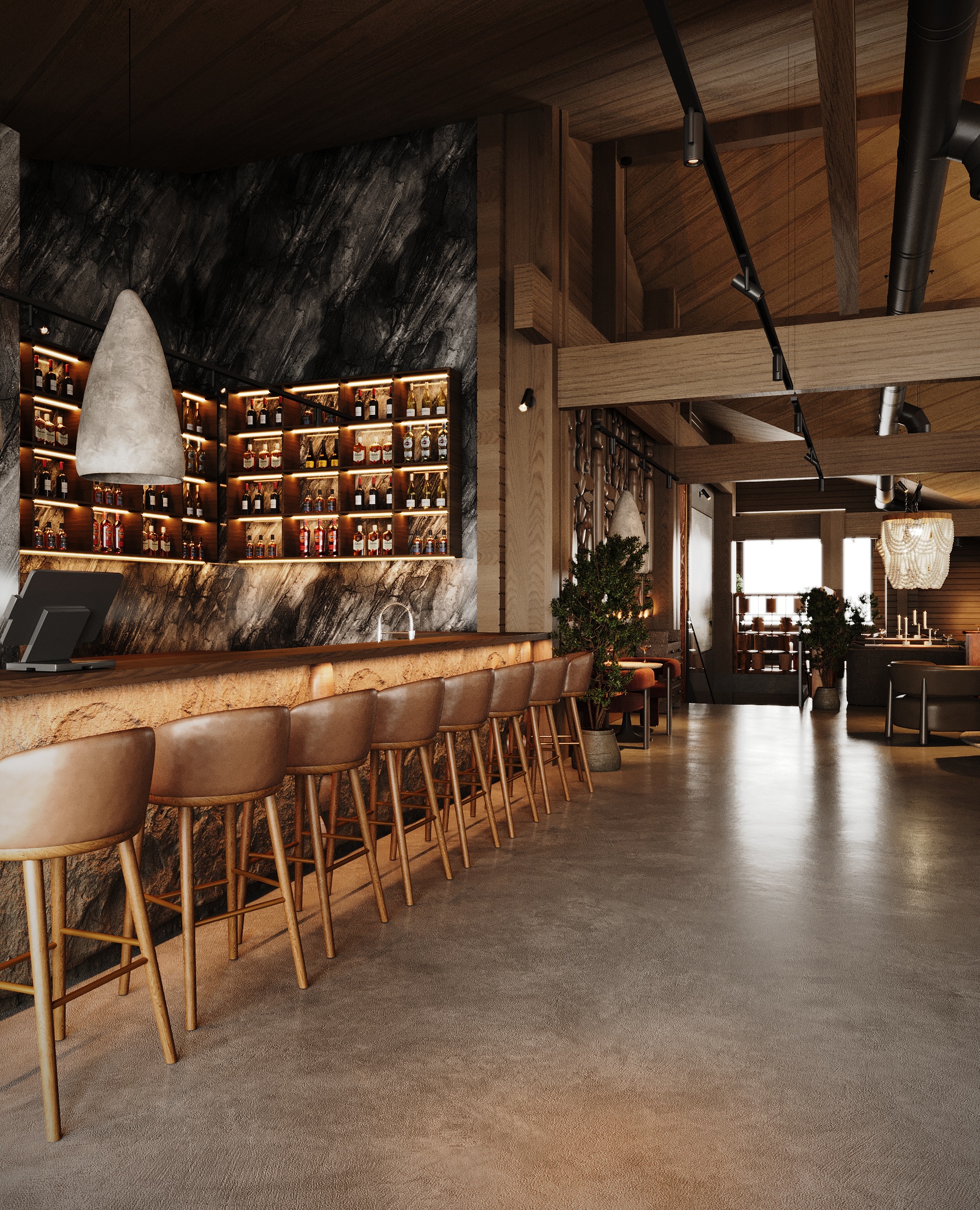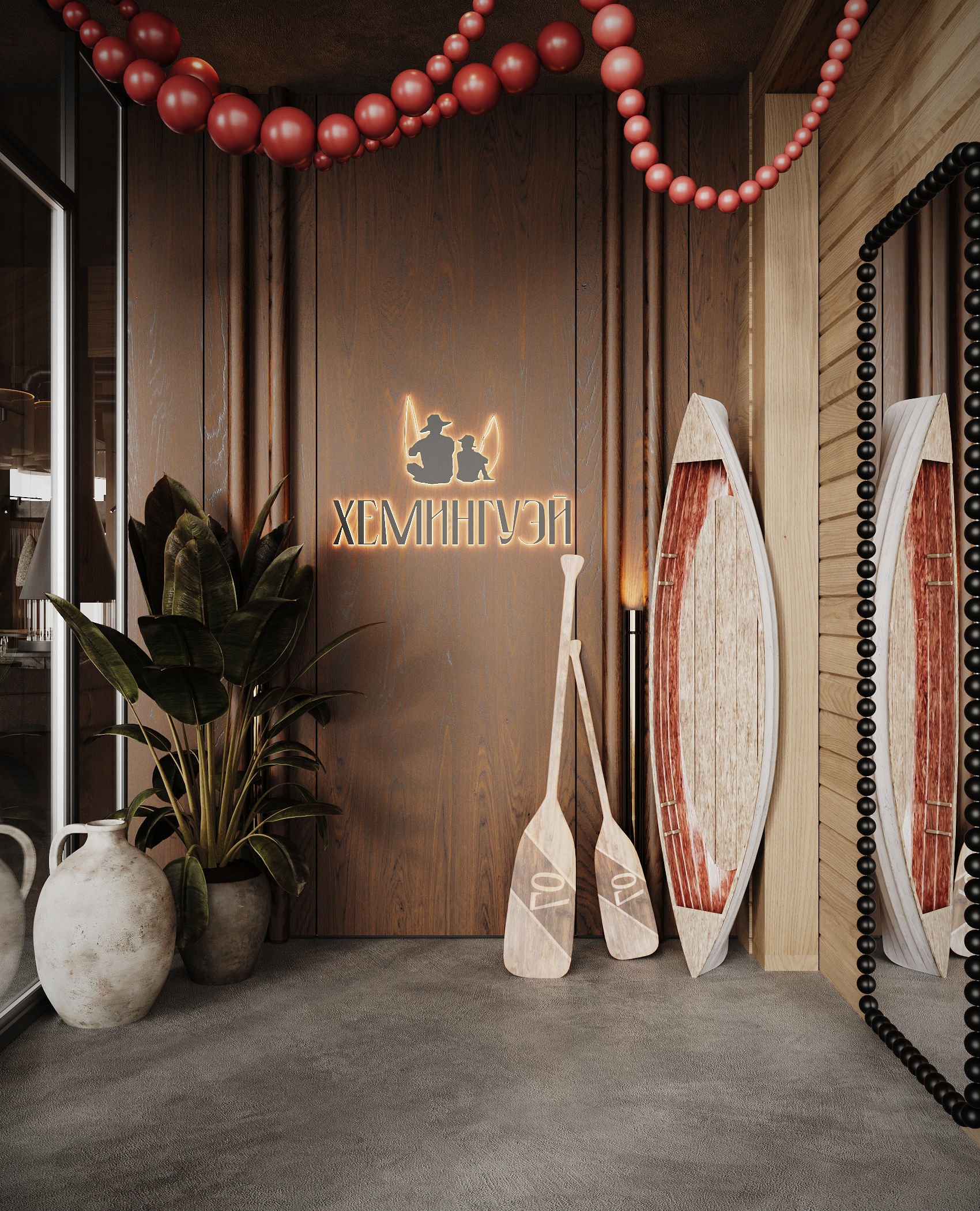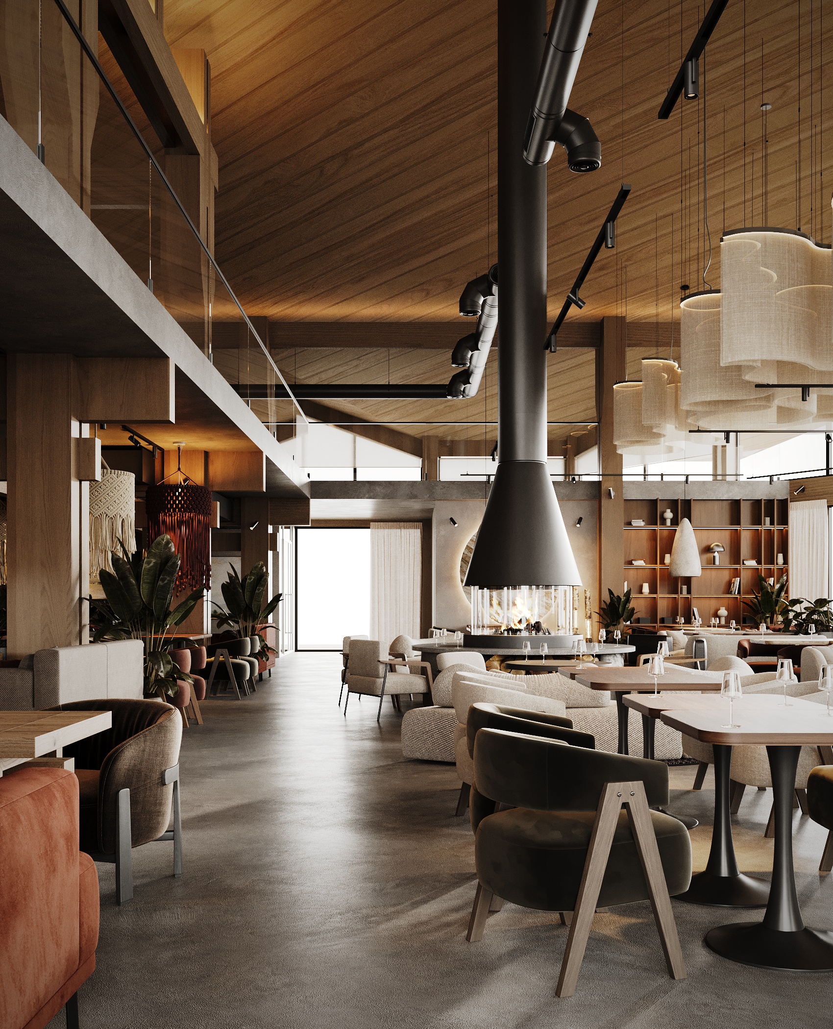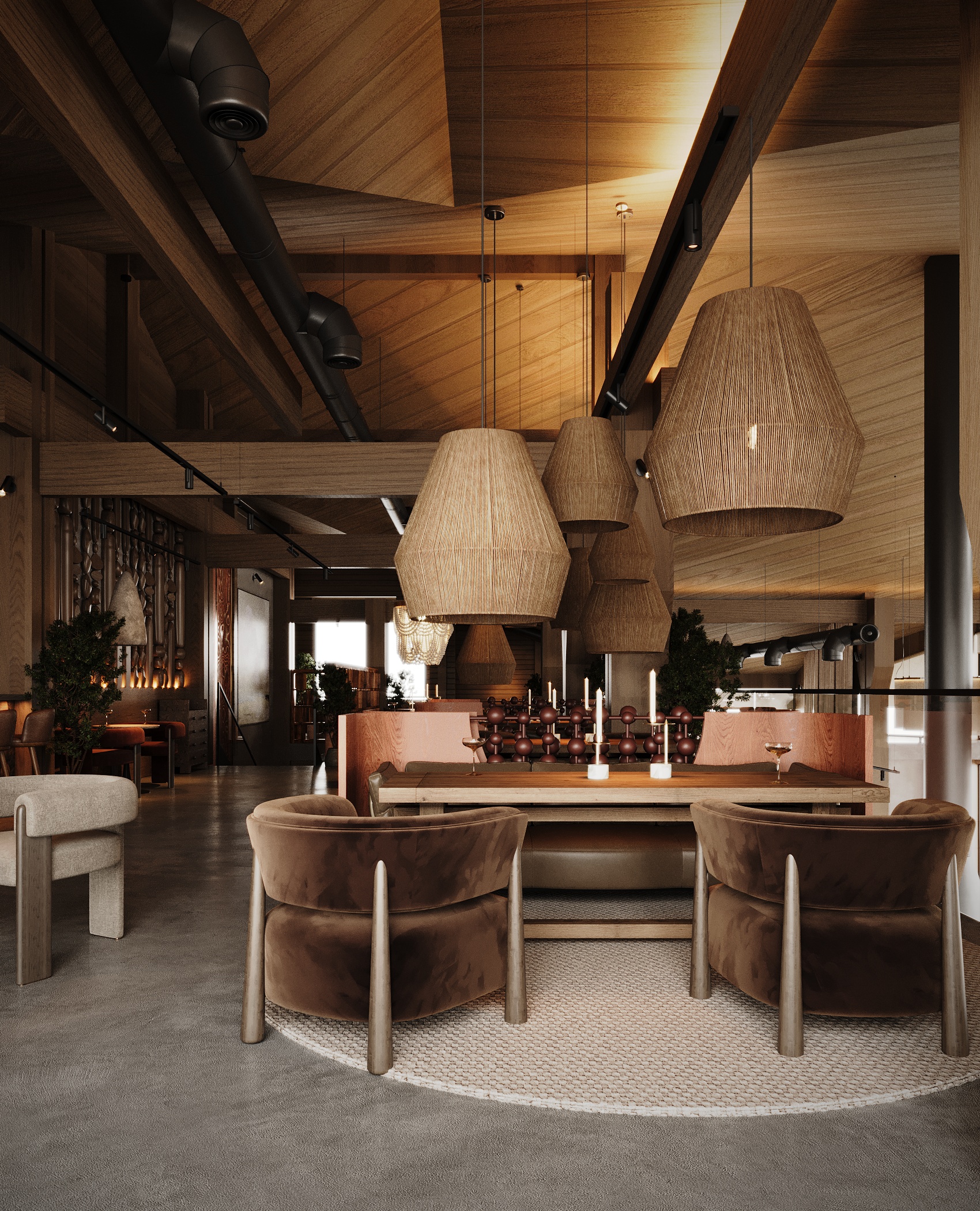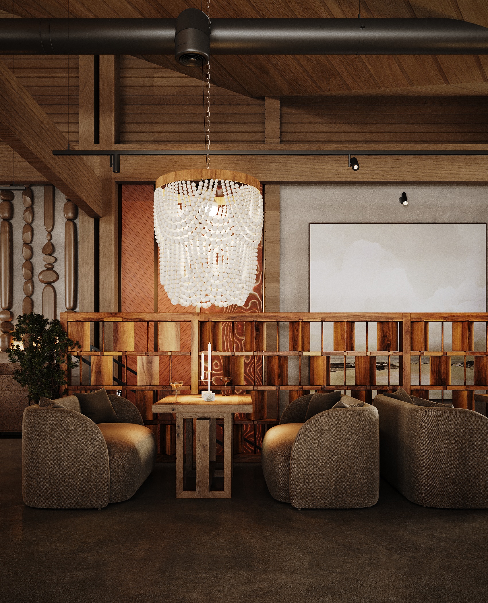 Описание проекта: Эталон современного HoReCa, где на одной территории идеально сосуществуют ресторанная гастрономия, семейный отдых и событийный формат. Дизайн построен на контрасте мужественной брутальности и мягкого уюта: тёплые тона дерева, травертин, чёрный текстурированный камень и обилие тактильного текстиля создают атмосферу, будто сам Хемингуэй вернулся из сафари и решил остаться надолго.