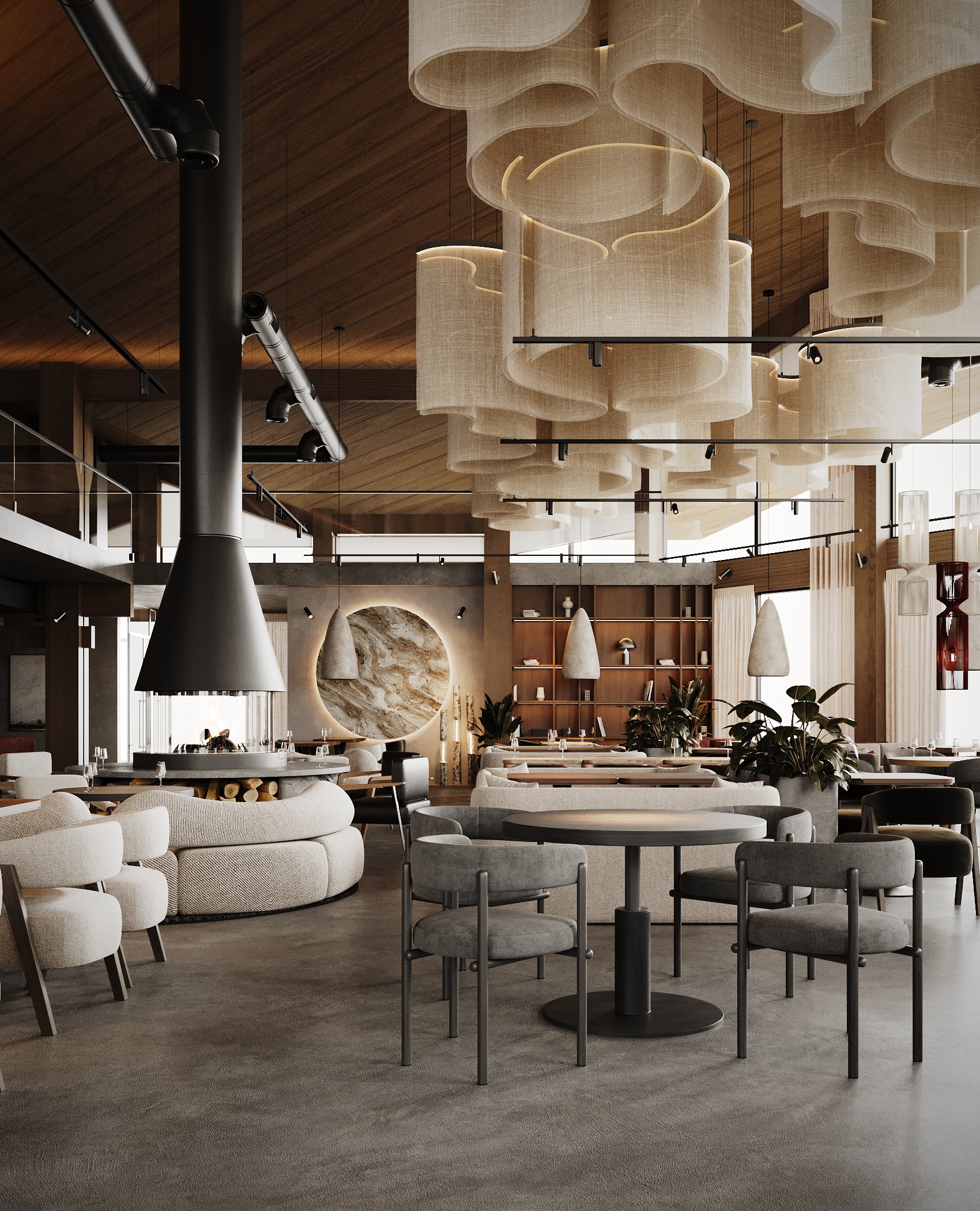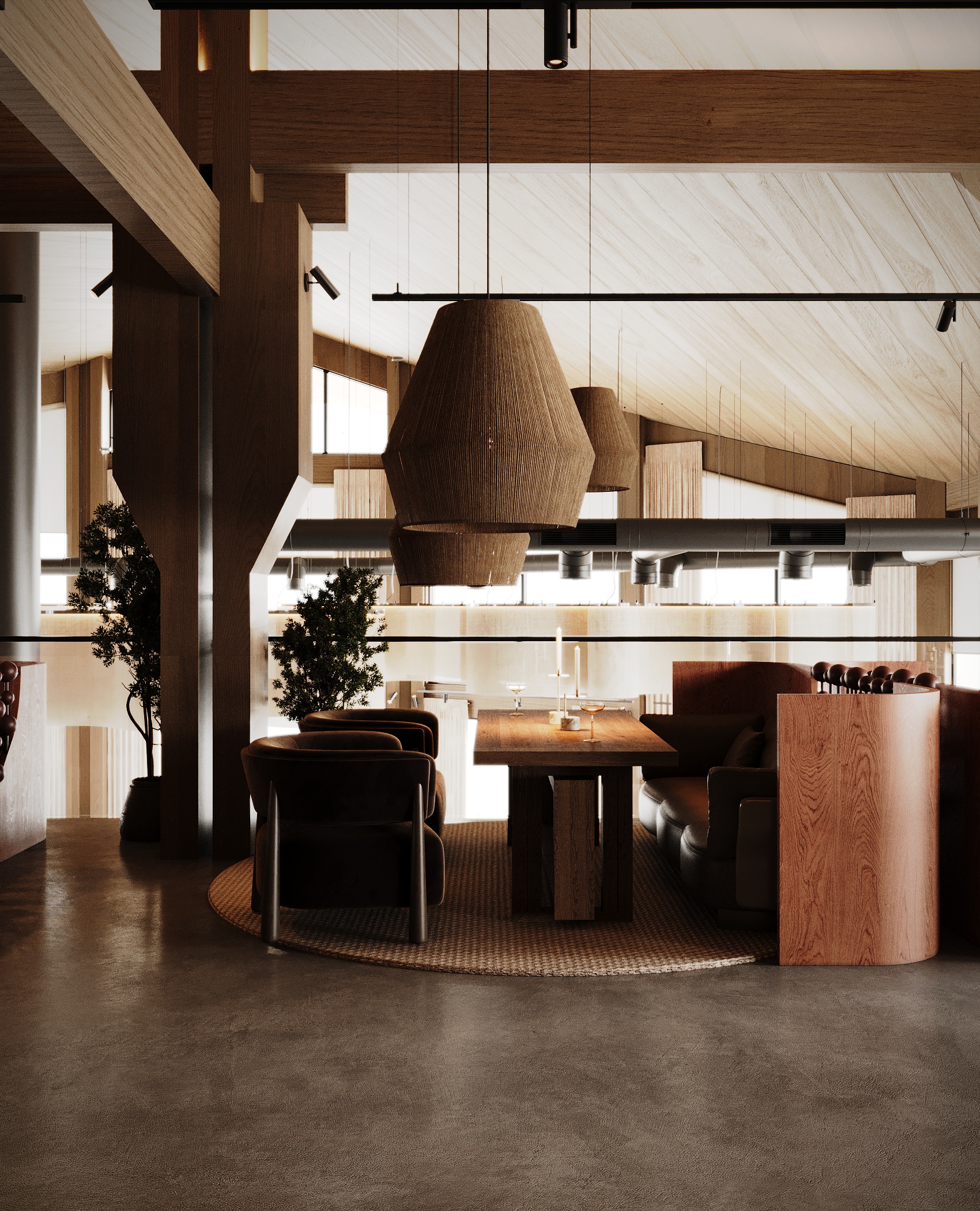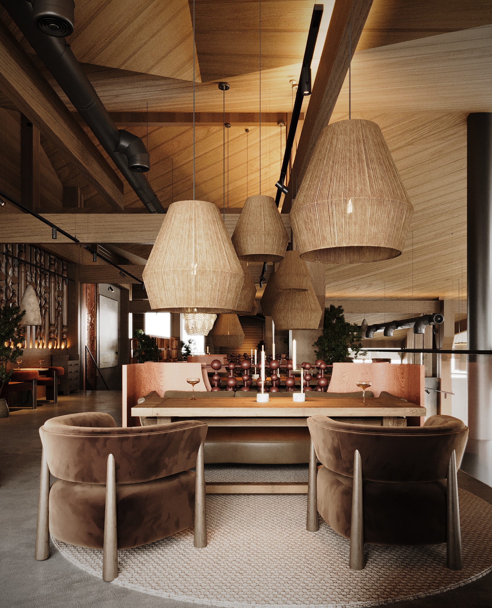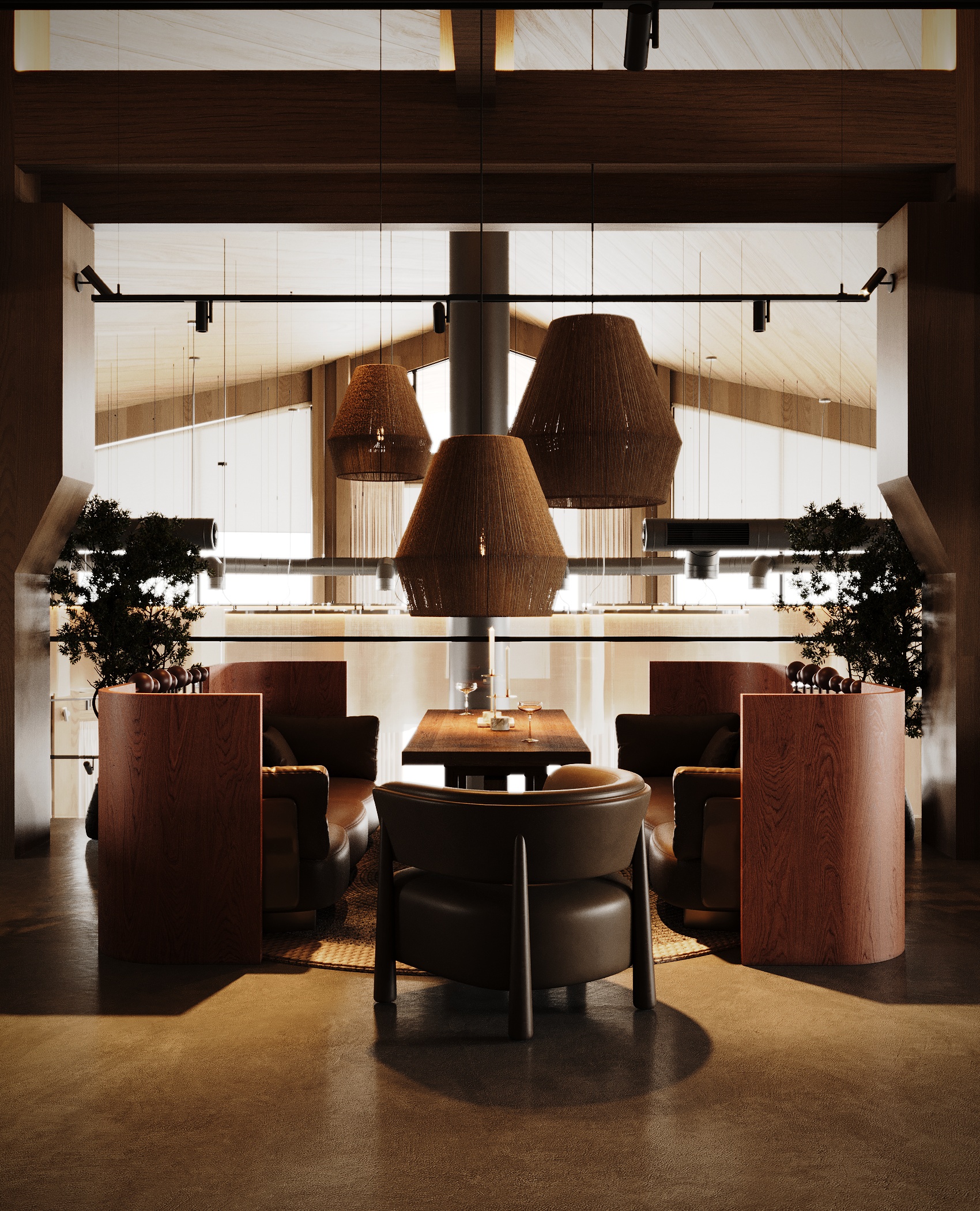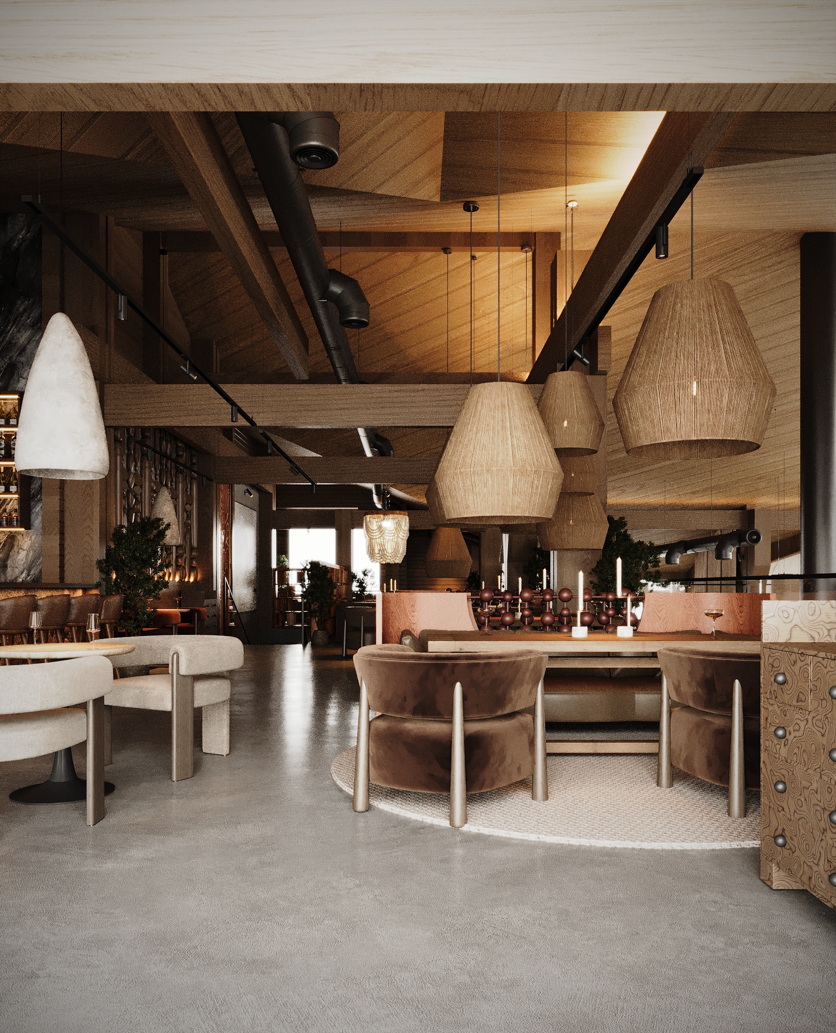 Описание проекта: Эталон современного HoReCa, где на одной территории идеально сосуществуют ресторанная гастрономия, семейный отдых и событийный формат. Дизайн построен на контрасте мужественной брутальности и мягкого уюта: тёплые тона дерева, травертин, чёрный текстурированный камень и обилие тактильного текстиля создают атмосферу, будто сам Хемингуэй вернулся из сафари и решил остаться надолго.