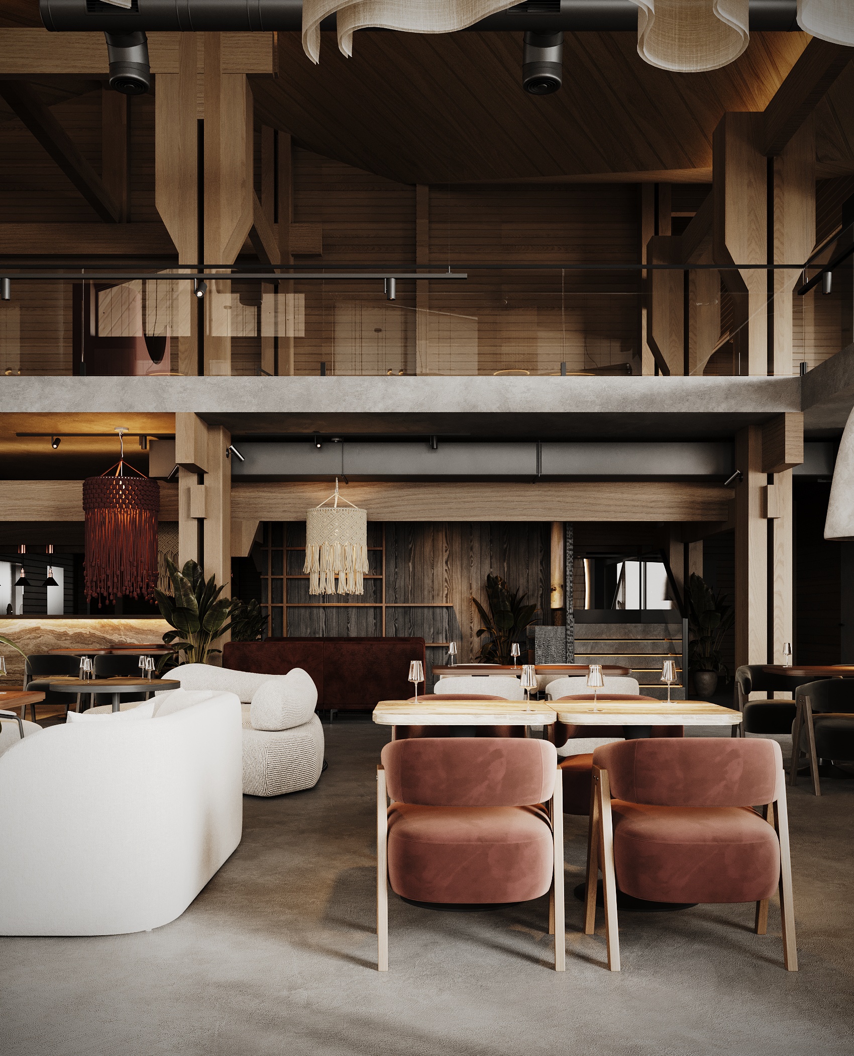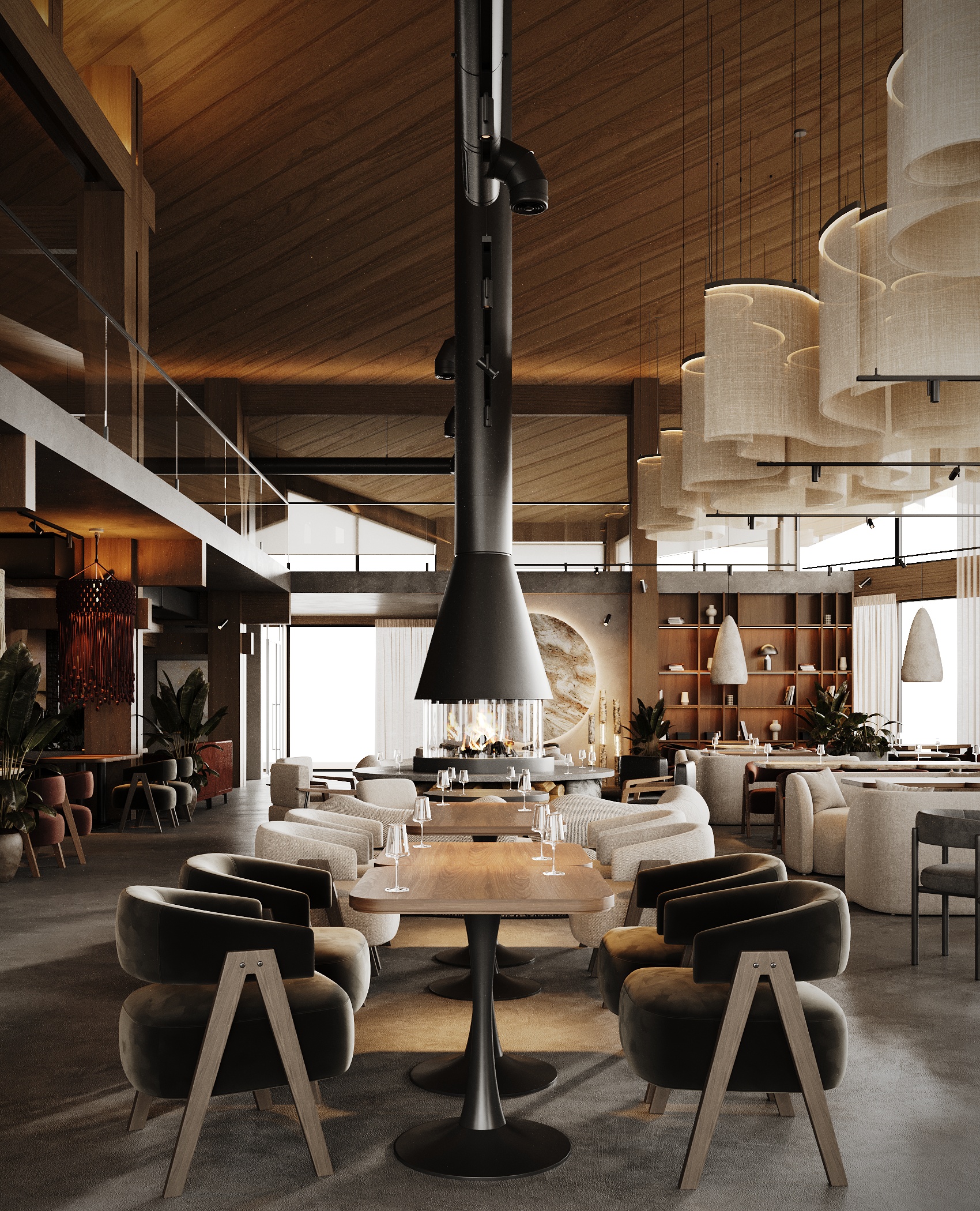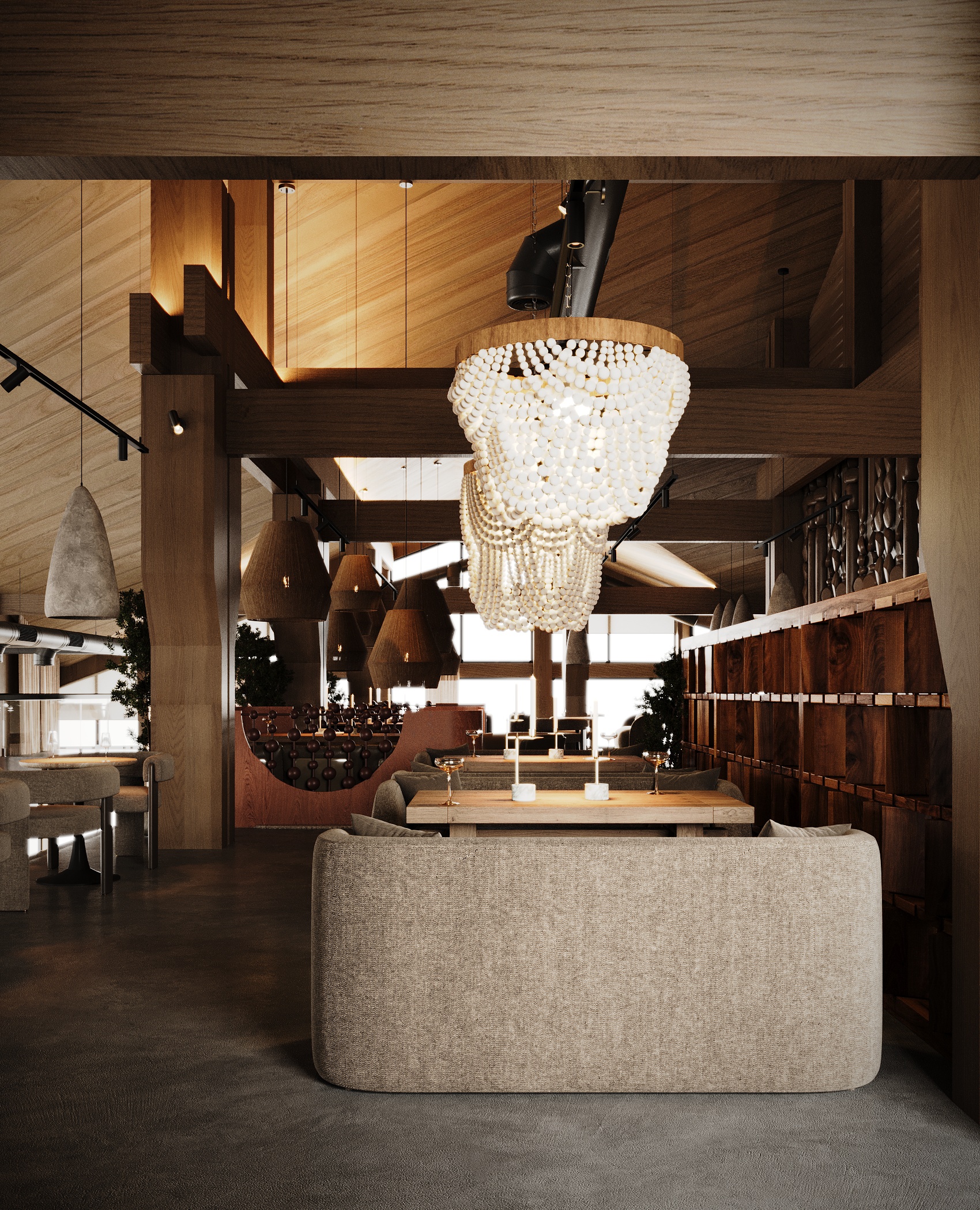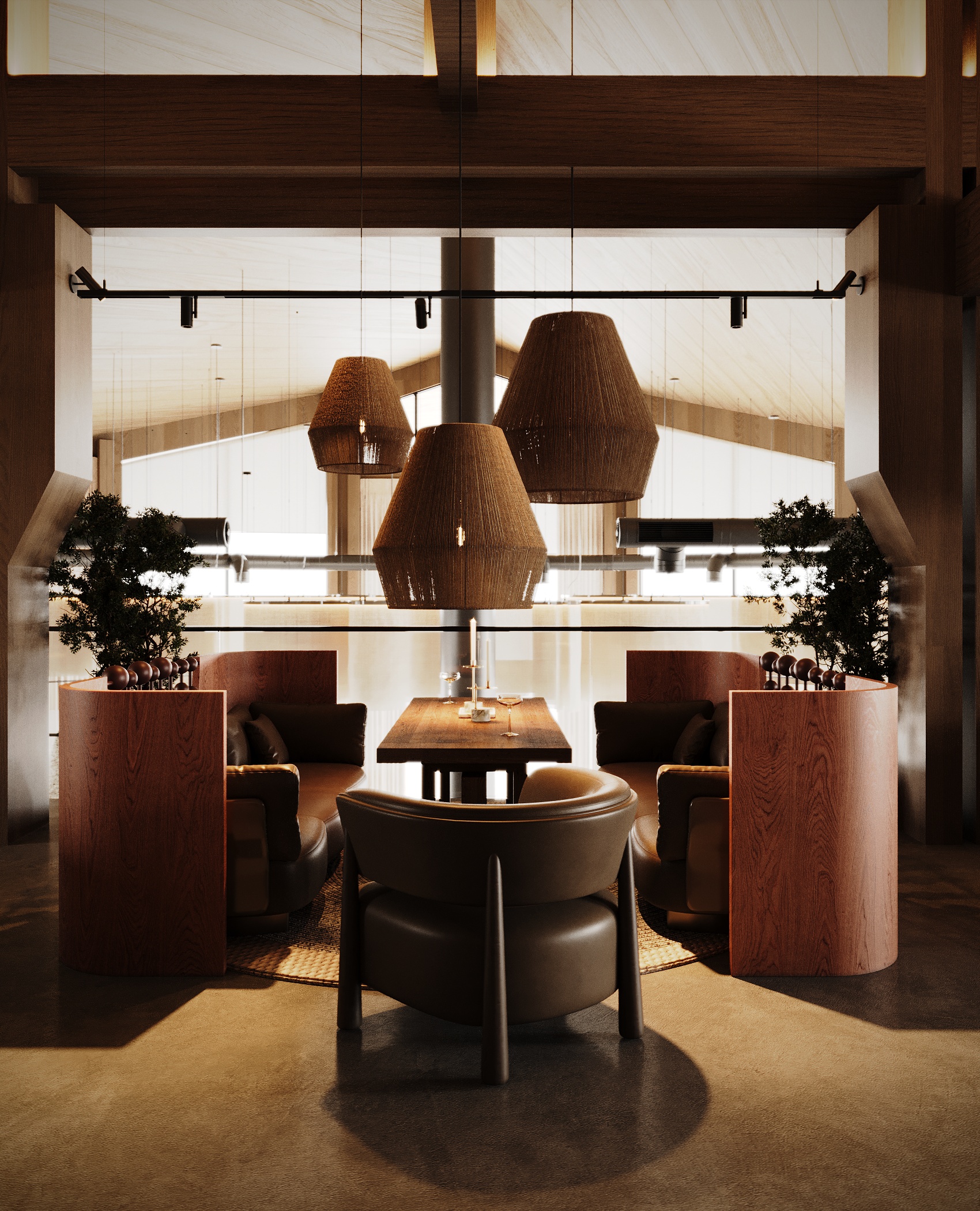 Описание проекта: Эталон современного HoReCa, где на одной территории идеально сосуществуют ресторанная гастрономия, семейный отдых и событийный формат. Дизайн построен на контрасте мужественной брутальности и мягкого уюта: тёплые тона дерева, травертин, чёрный текстурированный камень и обилие тактильного текстиля создают атмосферу, будто сам Хемингуэй вернулся из сафари и решил остаться надолго.