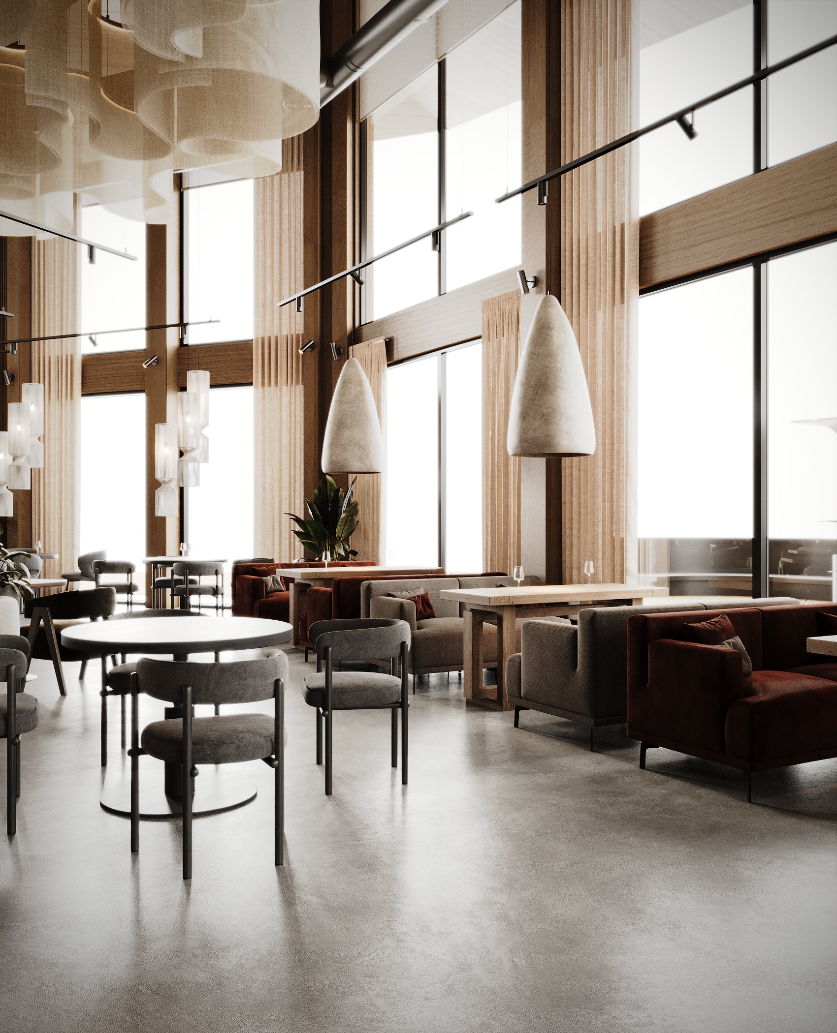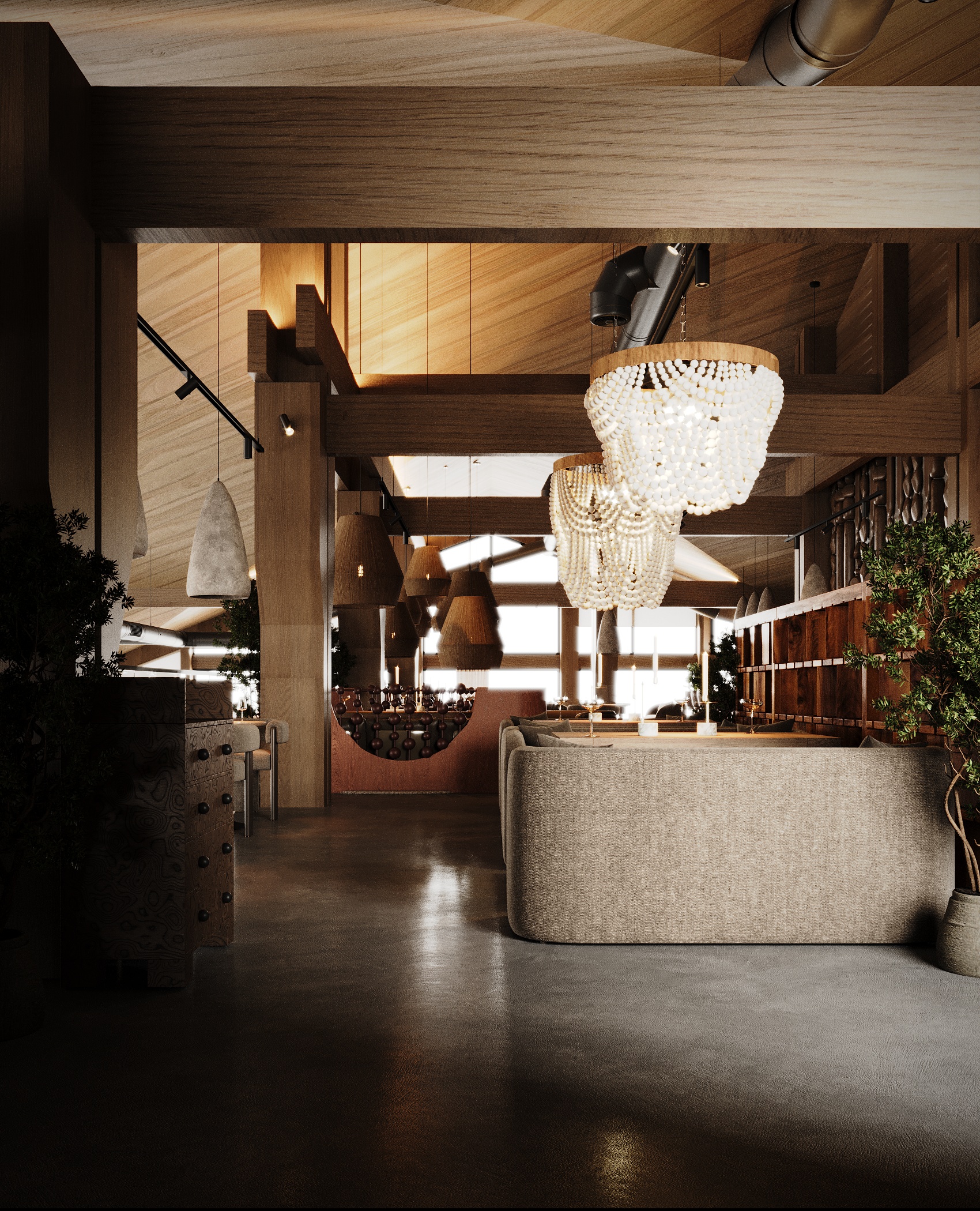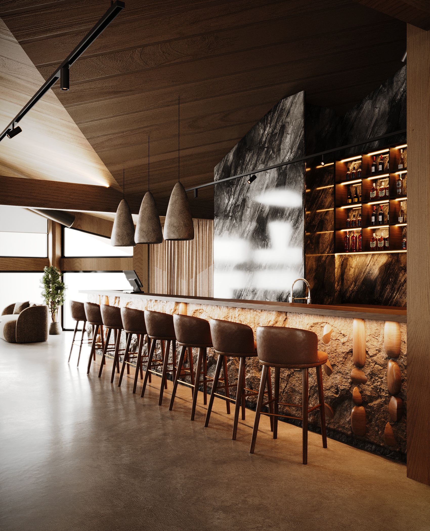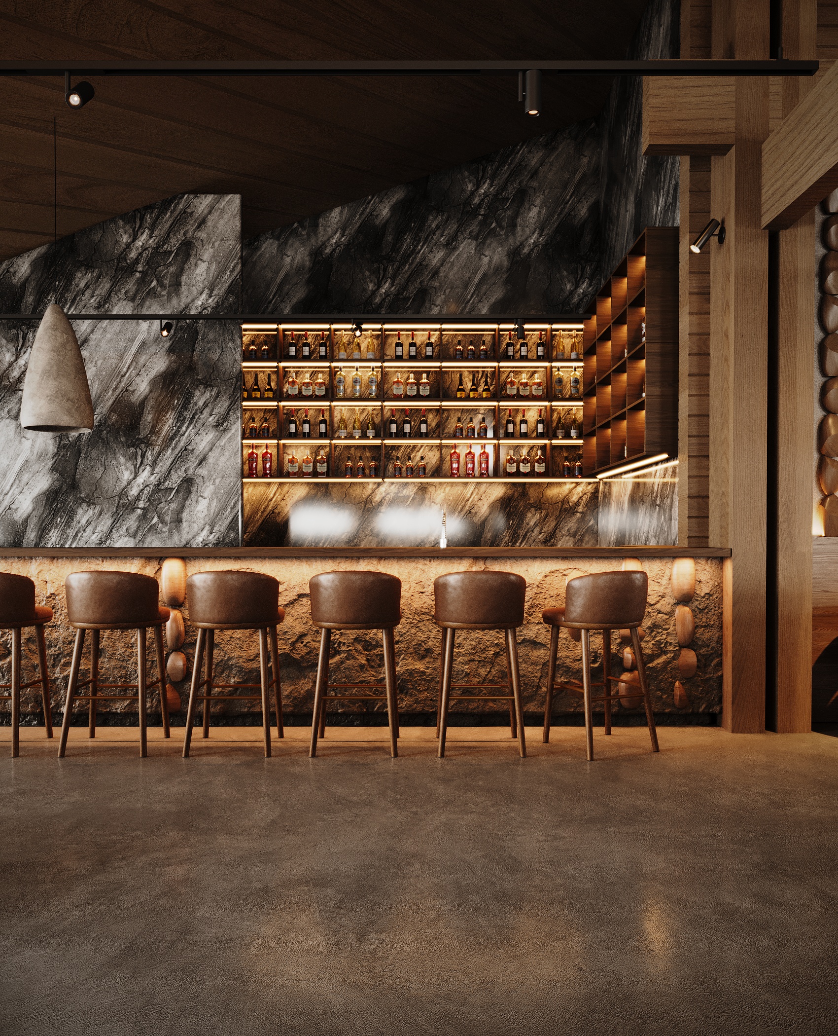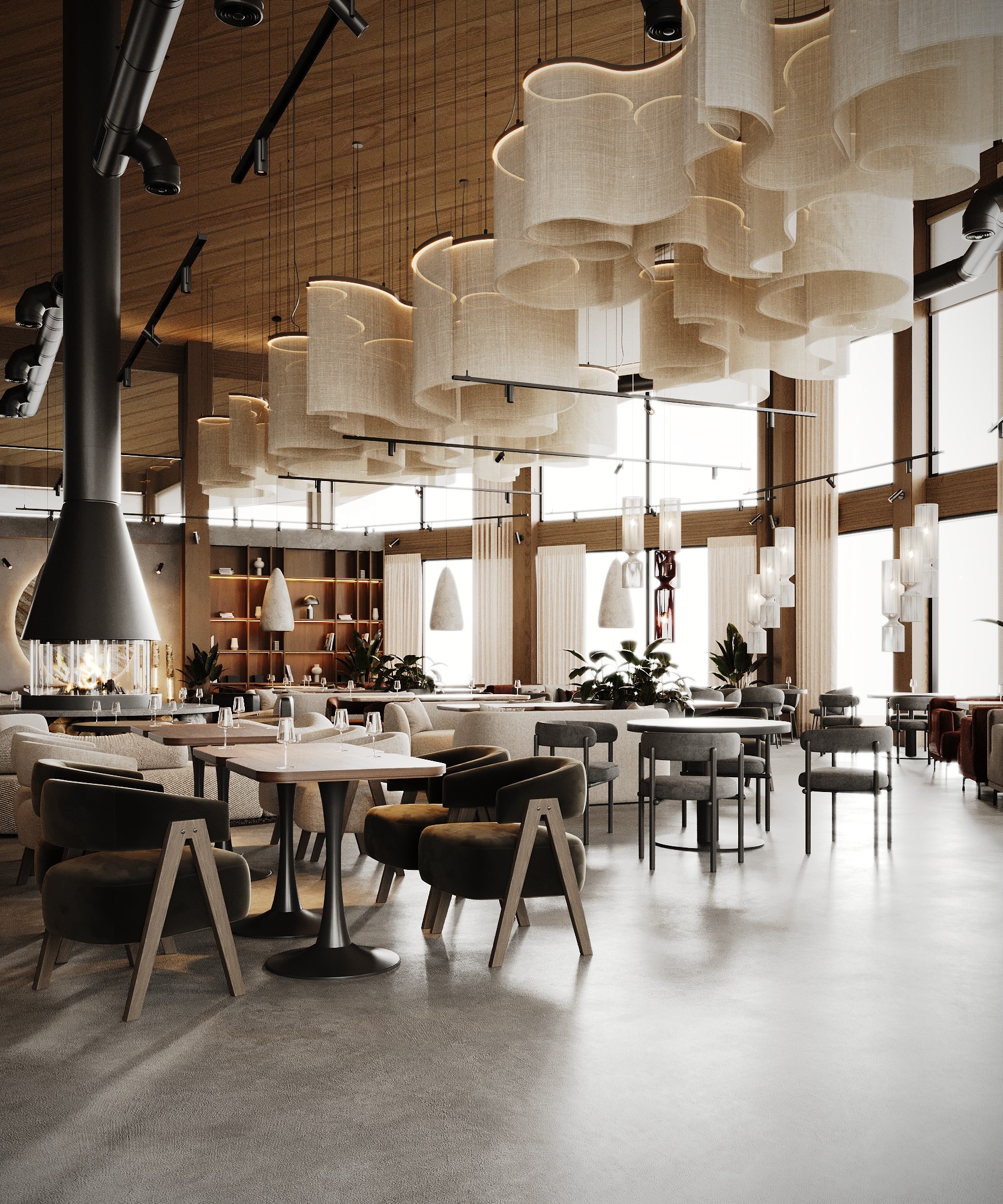 Описание проекта: Эталон современного HoReCa, где на одной территории идеально сосуществуют ресторанная гастрономия, семейный отдых и событийный формат. Дизайн построен на контрасте мужественной брутальности и мягкого уюта: тёплые тона дерева, травертин, чёрный текстурированный камень и обилие тактильного текстиля создают атмосферу, будто сам Хемингуэй вернулся из сафари и решил остаться надолго.