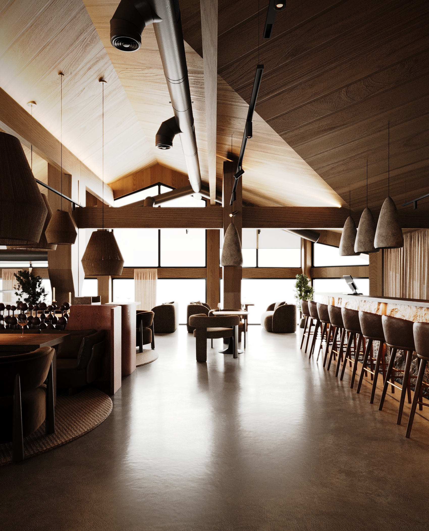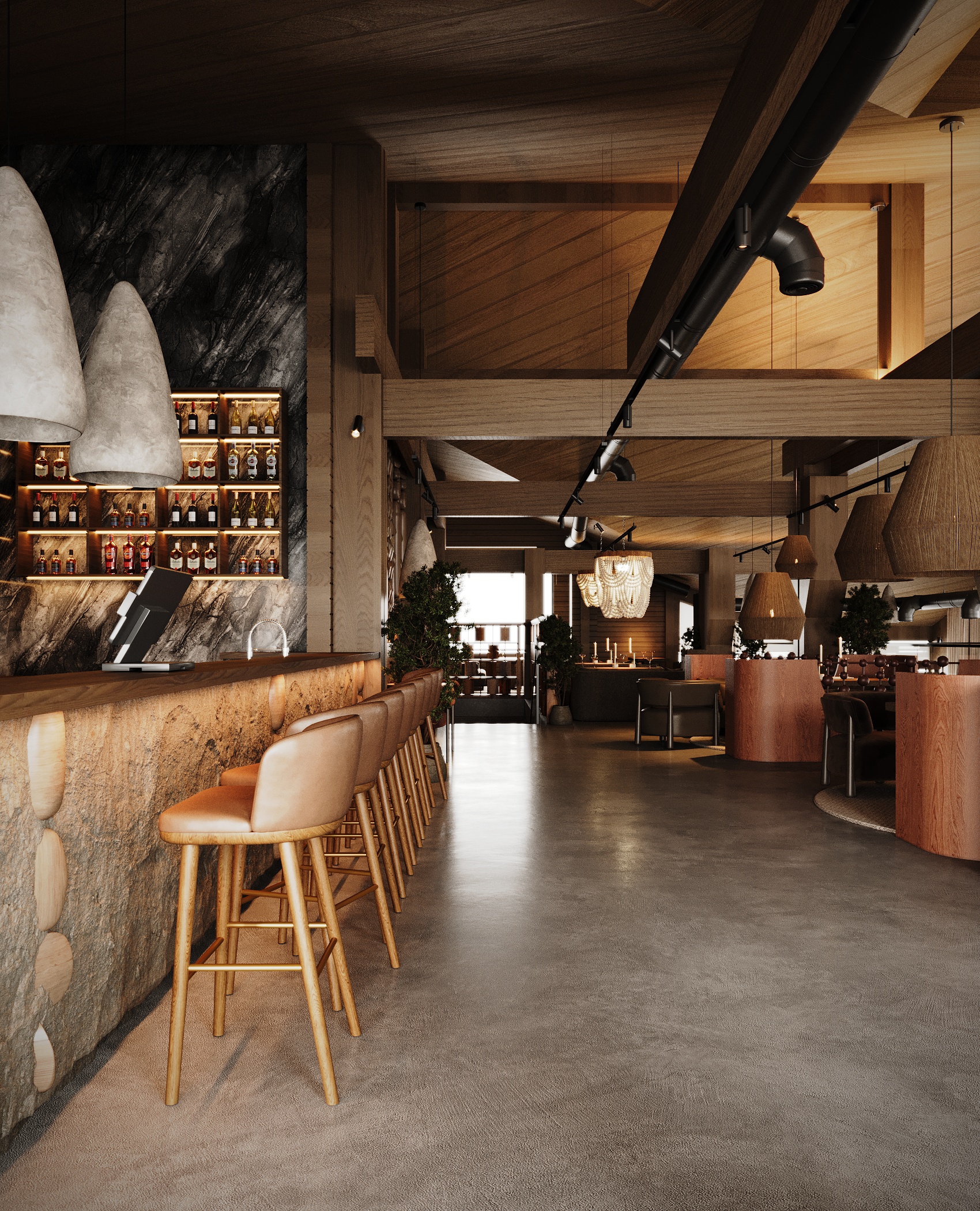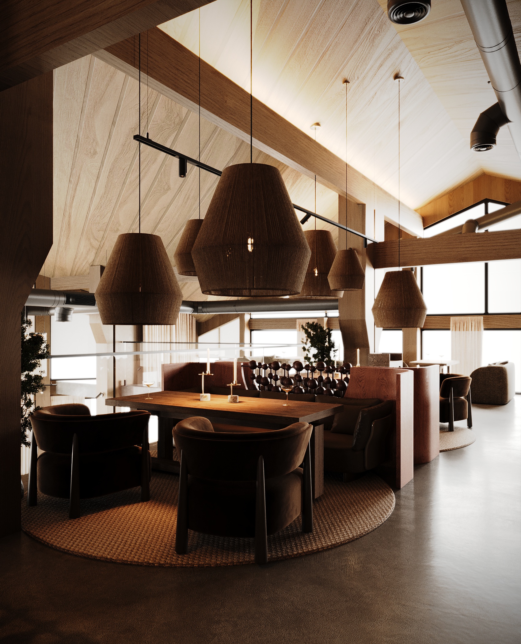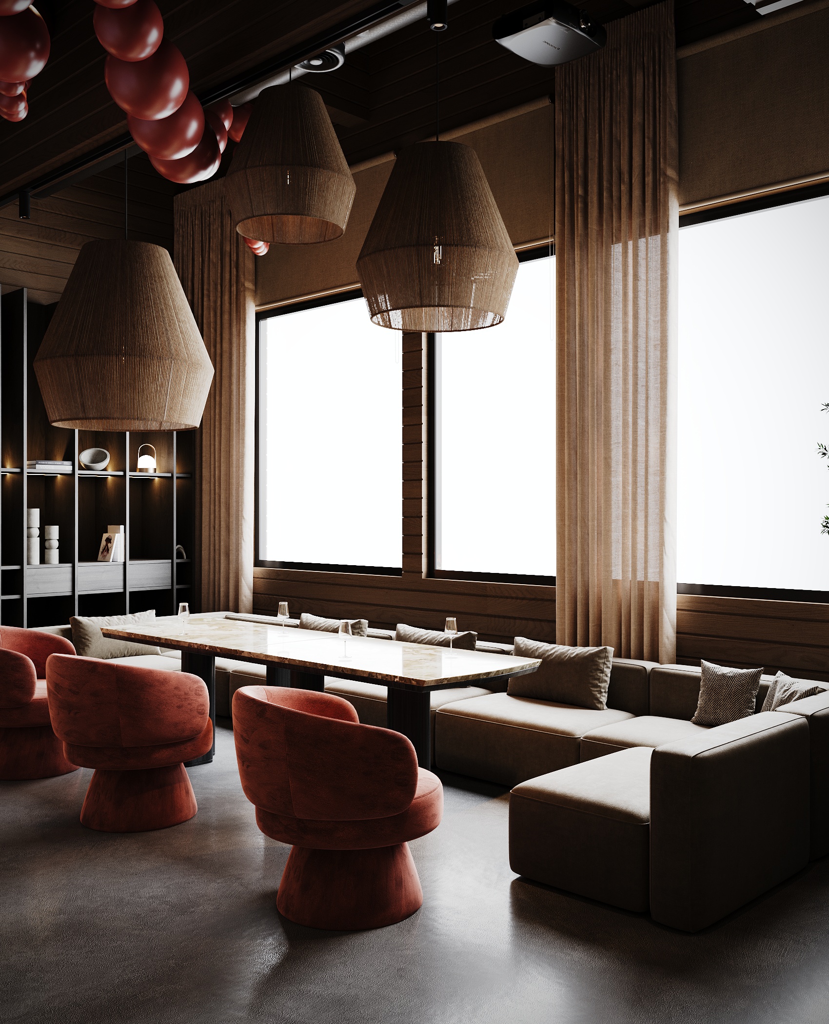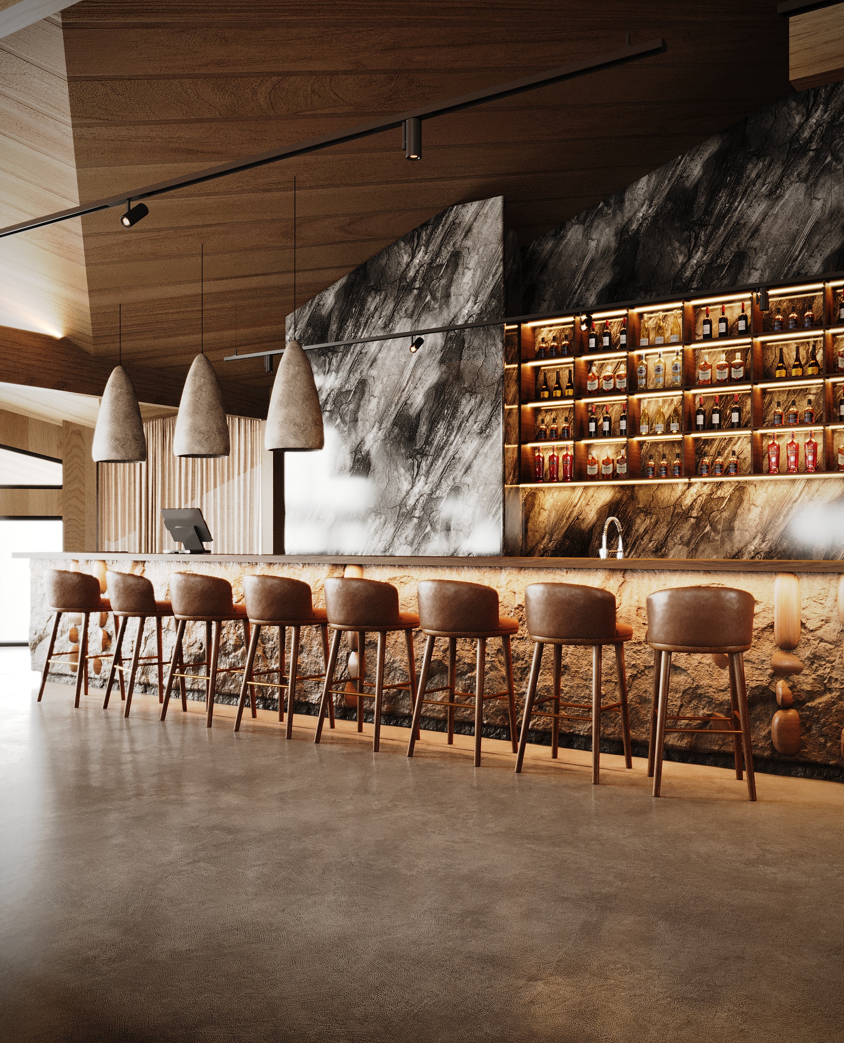 Описание проекта: Эталон современного HoReCa, где на одной территории идеально сосуществуют ресторанная гастрономия, семейный отдых и событийный формат. Дизайн построен на контрасте мужественной брутальности и мягкого уюта: тёплые тона дерева, травертин, чёрный текстурированный камень и обилие тактильного текстиля создают атмосферу, будто сам Хемингуэй вернулся из сафари и решил остаться надолго.