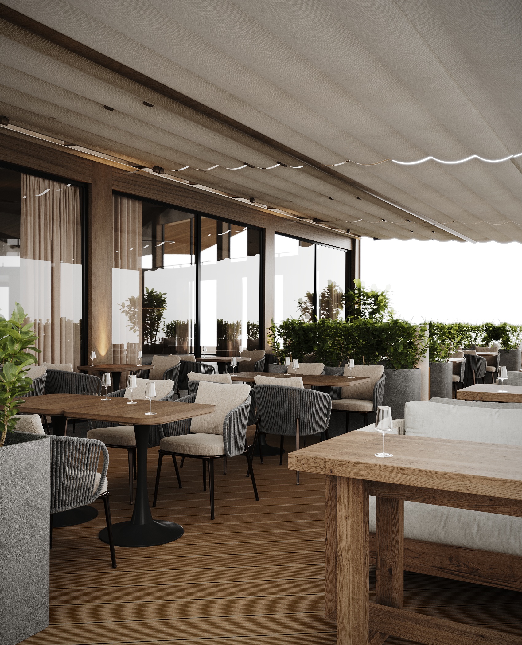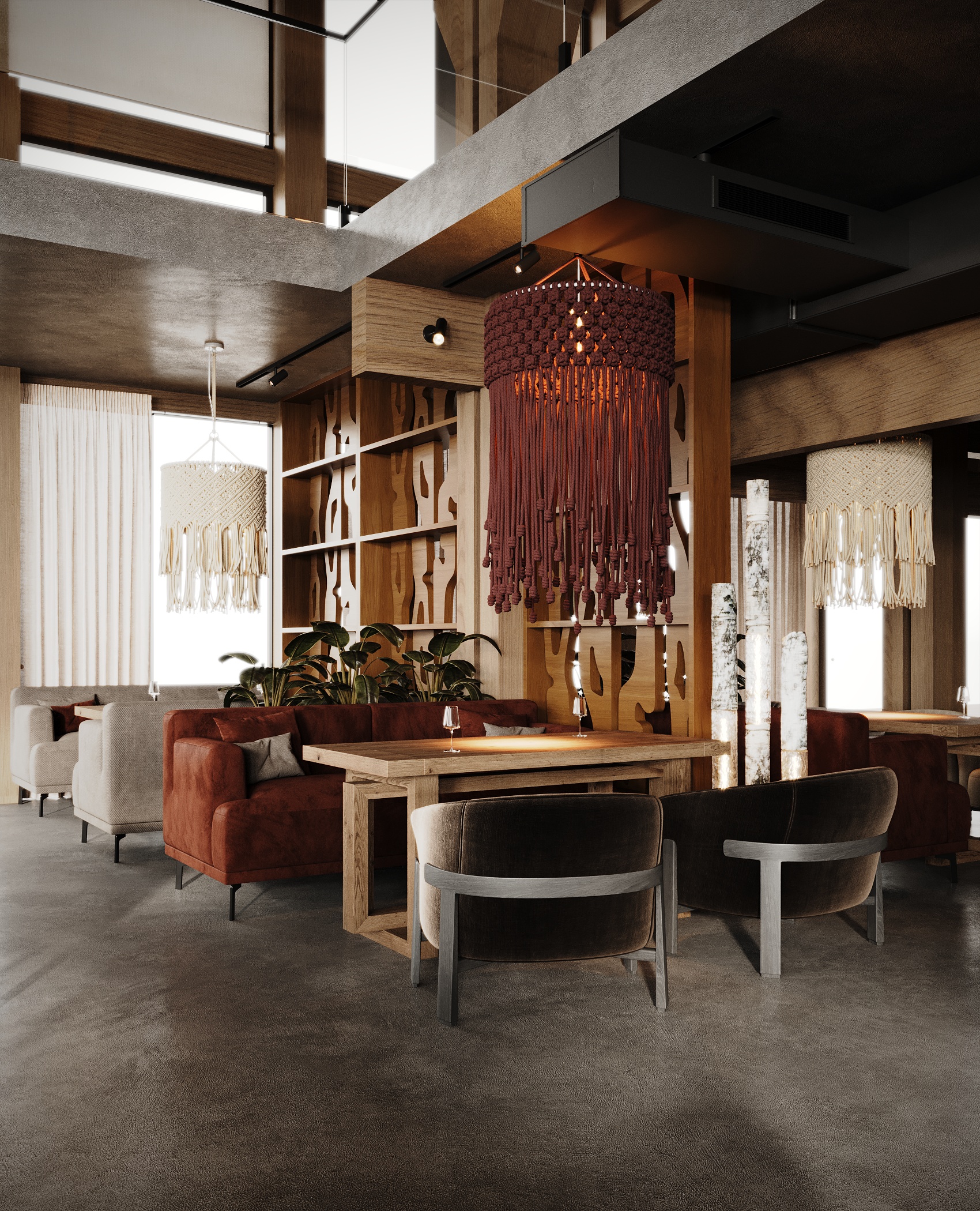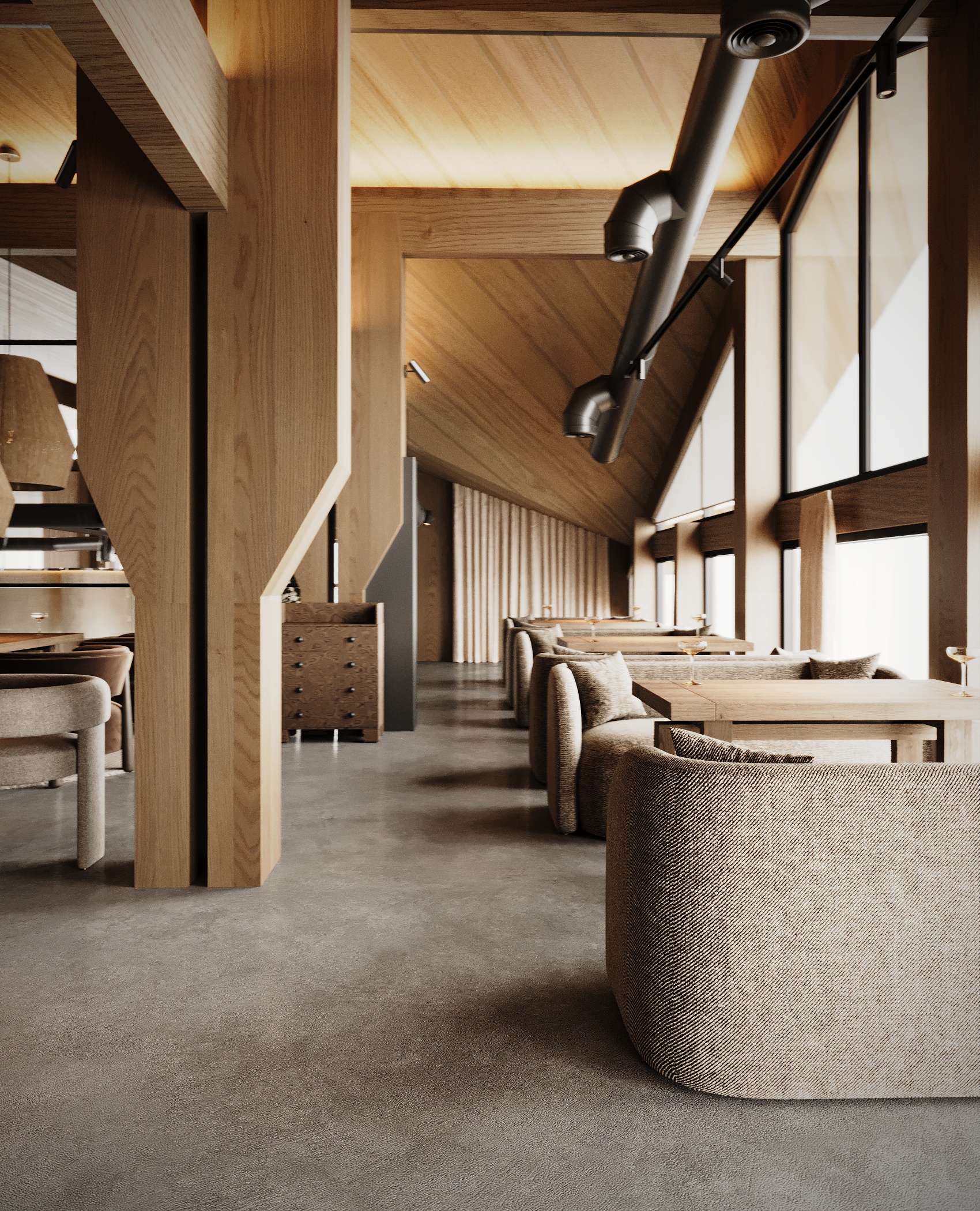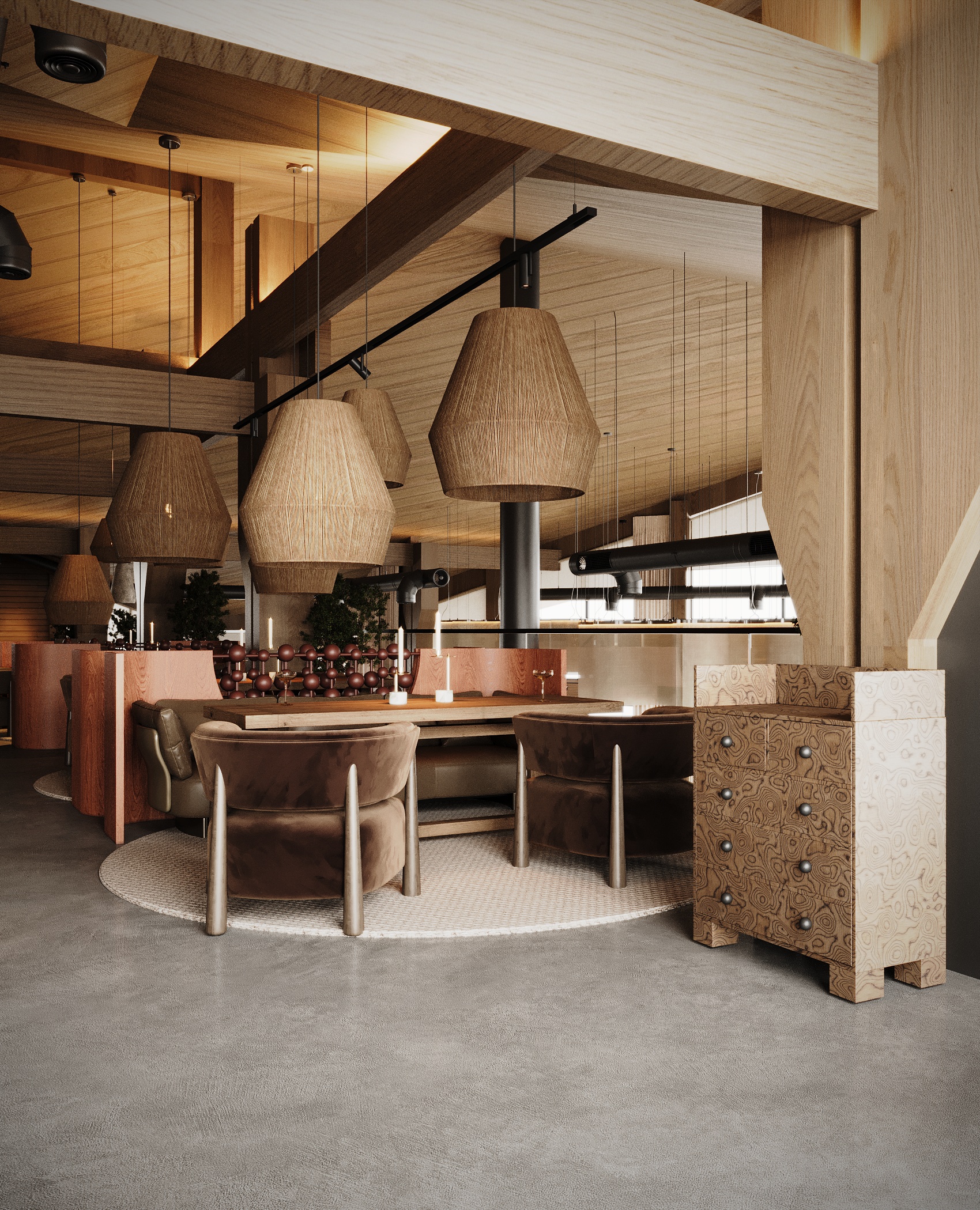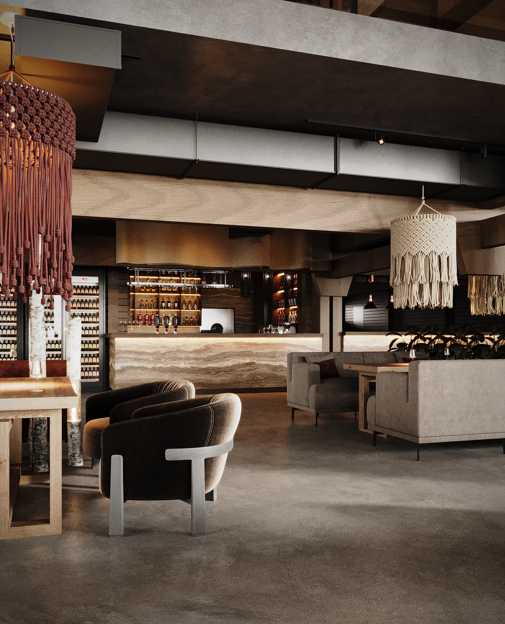 Описание проекта: Эталон современного HoReCa, где на одной территории идеально сосуществуют ресторанная гастрономия, семейный отдых и событийный формат. Дизайн построен на контрасте мужественной брутальности и мягкого уюта: тёплые тона дерева, травертин, чёрный текстурированный камень и обилие тактильного текстиля создают атмосферу, будто сам Хемингуэй вернулся из сафари и решил остаться надолго.