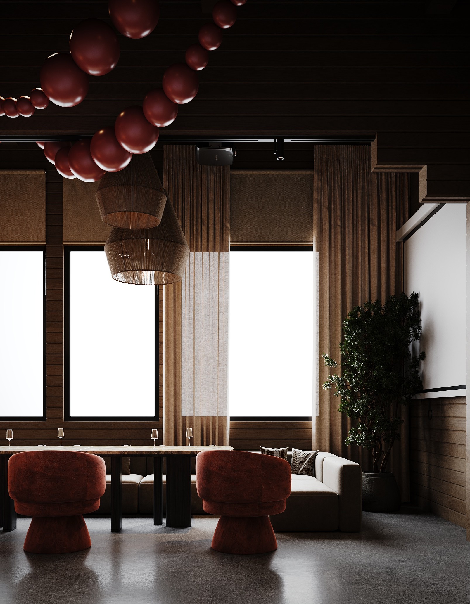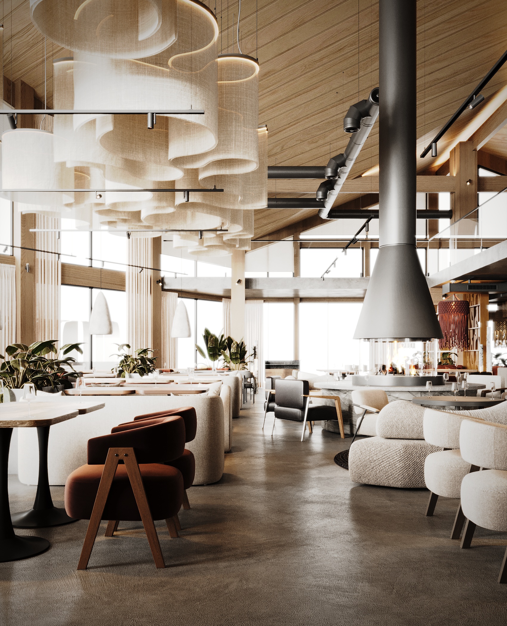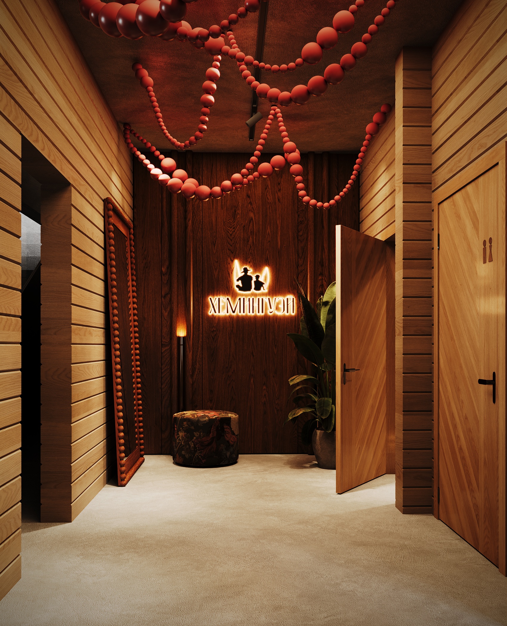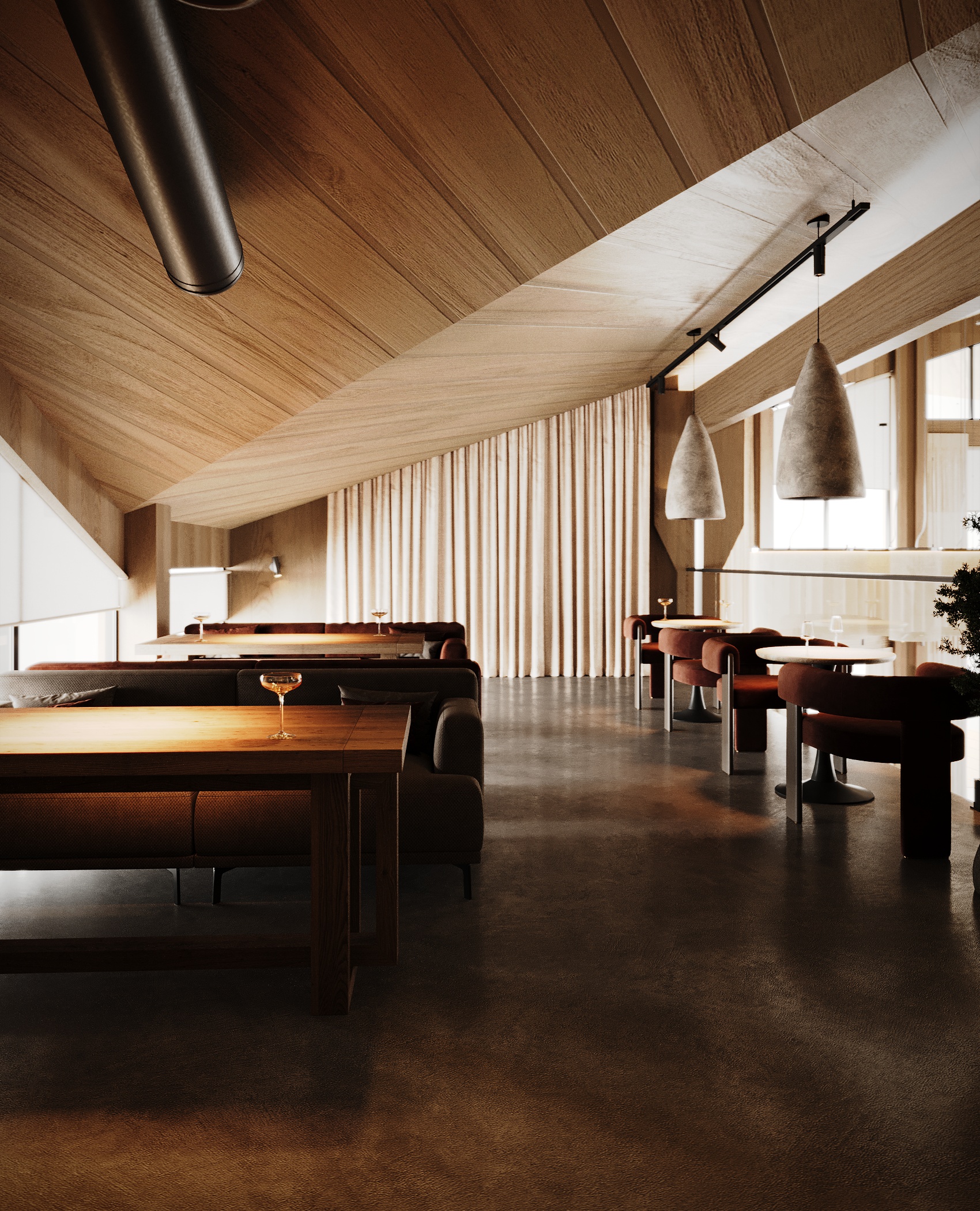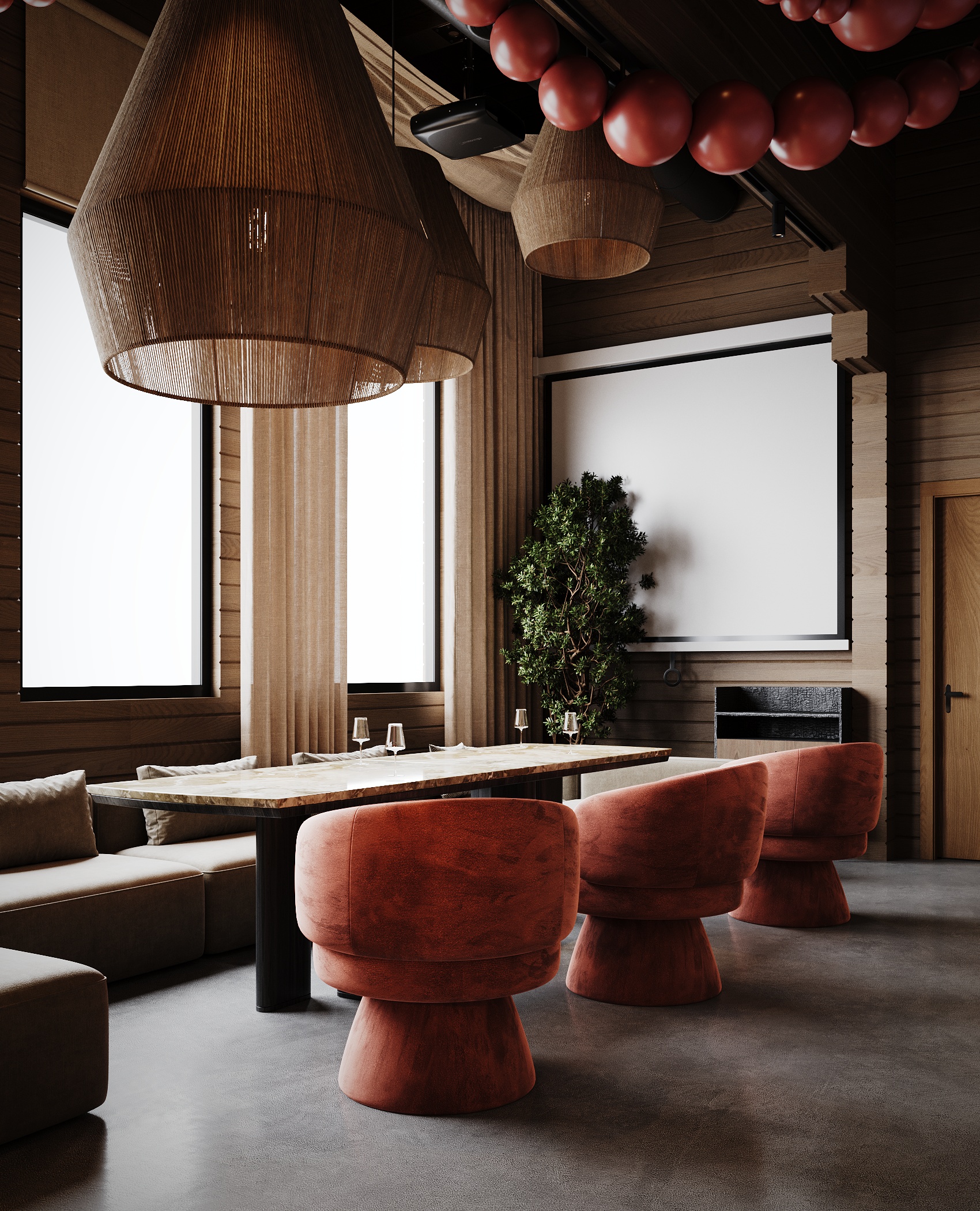 Описание проекта: Эталон современного HoReCa, где на одной территории идеально сосуществуют ресторанная гастрономия, семейный отдых и событийный формат. Дизайн построен на контрасте мужественной брутальности и мягкого уюта: тёплые тона дерева, травертин, чёрный текстурированный камень и обилие тактильного текстиля создают атмосферу, будто сам Хемингуэй вернулся из сафари и решил остаться надолго.