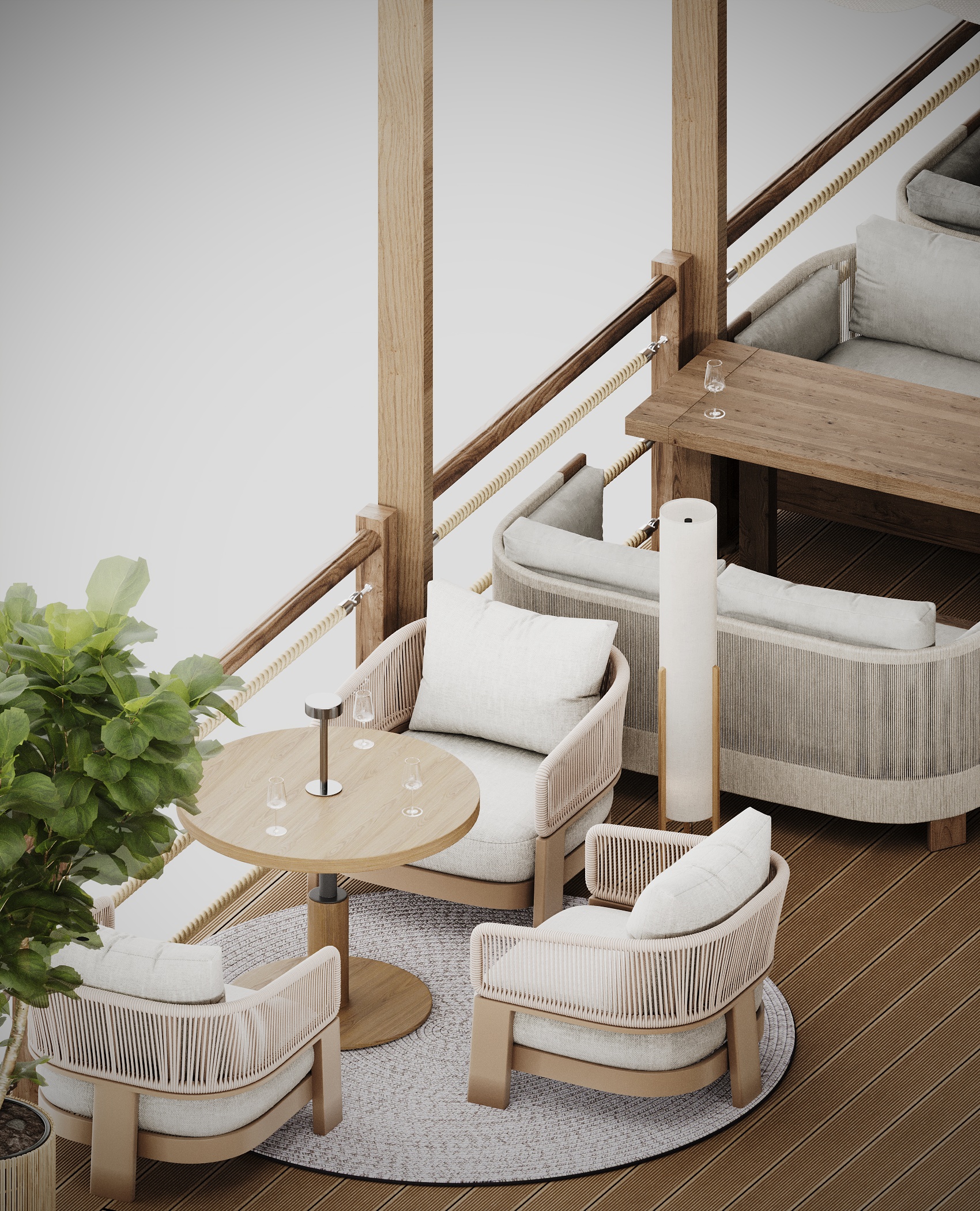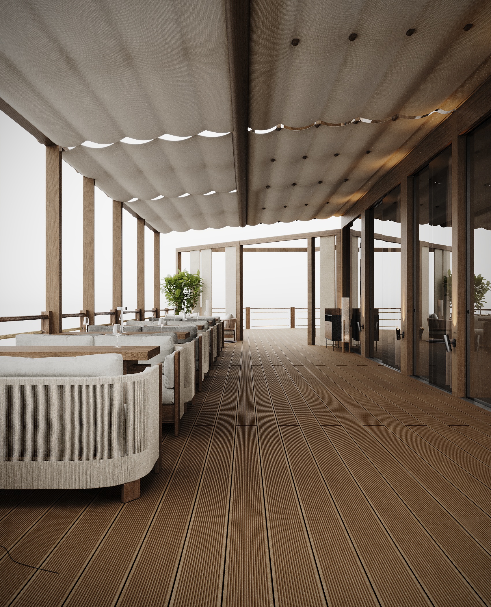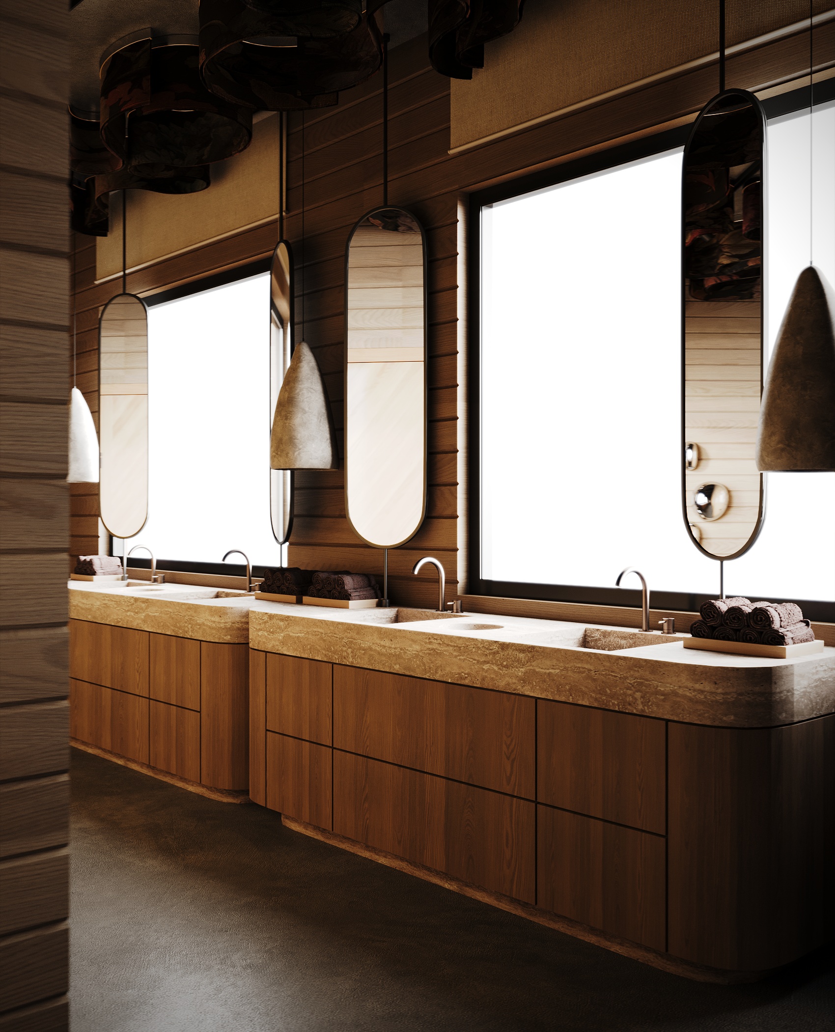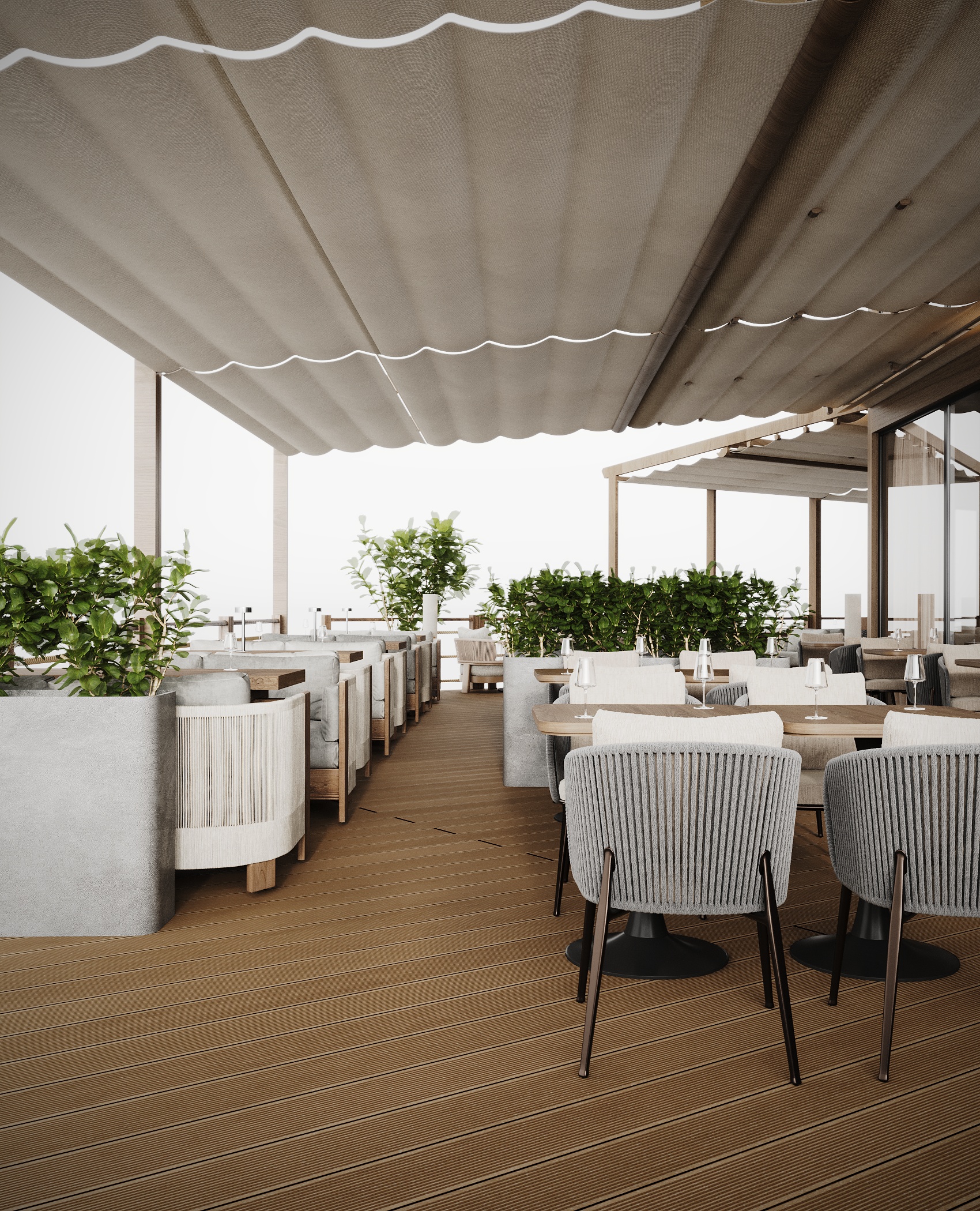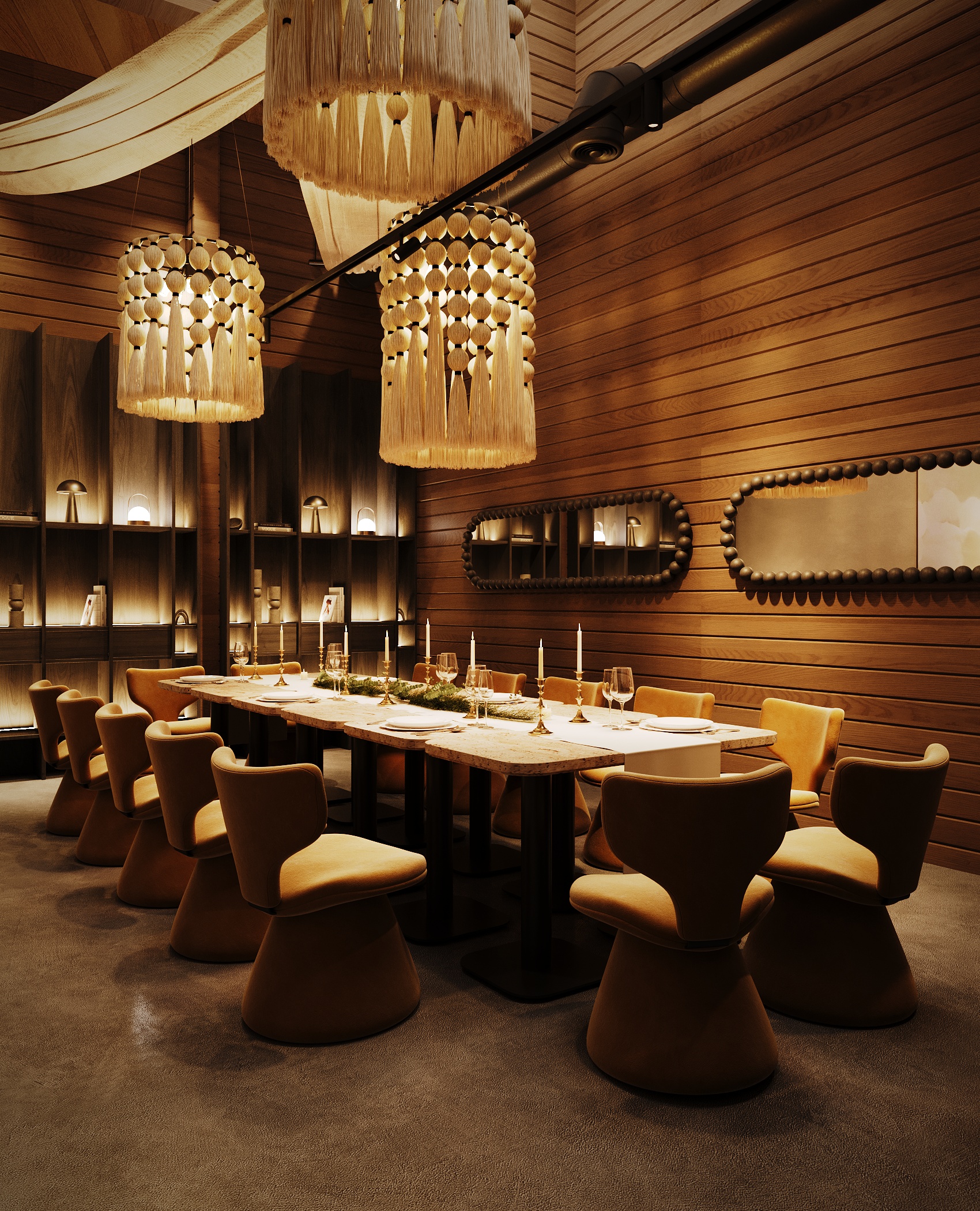 Описание проекта: Эталон современного HoReCa, где на одной территории идеально сосуществуют ресторанная гастрономия, семейный отдых и событийный формат. Дизайн построен на контрасте мужественной брутальности и мягкого уюта: тёплые тона дерева, травертин, чёрный текстурированный камень и обилие тактильного текстиля создают атмосферу, будто сам Хемингуэй вернулся из сафари и решил остаться надолго.