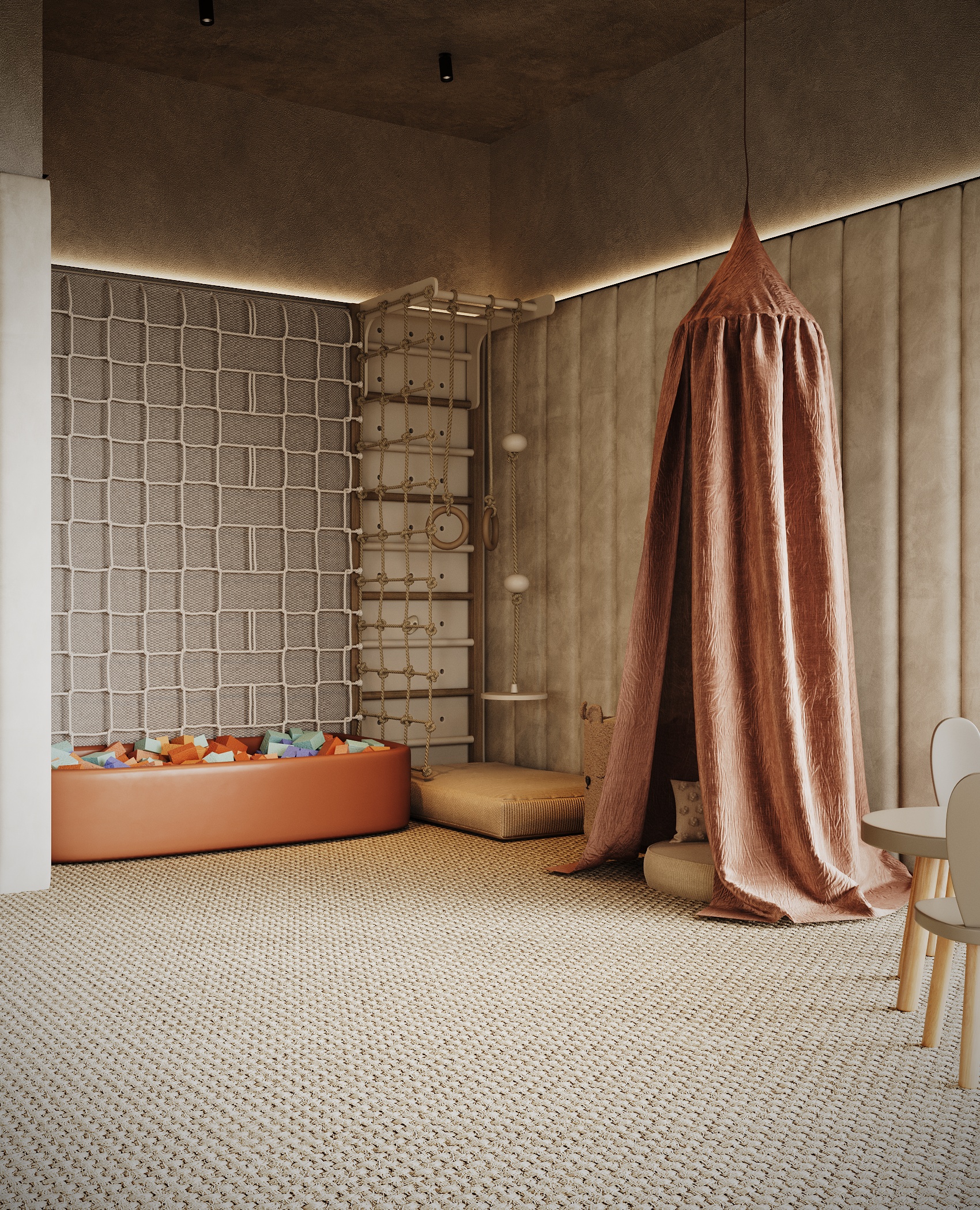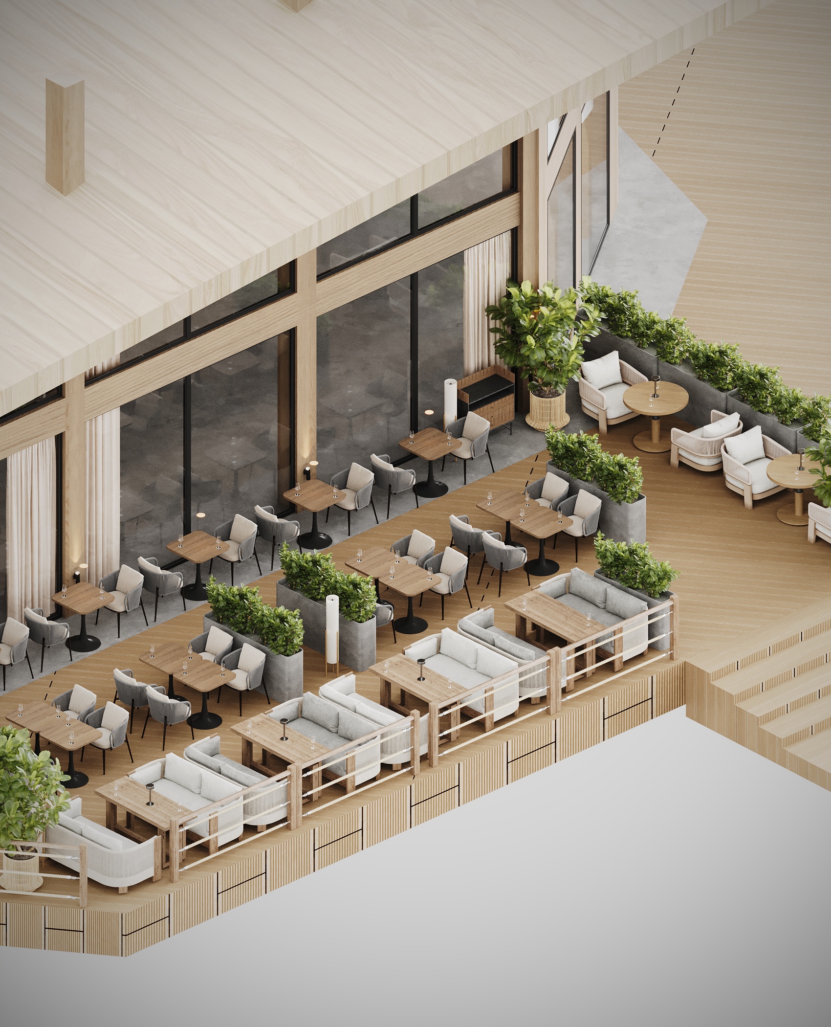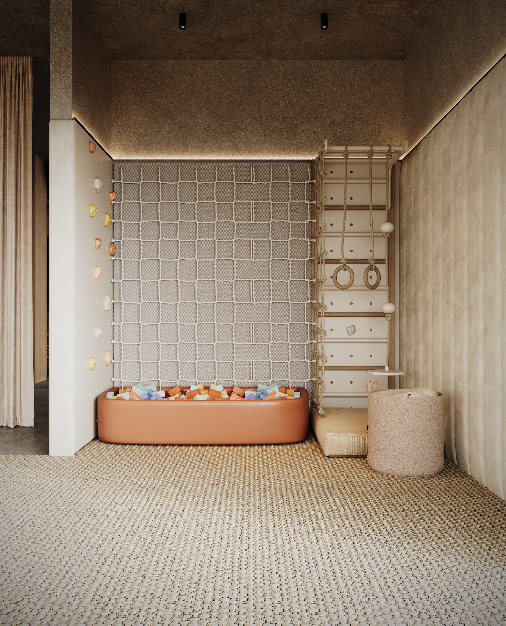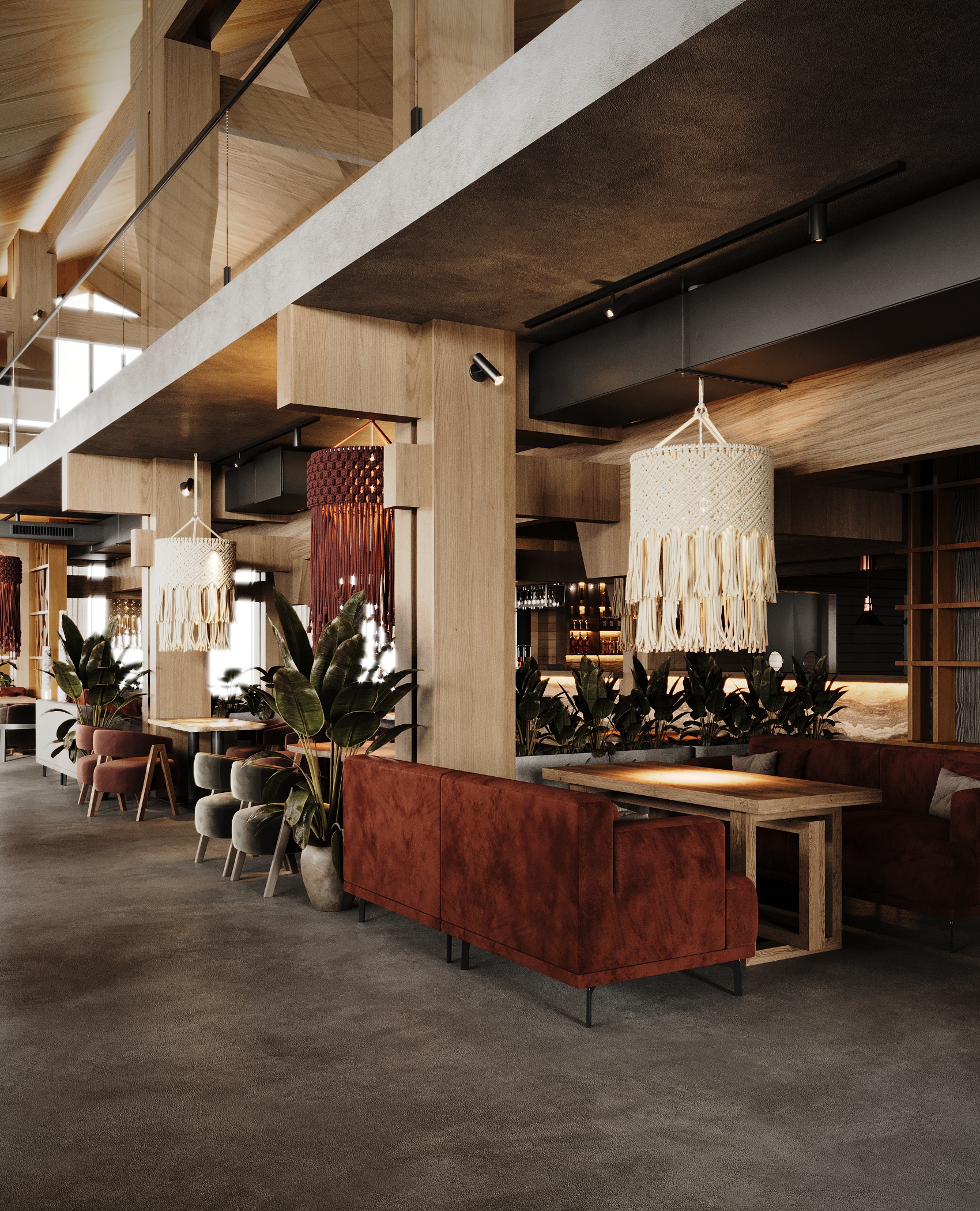 Первый этаж — динамичное «сердце» заведения. Бар и открытая кухня выстроены единым фронтом: гости видят процесс, слышат шипение сковород и ощущают энергию. Рядом — детская игровая зона с мягким покрытием, бассейном-шариками, канатным городком и уютным балдахином: родители отдыхают, дети в безопасности и под присмотром. Протяжённая открытая терраса с деревянным настилом и встроенной подсветкой становится естественным продолжением интерьера — идеальное место для летних ужинов и бранчей.