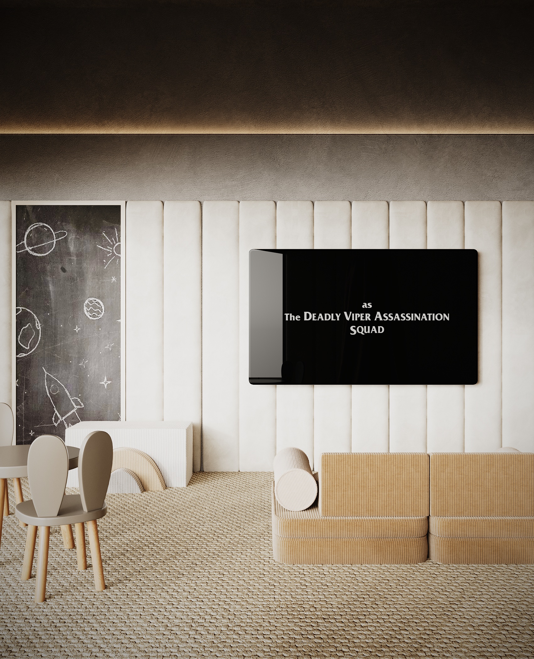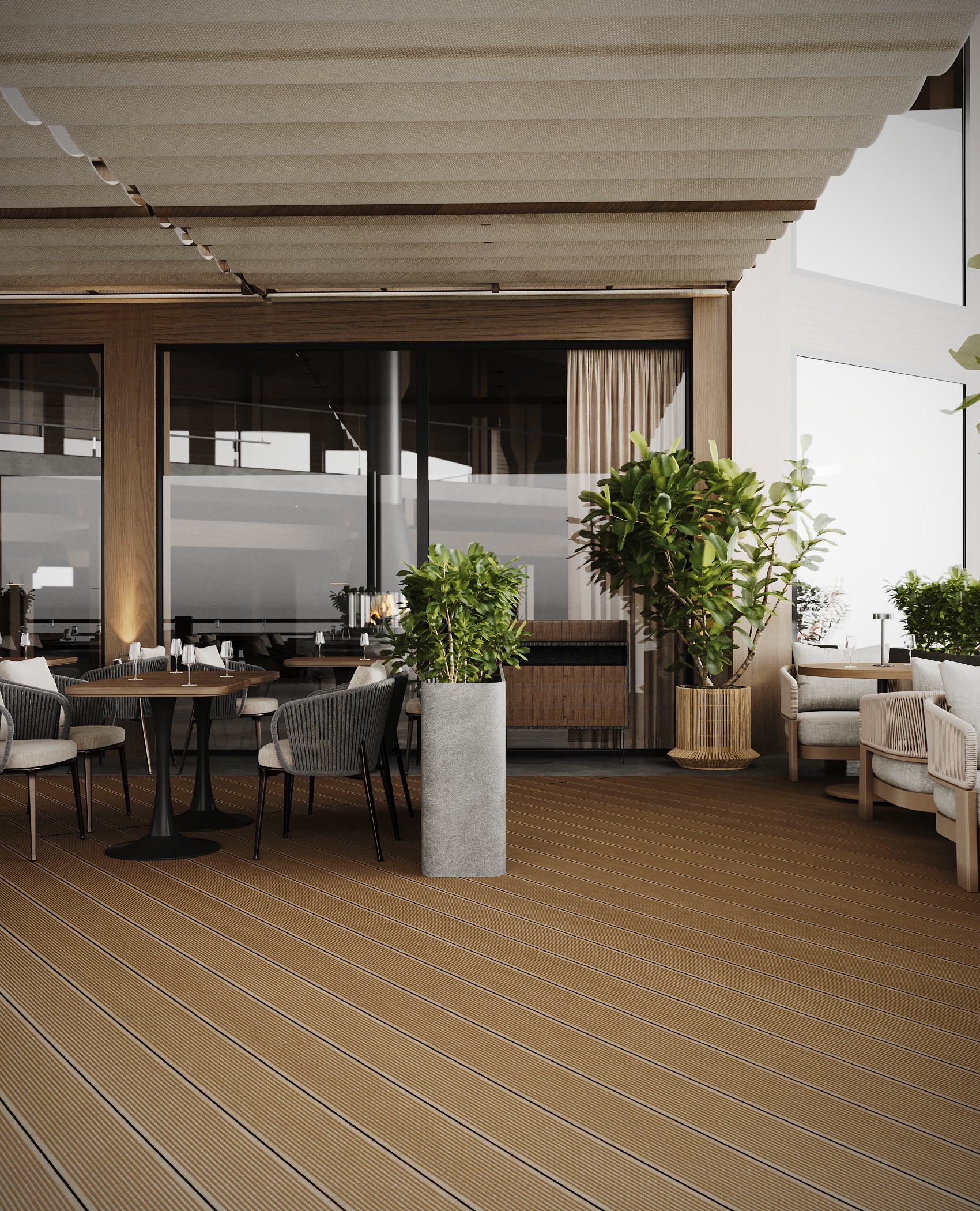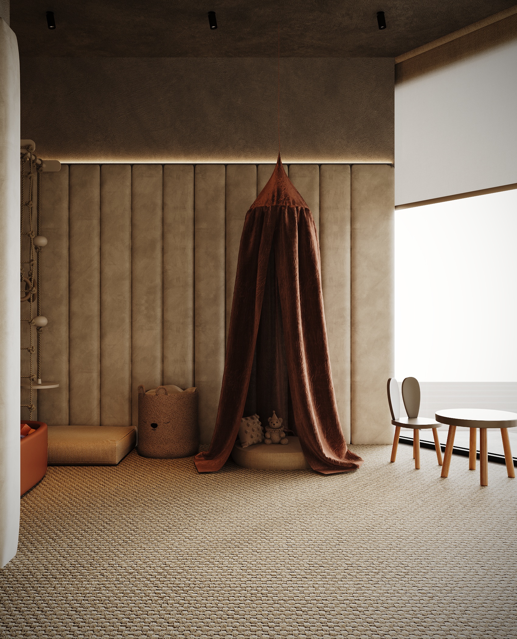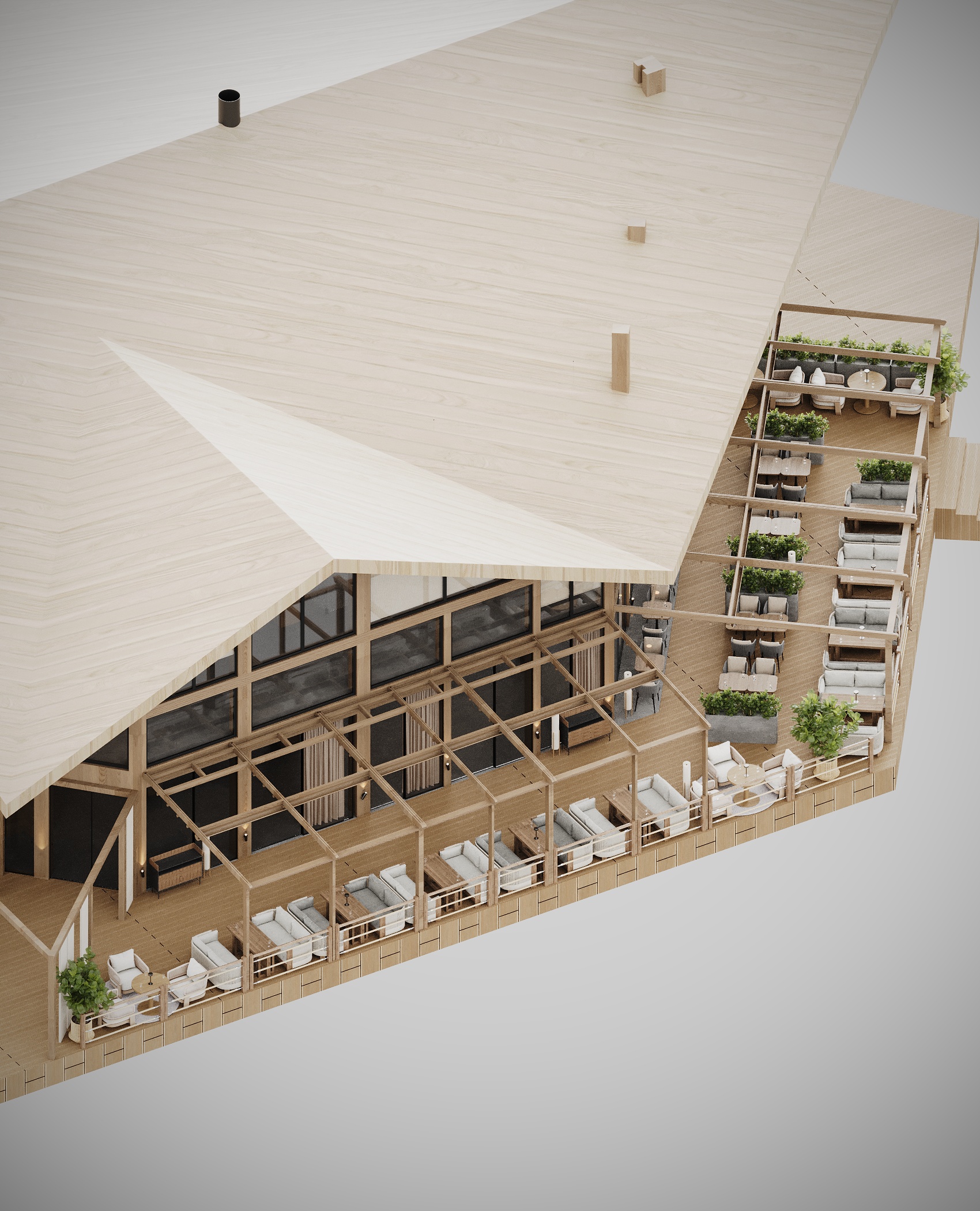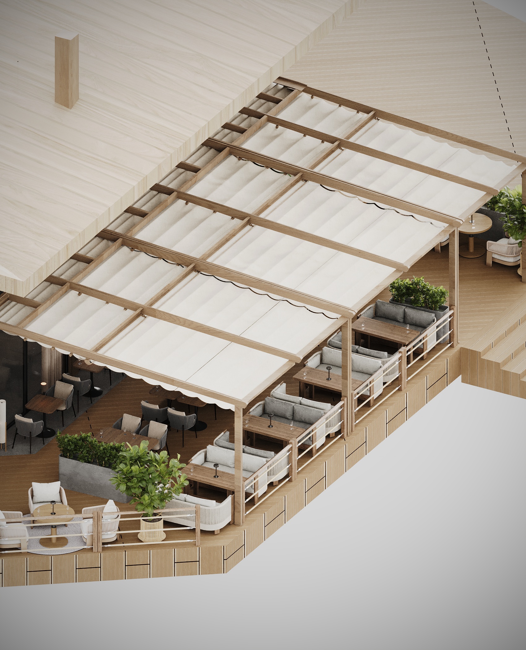 Первый этаж — динамичное «сердце» заведения. Бар и открытая кухня выстроены единым фронтом: гости видят процесс, слышат шипение сковород и ощущают энергию. Рядом — детская игровая зона с мягким покрытием, бассейном-шариками, канатным городком и уютным балдахином: родители отдыхают, дети в безопасности и под присмотром. Протяжённая открытая терраса с деревянным настилом и встроенной подсветкой становится естественным продолжением интерьера — идеальное место для летних ужинов и бранчей.