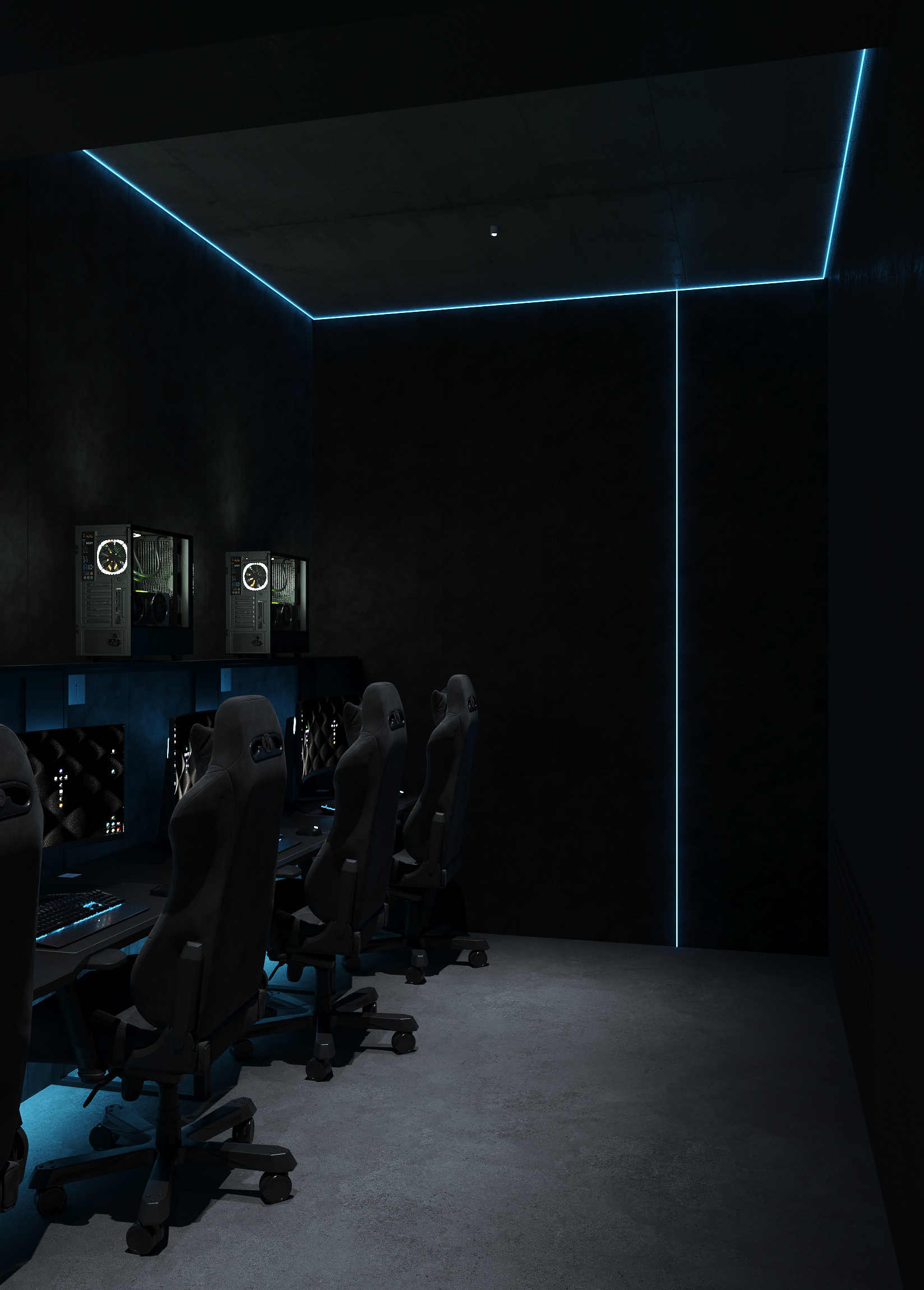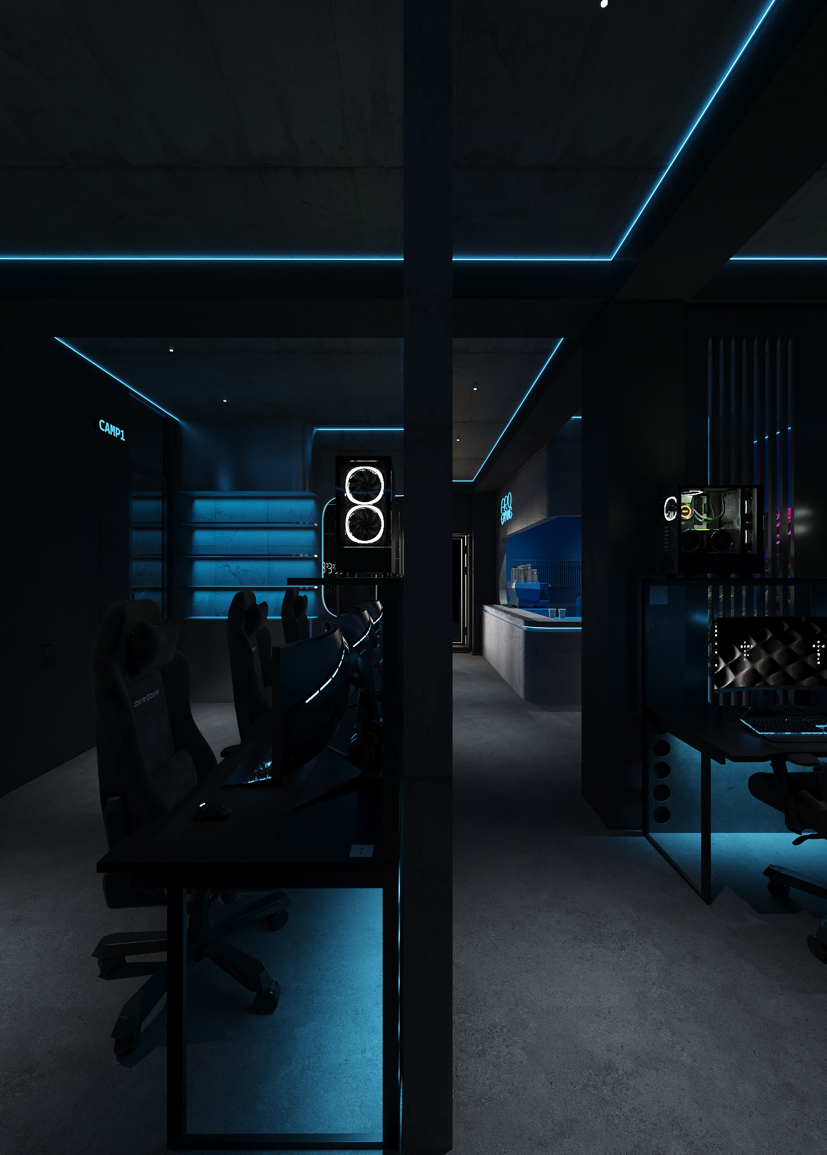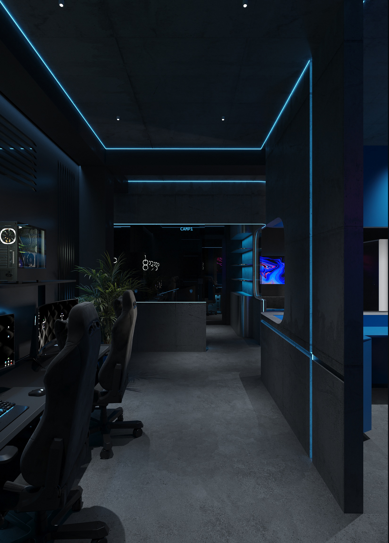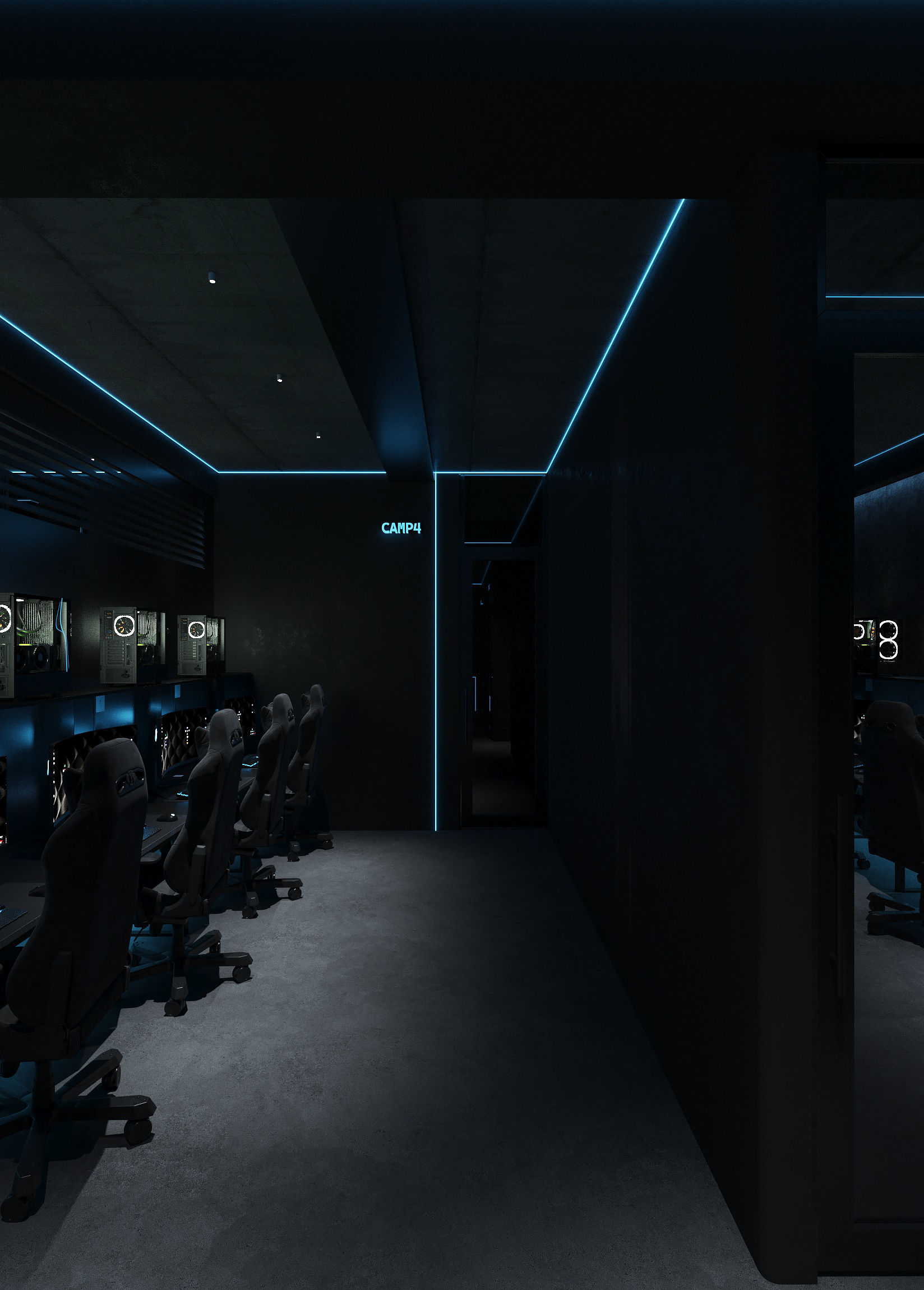 Дизайн решён как цельная среда для киберспорта и длительных игровых сессий - с эргономичными игровыми зонами, продуманным освещением рабочих мест, шумоизоляцией и визуальным зонированием. Неоновые линии подчёркивают архитектуру, а минималистичная палитра усиливает ощущение концентрации и драйва.