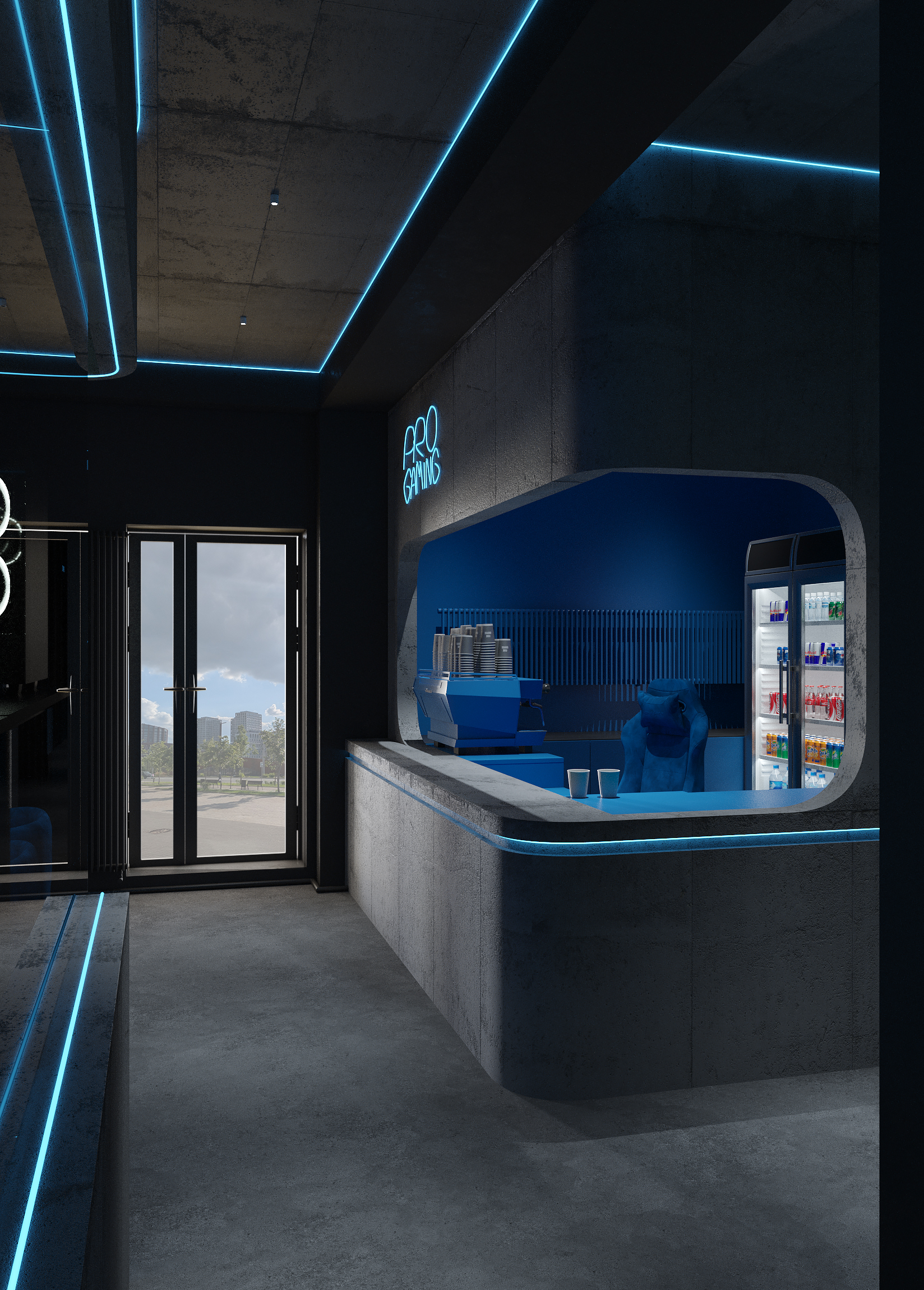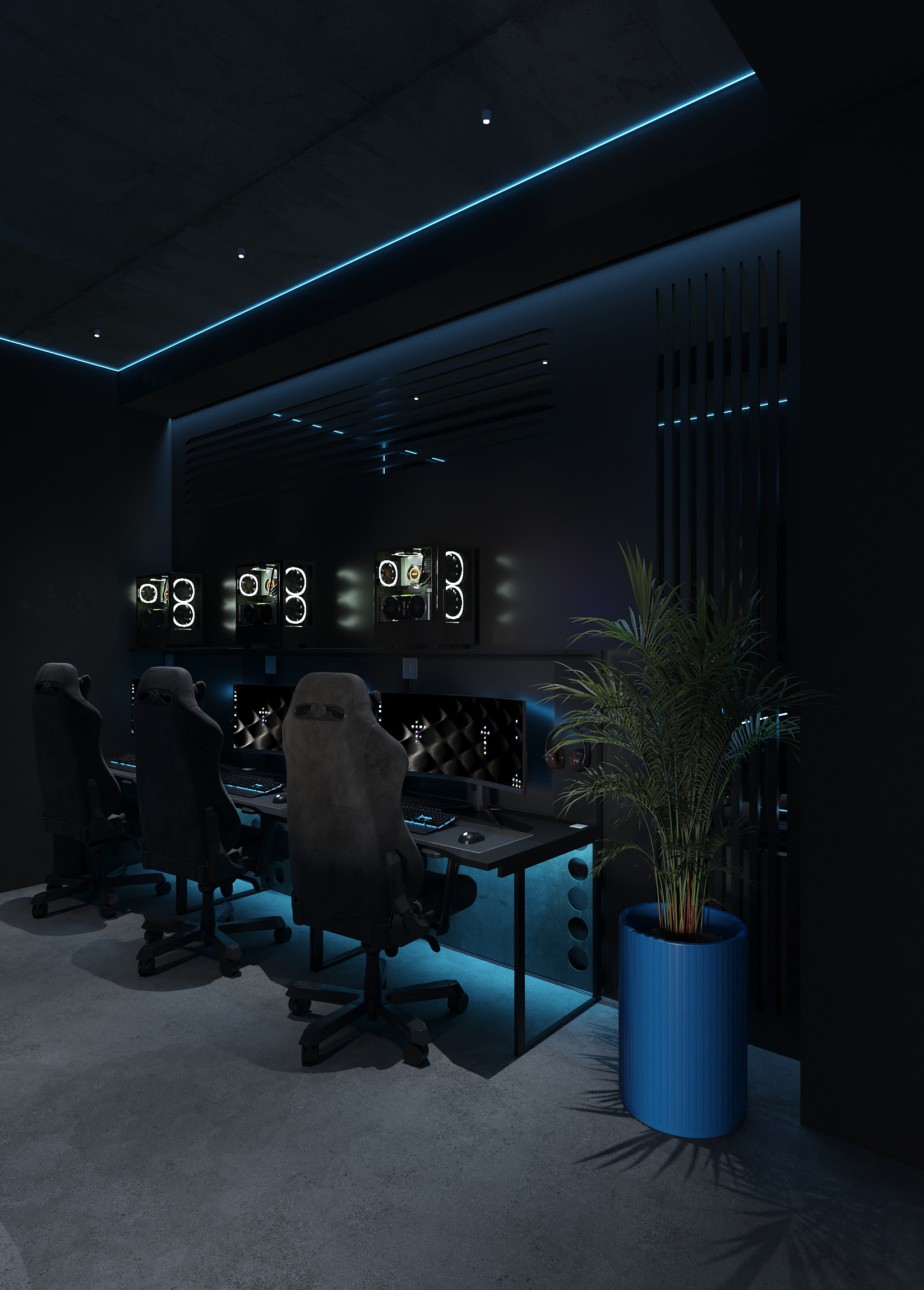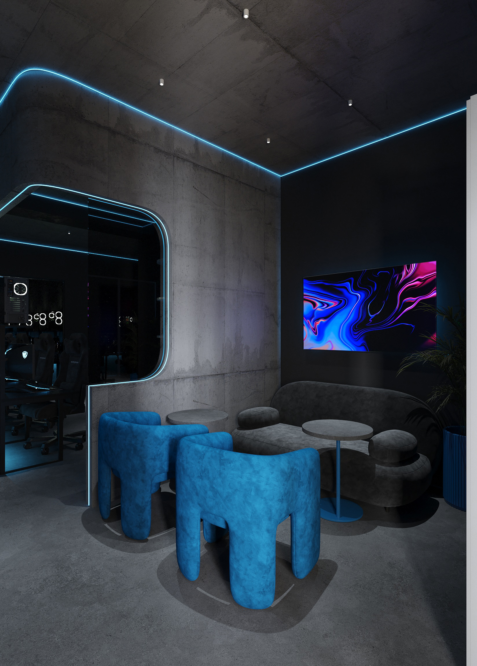 Дизайн решён как цельная среда для киберспорта и длительных игровых сессий - с эргономичными игровыми зонами, продуманным освещением рабочих мест, шумоизоляцией и визуальным зонированием. Неоновые линии подчёркивают архитектуру, а минималистичная палитра усиливает ощущение концентрации и драйва.