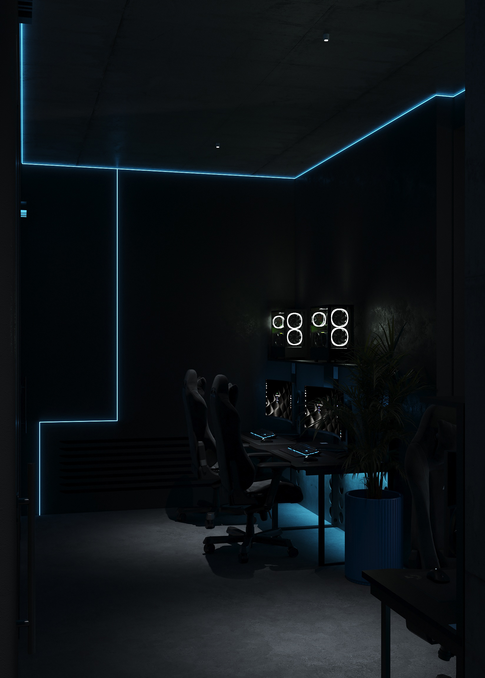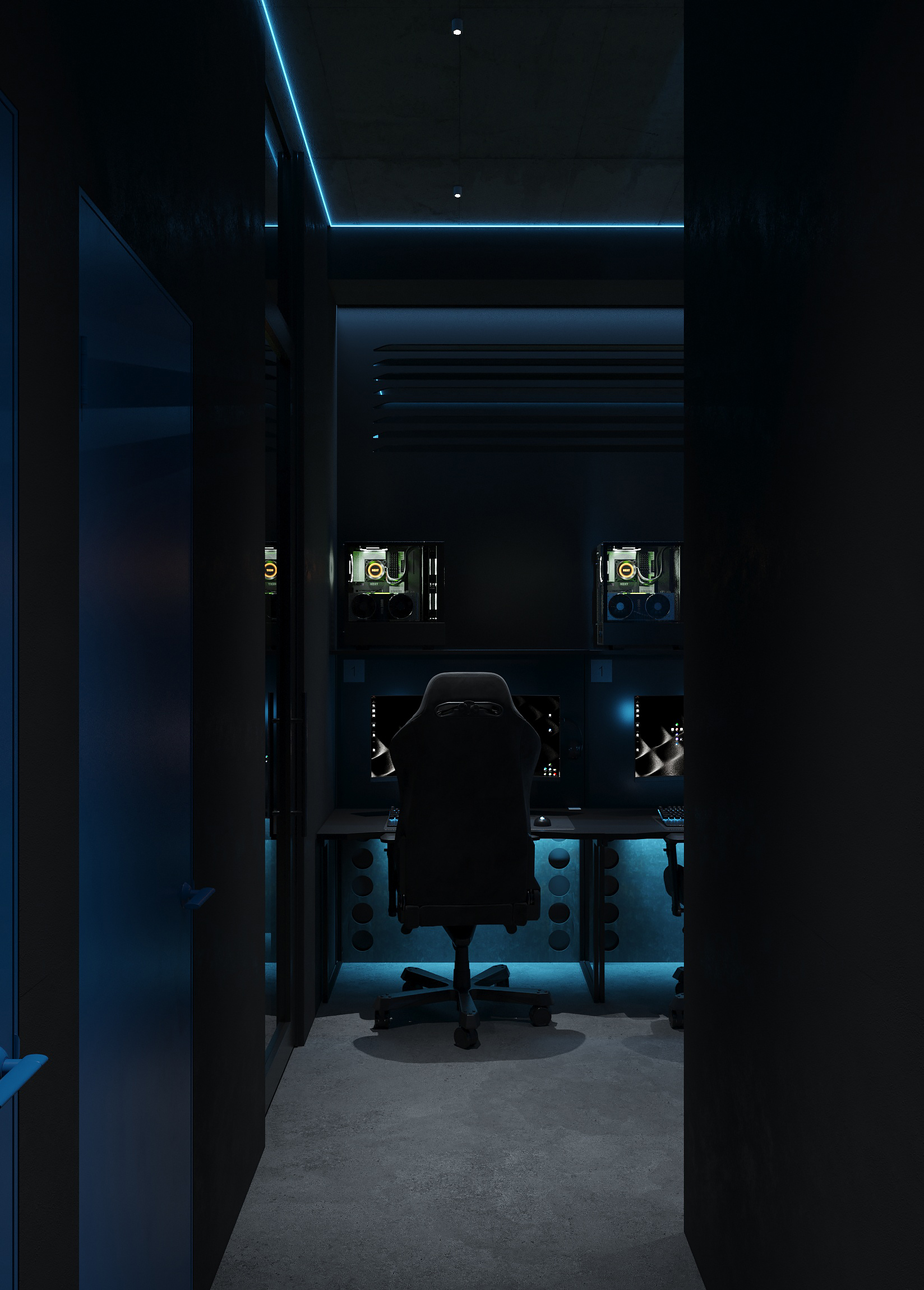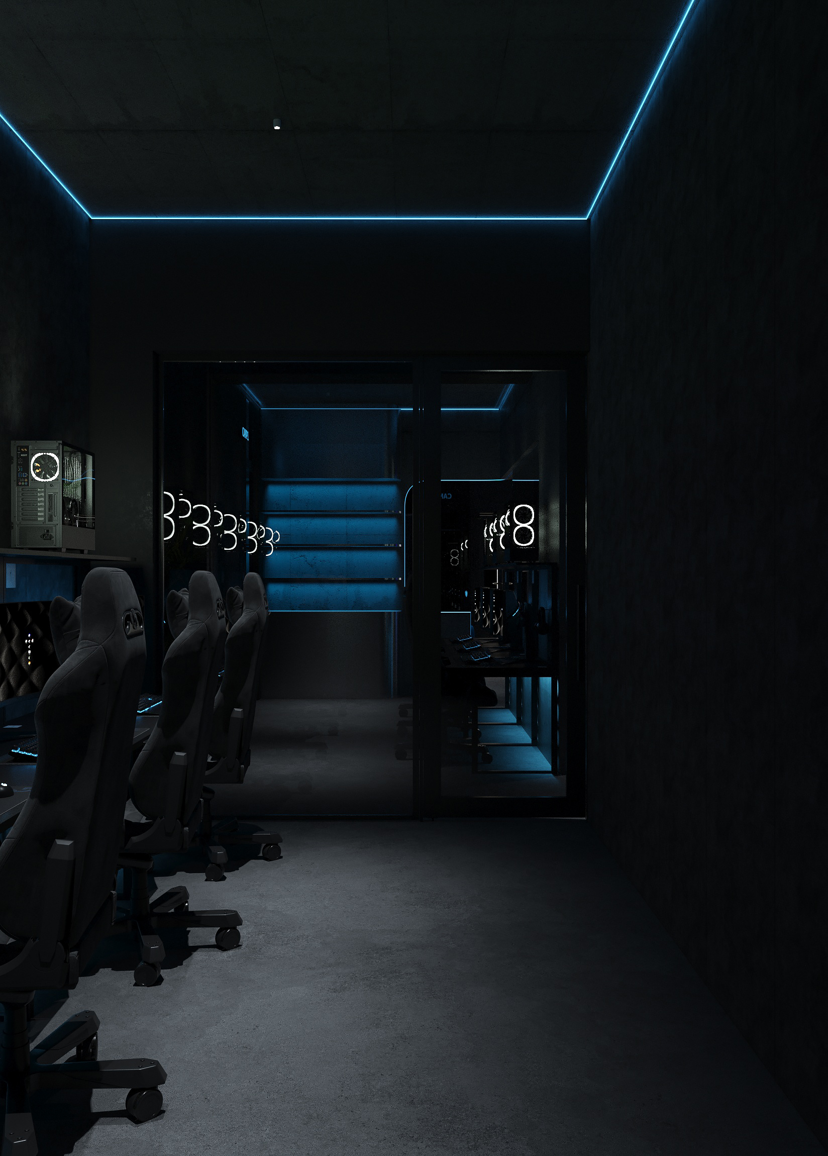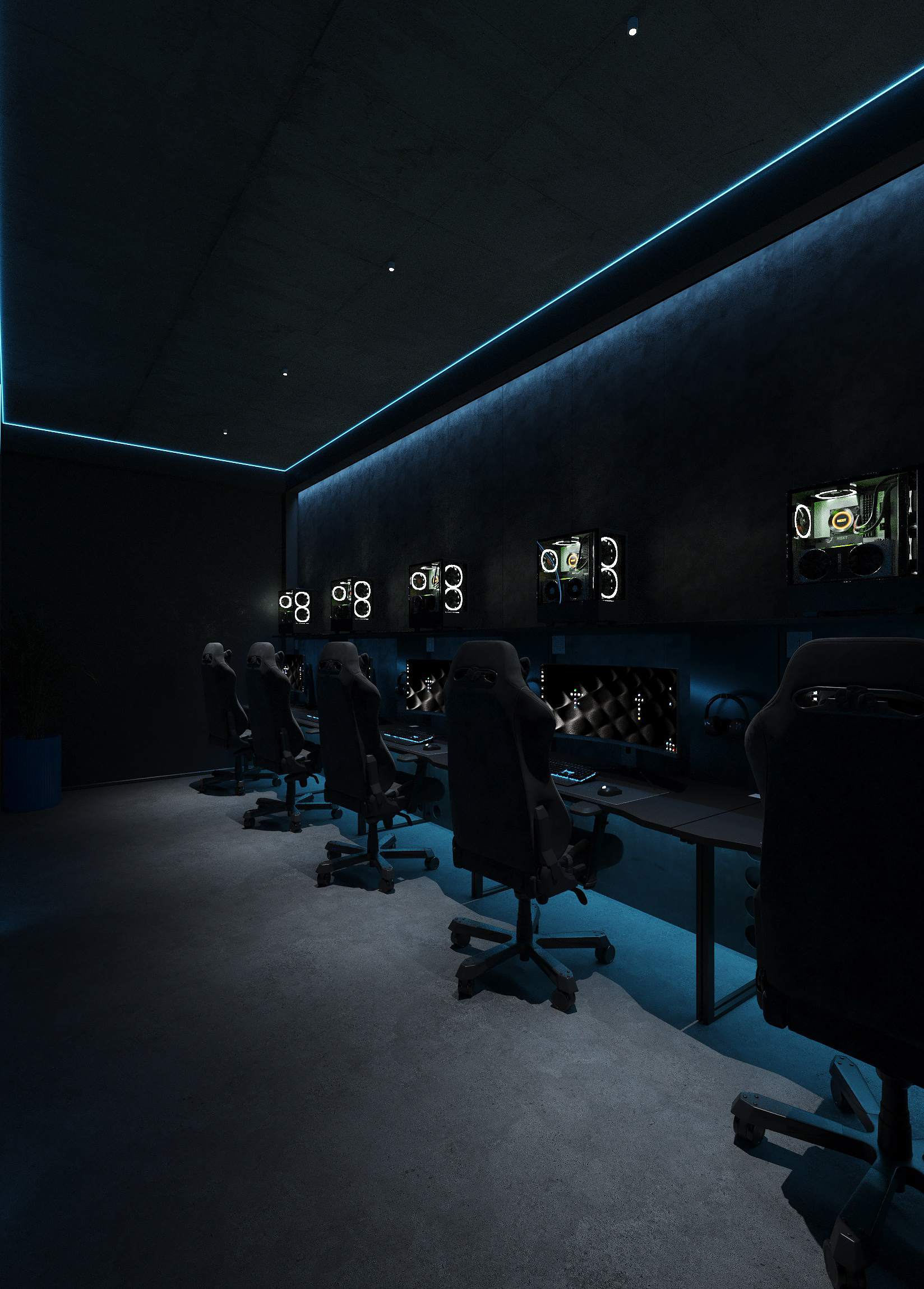 Дизайн решён как цельная среда для киберспорта и длительных игровых сессий - с эргономичными игровыми зонами, продуманным освещением рабочих мест, шумоизоляцией и визуальным зонированием. Неоновые линии подчёркивают архитектуру, а минималистичная палитра усиливает ощущение концентрации и драйва.