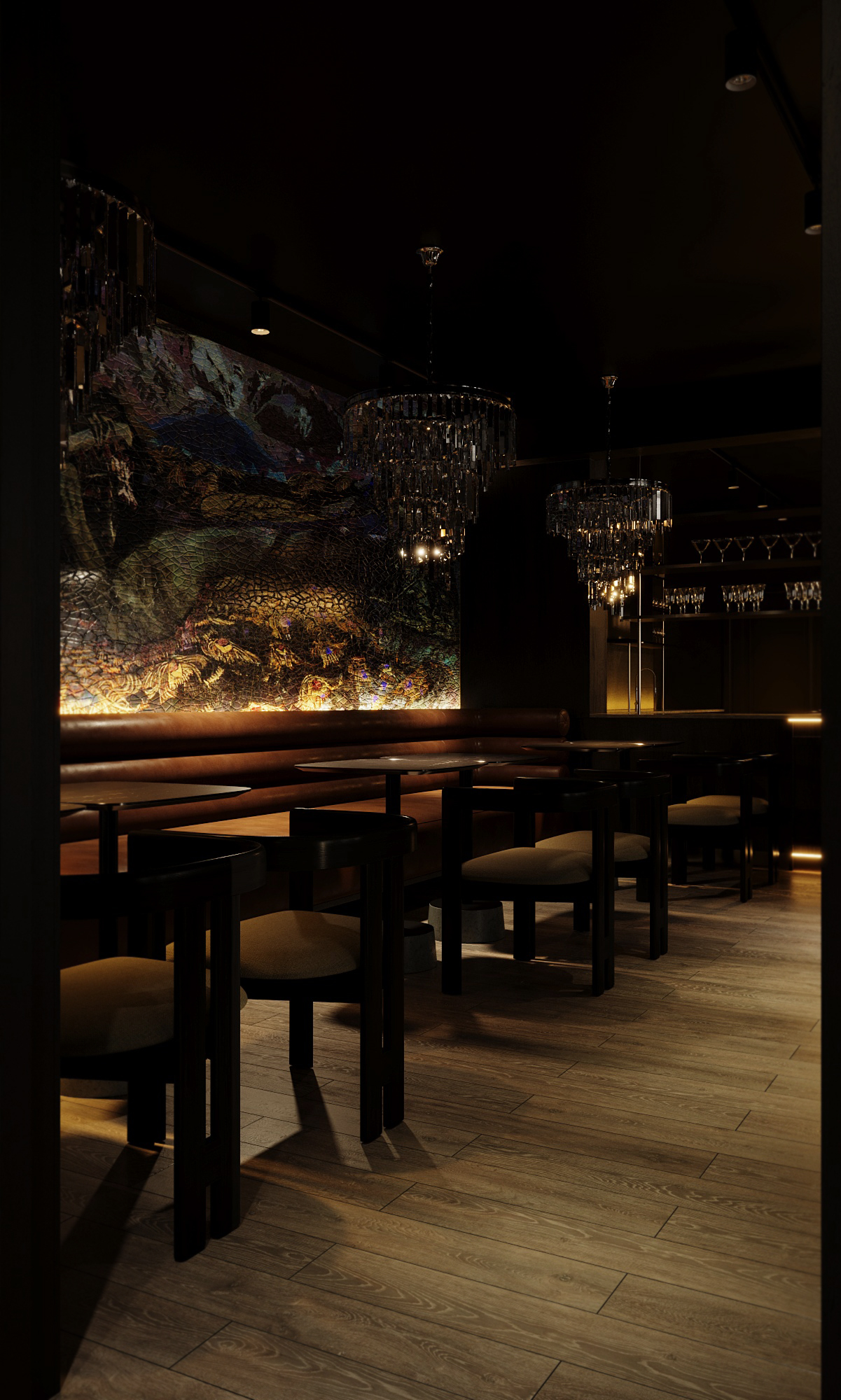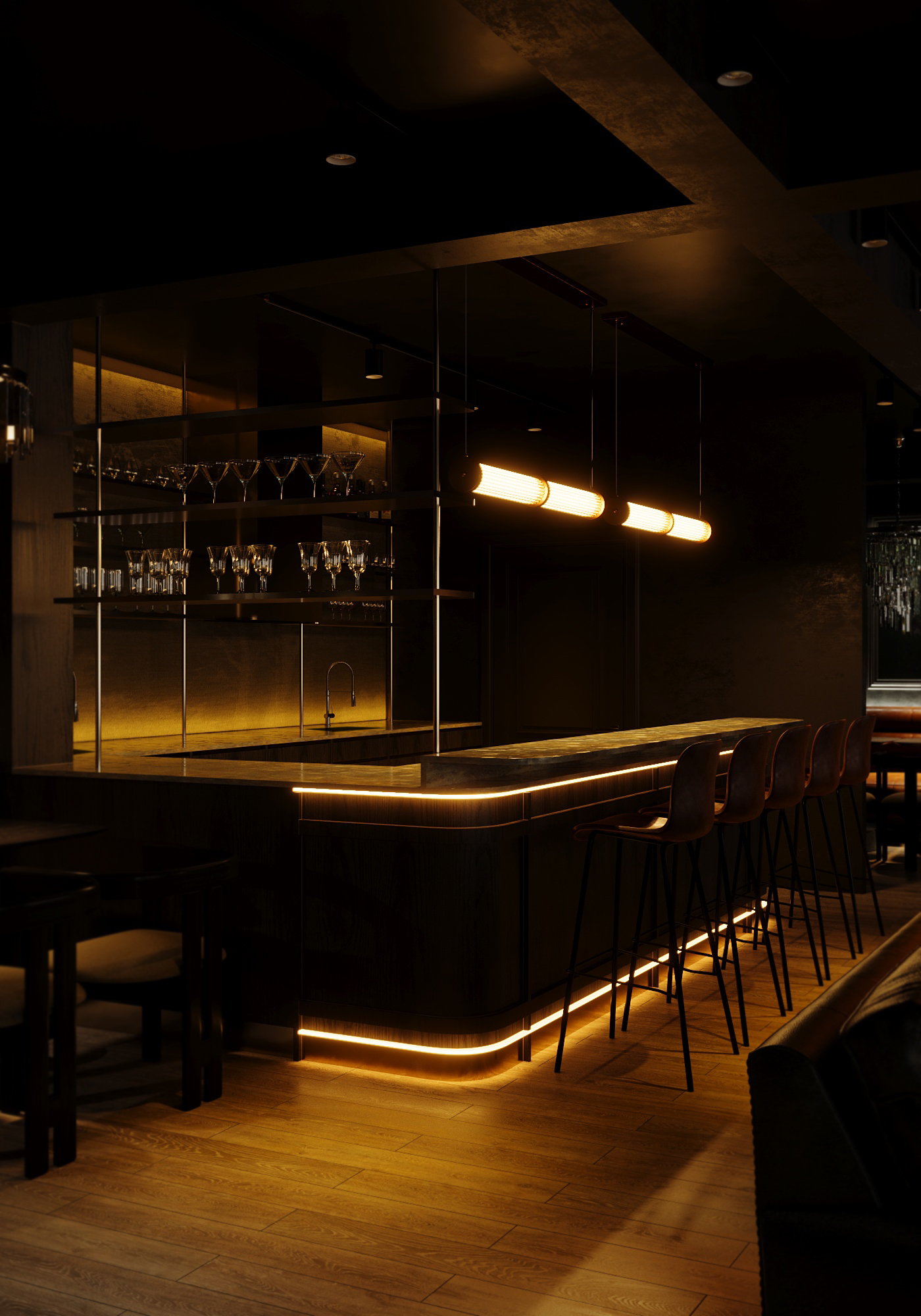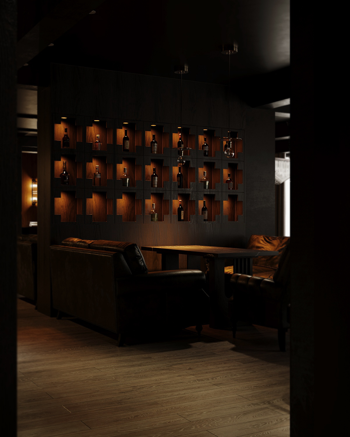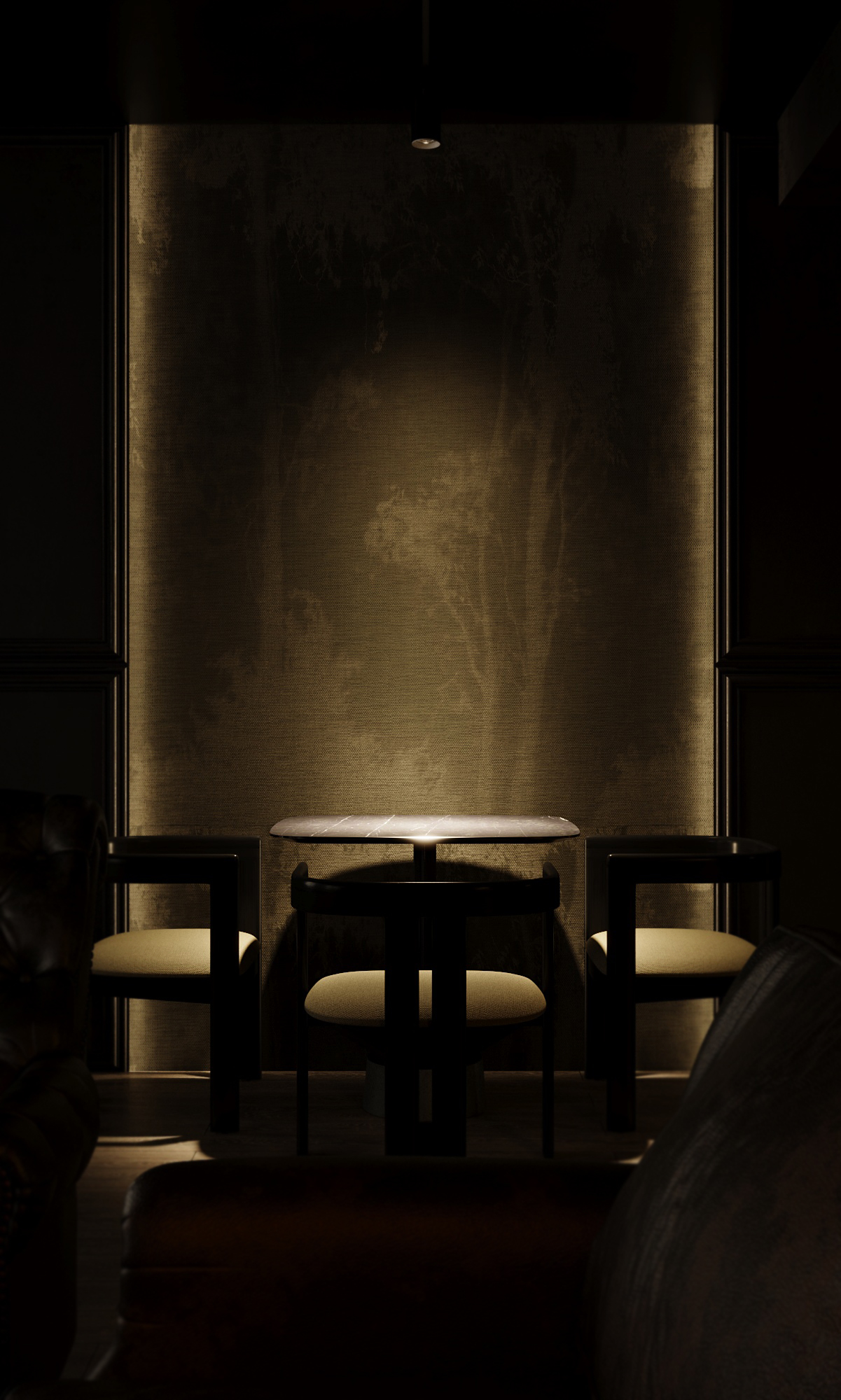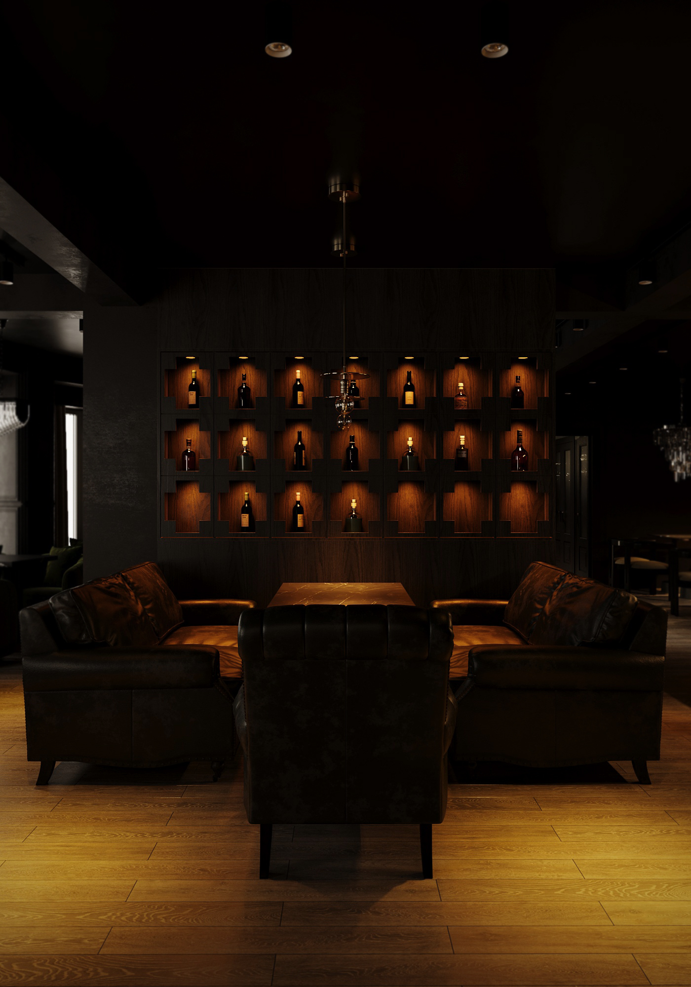 Планировка выстроена как последовательность камерных зон: закрытые проходы, уютные посадочные ниши и центральная барная группа создают сценарий спокойного, неспешного отдыха. Бар выполнен как архитектурный акцент — с подсвеченным контуром, симметричными полками и приглушённым светом, подчёркивающим фактуры и предметы.