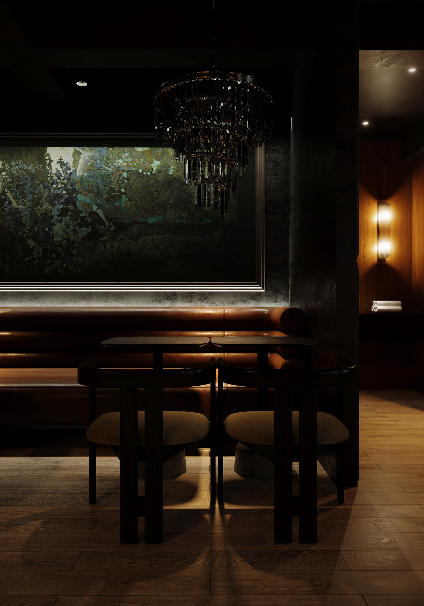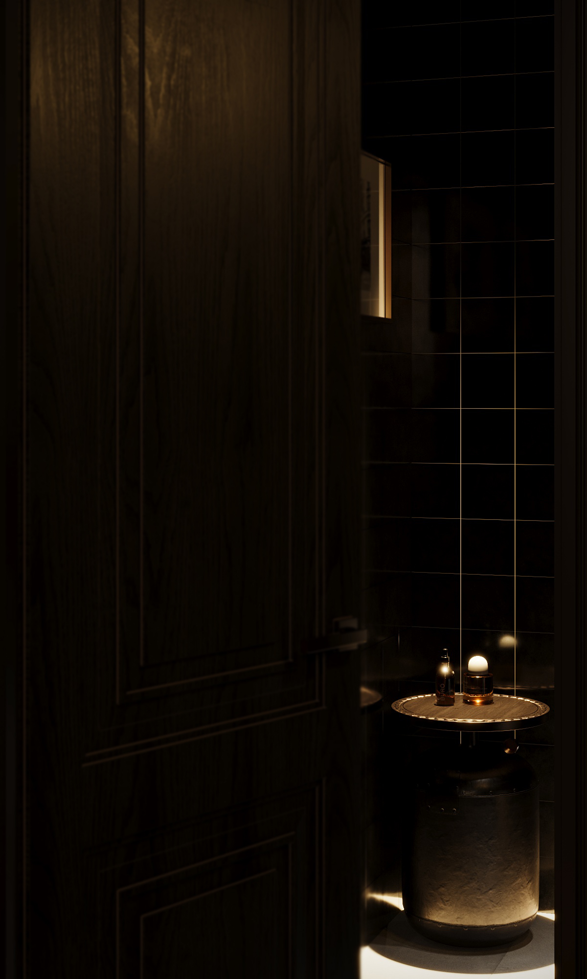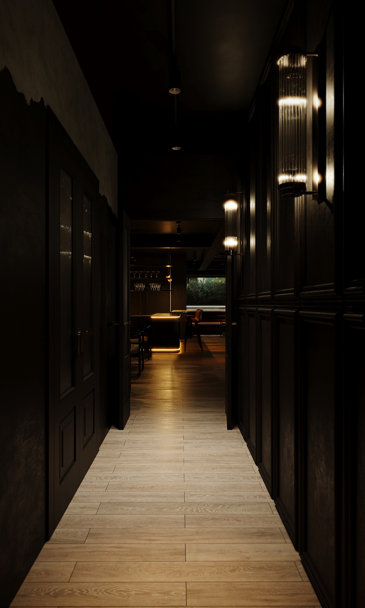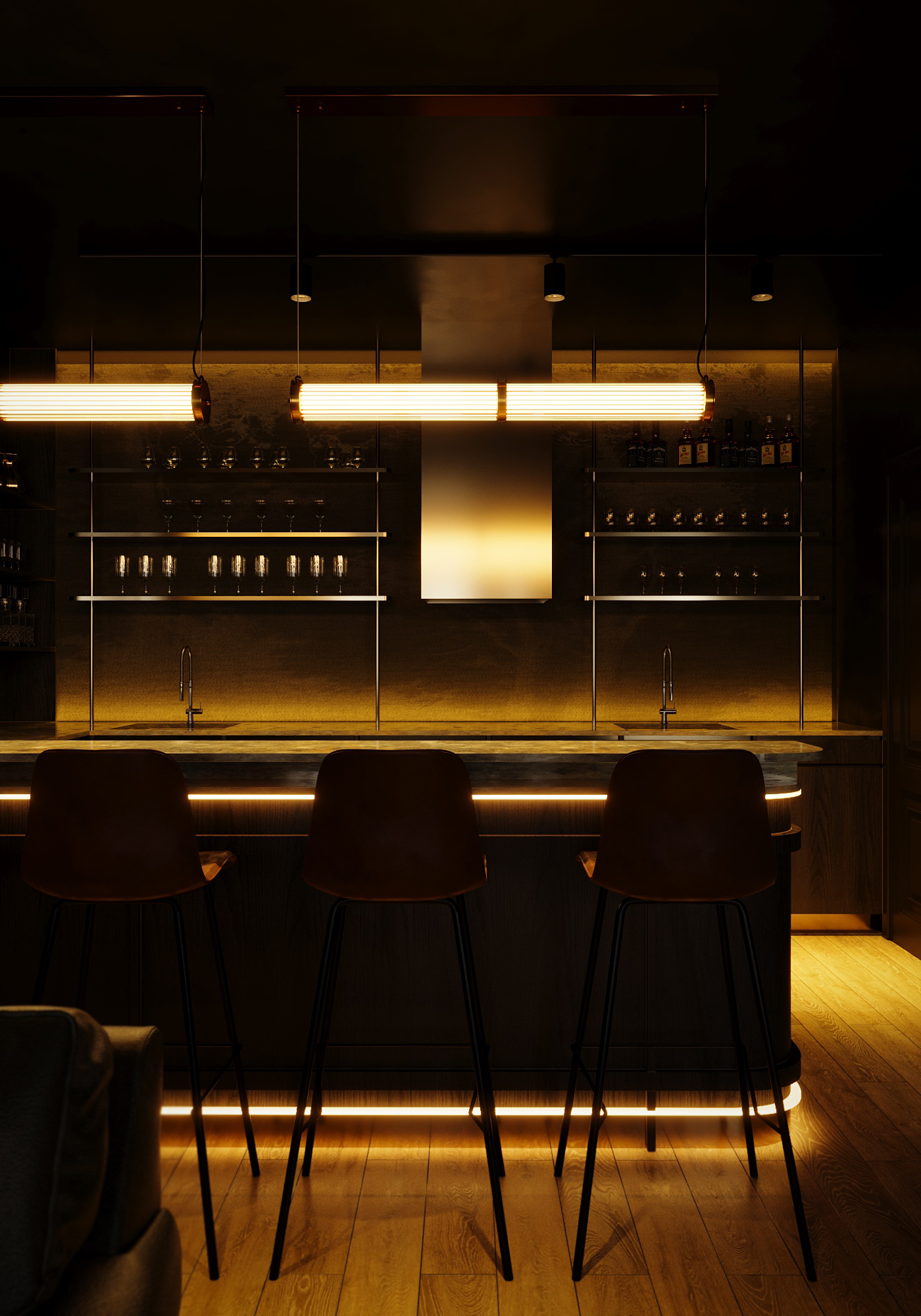Планировка выстроена как последовательность камерных зон: закрытые проходы, уютные посадочные ниши и центральная барная группа создают сценарий спокойного, неспешного отдыха. Бар выполнен как архитектурный акцент — с подсвеченным контуром, симметричными полками и приглушённым светом, подчёркивающим фактуры и предметы.
