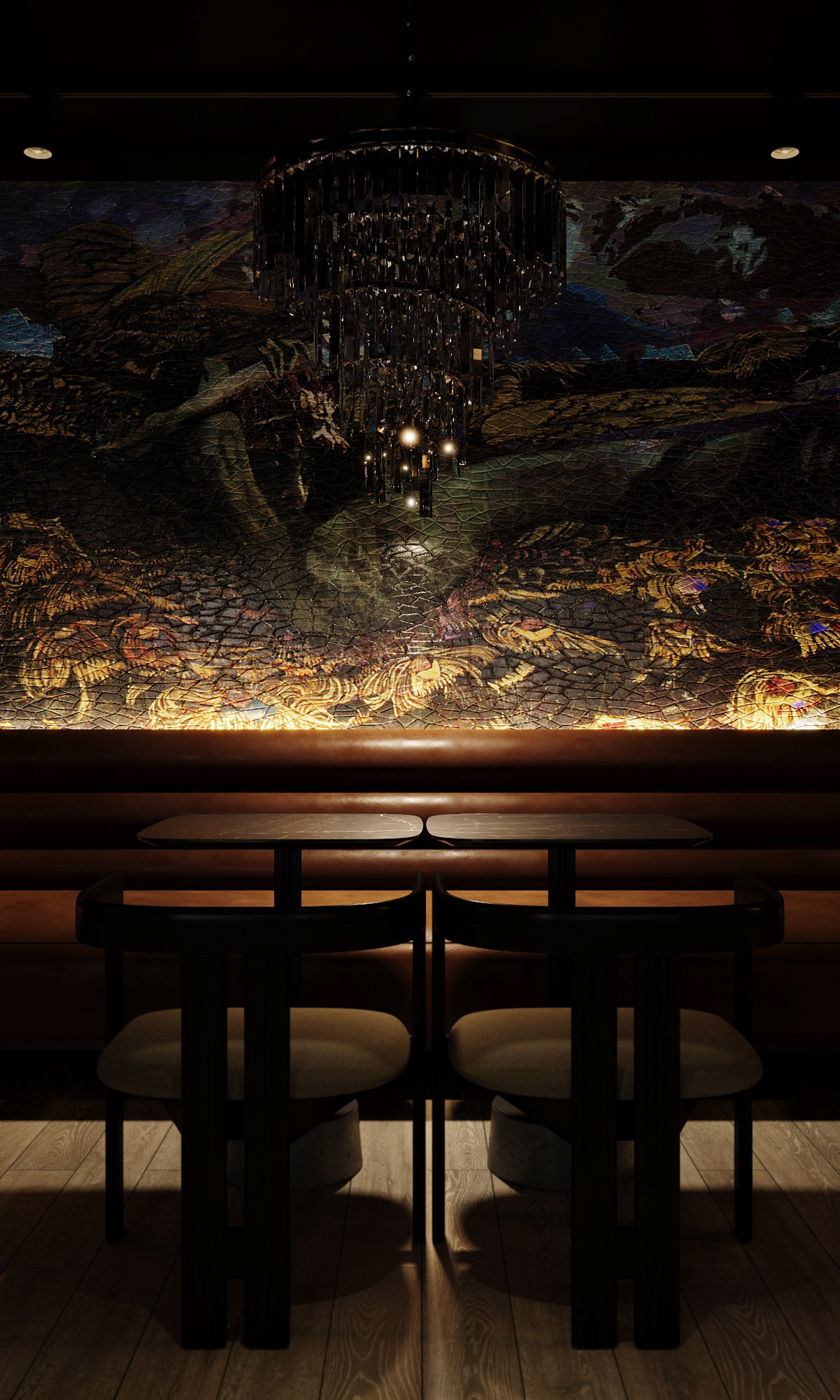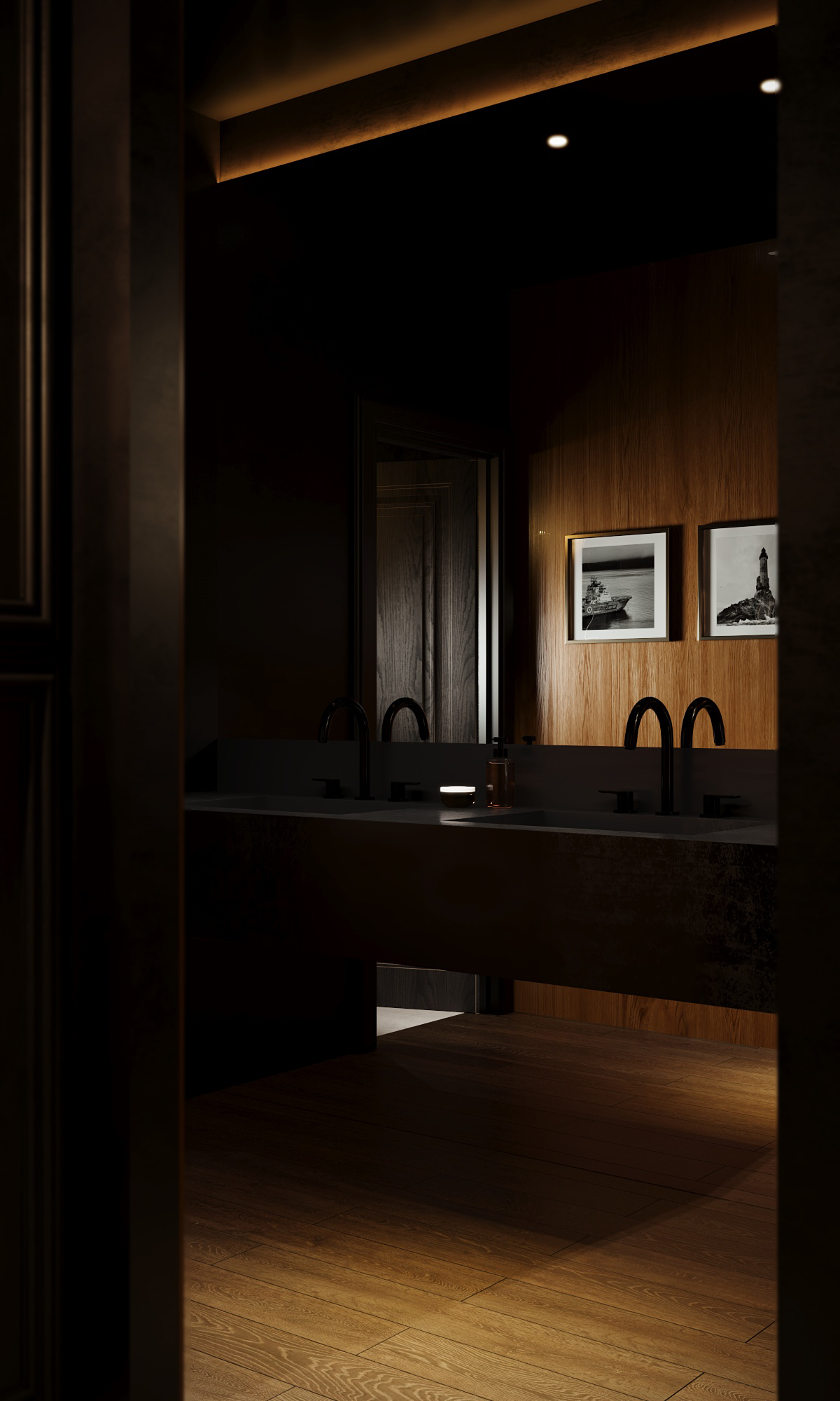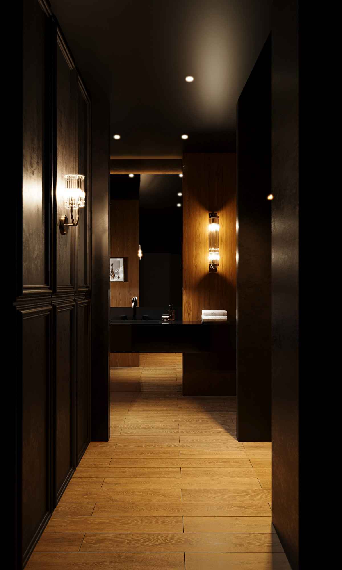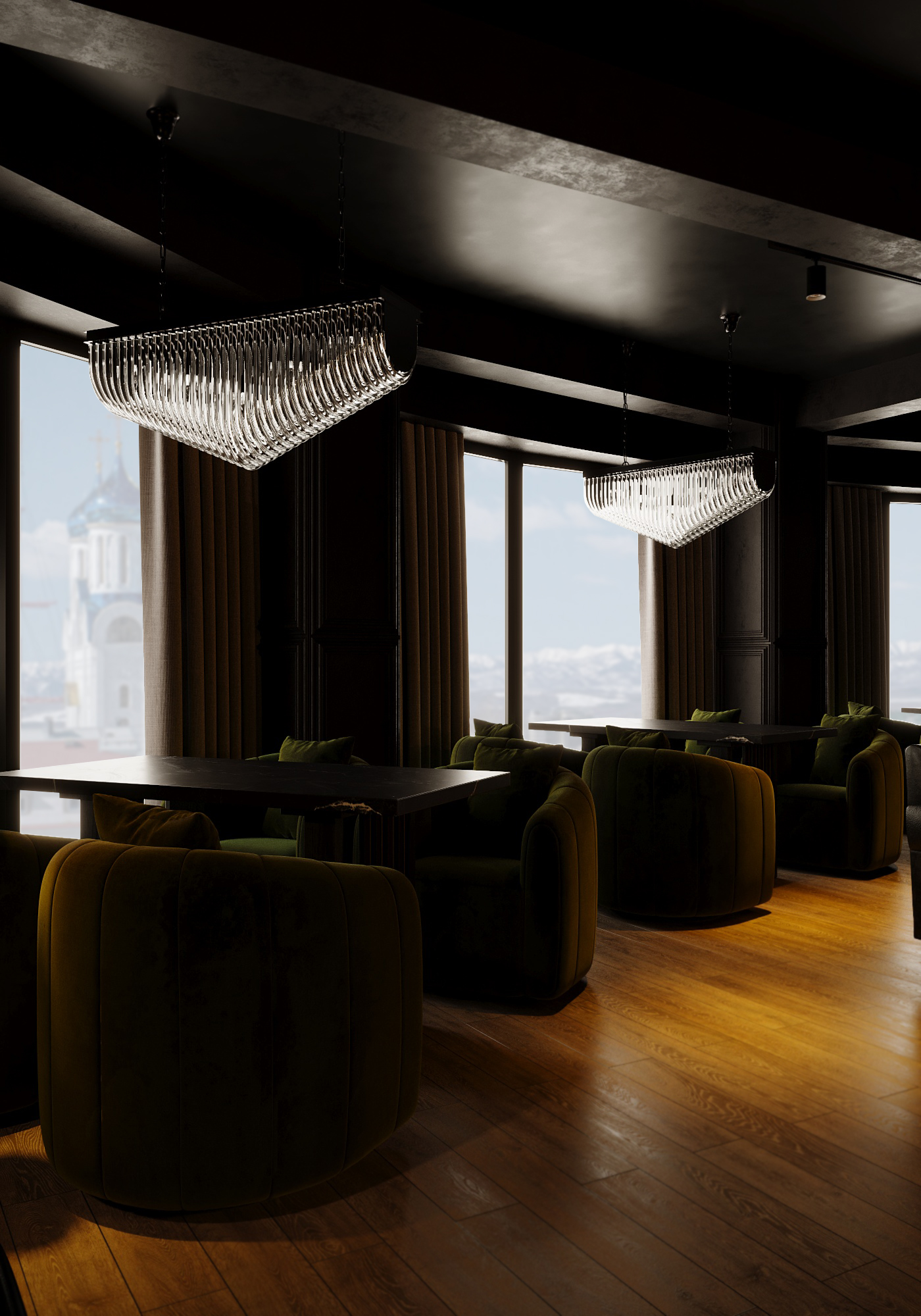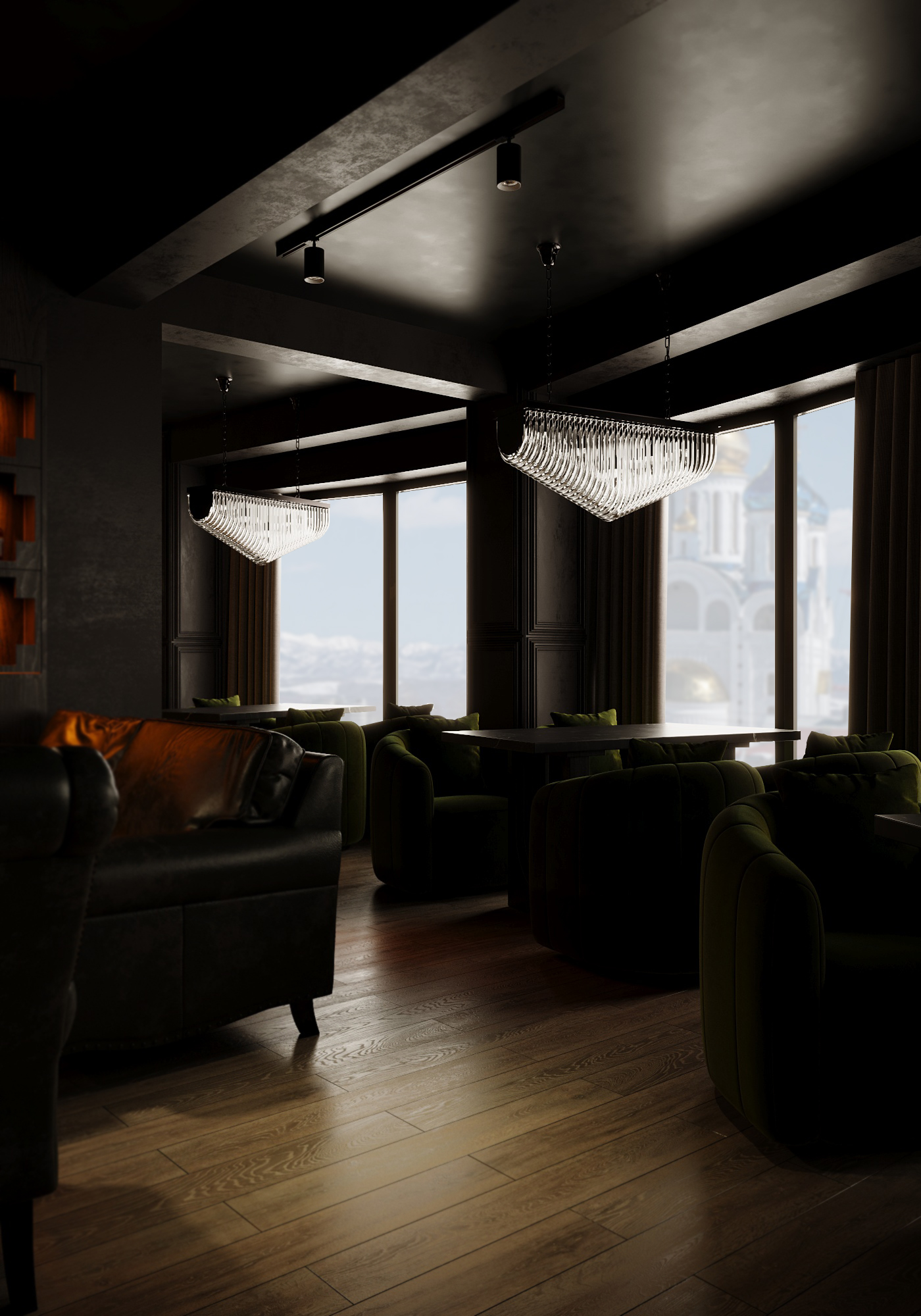 Планировка выстроена как последовательность камерных зон: закрытые проходы, уютные посадочные ниши и центральная барная группа создают сценарий спокойного, неспешного отдыха. Бар выполнен как архитектурный акцент — с подсвеченным контуром, симметричными полками и приглушённым светом, подчёркивающим фактуры и предметы.