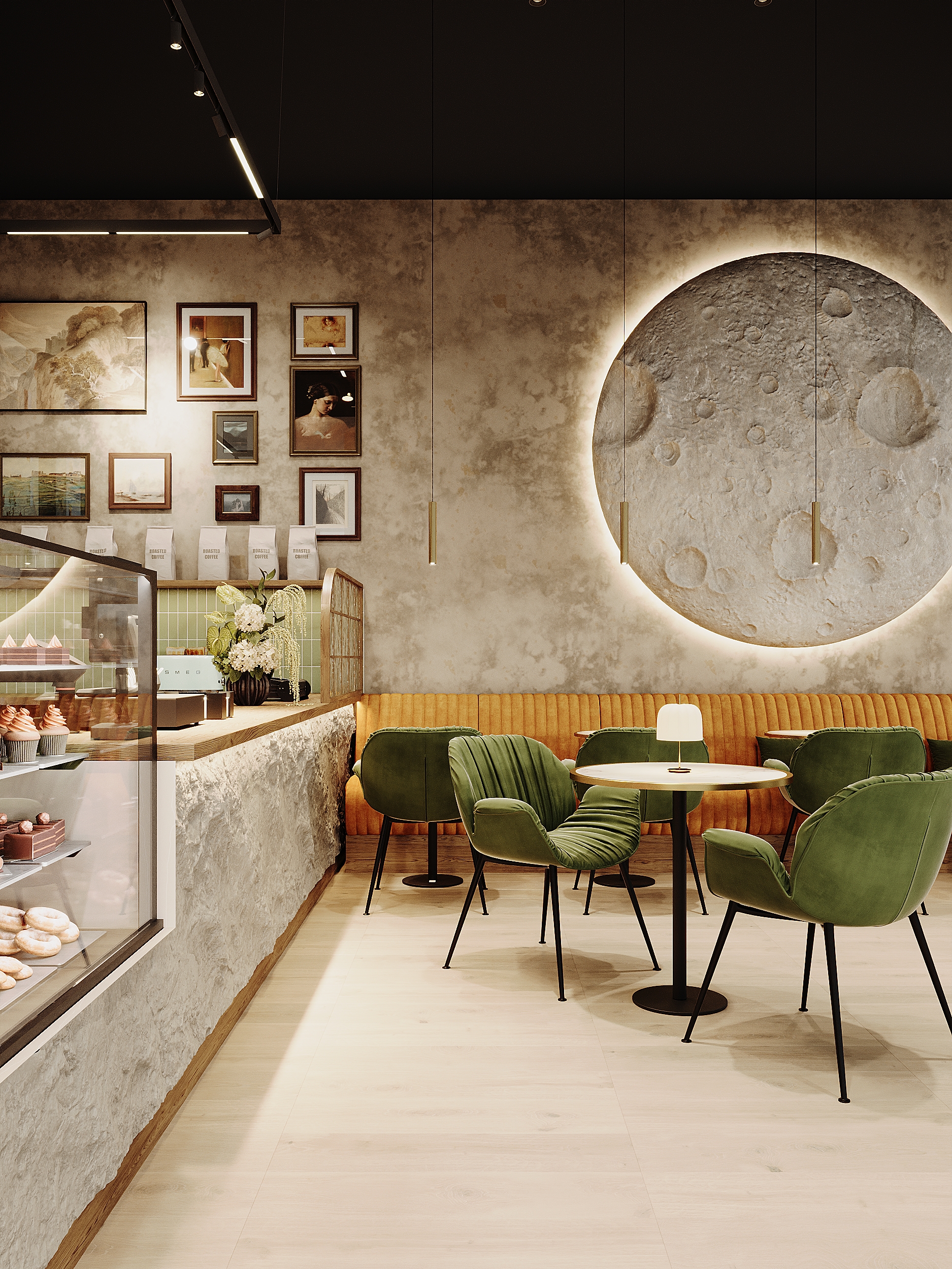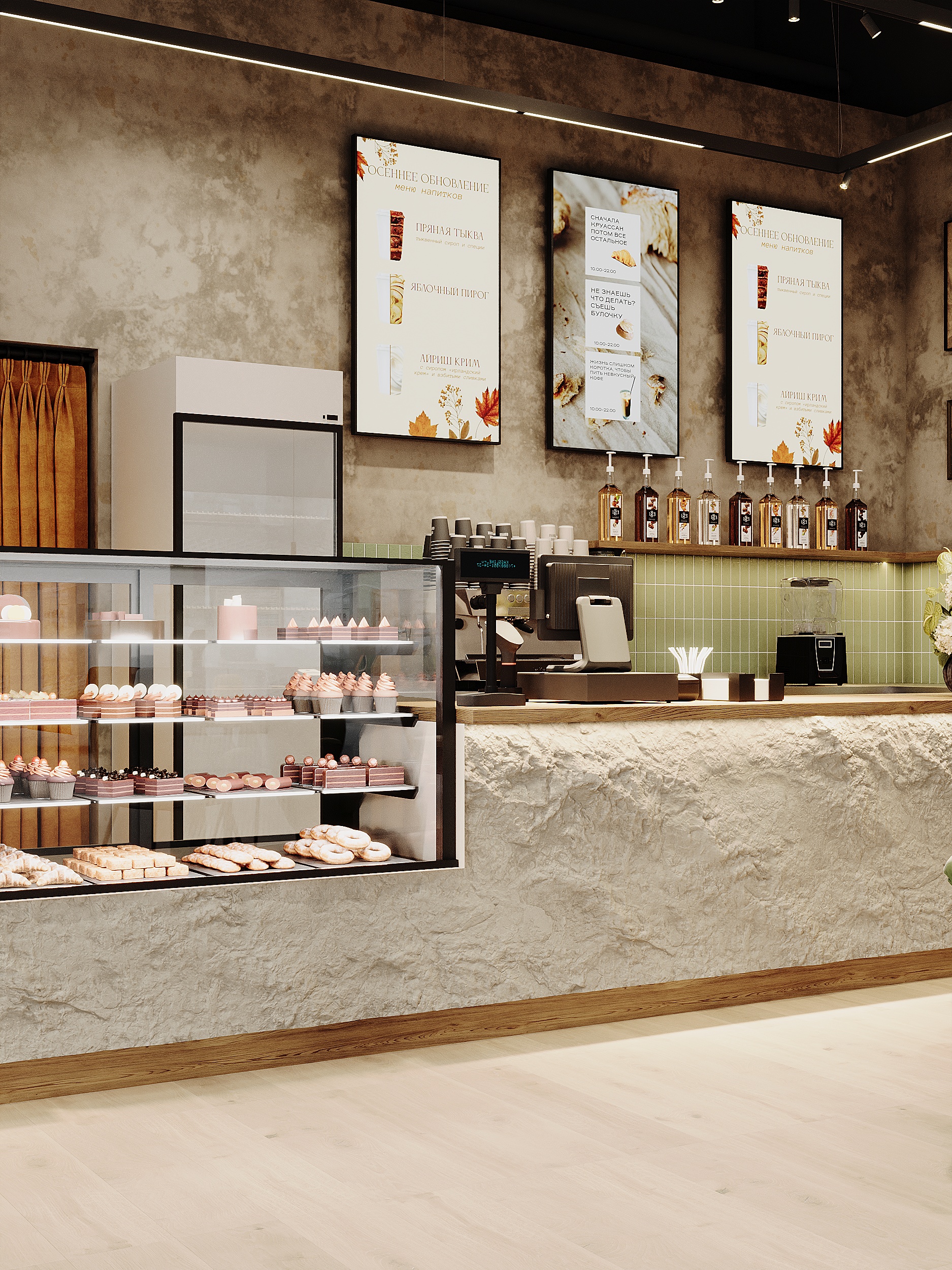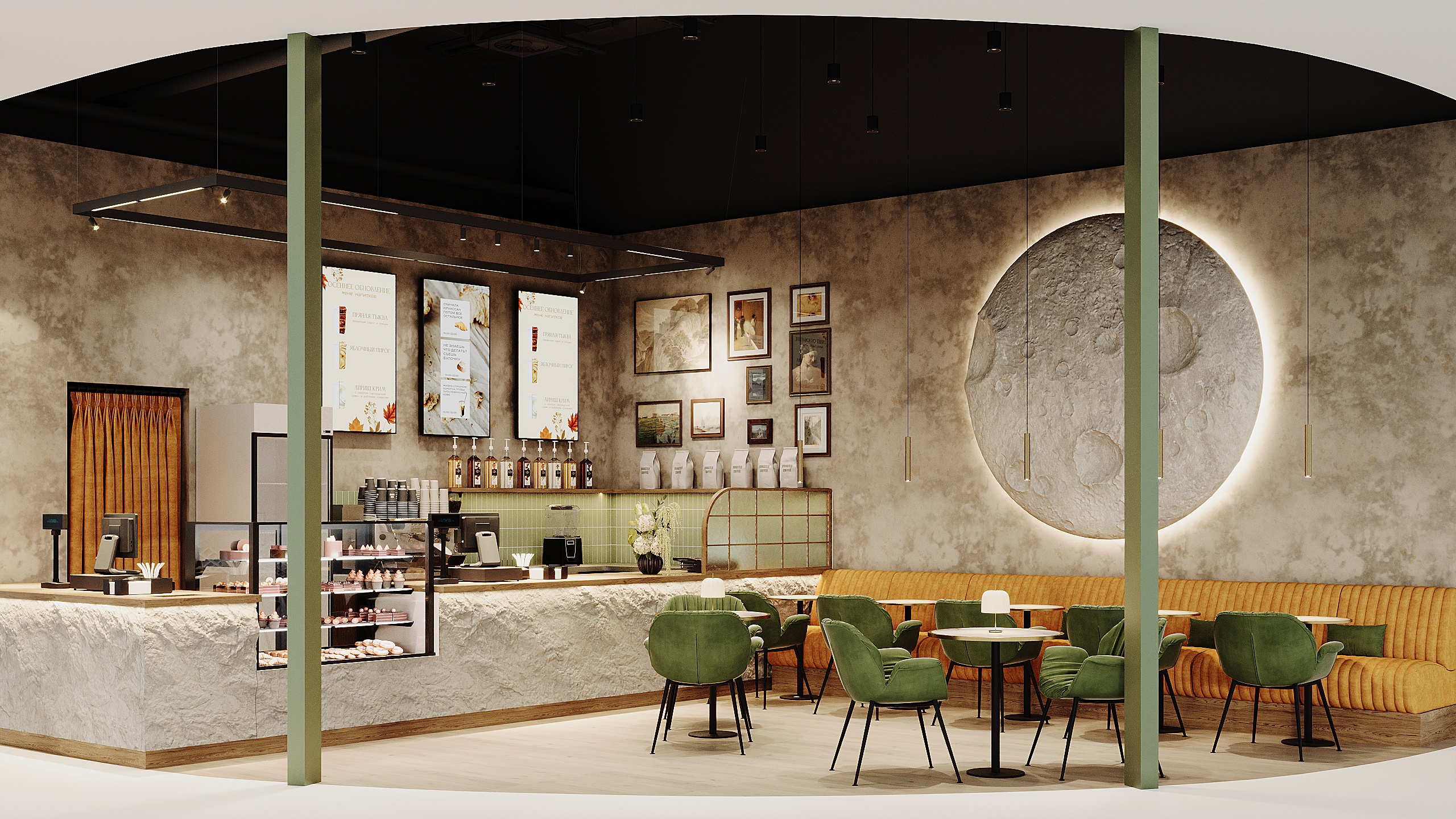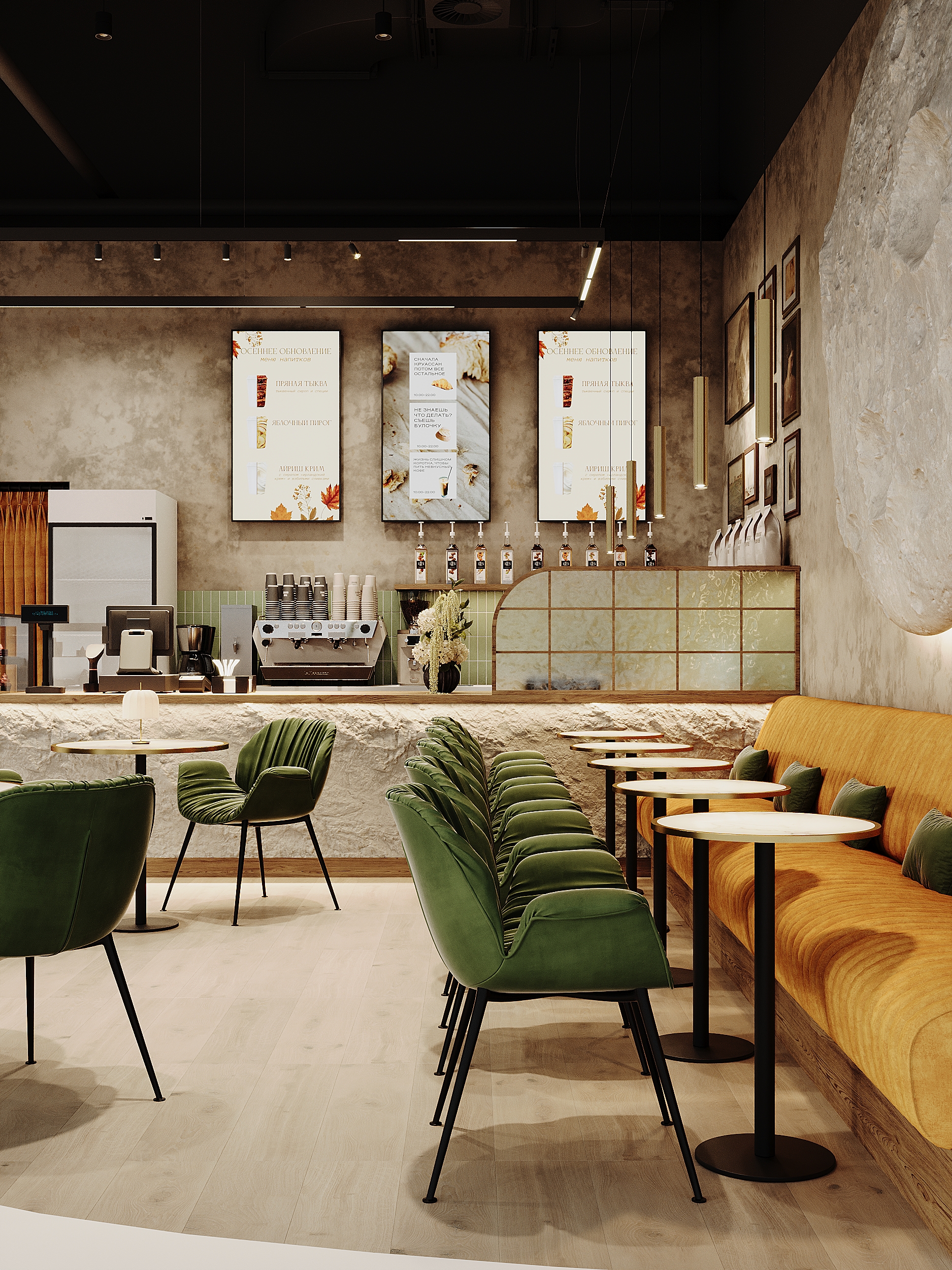 Материалы и детали подобраны так, чтобы интерьер оставался тактильным и живым: фактурные поверхности, приглушённые зелёные и тёплые охристые оттенки, локальное освещение над столами. В результате получилась современная кофейня, в которой интерьер не отвлекает от главного — общения, кофе и спокойного городского ритма.