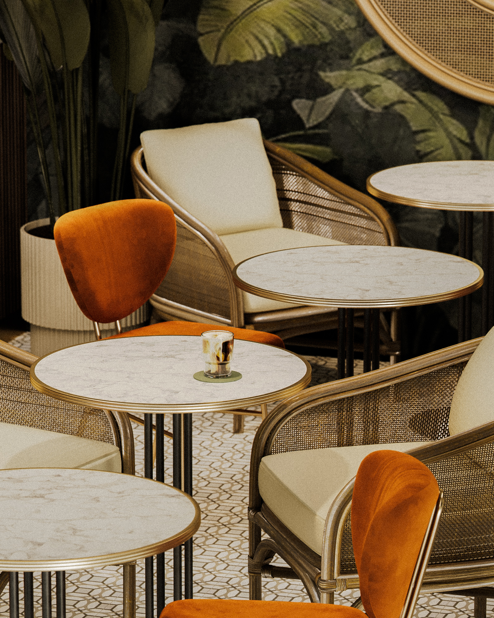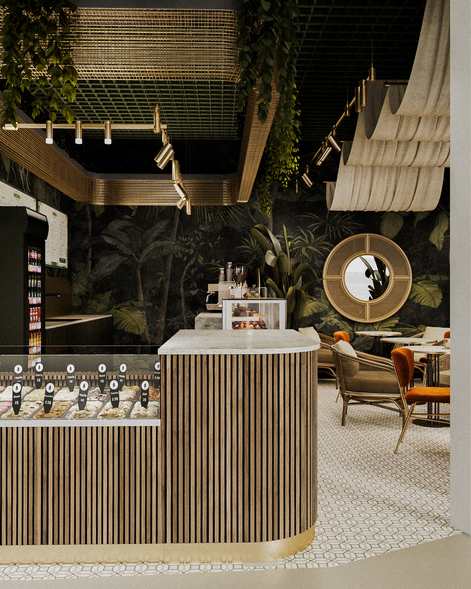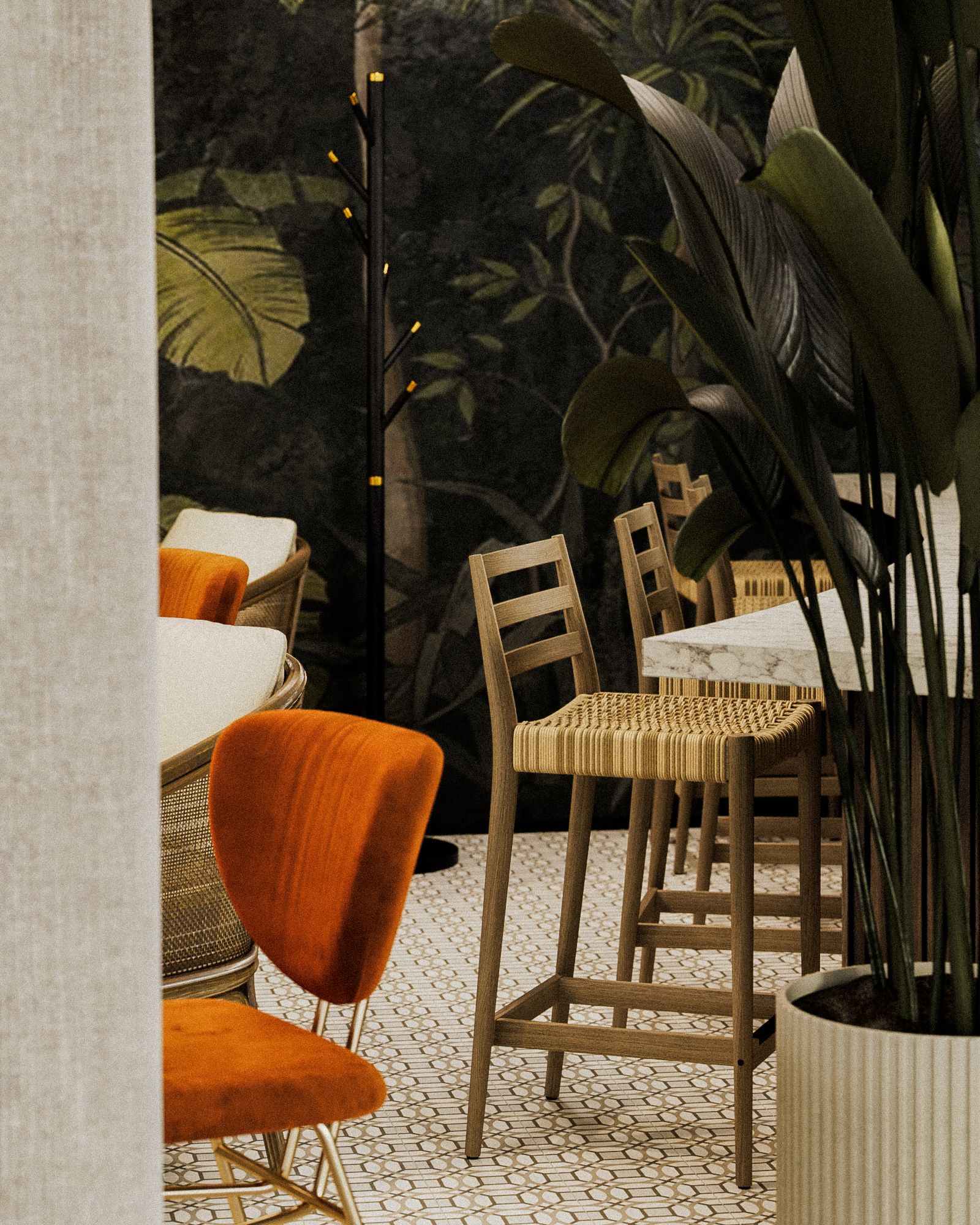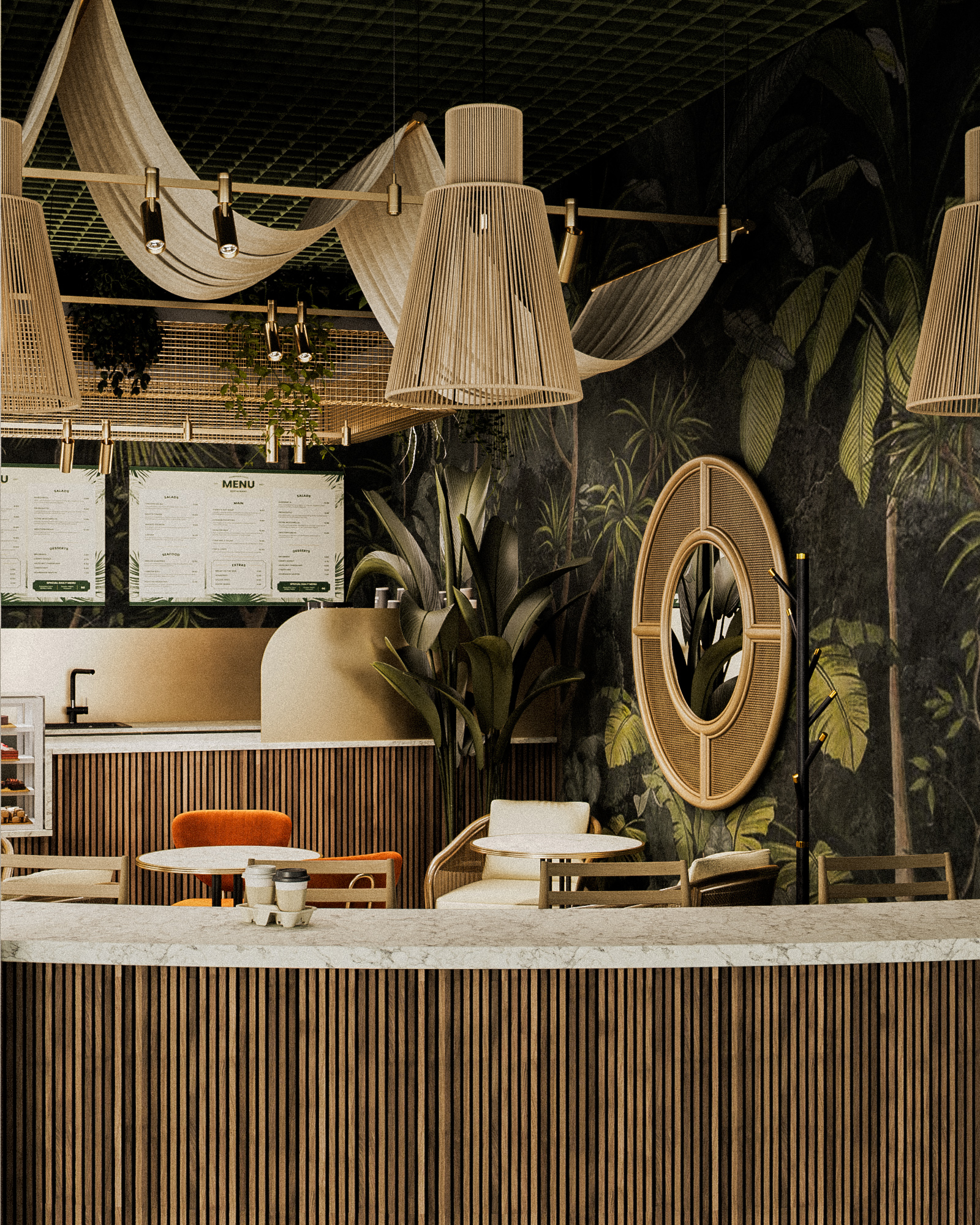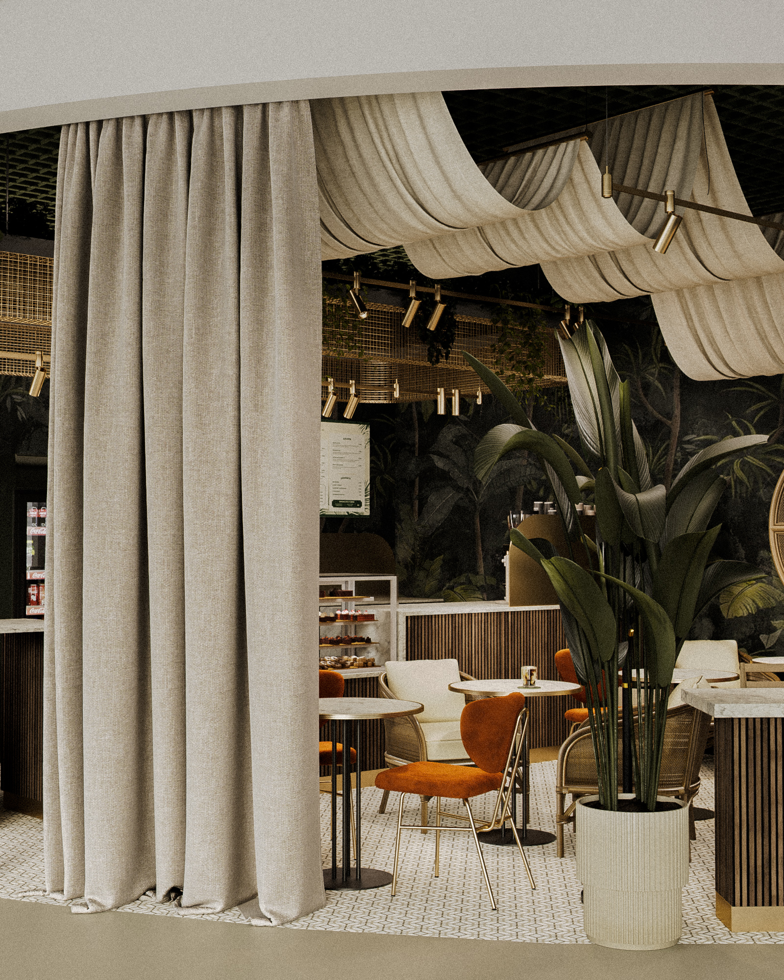 Планировка выстроена вокруг разных сценариев пребывания: посадка у барной стойки, компактные столы для коротких визитов и мягкие зоны для неспешного отдыха. Текстильные драпировки и зелёные акценты работают как элементы зонирования, сохраняя при этом ощущение открытого пространства.