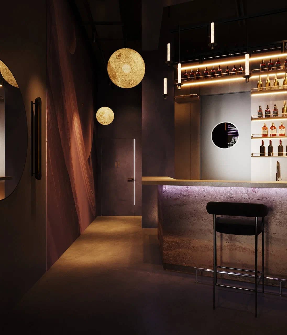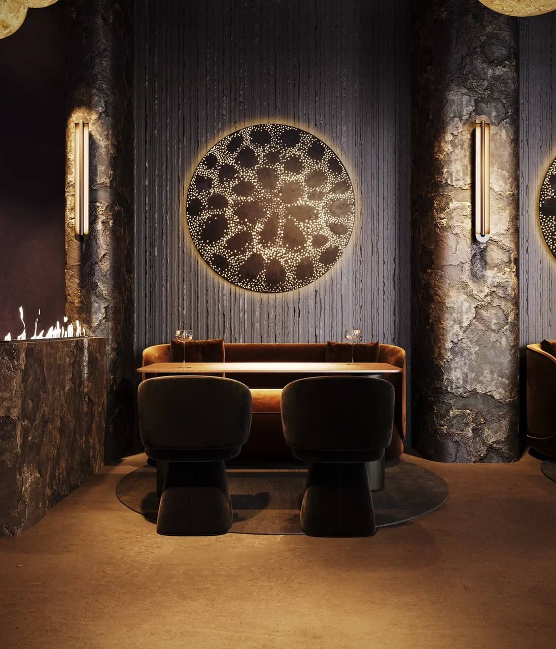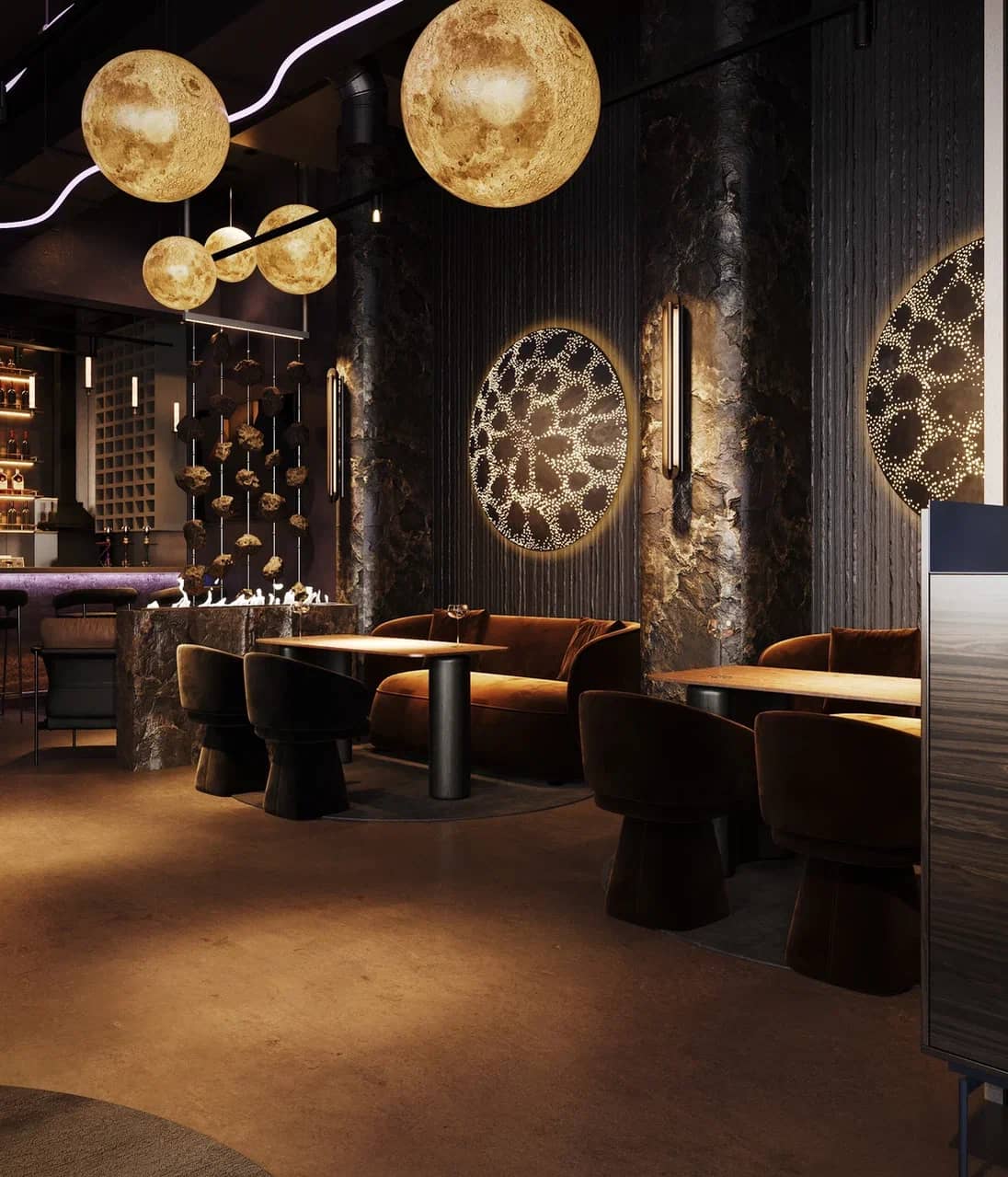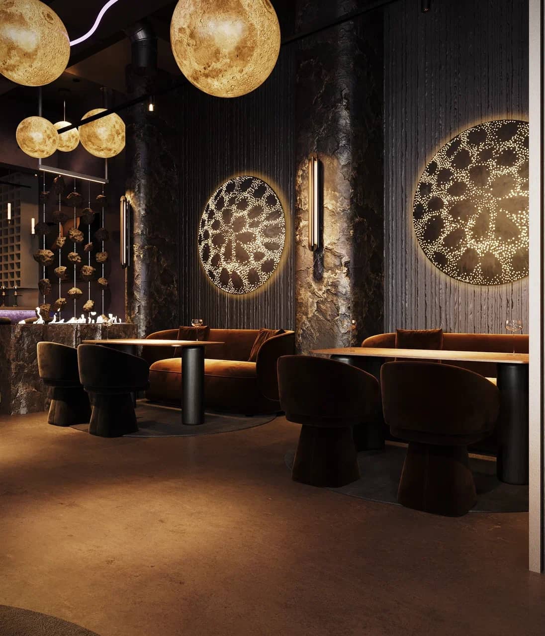 Фактурные стены из тёмного камня и акцентные круглые панели с подсветкой становятся визуальными «порталами» в другие миры, подчёркивая мистический характер пространства. Баланс брутальной основы и мягких обволакивающих форм кресел рождает ощущение уюта внутри космического масштаба.