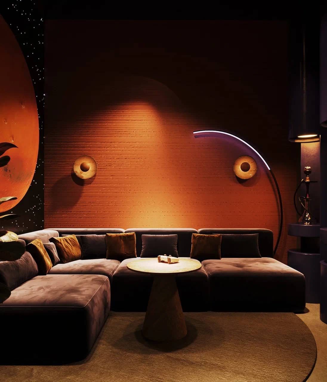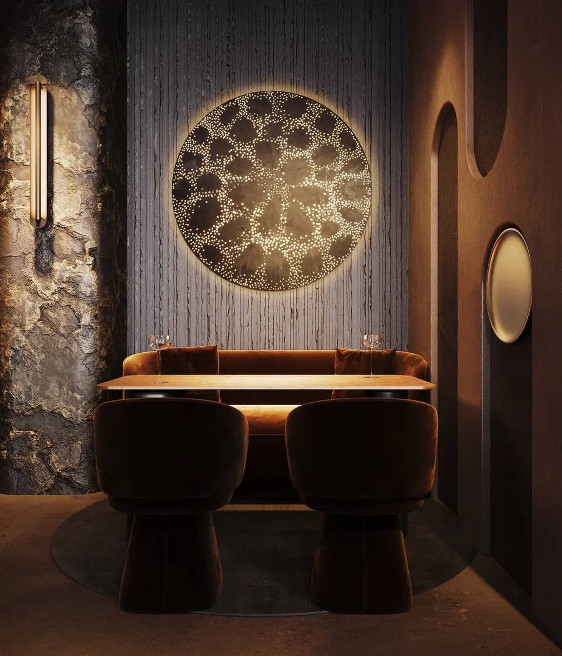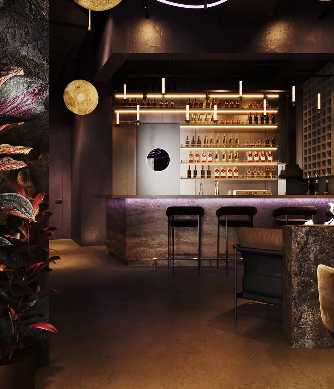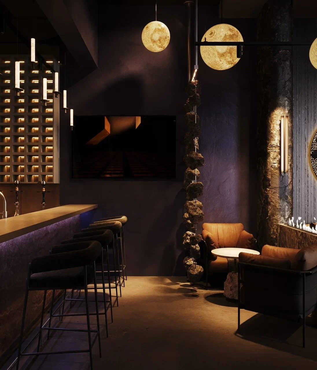 Фактурные стены из тёмного камня и акцентные круглые панели с подсветкой становятся визуальными «порталами» в другие миры, подчёркивая мистический характер пространства. Баланс брутальной основы и мягких обволакивающих форм кресел рождает ощущение уюта внутри космического масштаба.