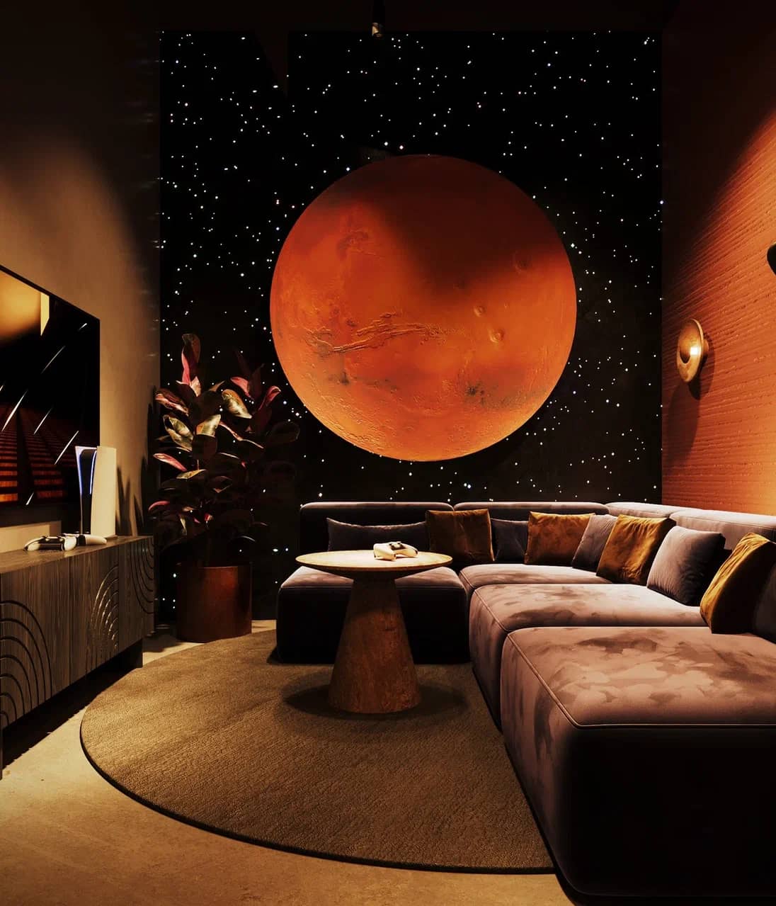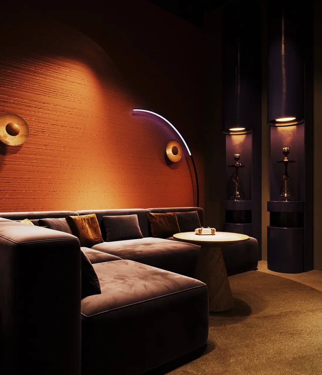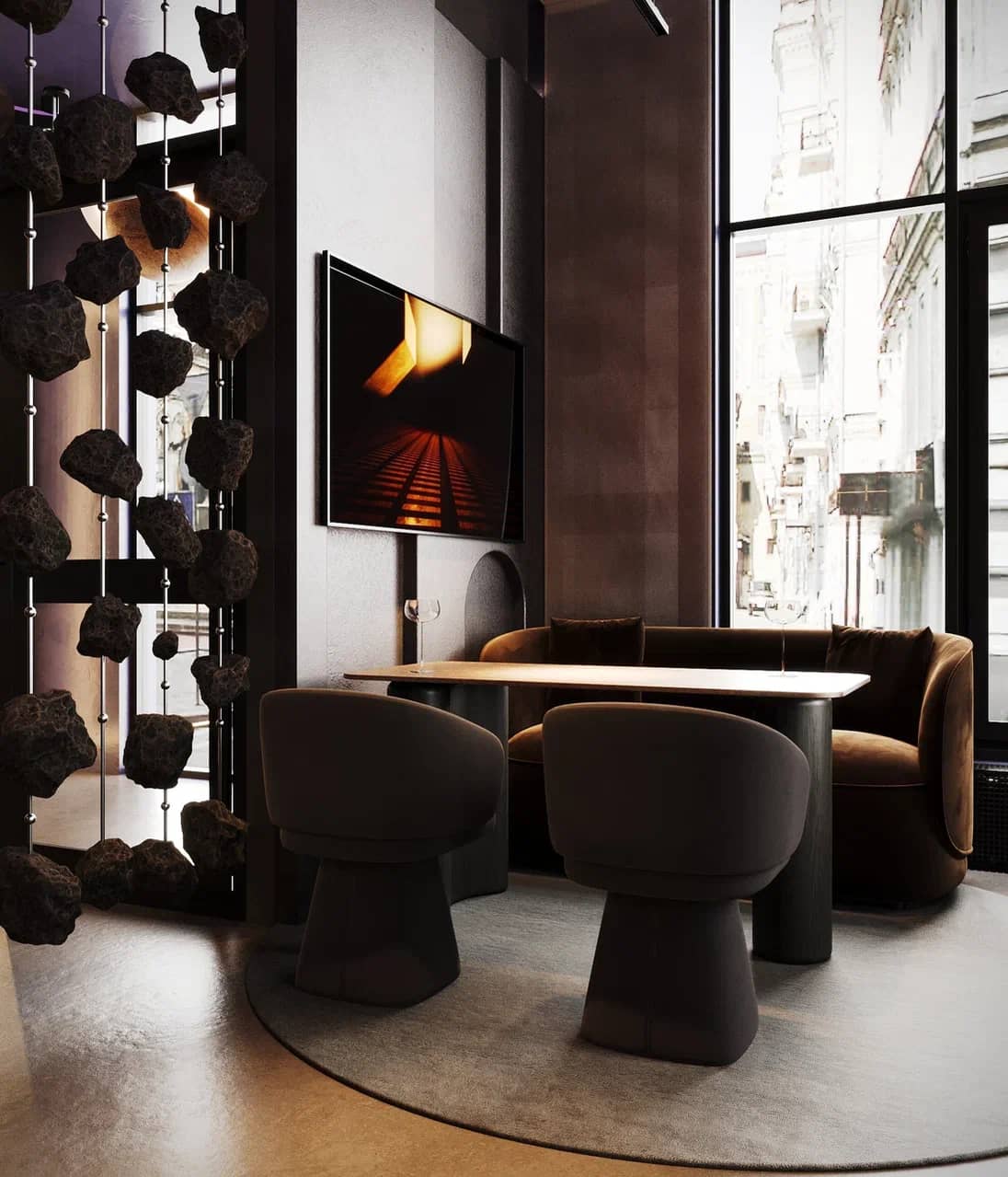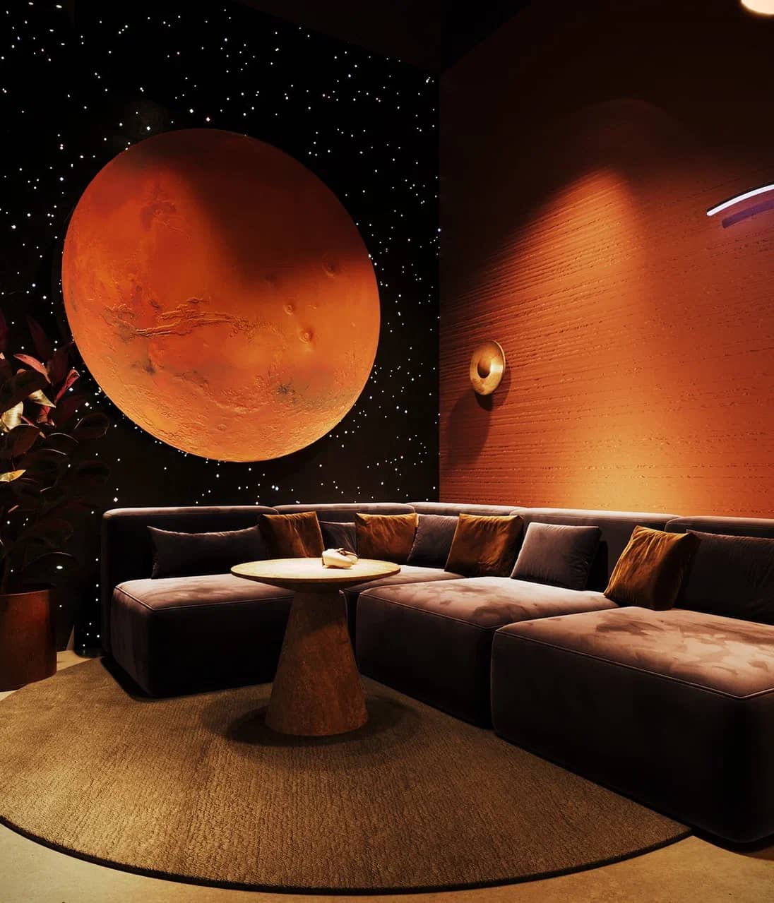 Фактурные стены из тёмного камня и акцентные круглые панели с подсветкой становятся визуальными «порталами» в другие миры, подчёркивая мистический характер пространства. Баланс брутальной основы и мягких обволакивающих форм кресел рождает ощущение уюта внутри космического масштаба.