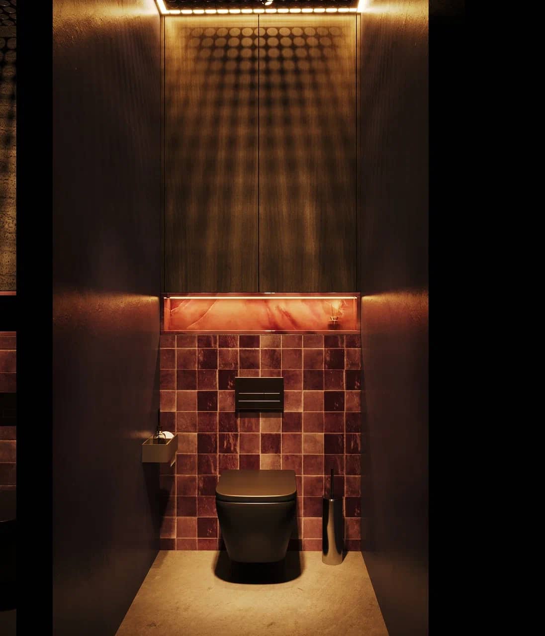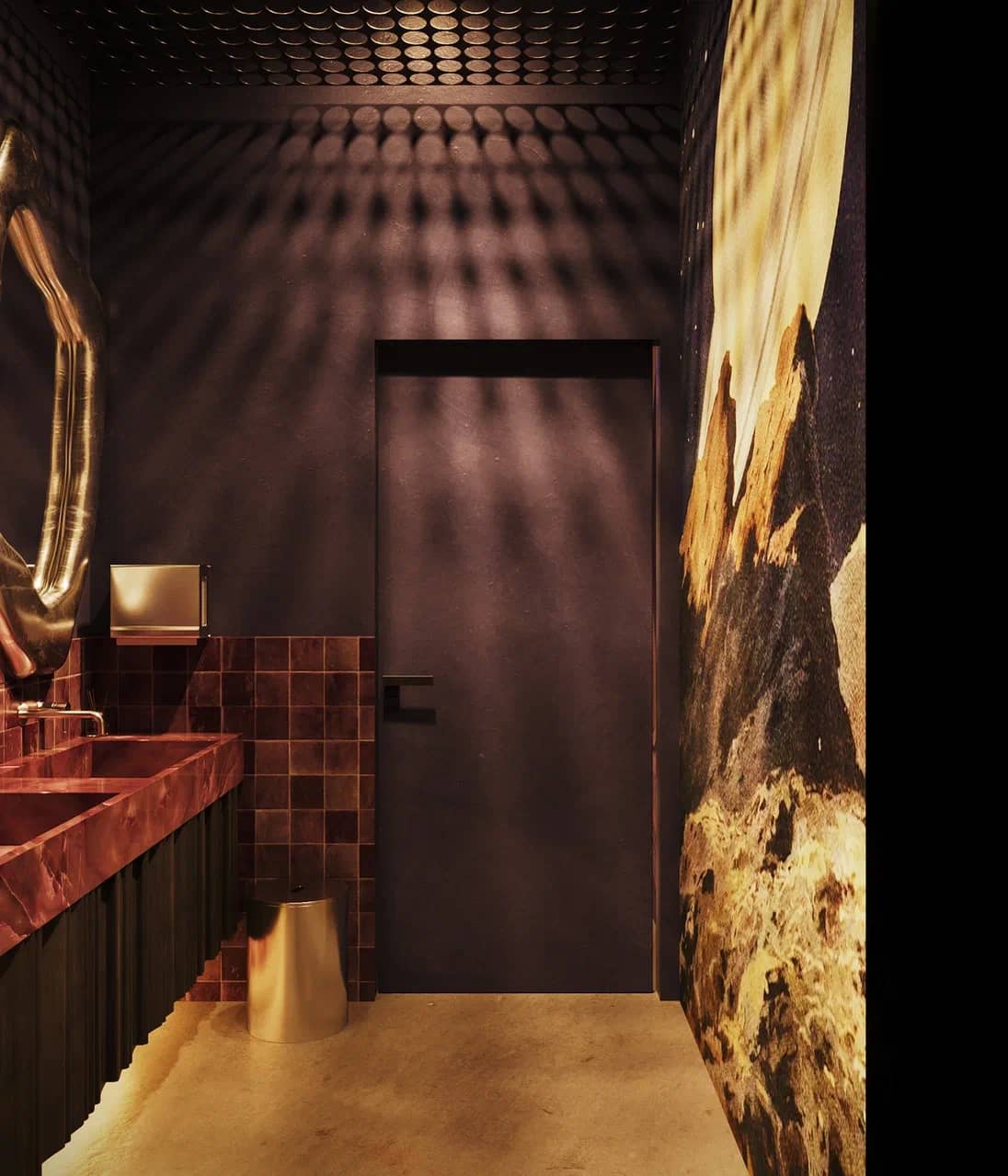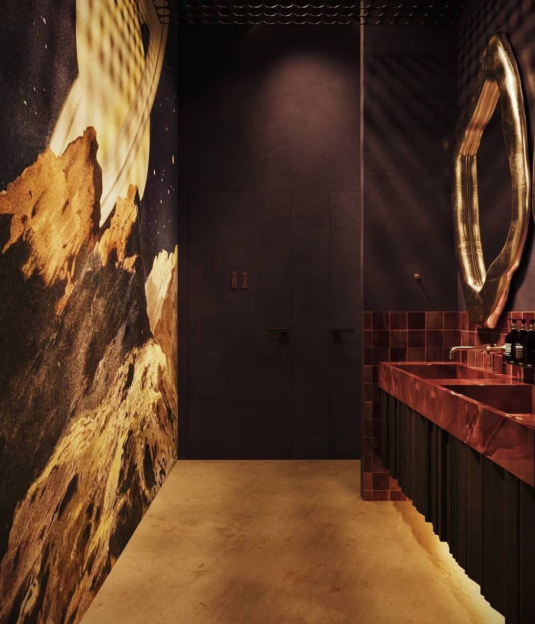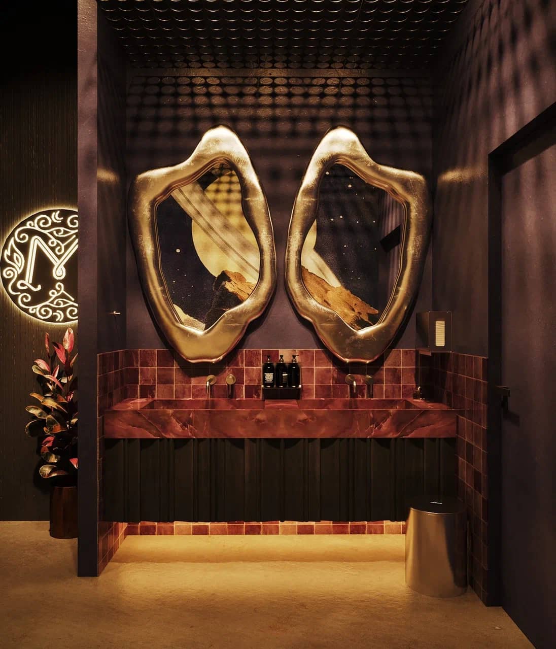 Фактурные стены из тёмного камня и акцентные круглые панели с подсветкой становятся визуальными «порталами» в другие миры, подчёркивая мистический характер пространства. Баланс брутальной основы и мягких обволакивающих форм кресел рождает ощущение уюта внутри космического масштаба.