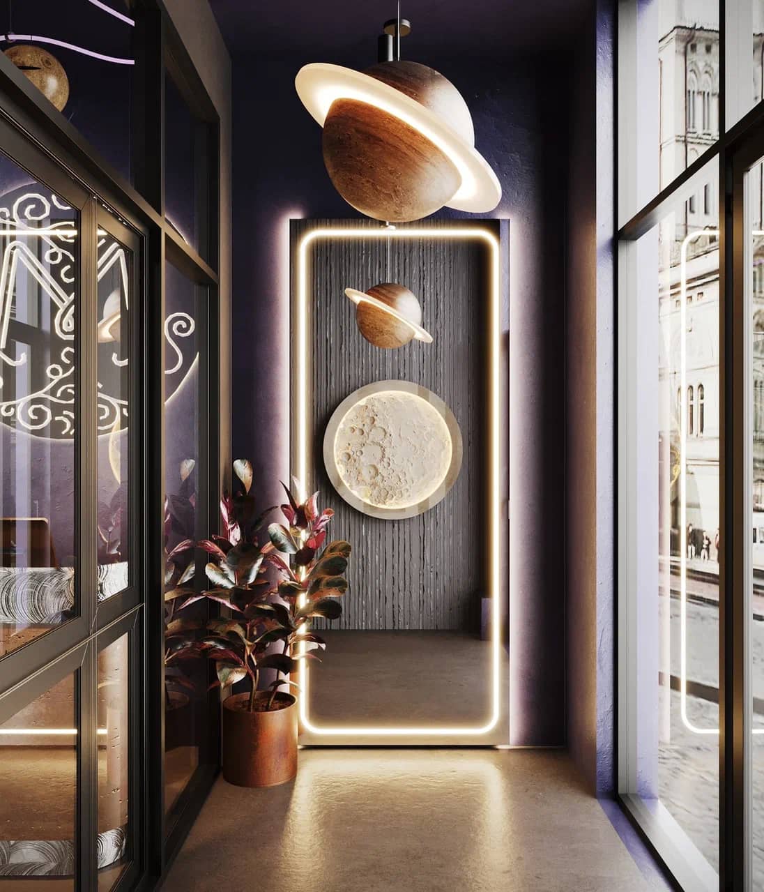 Описание проекта: Этот интерьер строится вокруг космической метафоры: здесь каждая деталь напоминает о Вселенной и её магнетизме. Светильники-сферы, подобные полнолунию, создают атмосферу загадочного ночного неба, а неоновые линии вьются по потолку, словно световые орбиты.
