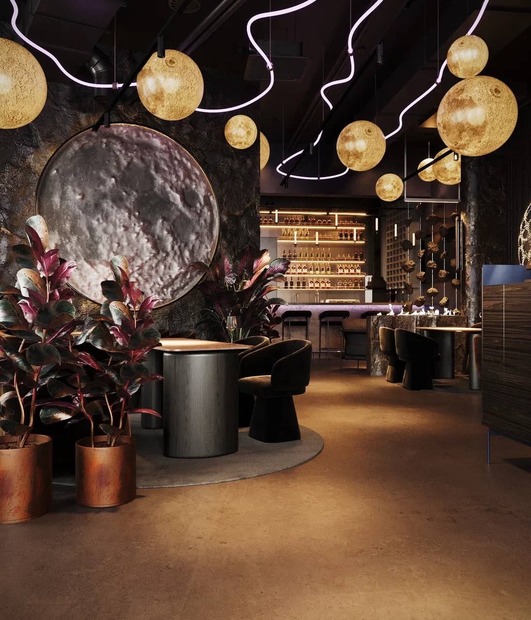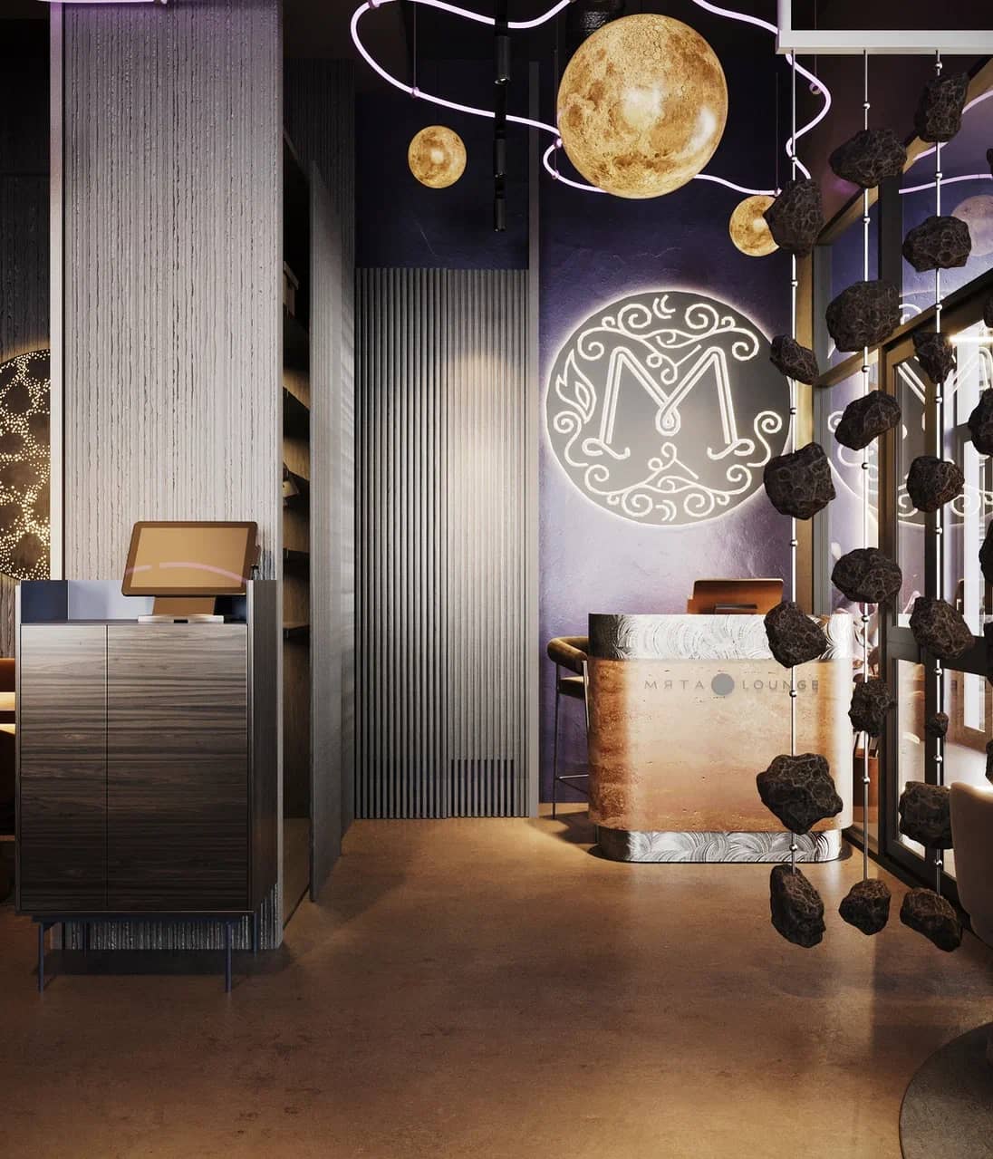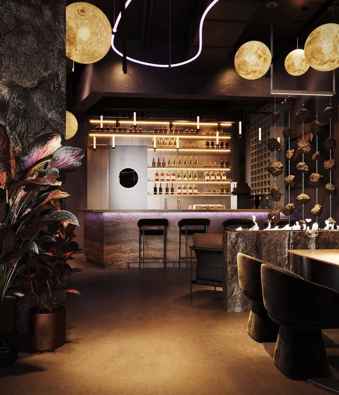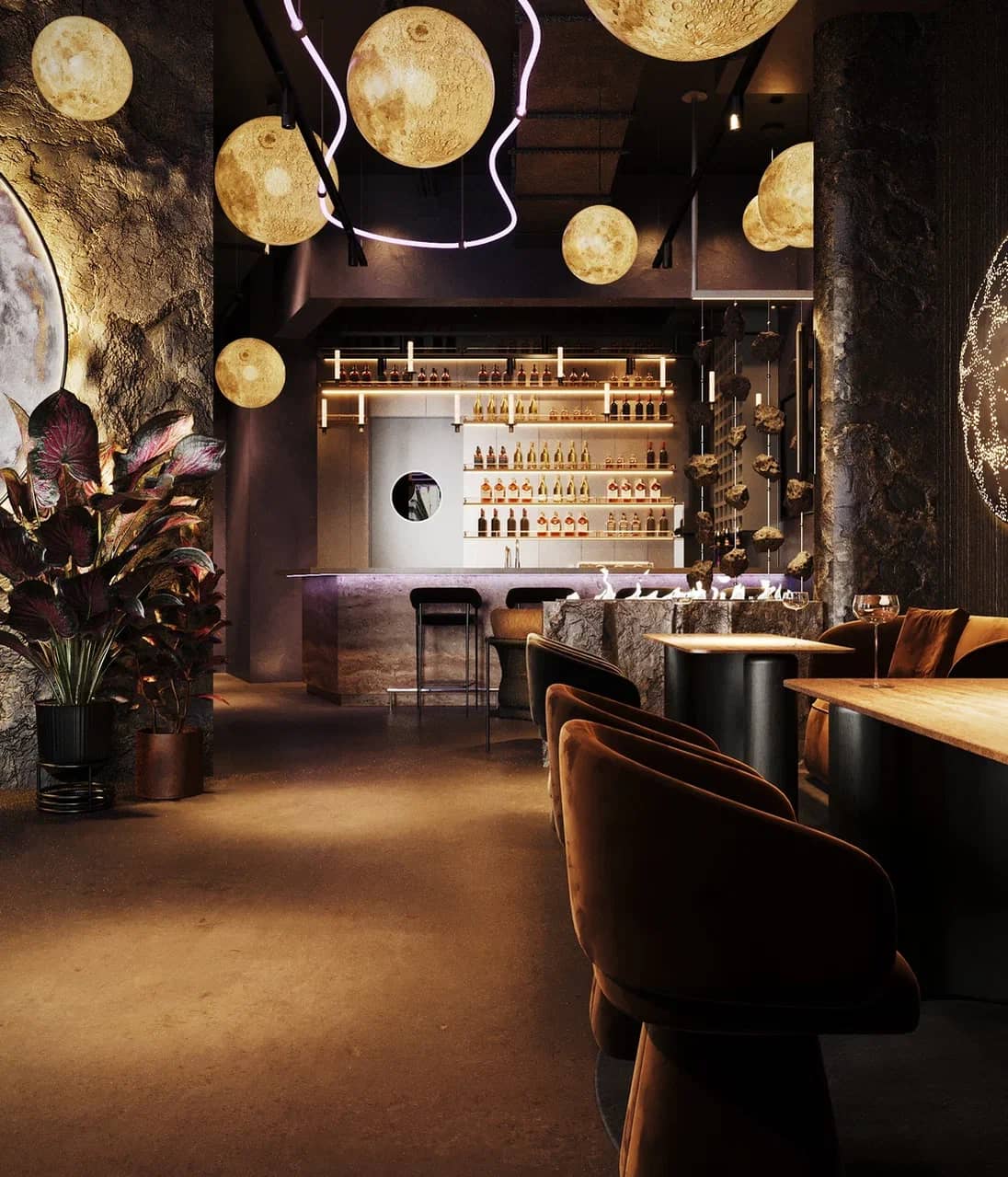 Барная зона, выполненная из камня с мерцающей подсветкой, словно парит в полутьме, а декоративные элементы — подвесные «астероиды», планетарные композиции, растения в медных кашпо — создают живой диалог между земным и внеземным.