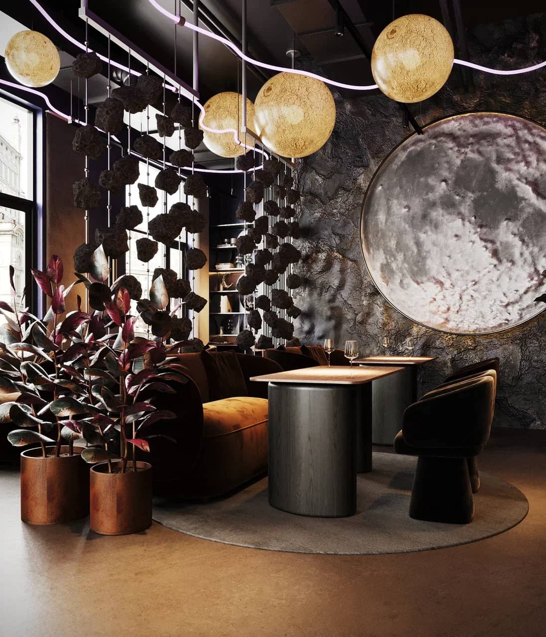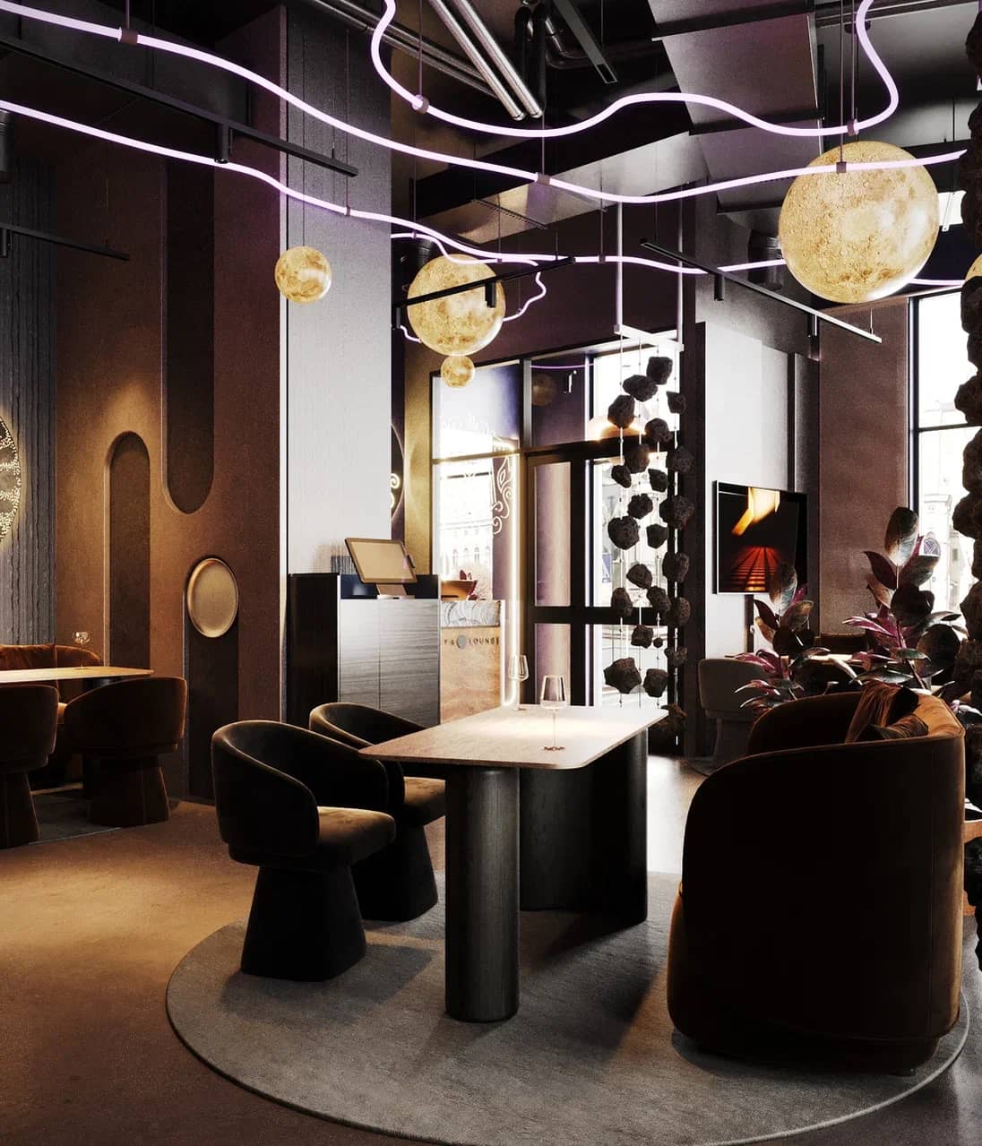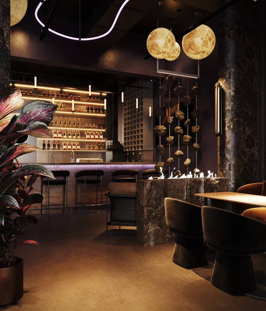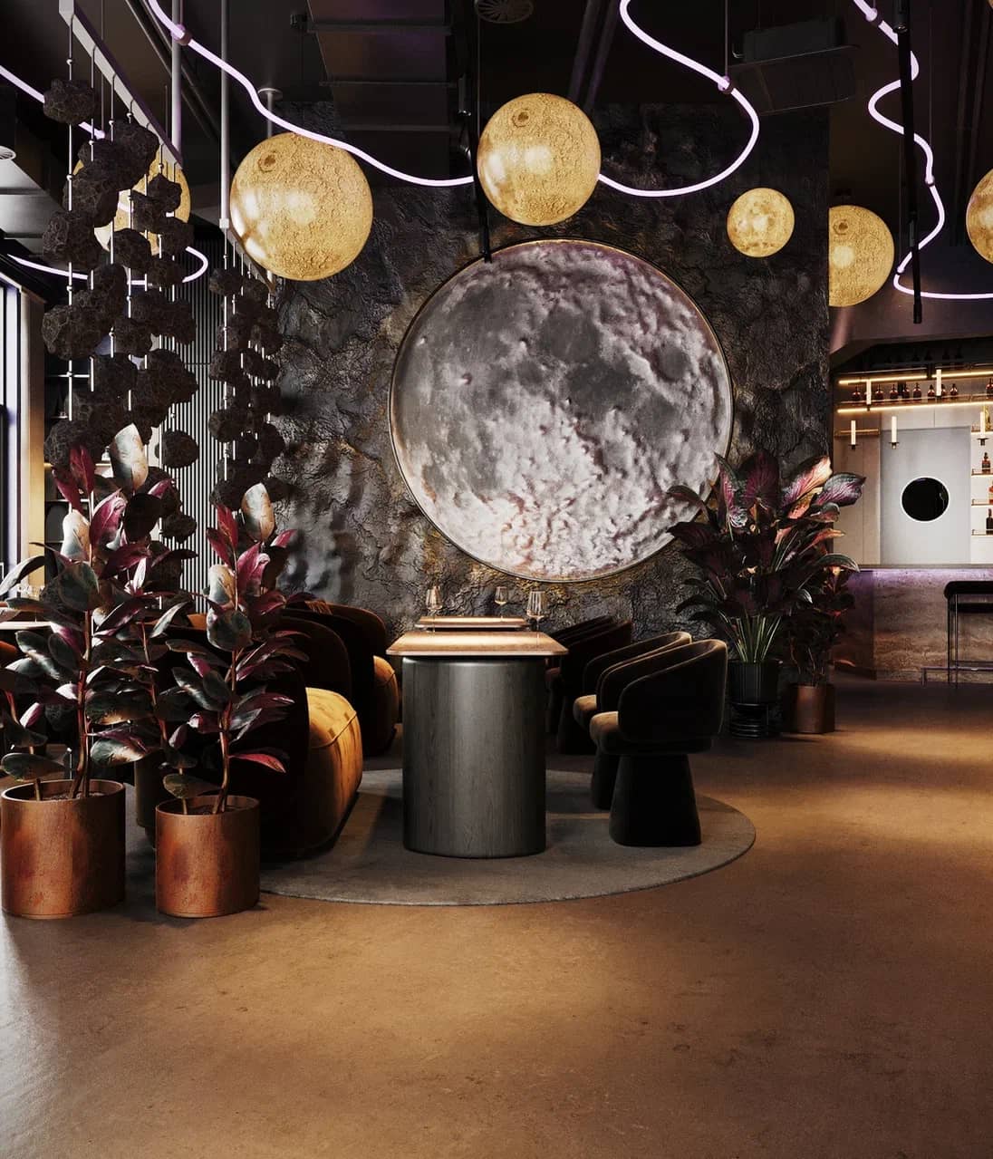 Барная зона, выполненная из камня с мерцающей подсветкой, словно парит в полутьме, а декоративные элементы — подвесные «астероиды», планетарные композиции, растения в медных кашпо — создают живой диалог между земным и внеземным.