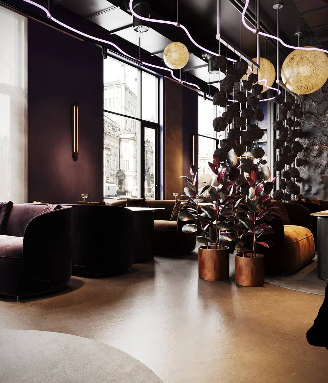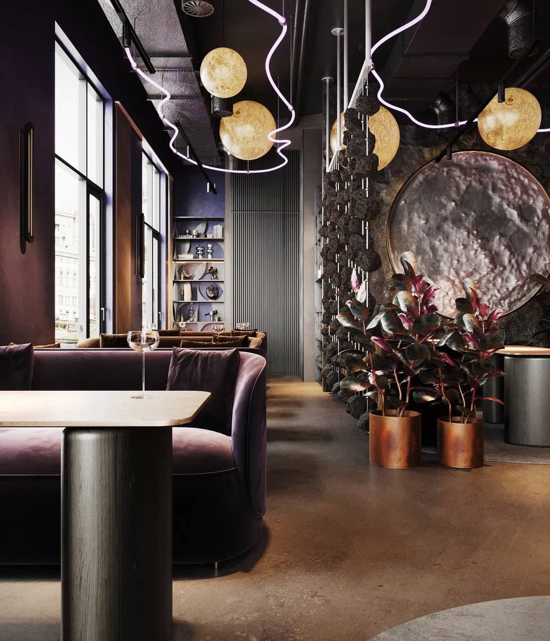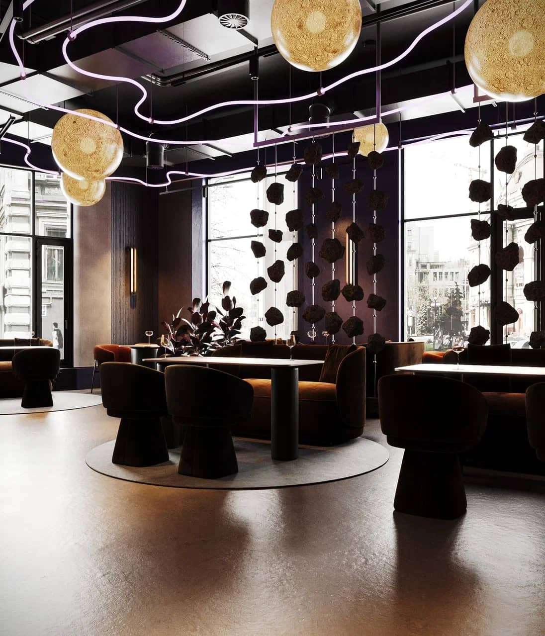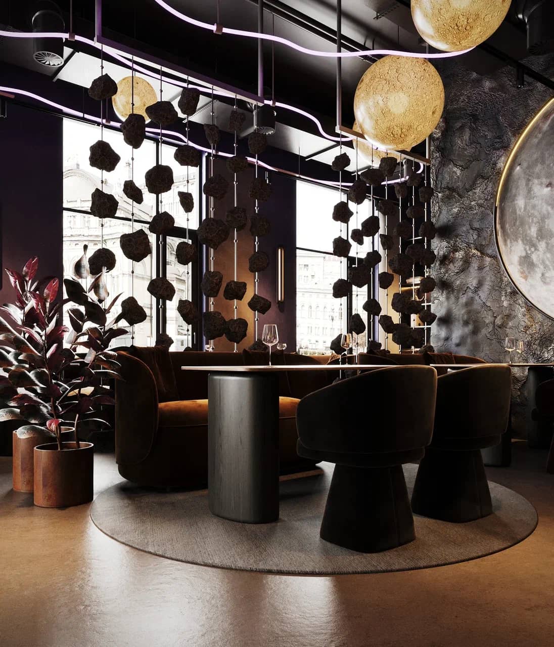 Барная зона, выполненная из камня с мерцающей подсветкой, словно парит в полутьме, а декоративные элементы — подвесные «астероиды», планетарные композиции, растения в медных кашпо — создают живой диалог между земным и внеземным.