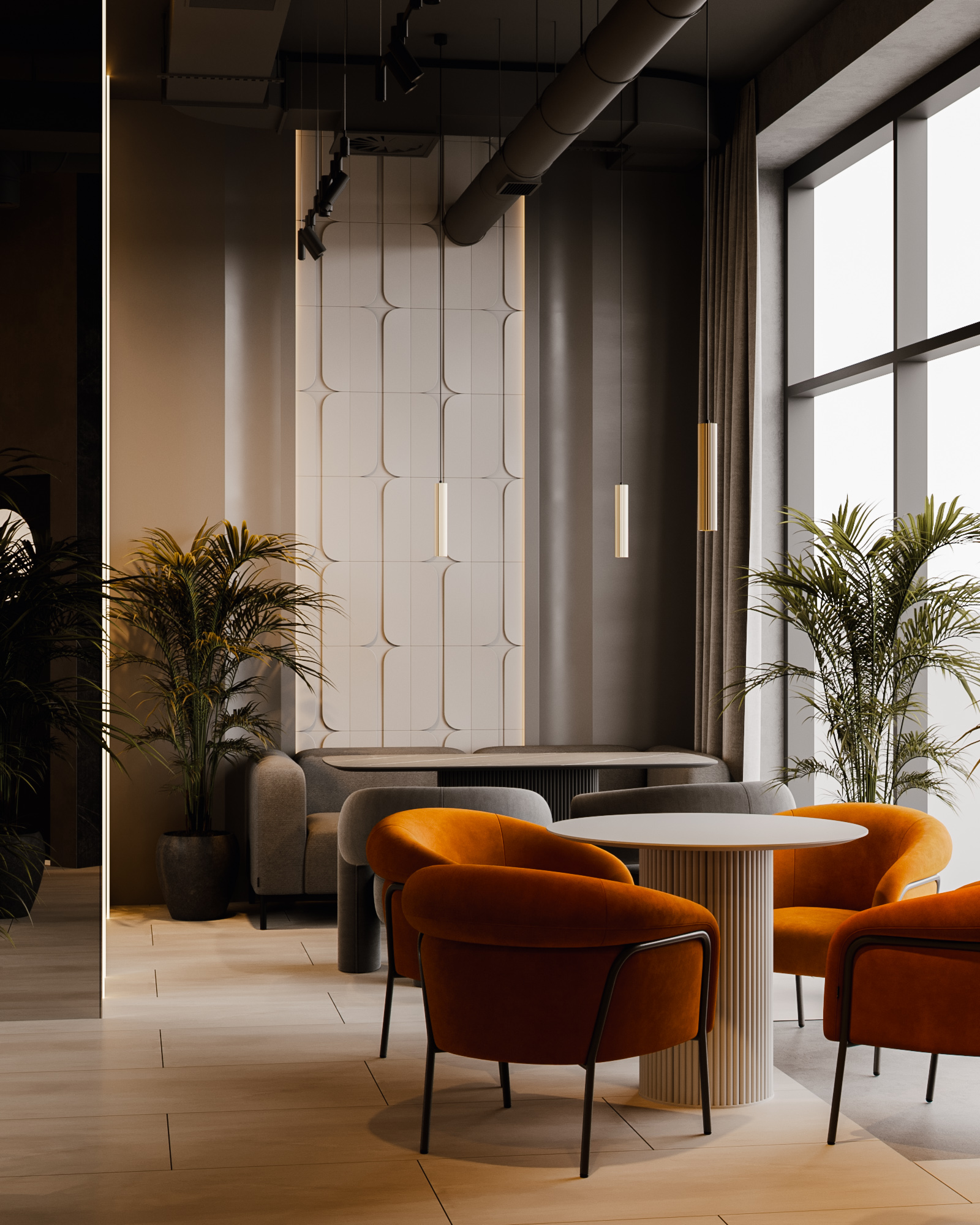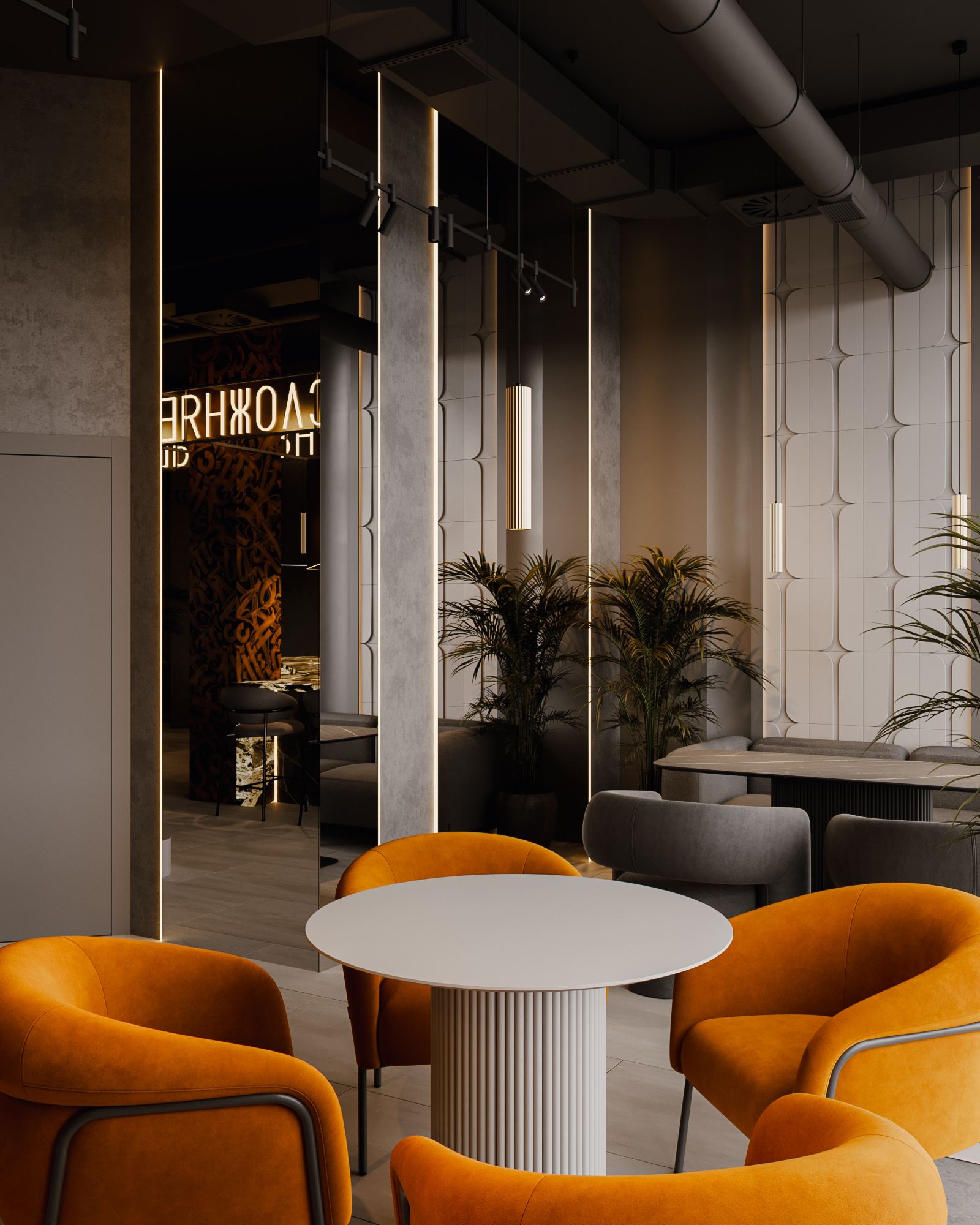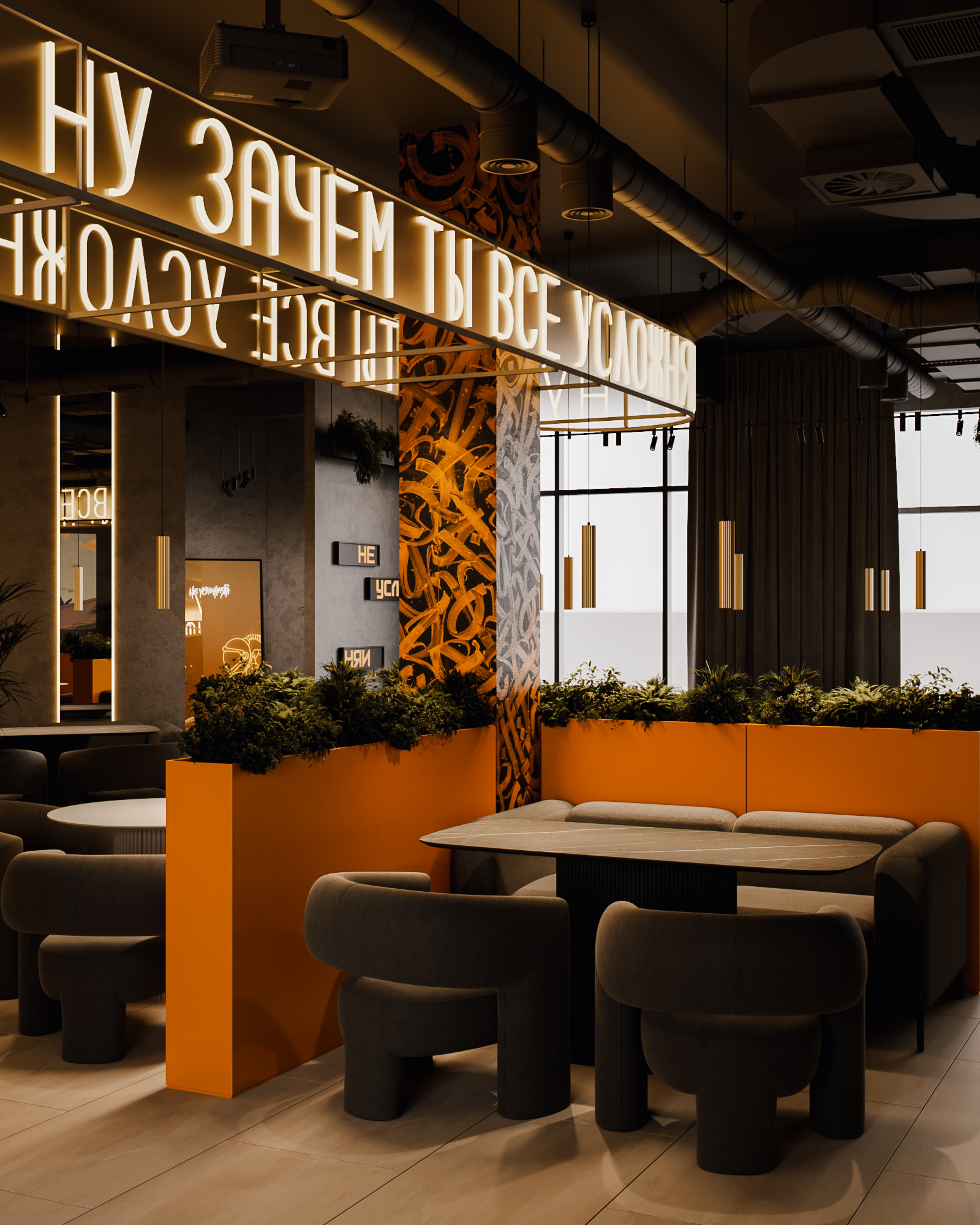 Описание проекта: Мы создали интерьер кальянной «Не усложняй» в Екатеринбурге — атмосферное пространство, где мягкая геометрия посадочных зон соединена с яркими акцентами фирменной айдентики. В основе композиции — глубокие серые тона, насыщенный терракотовый цвет и теплые световые контуры, формирующие характер заведения и подчёркивающие его визуальную идею.
