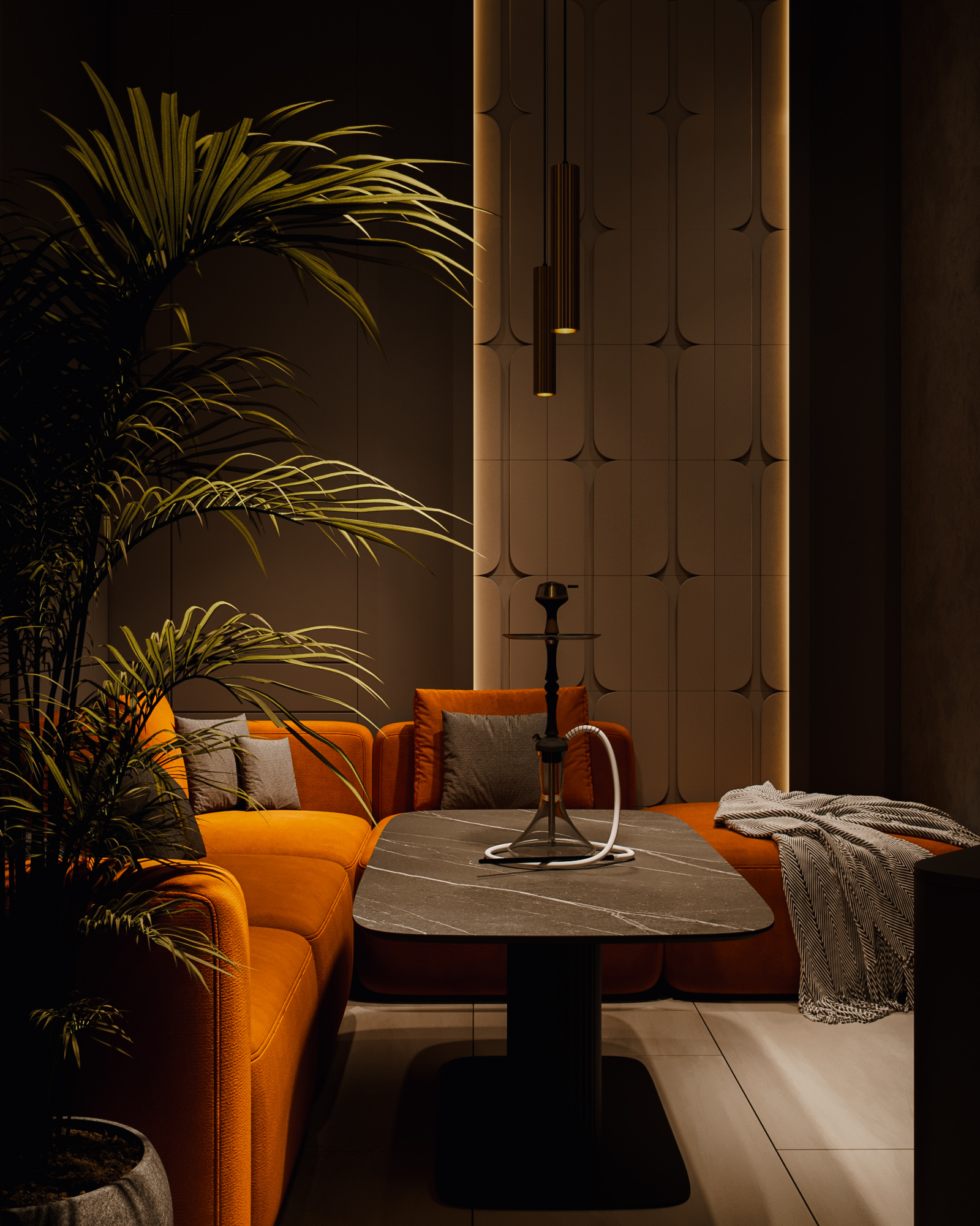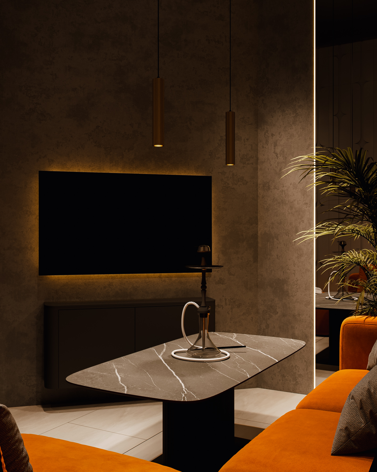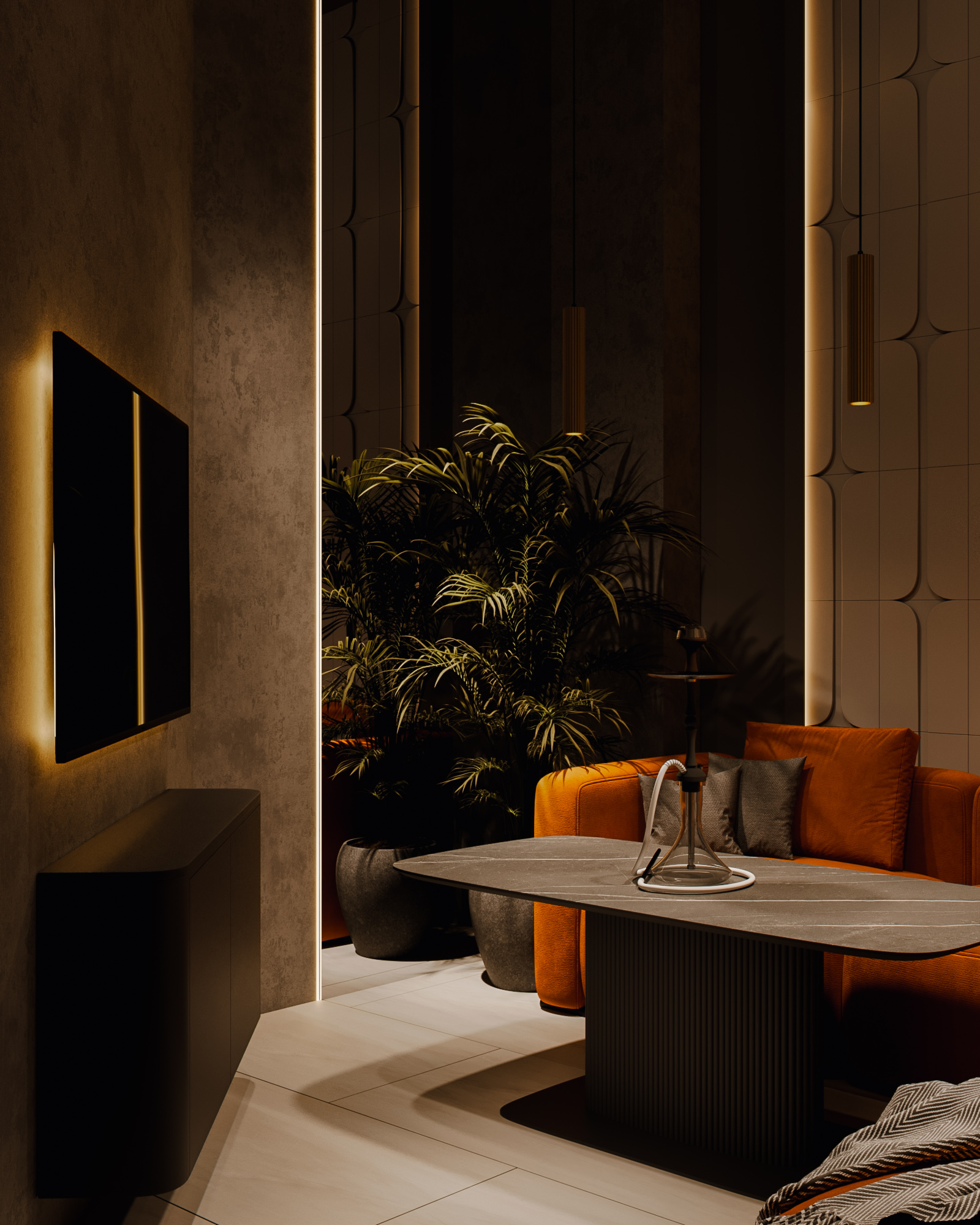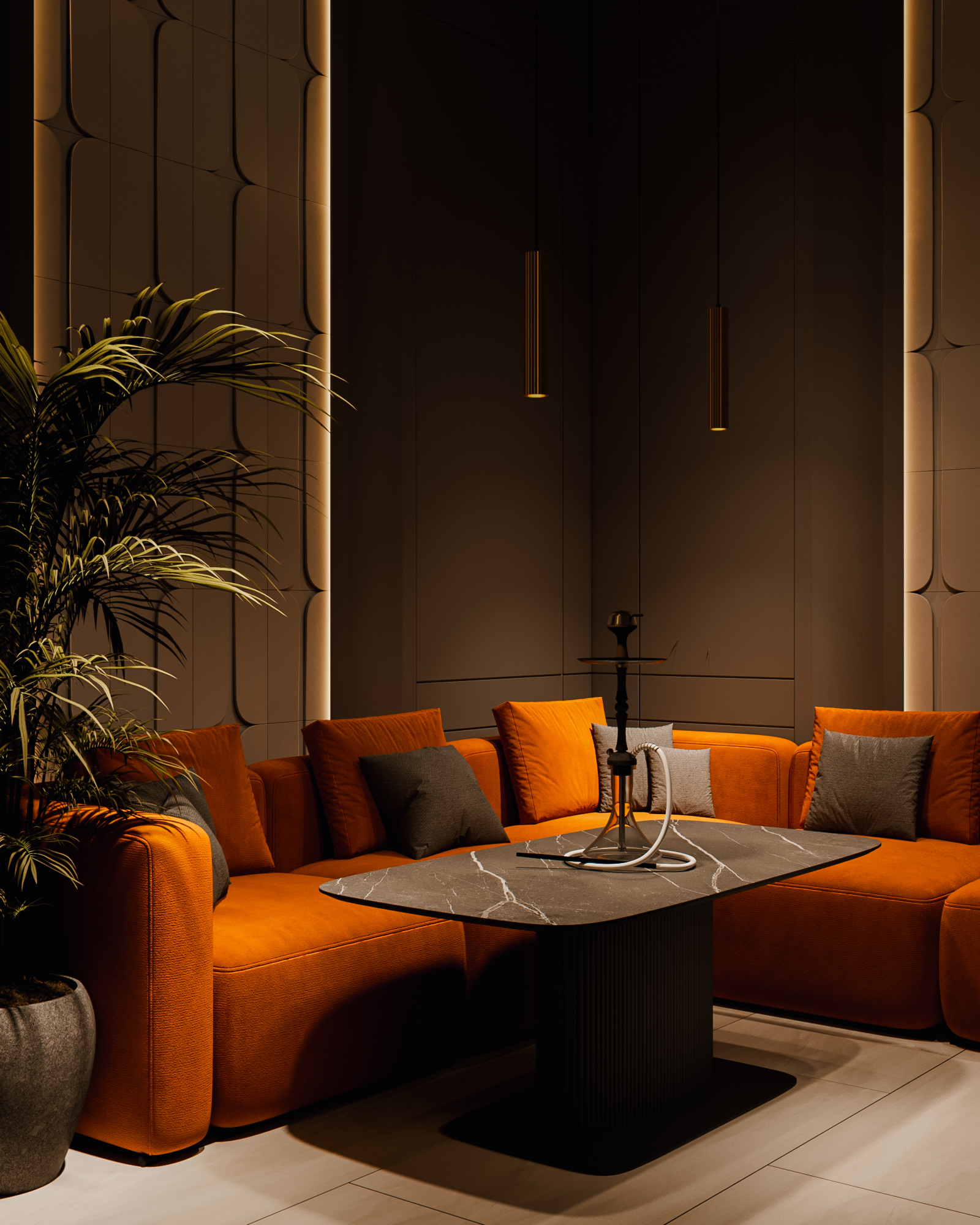 В результате получилась современная, продуманная и визуально чистая кальянная, в которой навигация, свет и посадочные группы работают на единую концепцию бренда — спокойную, тёплую и уверенную атмосферу отдыха.