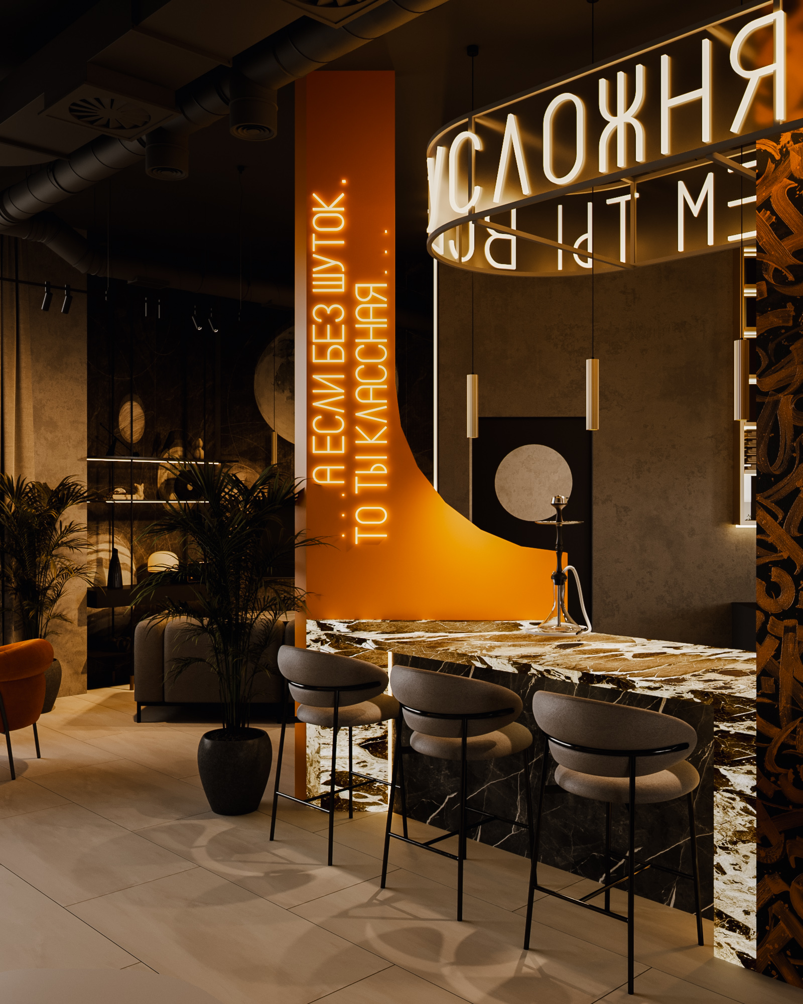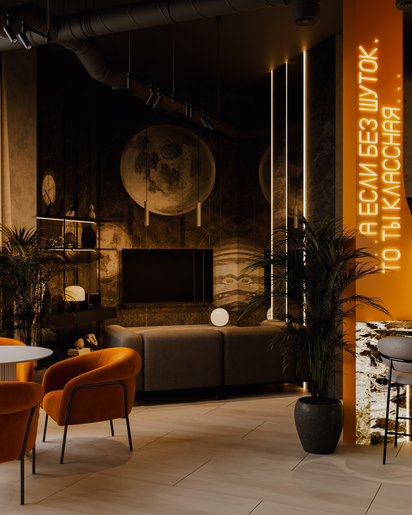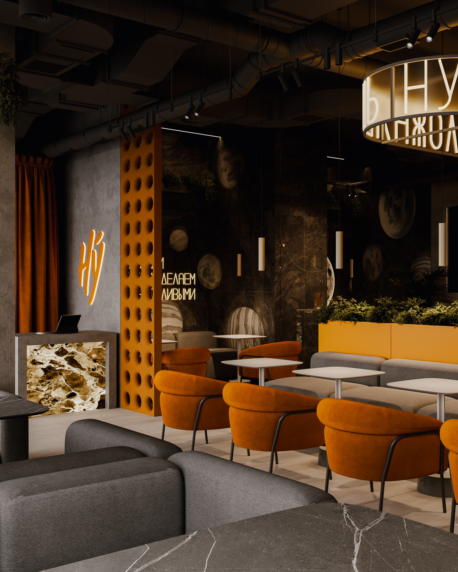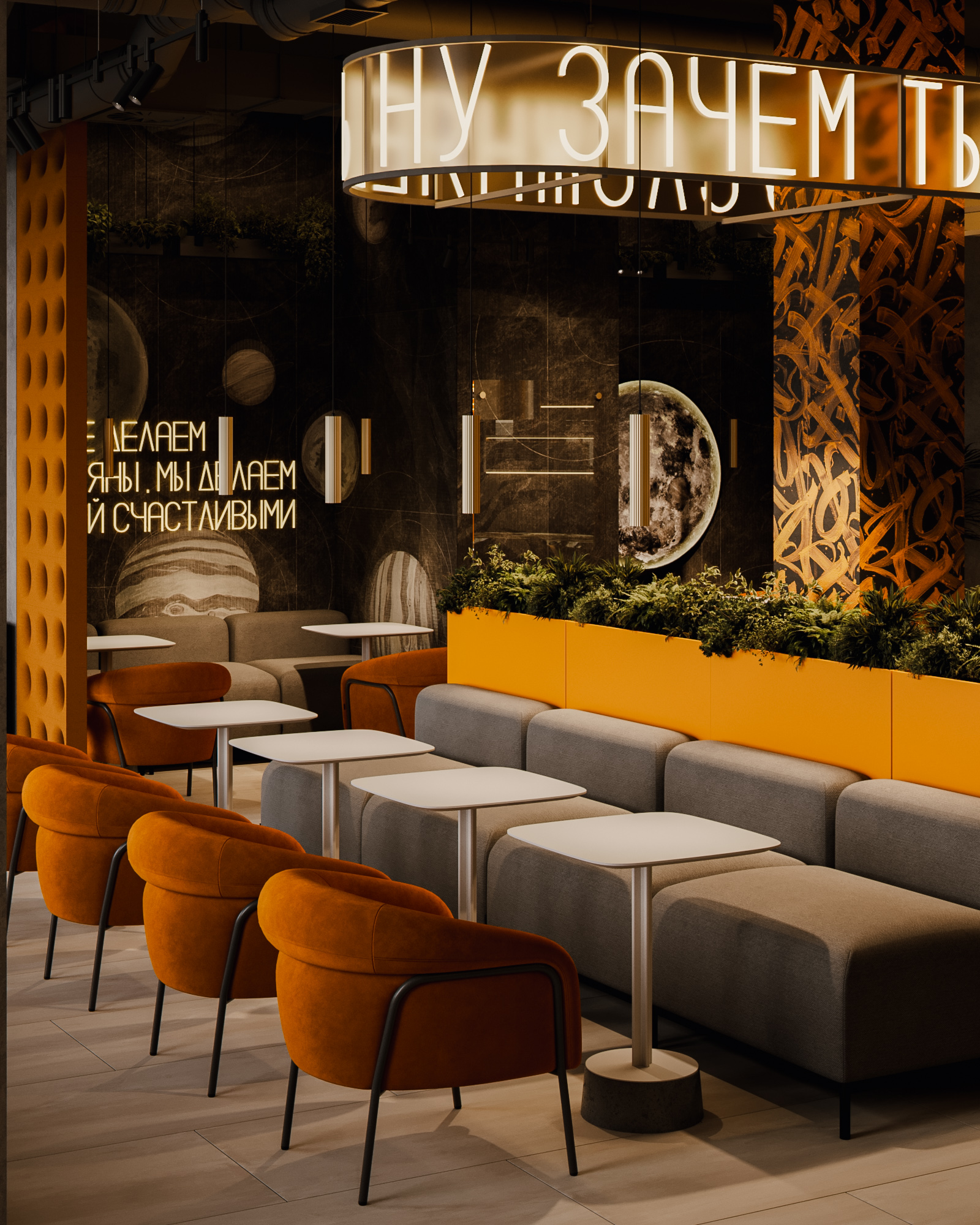 Центральные зоны построены вокруг длинных диванных групп и круглых кресел, создающих комфортный, расслабленный сценарий пребывания. Неоновые фразы бренда, графические панели с планетами и декоративные световые элементы формируют запоминаемый образ и создают узнаваемый визуальный код. Барная часть выполнена как монолит с выразительной текстурой камня и интегрированной подсветкой.