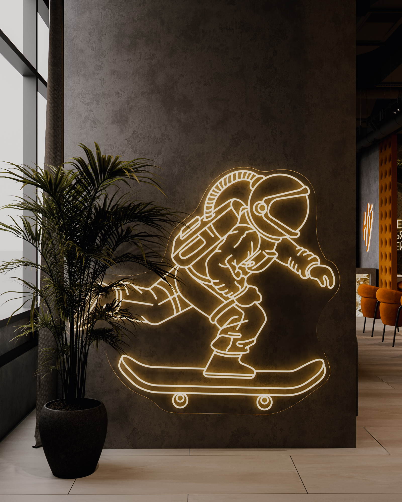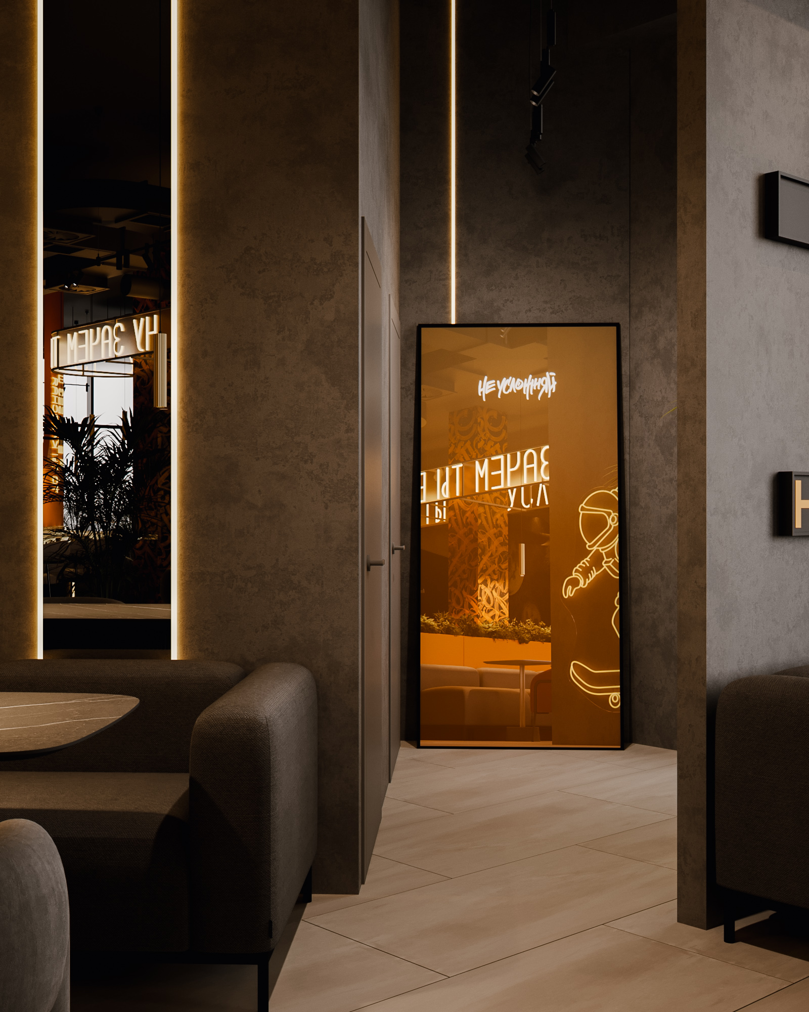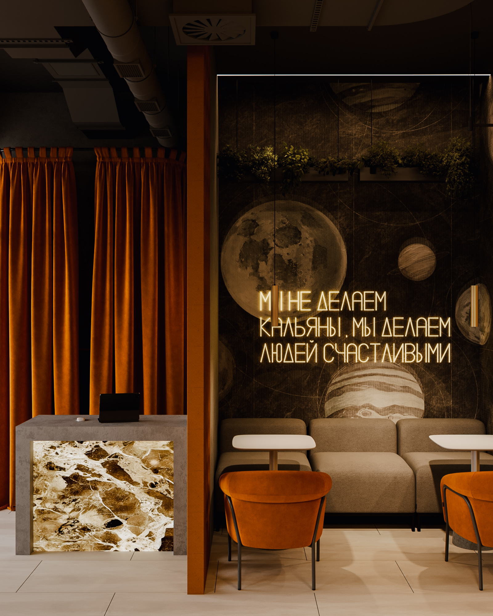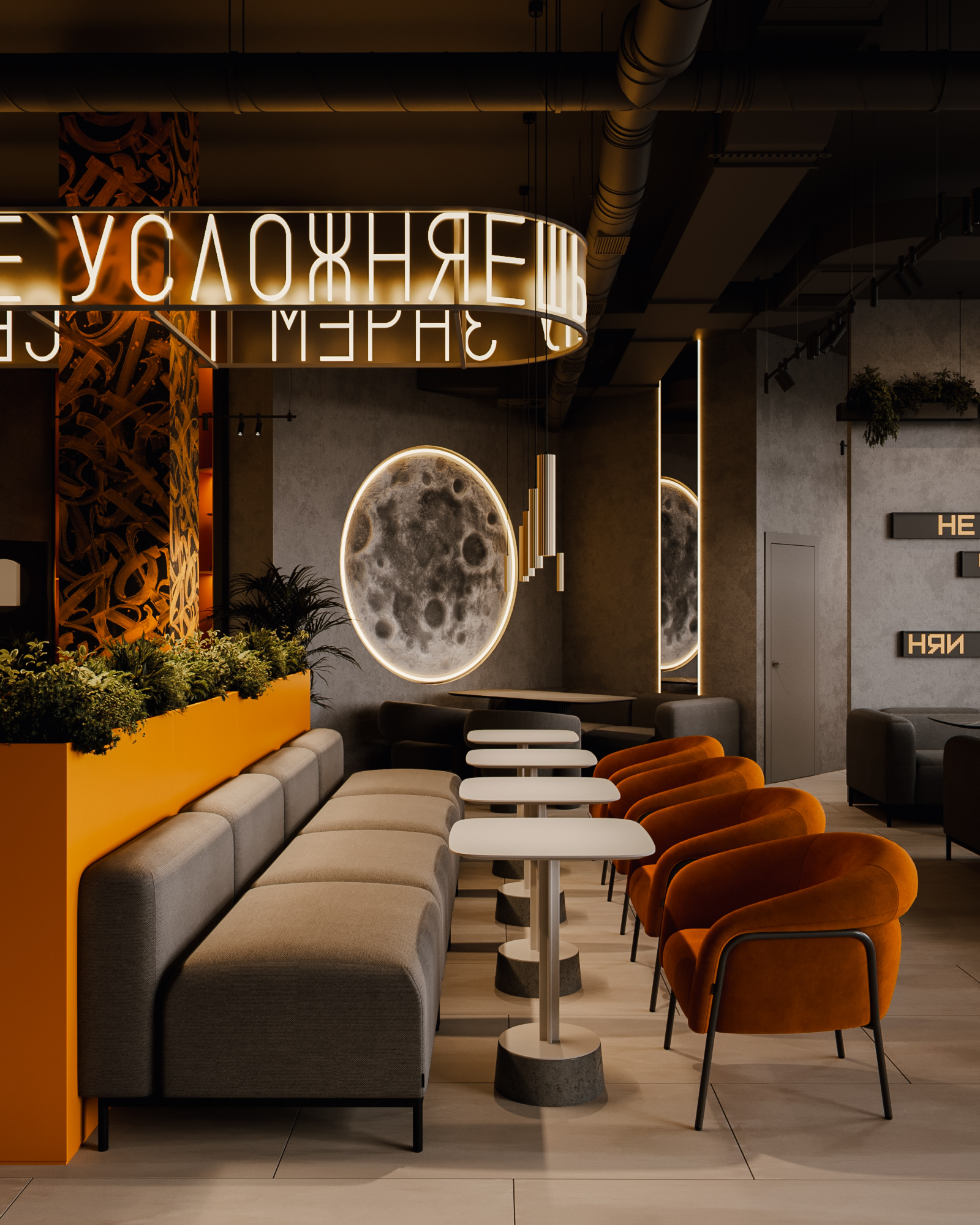 Центральные зоны построены вокруг длинных диванных групп и круглых кресел, создающих комфортный, расслабленный сценарий пребывания. Неоновые фразы бренда, графические панели с планетами и декоративные световые элементы формируют запоминаемый образ и создают узнаваемый визуальный код. Барная часть выполнена как монолит с выразительной текстурой камня и интегрированной подсветкой.