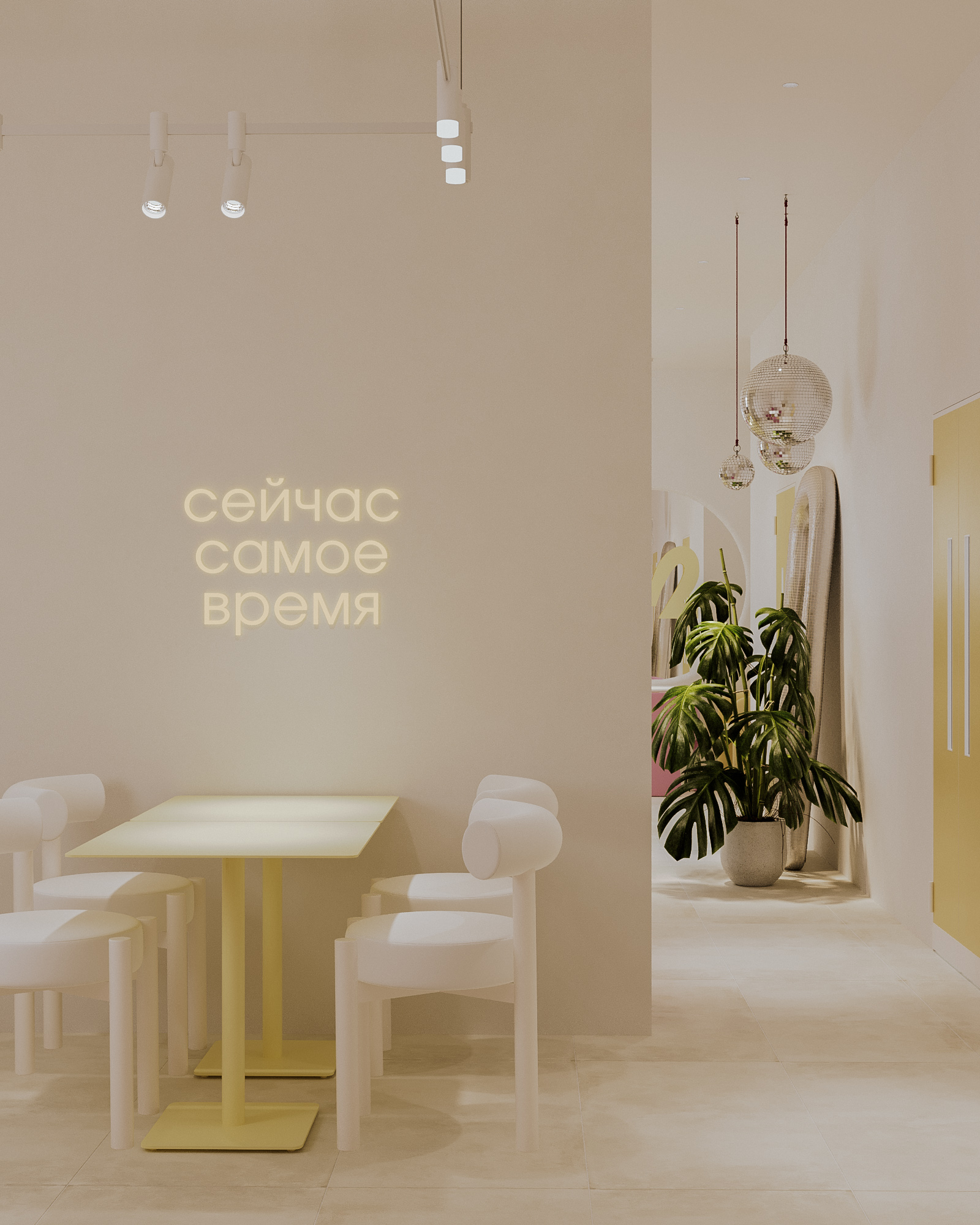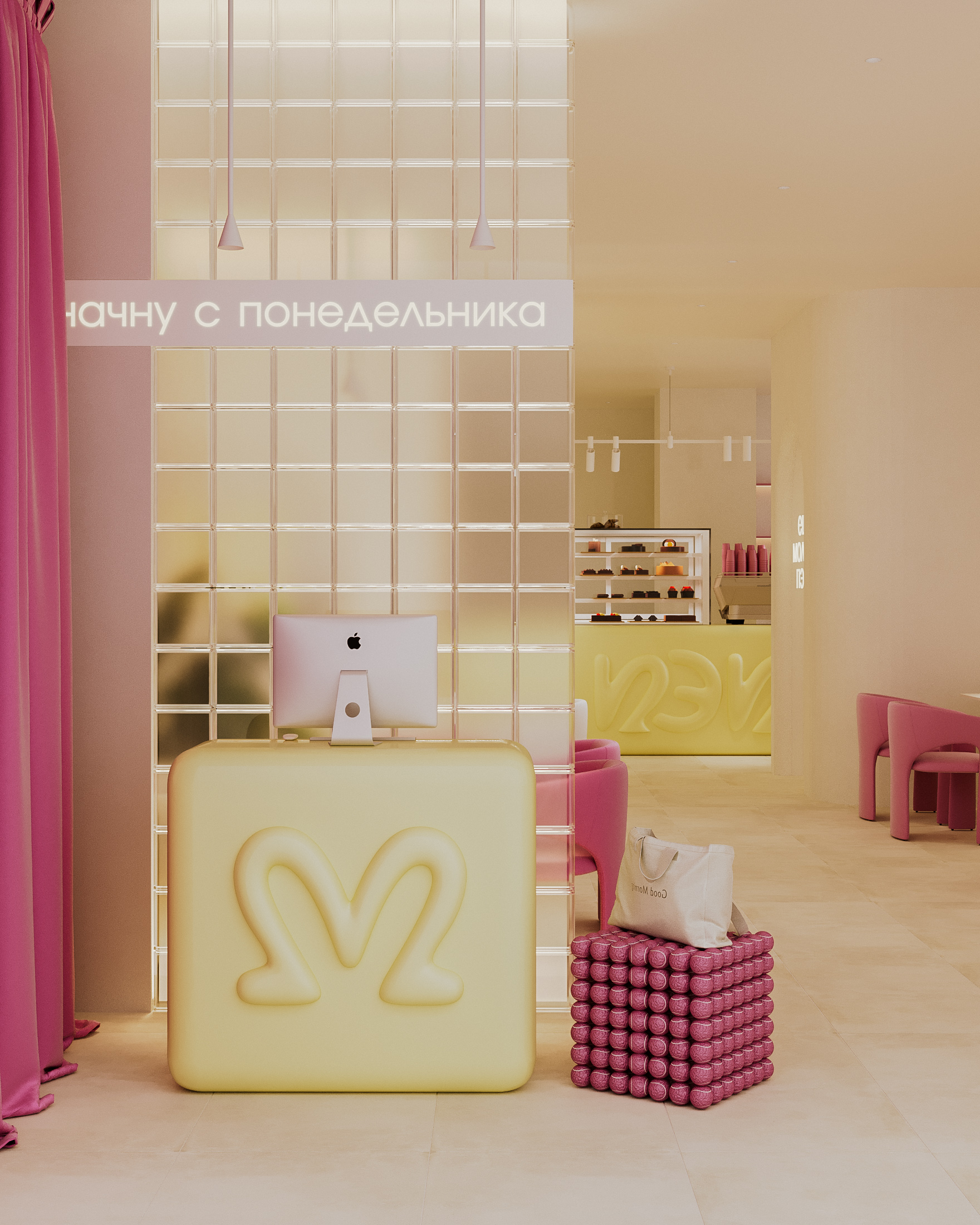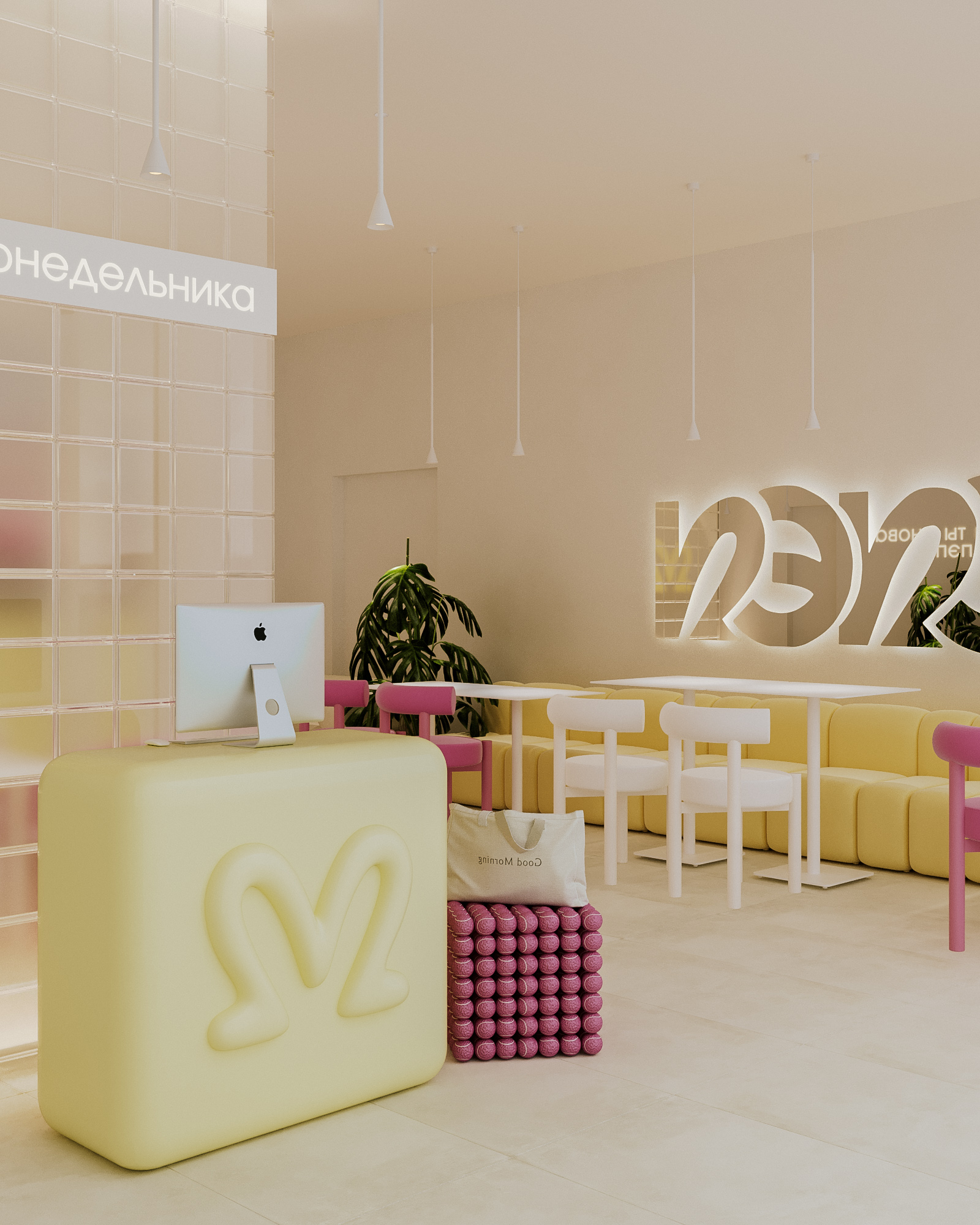 Интерьер собран как визуальная игра: округлые формы мебели и барных стоек напоминают леденцы и конфеты, стены становятся фоном для неоновых фраз-афоризмов («Начну с понедельника», «Могу себе позволить»), а элементы из стеклоблоков пропускают мягкий свет, поддерживая атмосферу прозрачности и лёгкости.