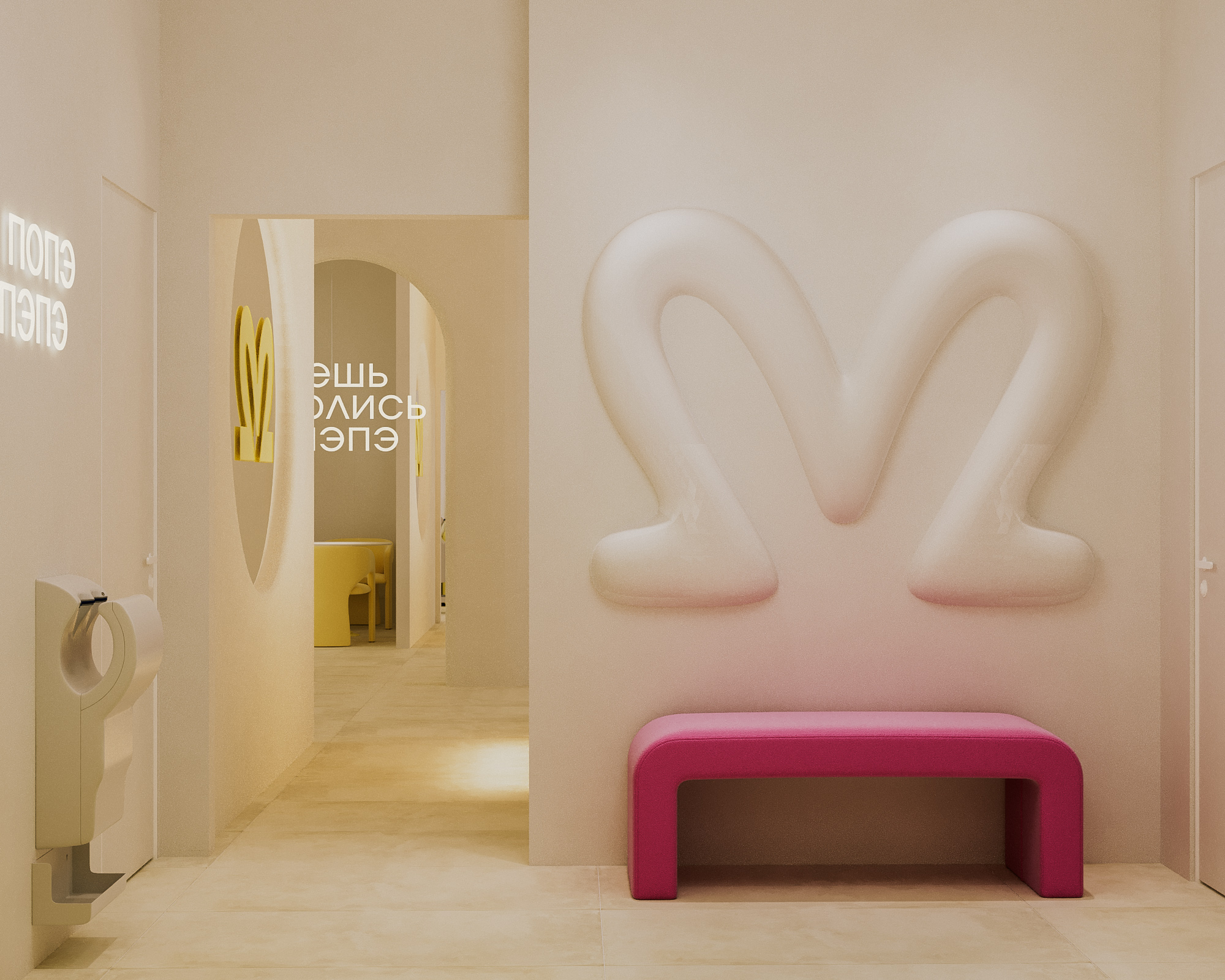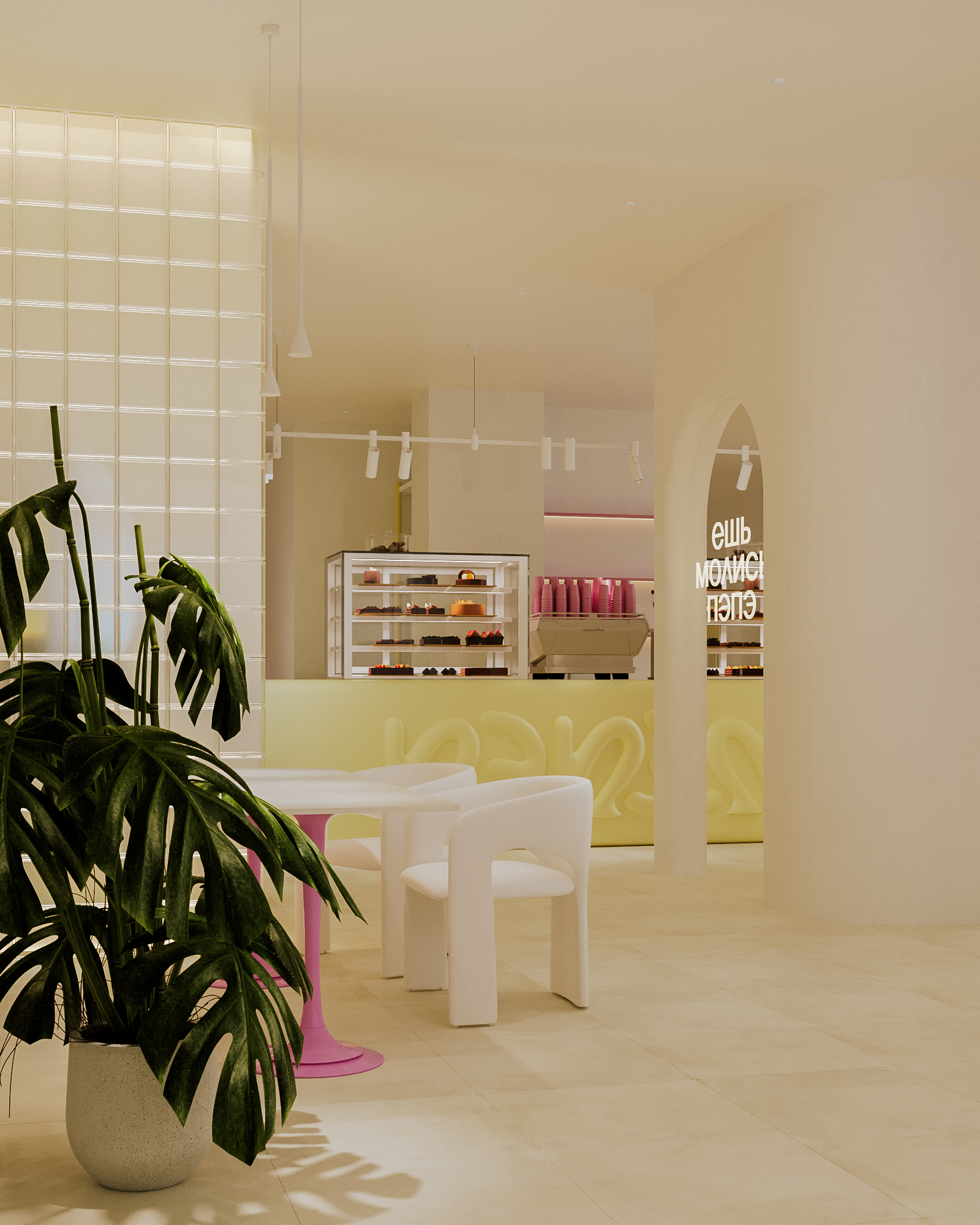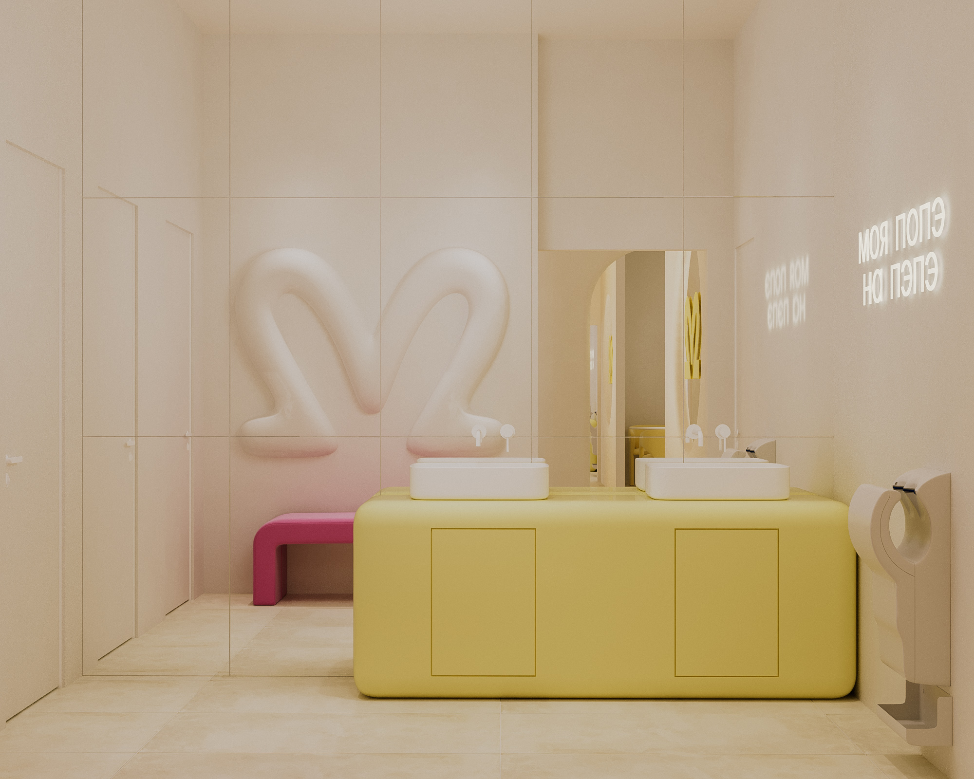 Интерьер собран как визуальная игра: округлые формы мебели и барных стоек напоминают леденцы и конфеты, стены становятся фоном для неоновых фраз-афоризмов («Начну с понедельника», «Могу себе позволить»), а элементы из стеклоблоков пропускают мягкий свет, поддерживая атмосферу прозрачности и лёгкости.