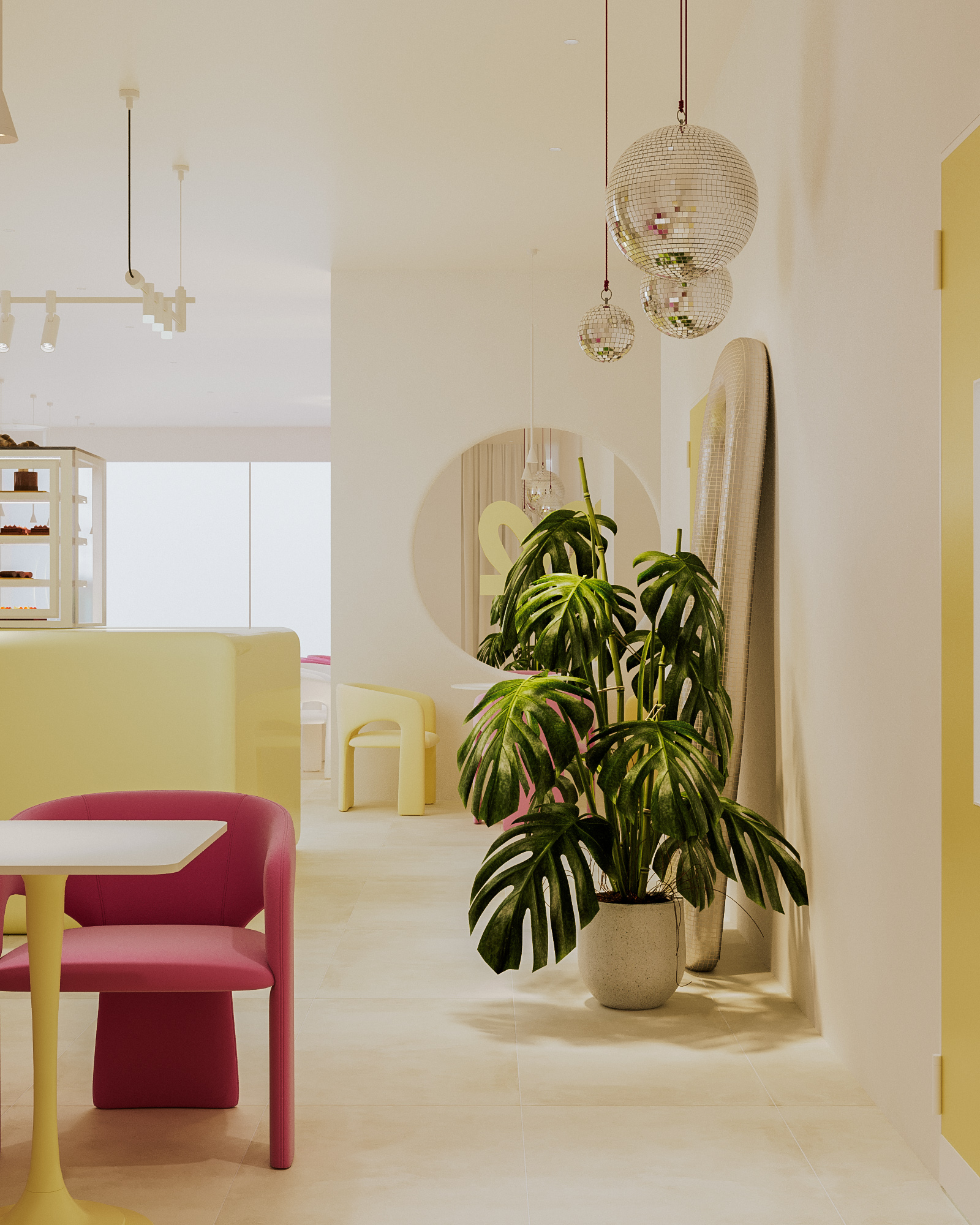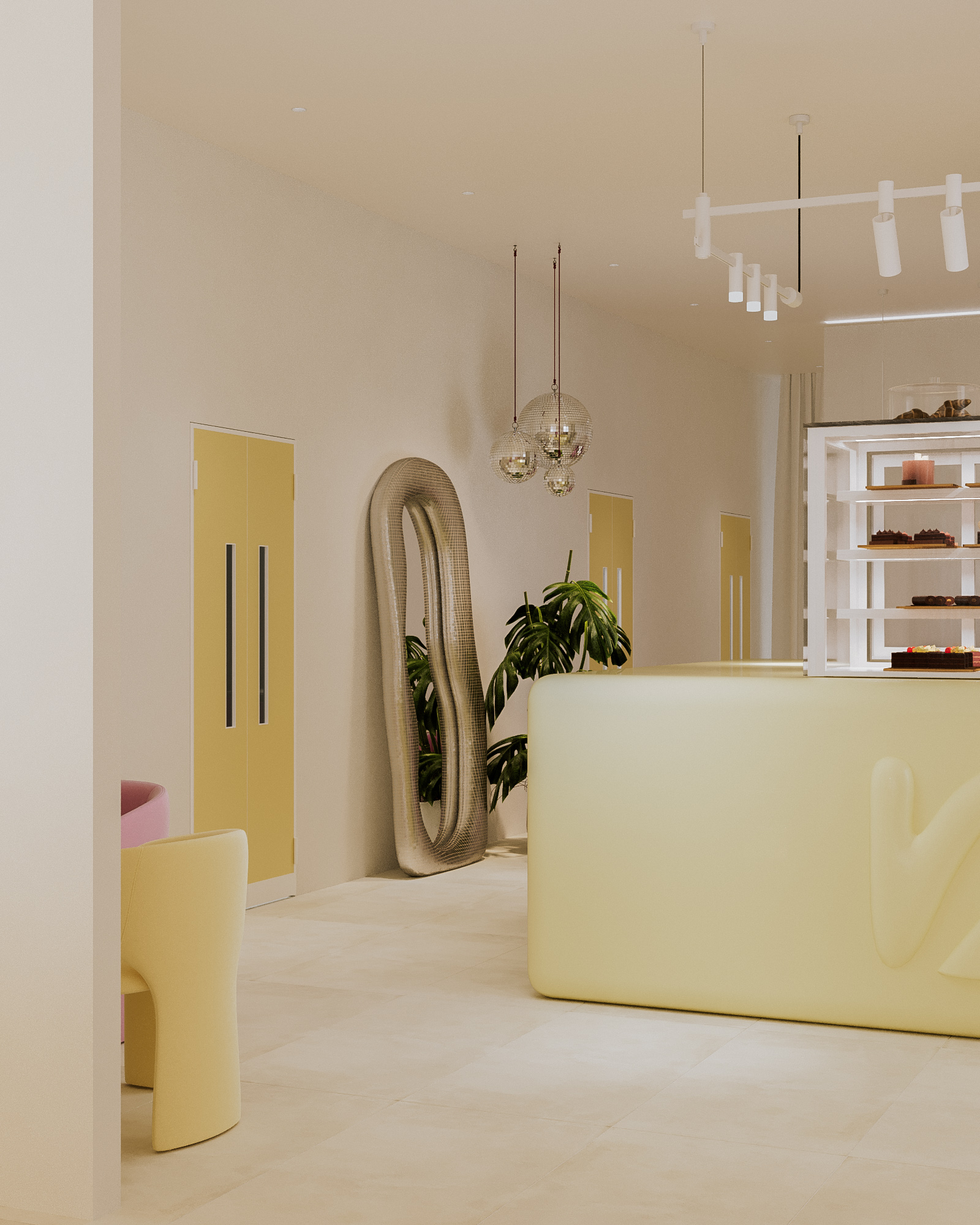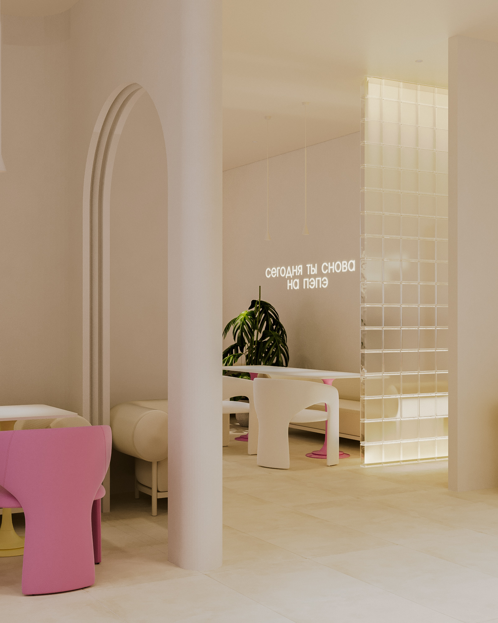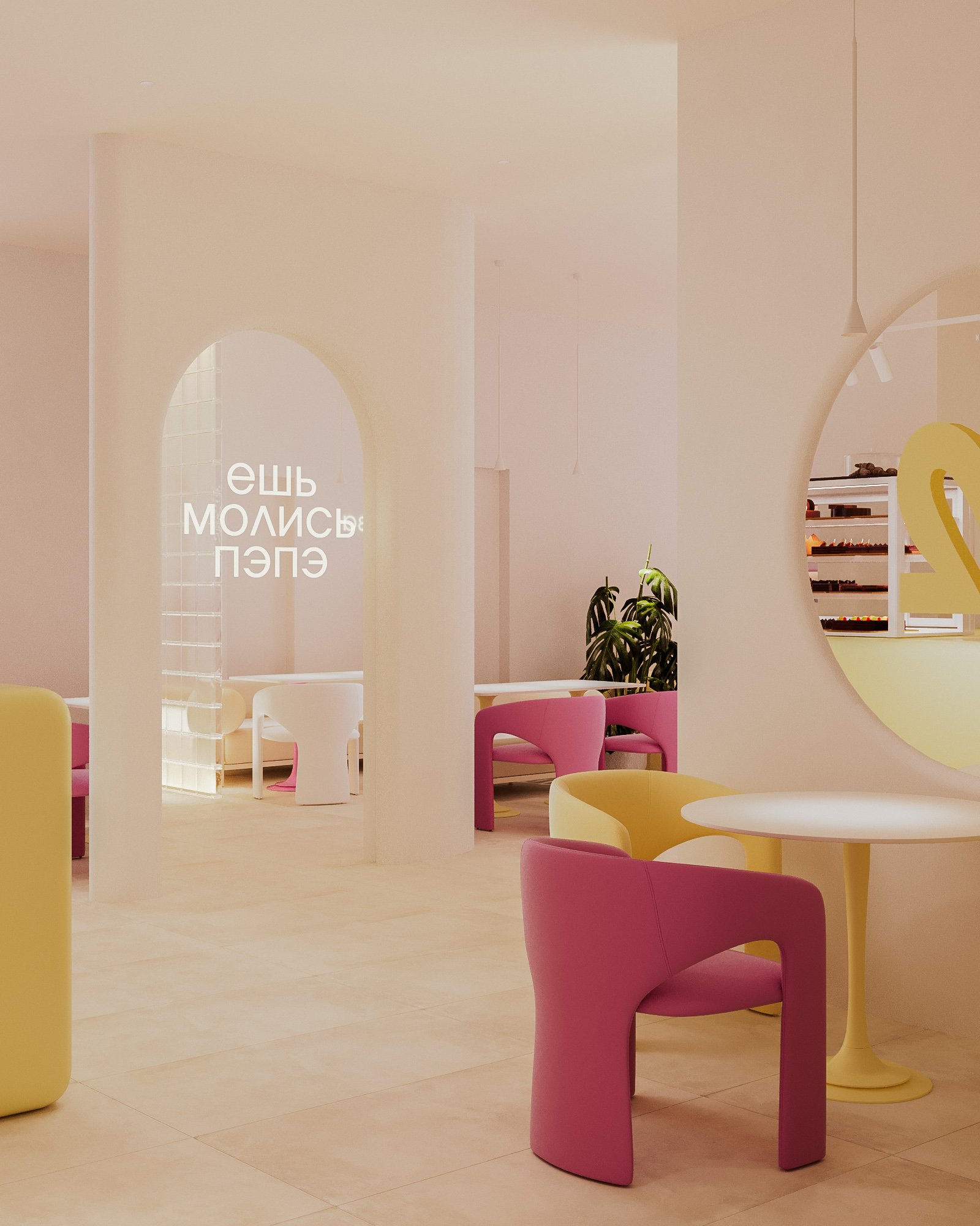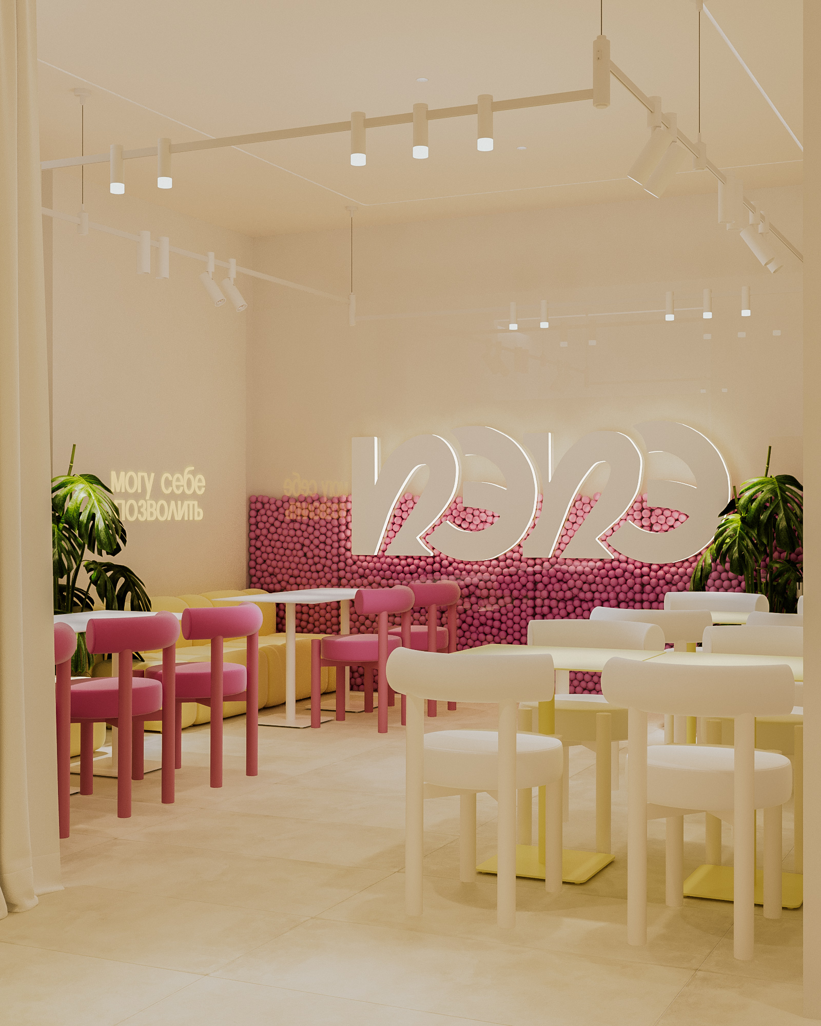Описание проекта: Кафе ПЭПЭ — это манифест лёгкости и иронии, где дизайн работает на создание позитивного опыта с первой секунды. Пространство выстроено на мягкой палитре пастели: лимонно-жёлтые поверхности и насыщенный розовый в креслах, шторах и акцентах создают ощущение жвачки детства, игривости и свободы.