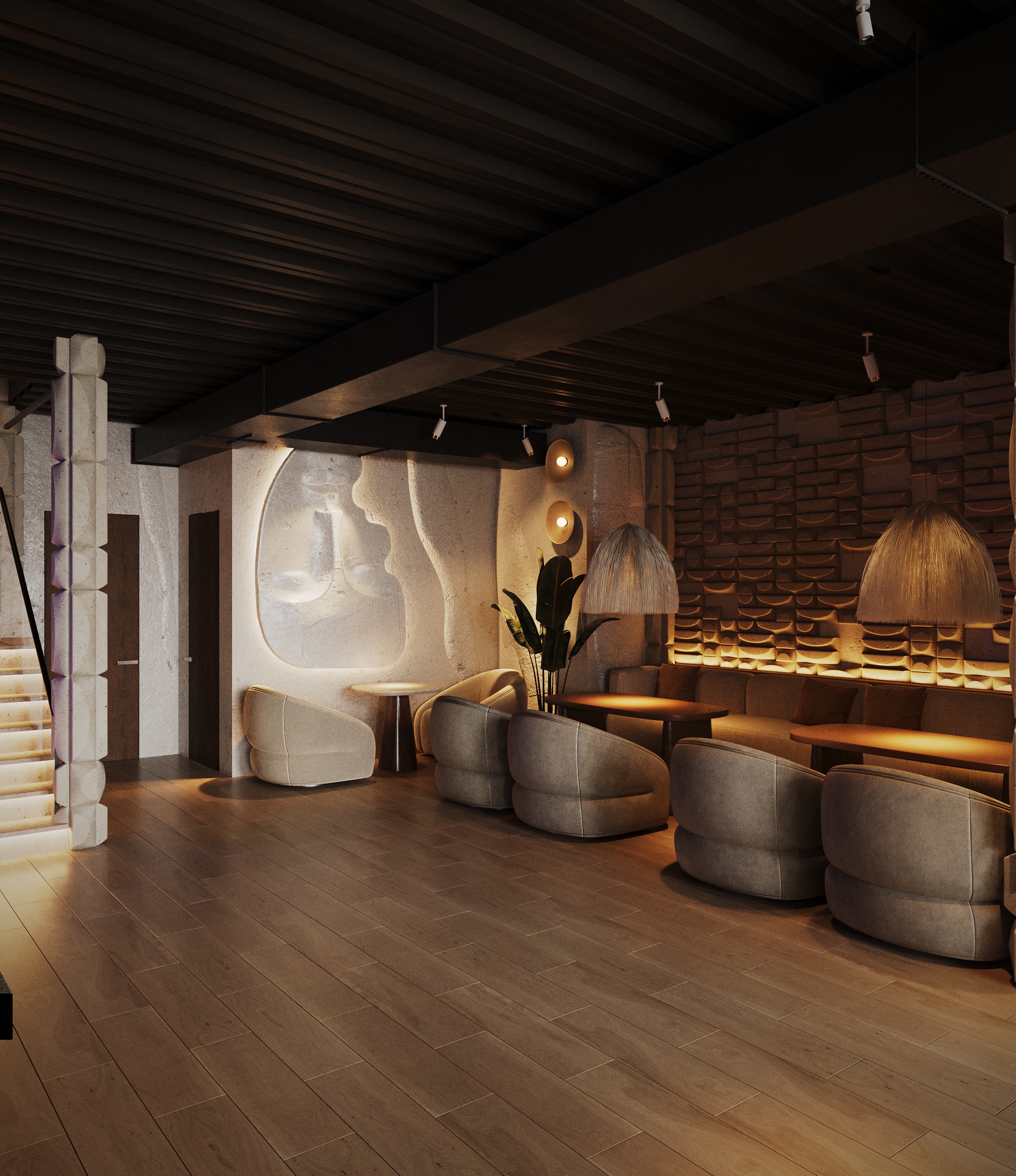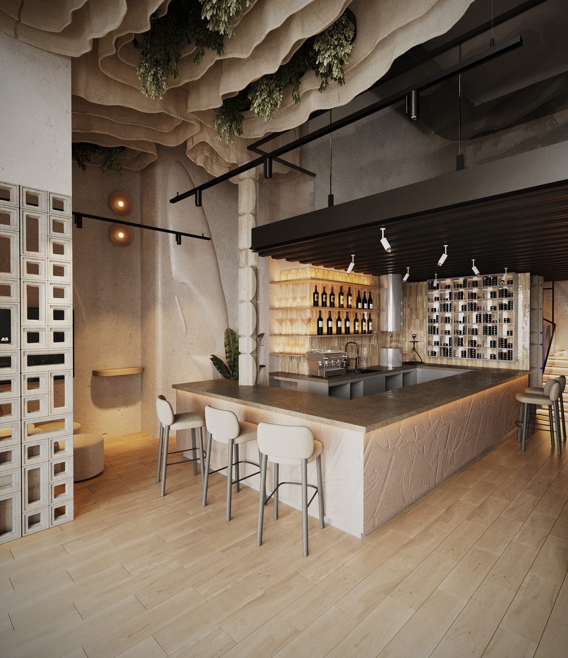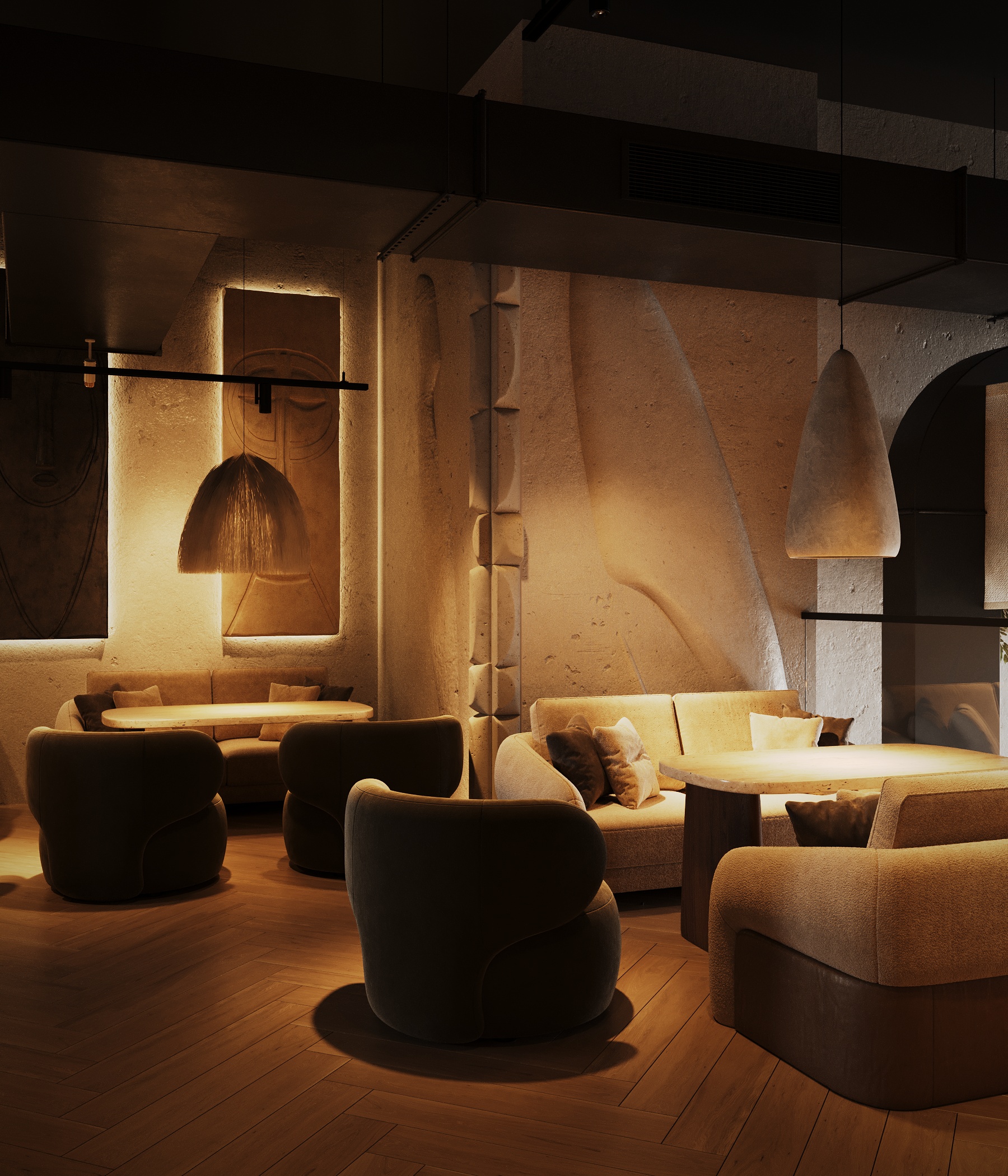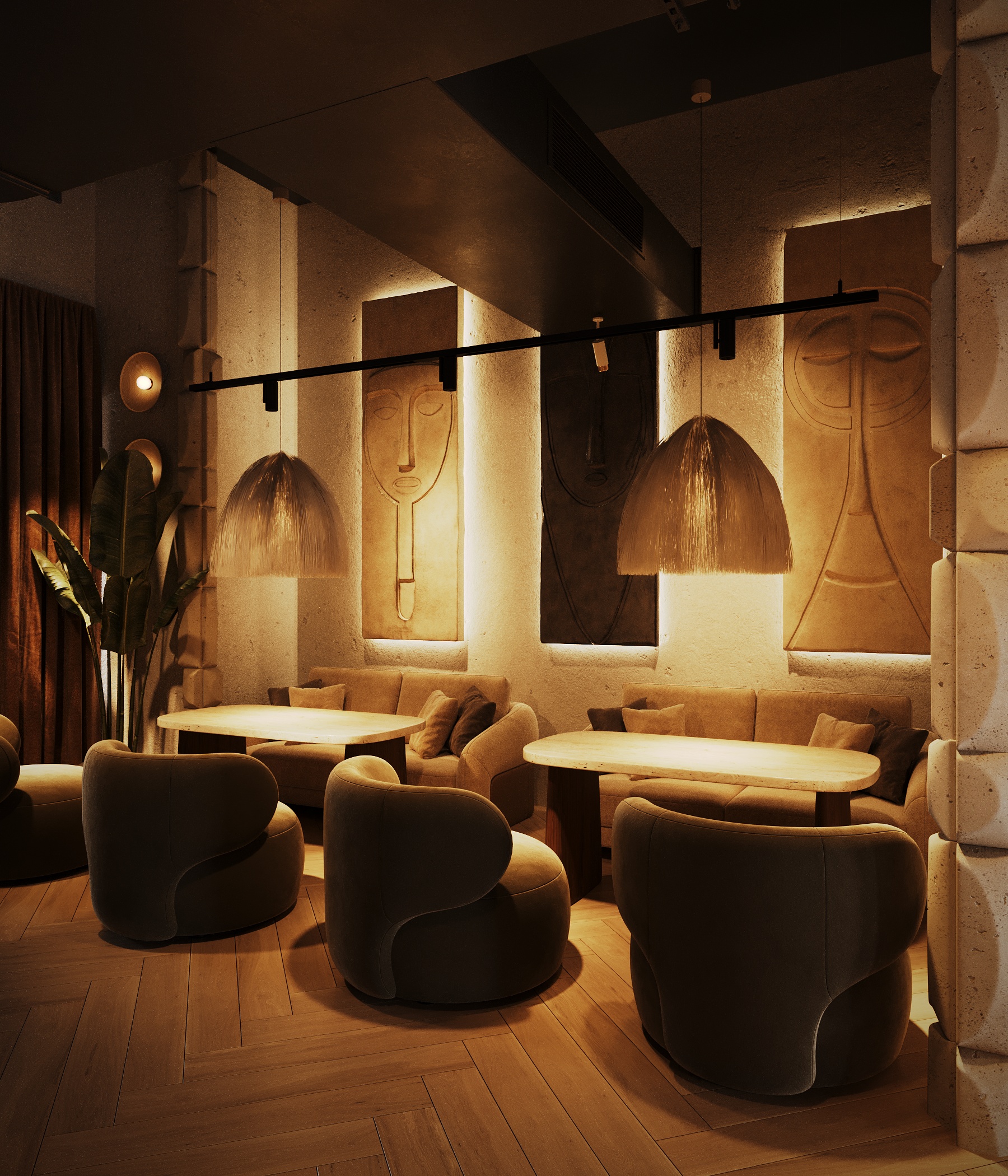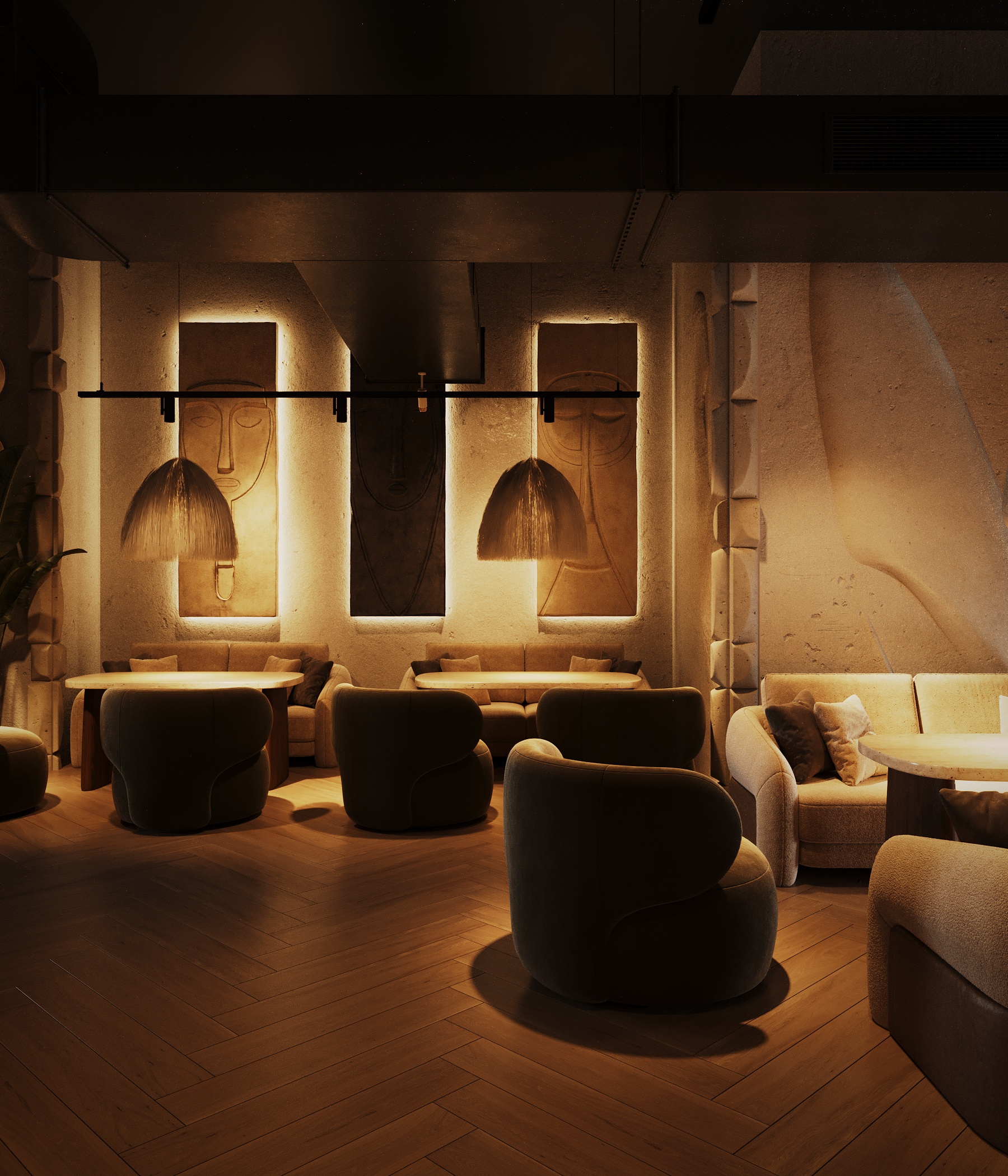 Описание проекта: Мы разработали дизайн кальянной SF Lounge&Bar — атмосферное пространство с мягкой lounge-эстетикой и выразительной архитектурой интерьера. Основой концепции стали фактурные стены, скульптурные панели с абстрактными лицами и тёплый приглушённый свет, создающий камерную и расслабляющую атмосферу. Пространство разделено на несколько зон: барную стойку, мягкие диванные посадки и более приватные lounge-уголки. Натуральные оттенки, текстильные потолочные элементы и декоративные растения делают интерьер живым и уютным.