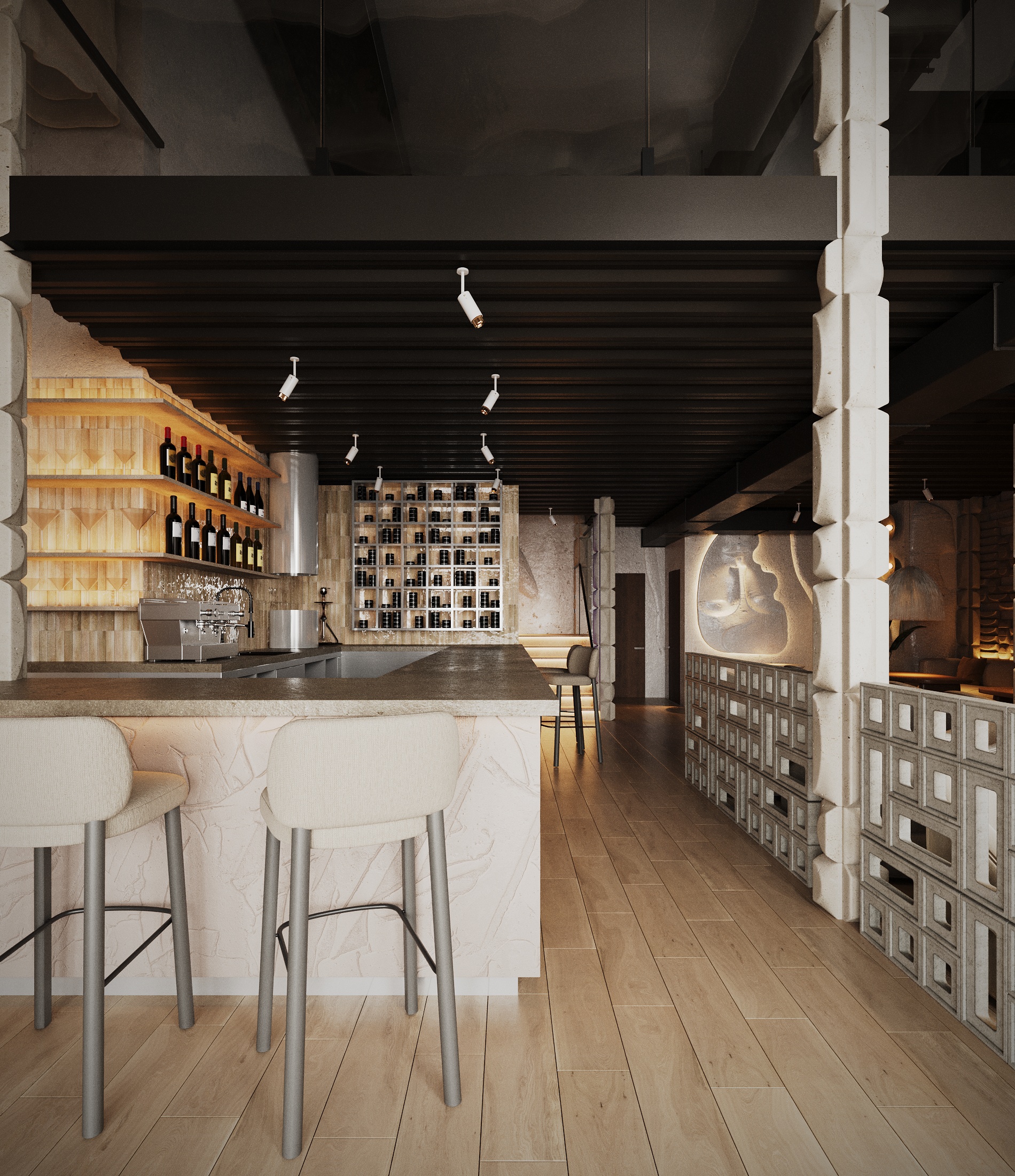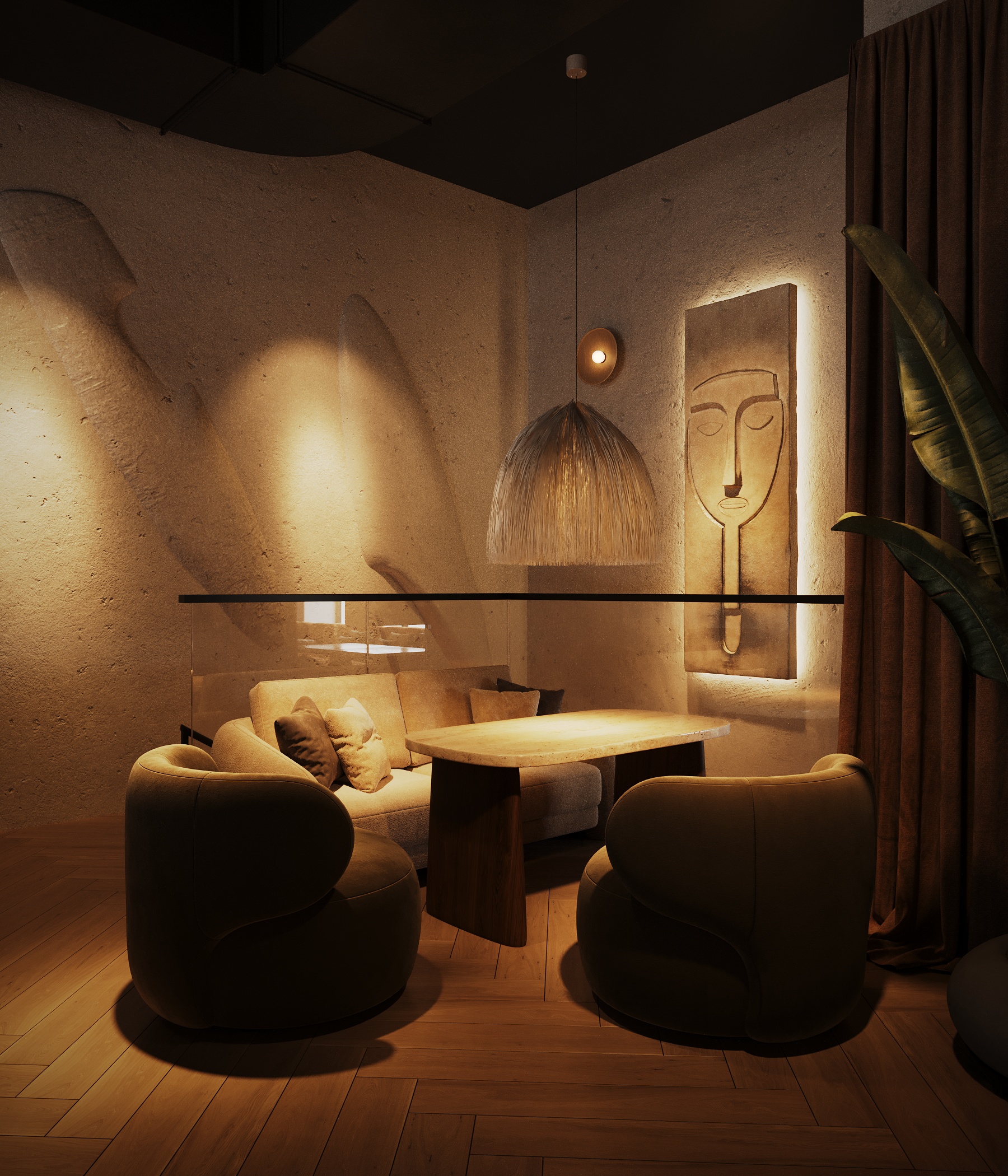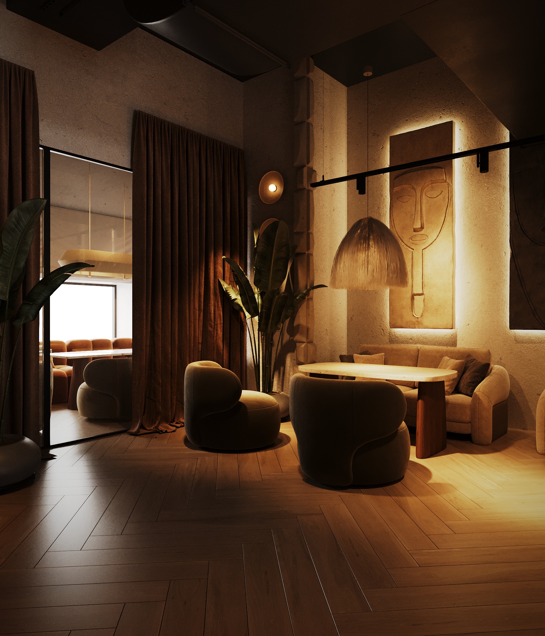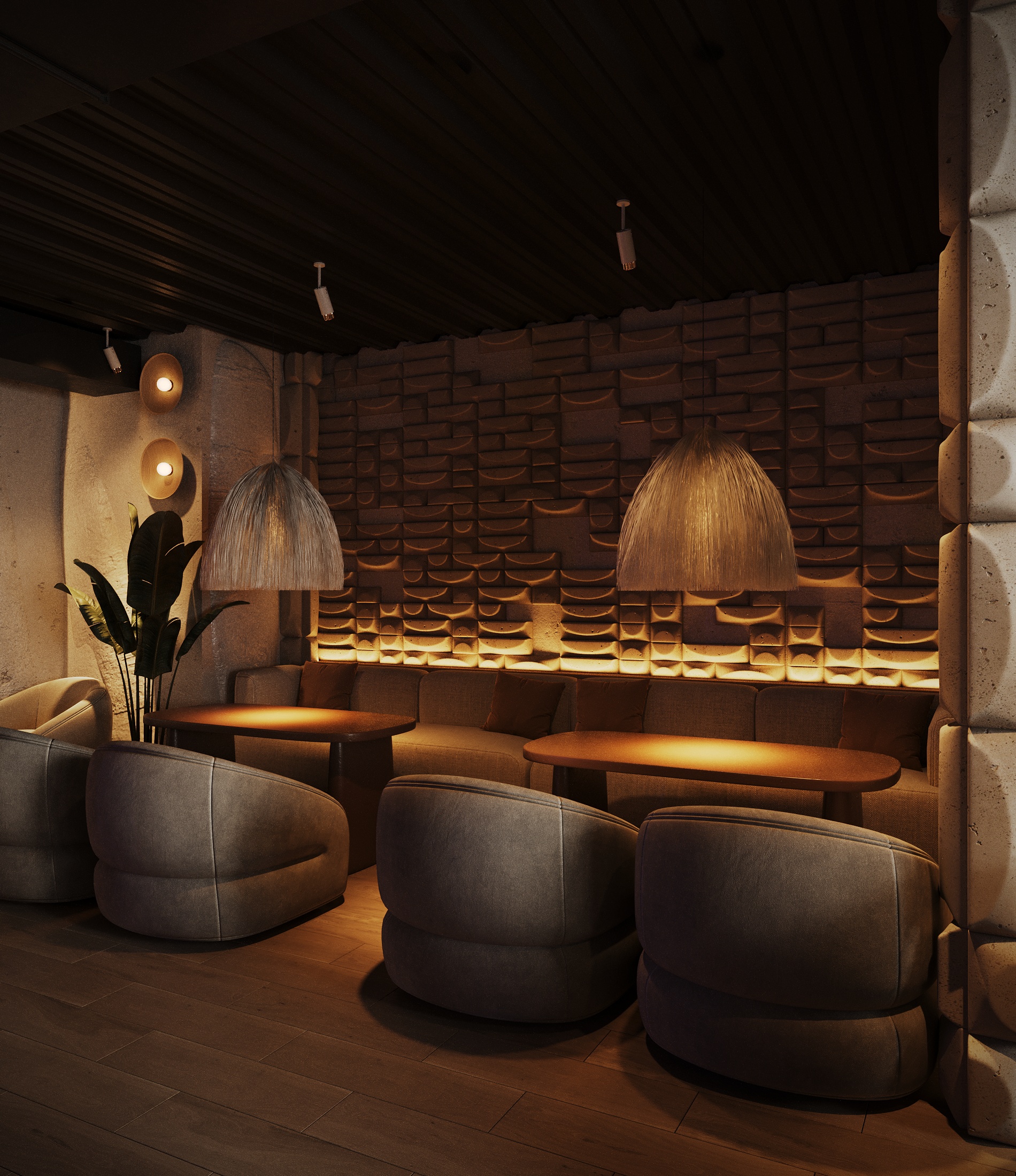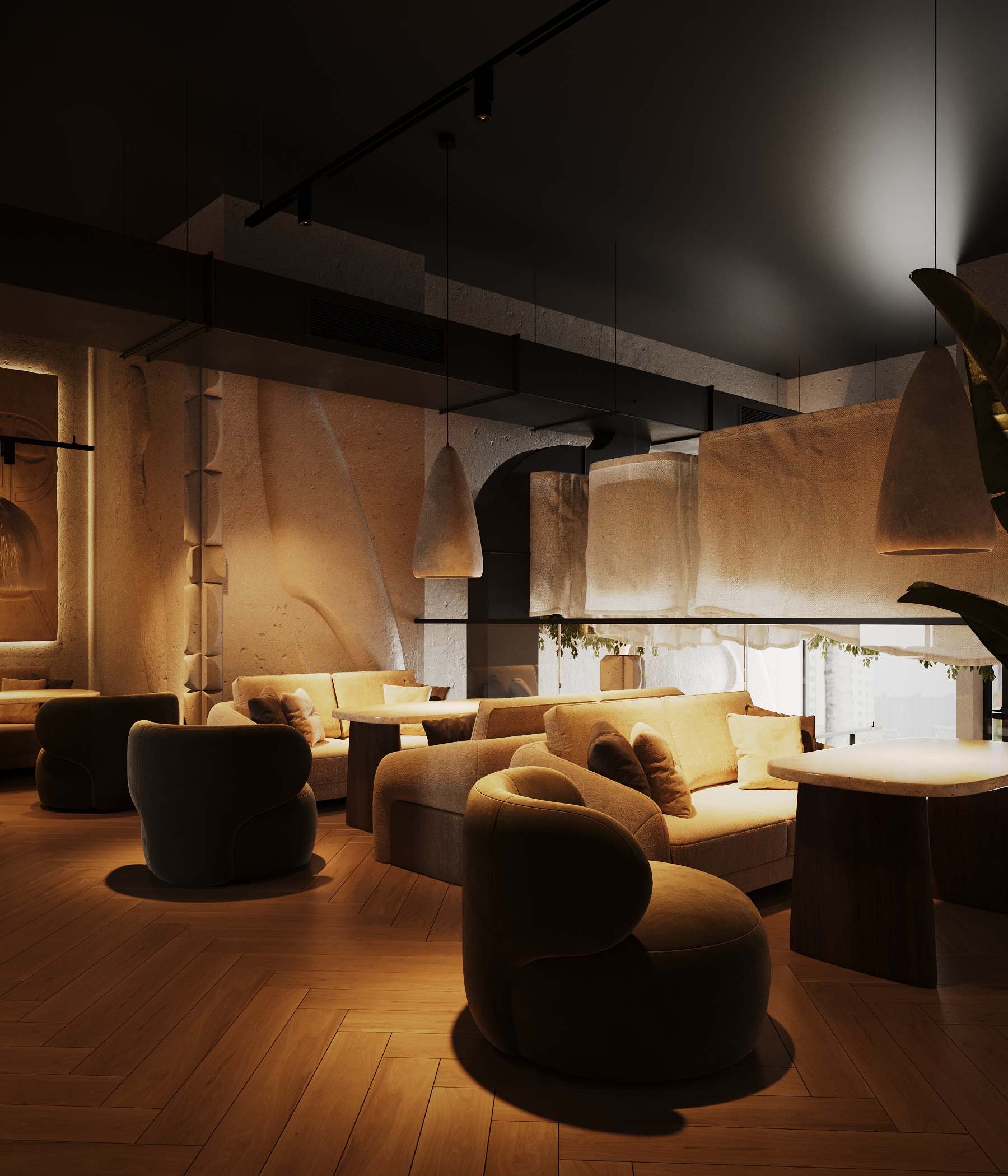 Описание проекта: Мы разработали дизайн кальянной SF Lounge&Bar — атмосферное пространство с мягкой lounge-эстетикой и выразительной архитектурой интерьера. Основой концепции стали фактурные стены, скульптурные панели с абстрактными лицами и тёплый приглушённый свет, создающий камерную и расслабляющую атмосферу. Пространство разделено на несколько зон: барную стойку, мягкие диванные посадки и более приватные lounge-уголки. Натуральные оттенки, текстильные потолочные элементы и декоративные растения делают интерьер живым и уютным.
