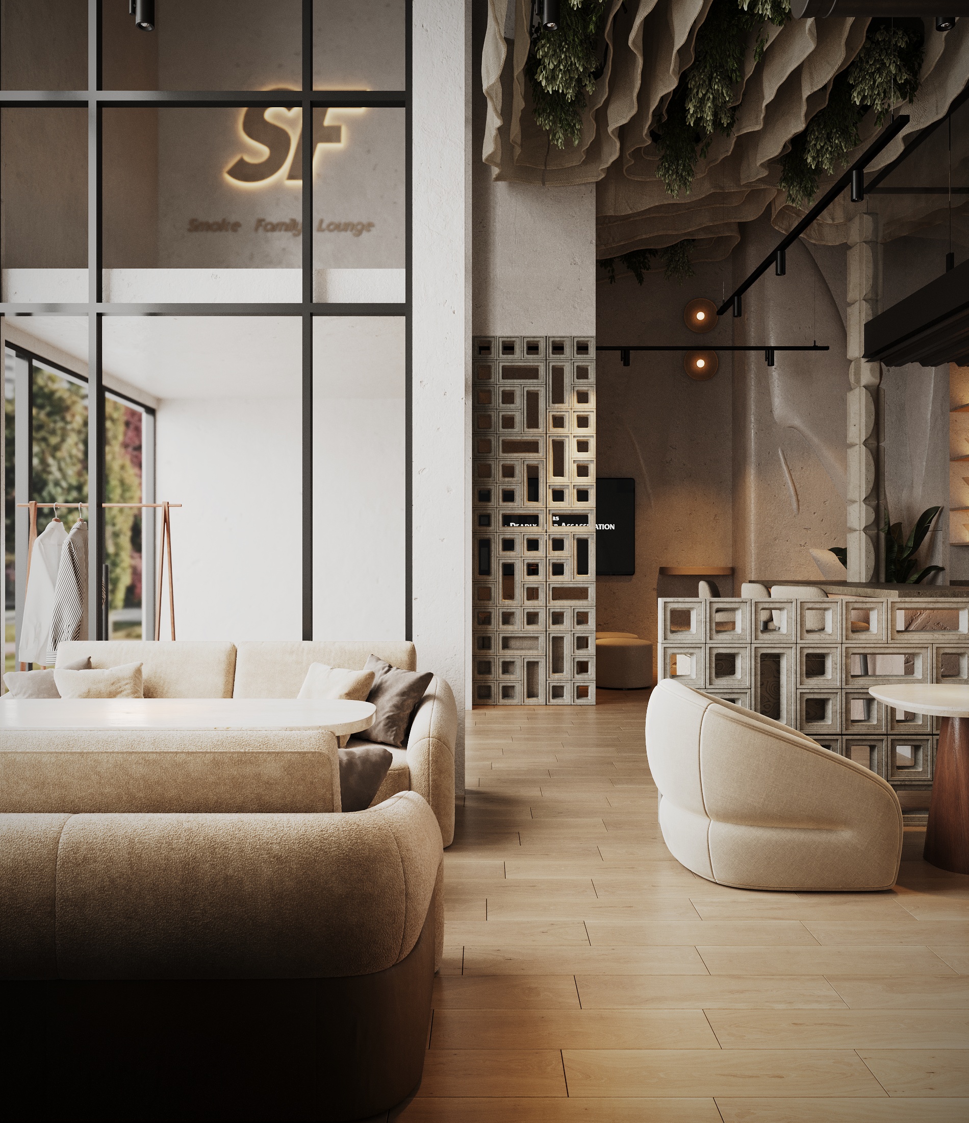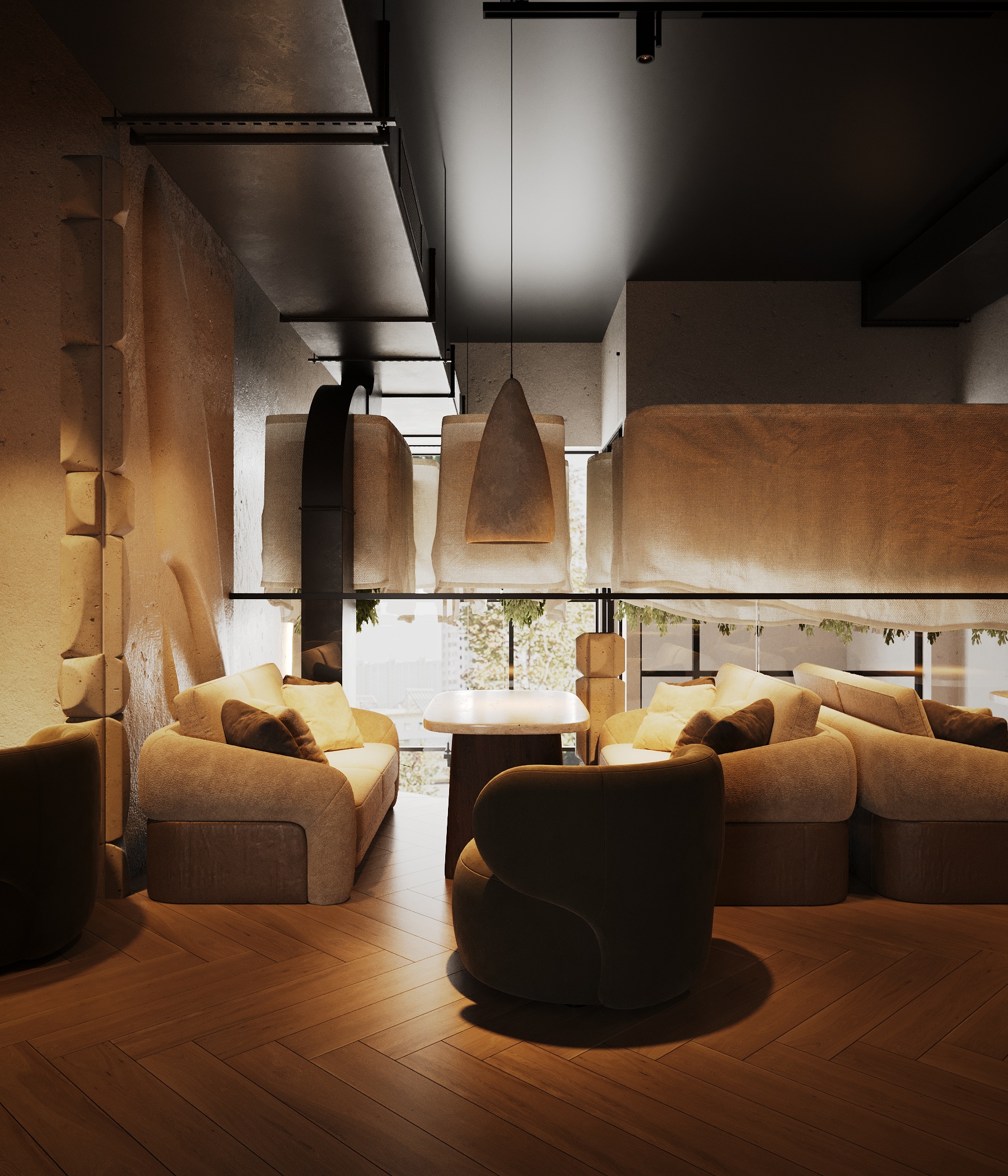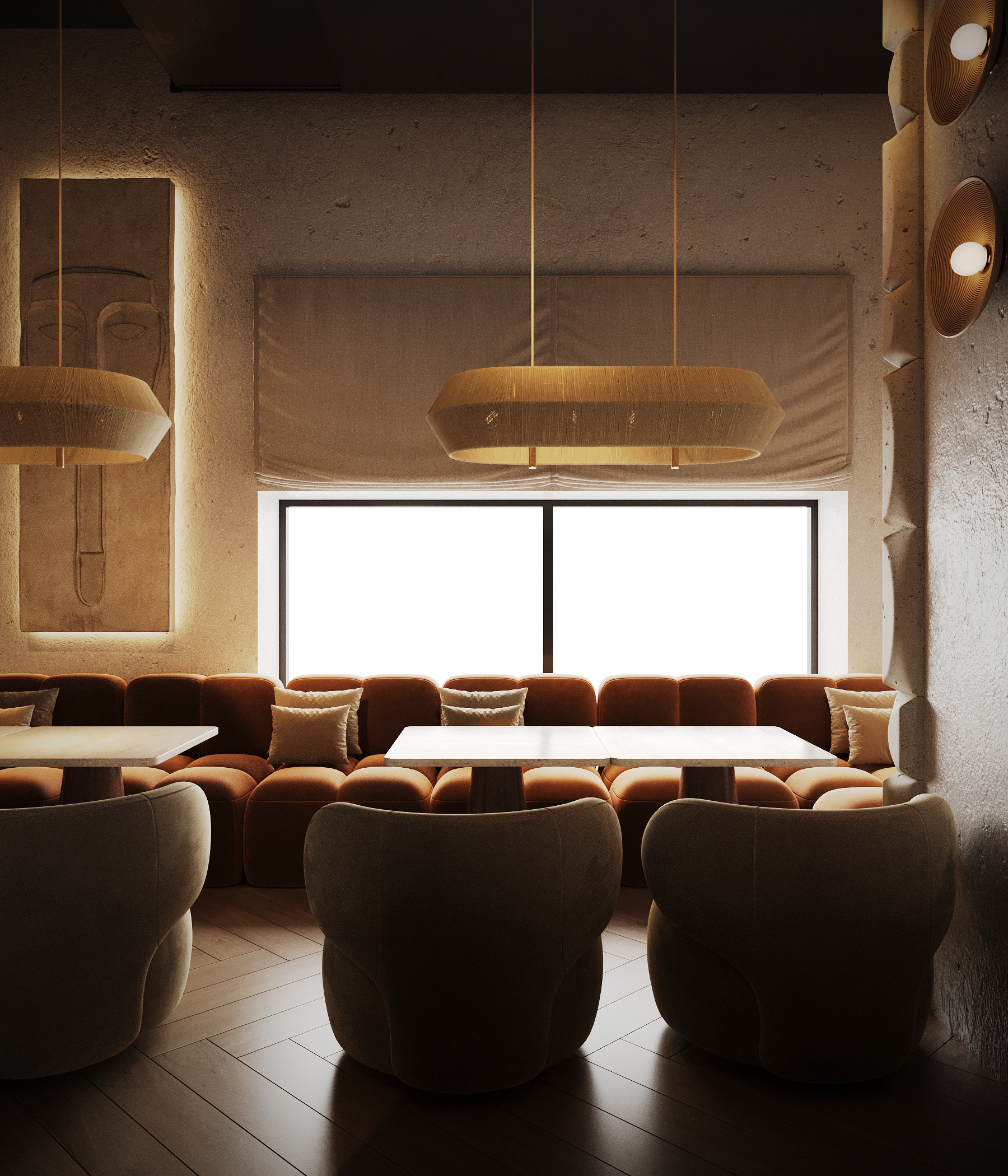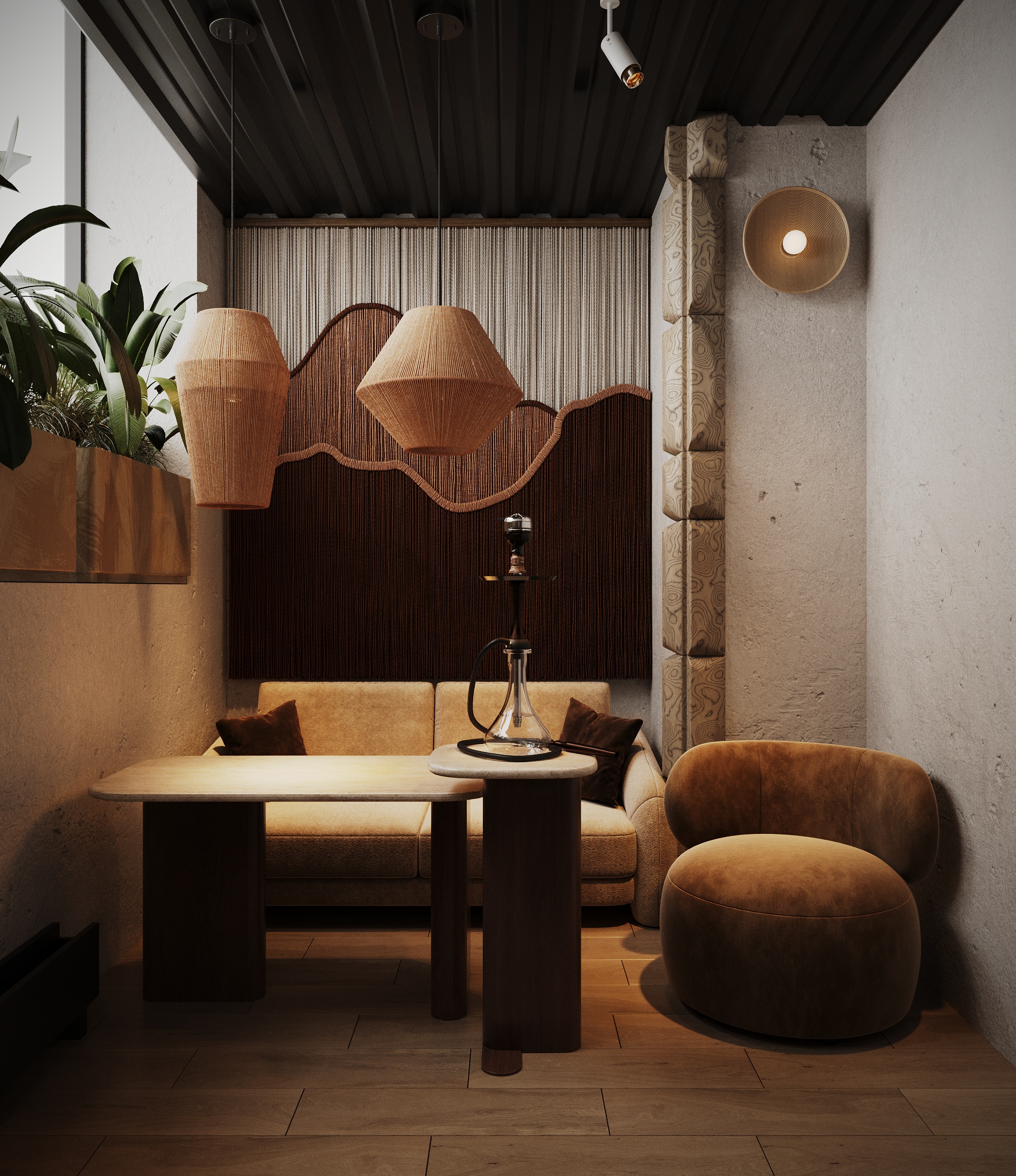 Описание проекта: Мы разработали дизайн кальянной SF Lounge&Bar — атмосферное пространство с мягкой lounge-эстетикой и выразительной архитектурой интерьера. Основой концепции стали фактурные стены, скульптурные панели с абстрактными лицами и тёплый приглушённый свет, создающий камерную и расслабляющую атмосферу. Пространство разделено на несколько зон: барную стойку, мягкие диванные посадки и более приватные lounge-уголки. Натуральные оттенки, текстильные потолочные элементы и декоративные растения делают интерьер живым и уютным.
