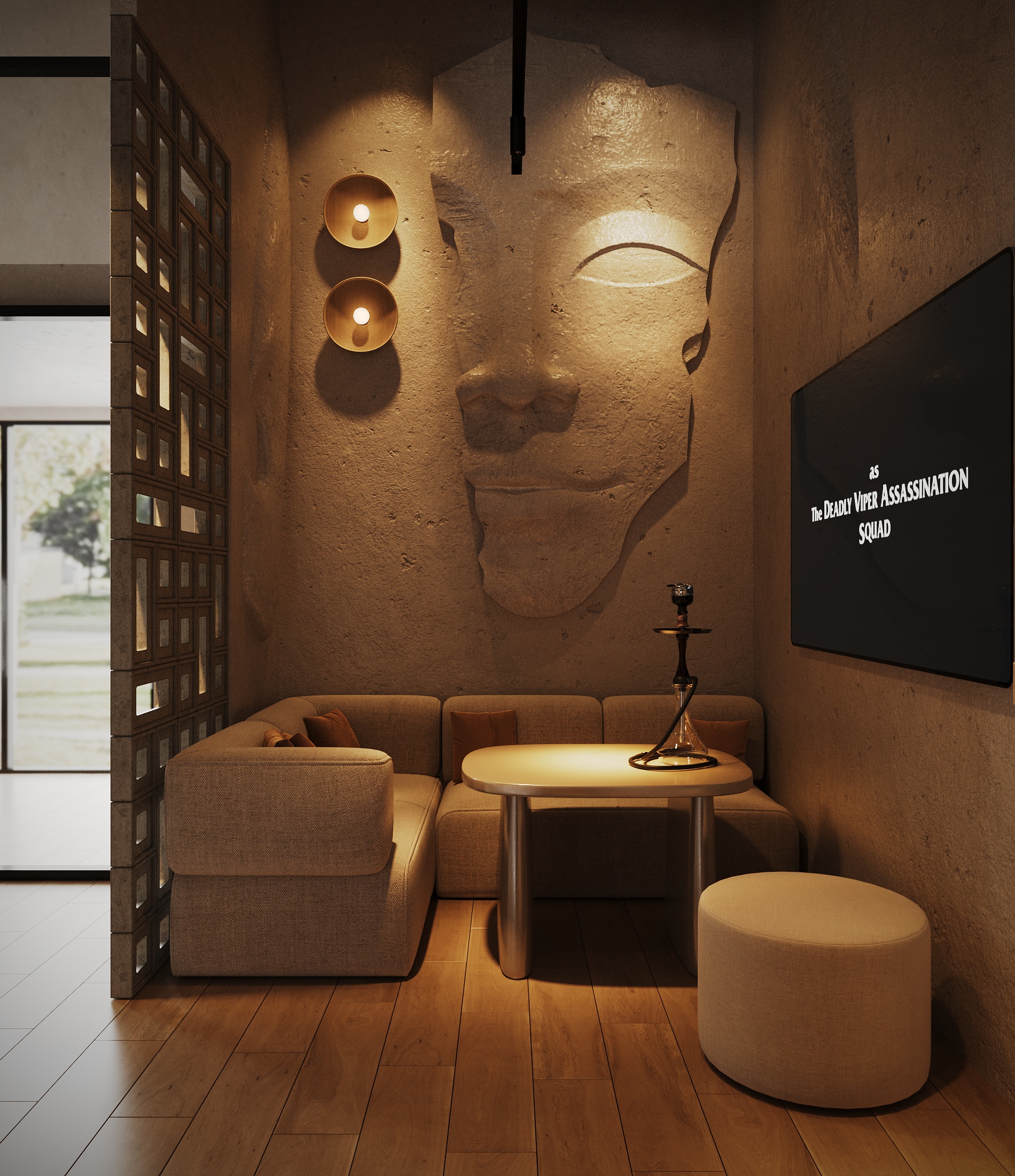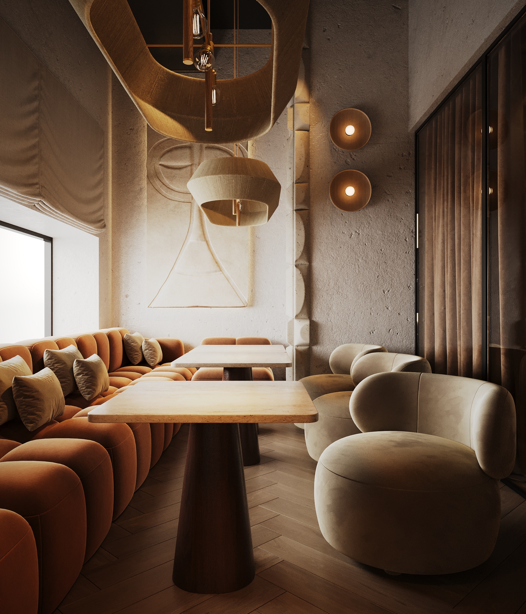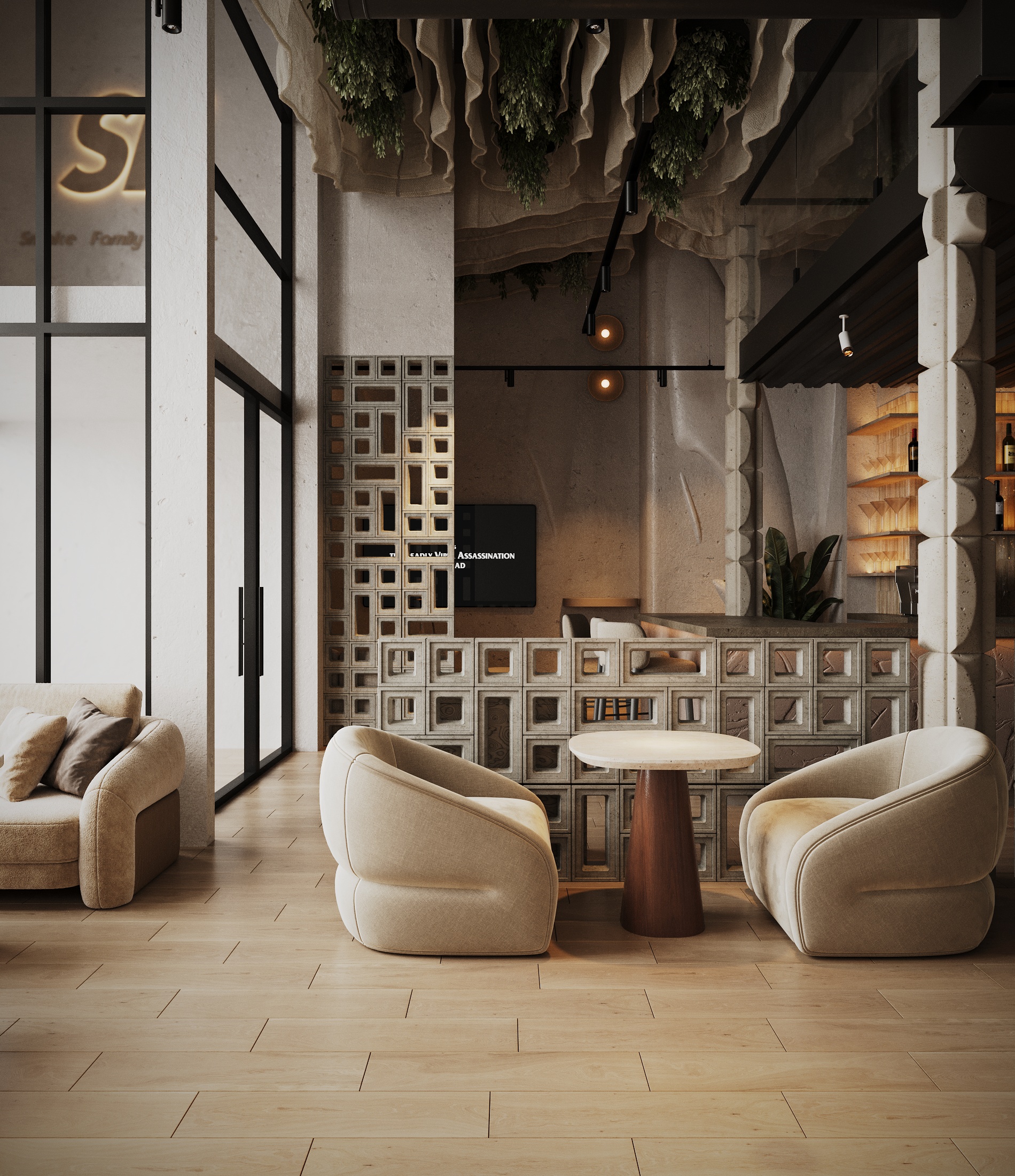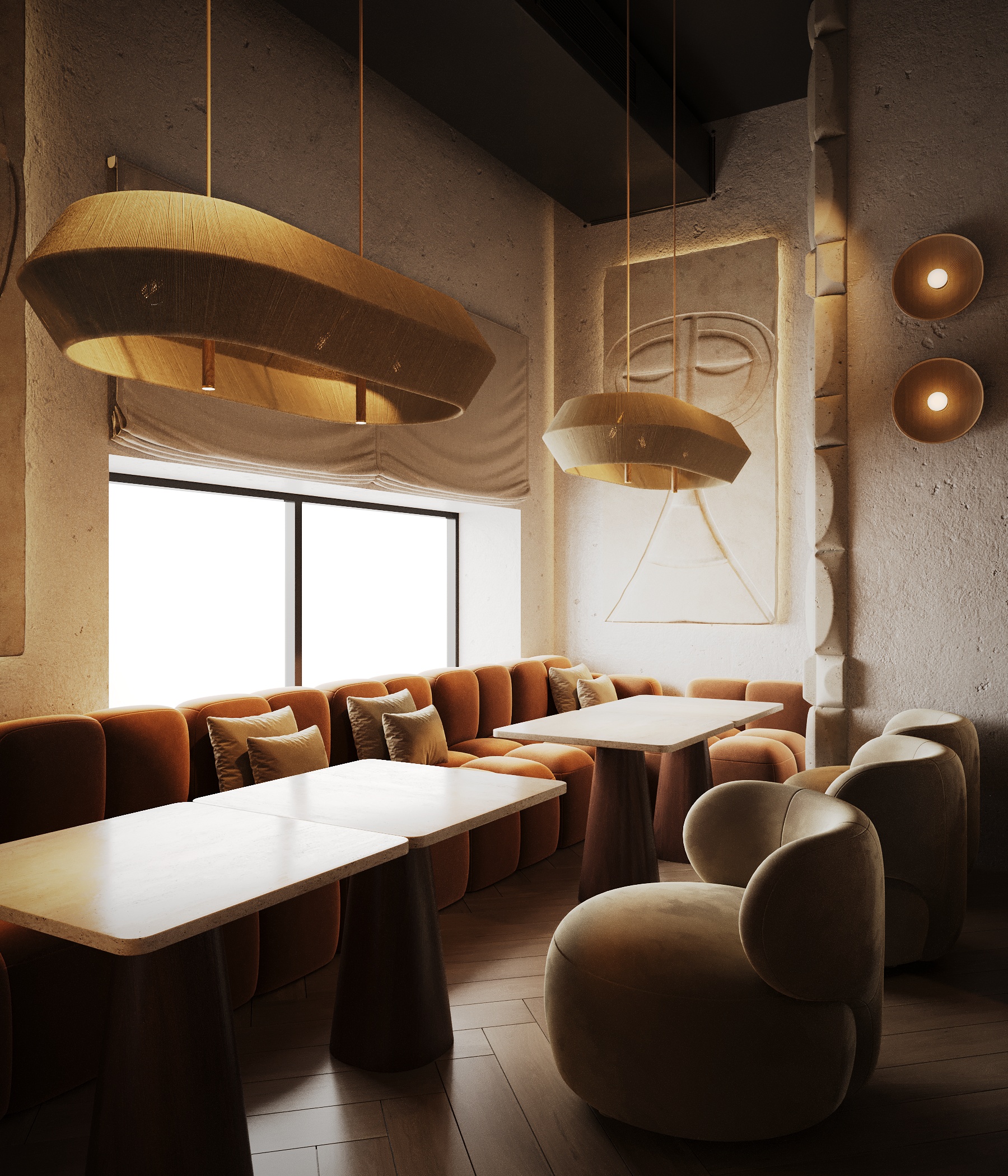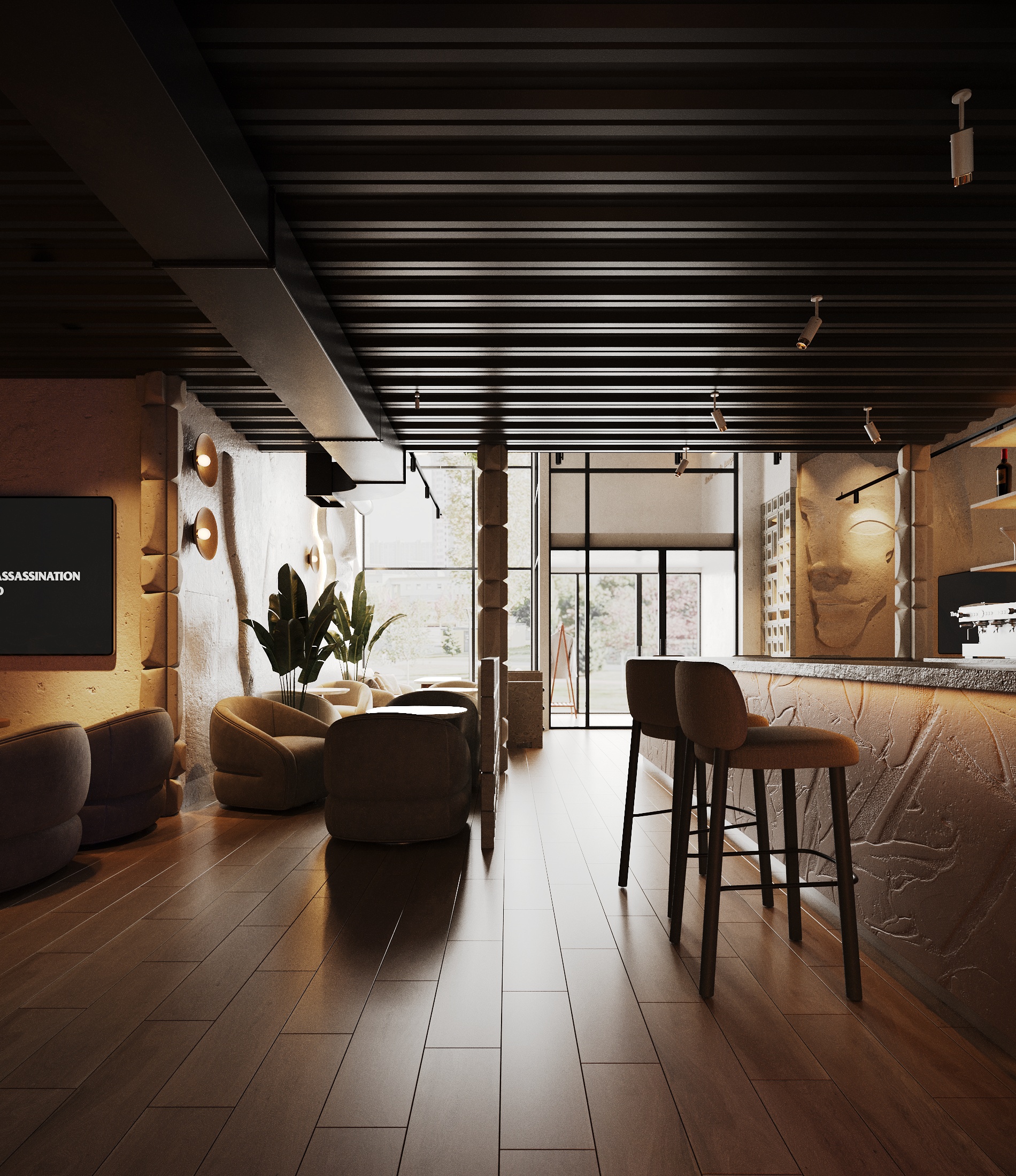 Описание проекта: Мы разработали дизайн кальянной SF Lounge&Bar — атмосферное пространство с мягкой lounge-эстетикой и выразительной архитектурой интерьера. Основой концепции стали фактурные стены, скульптурные панели с абстрактными лицами и тёплый приглушённый свет, создающий камерную и расслабляющую атмосферу. Пространство разделено на несколько зон: барную стойку, мягкие диванные посадки и более приватные lounge-уголки. Натуральные оттенки, текстильные потолочные элементы и декоративные растения делают интерьер живым и уютным.