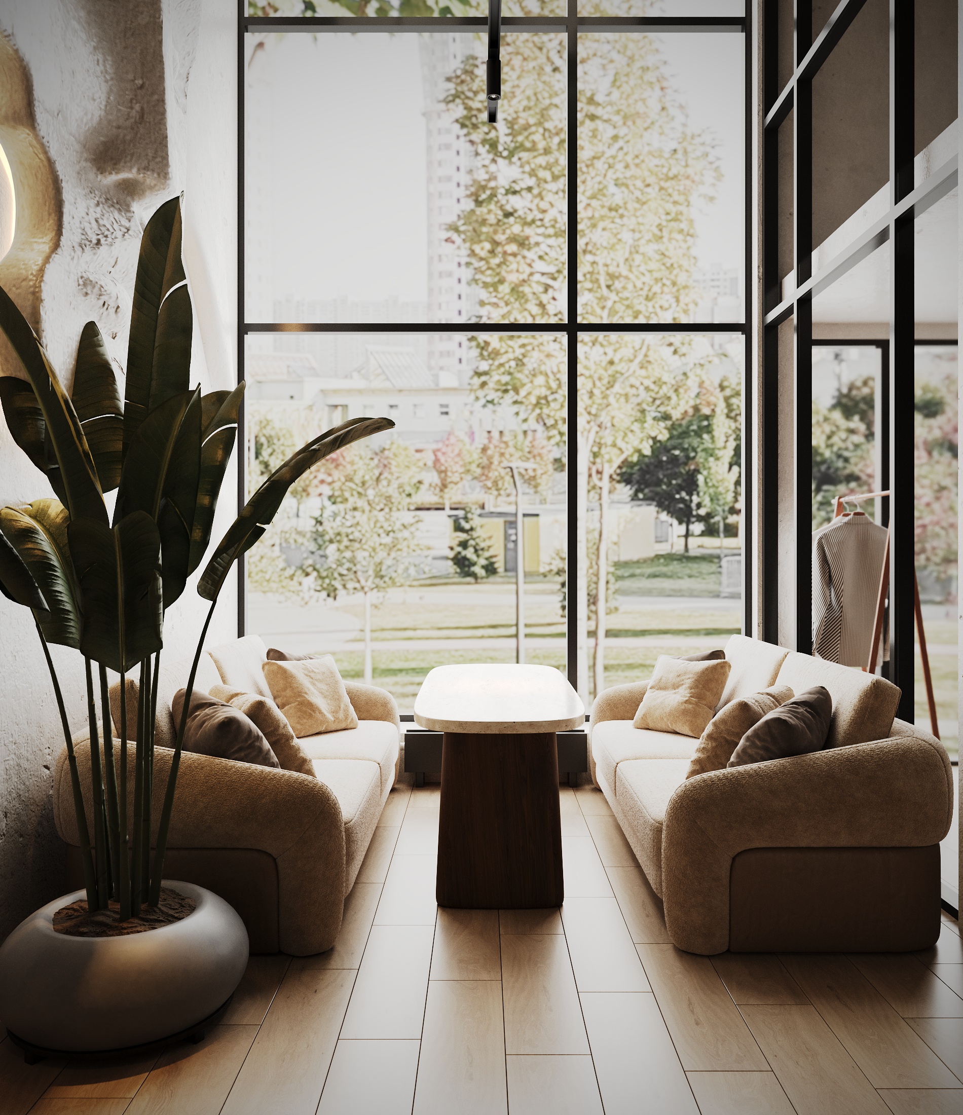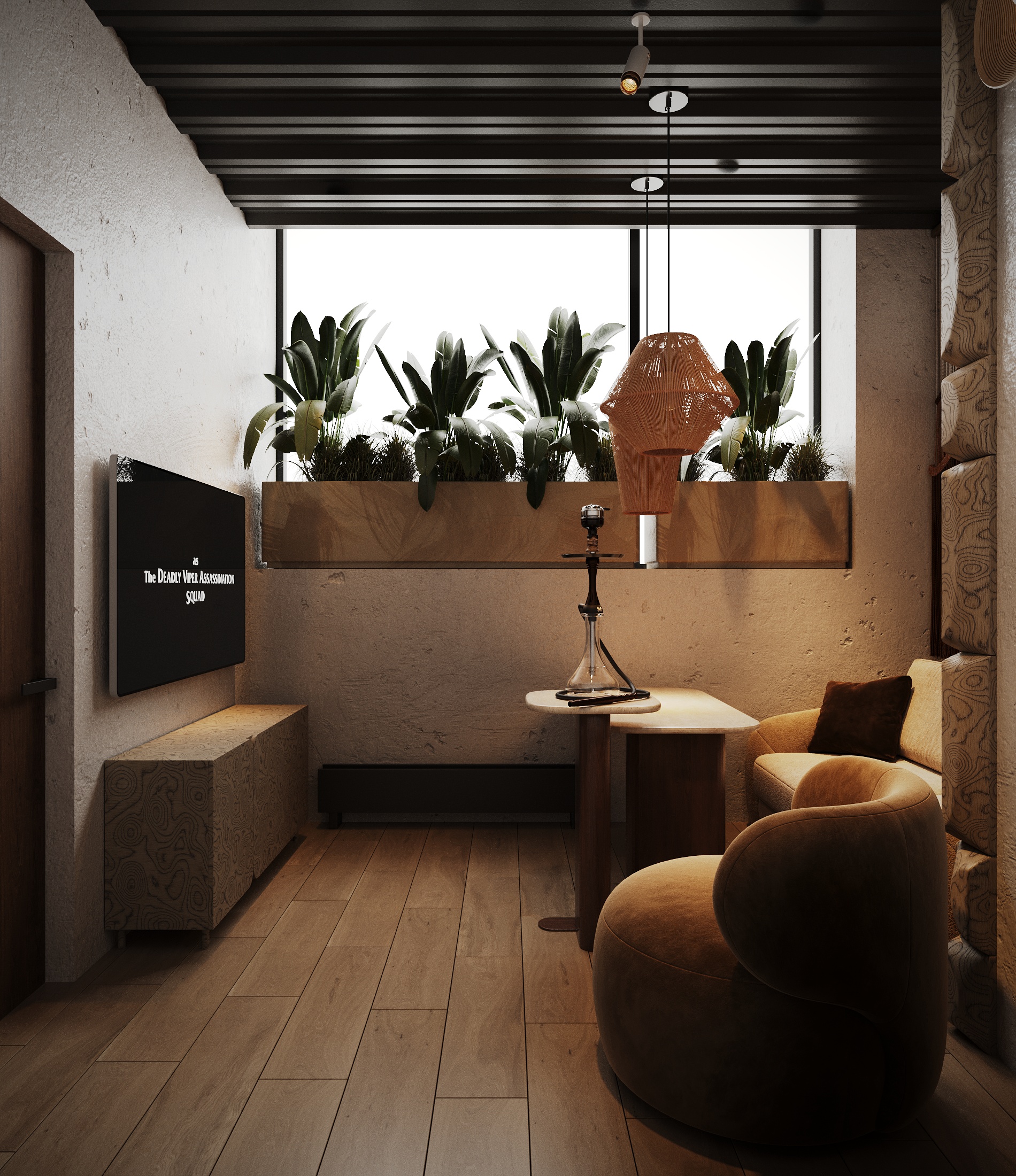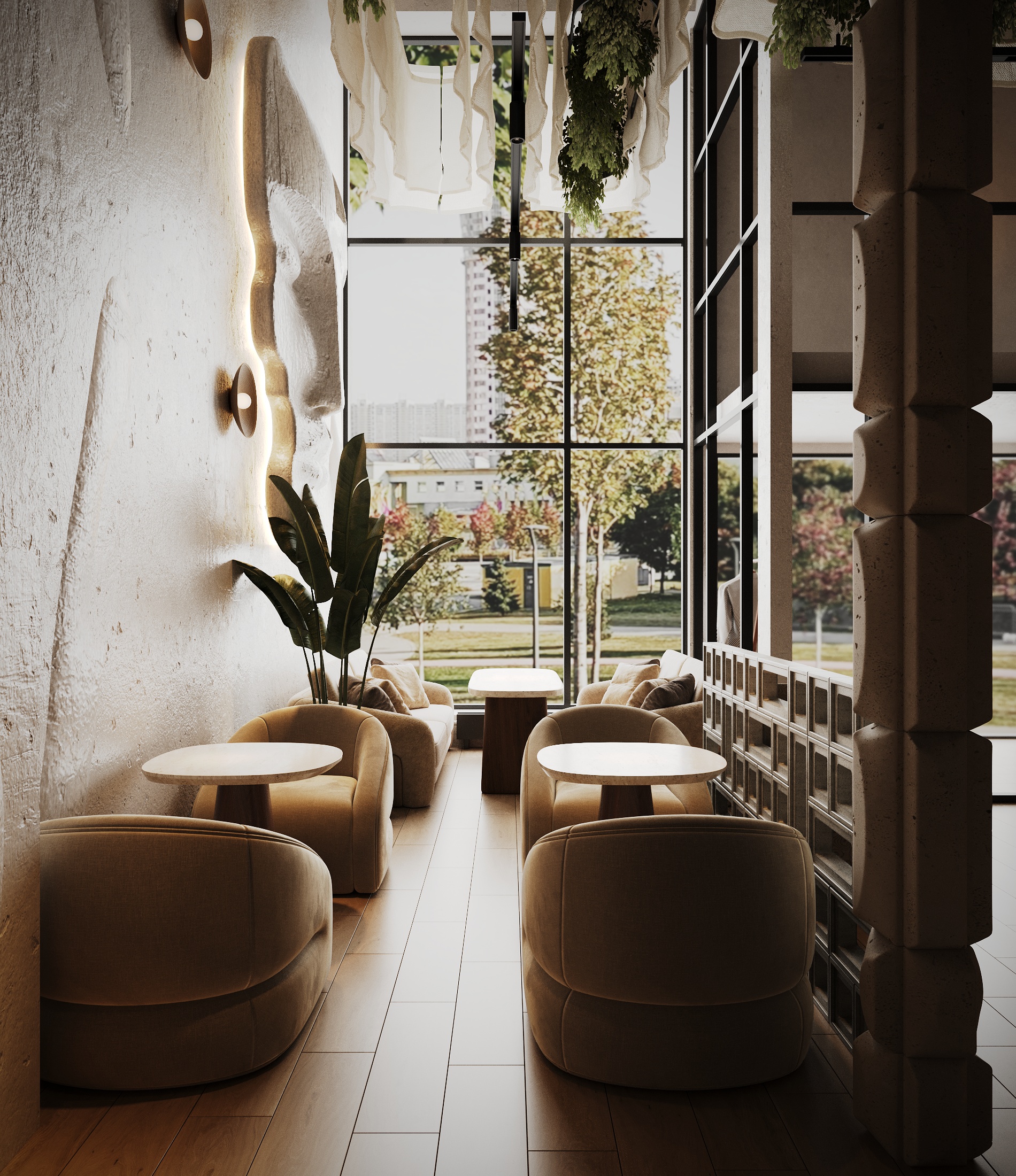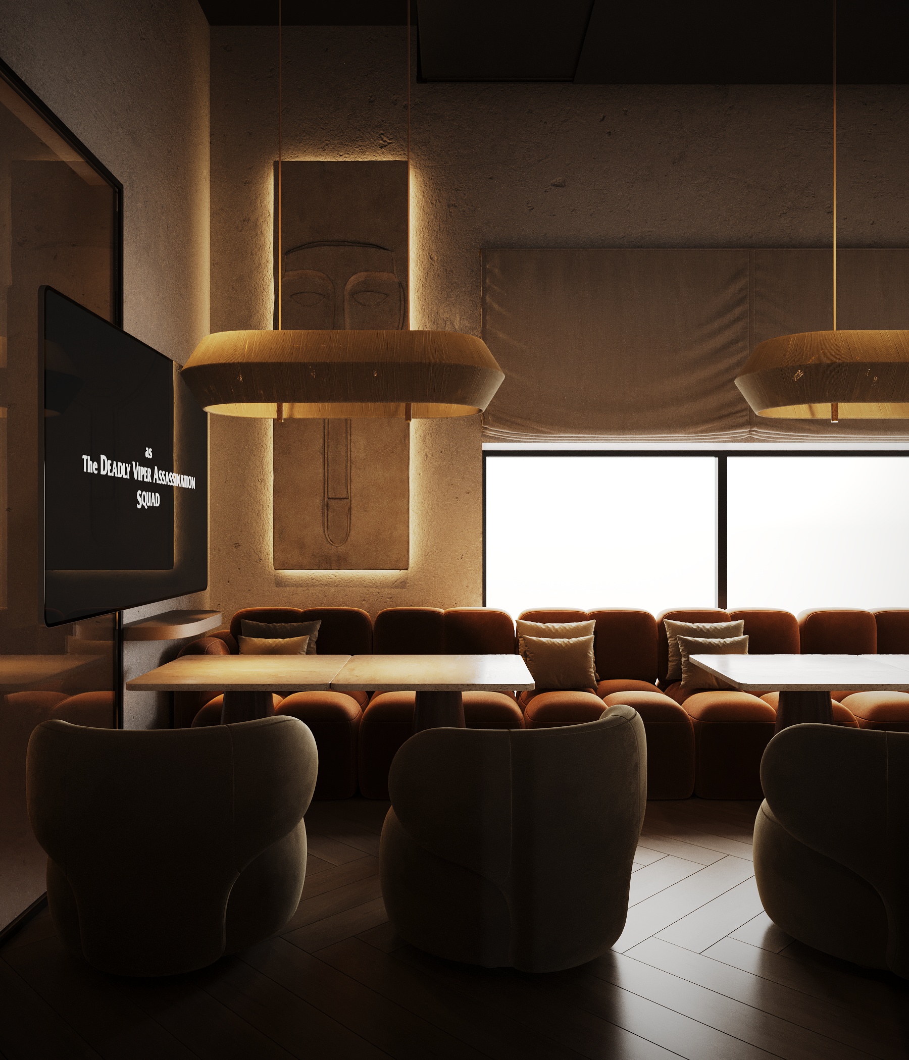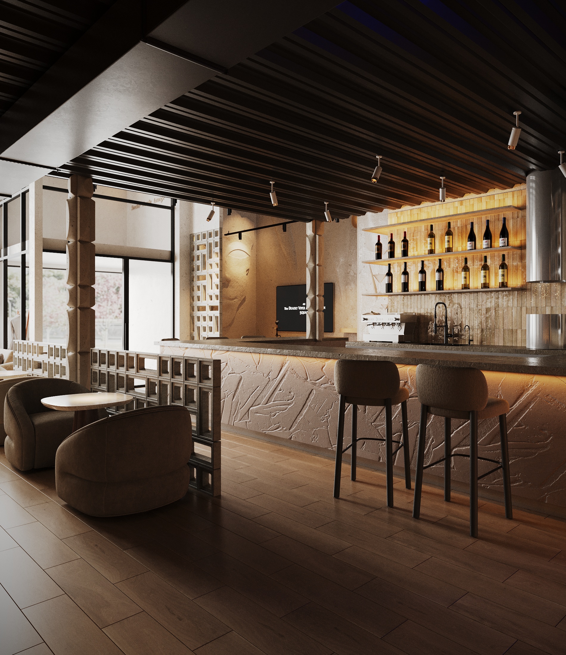 Описание проекта: Мы разработали дизайн кальянной SF Lounge&Bar — атмосферное пространство с мягкой lounge-эстетикой и выразительной архитектурой интерьера. Основой концепции стали фактурные стены, скульптурные панели с абстрактными лицами и тёплый приглушённый свет, создающий камерную и расслабляющую атмосферу. Пространство разделено на несколько зон: барную стойку, мягкие диванные посадки и более приватные lounge-уголки. Натуральные оттенки, текстильные потолочные элементы и декоративные растения делают интерьер живым и уютным.