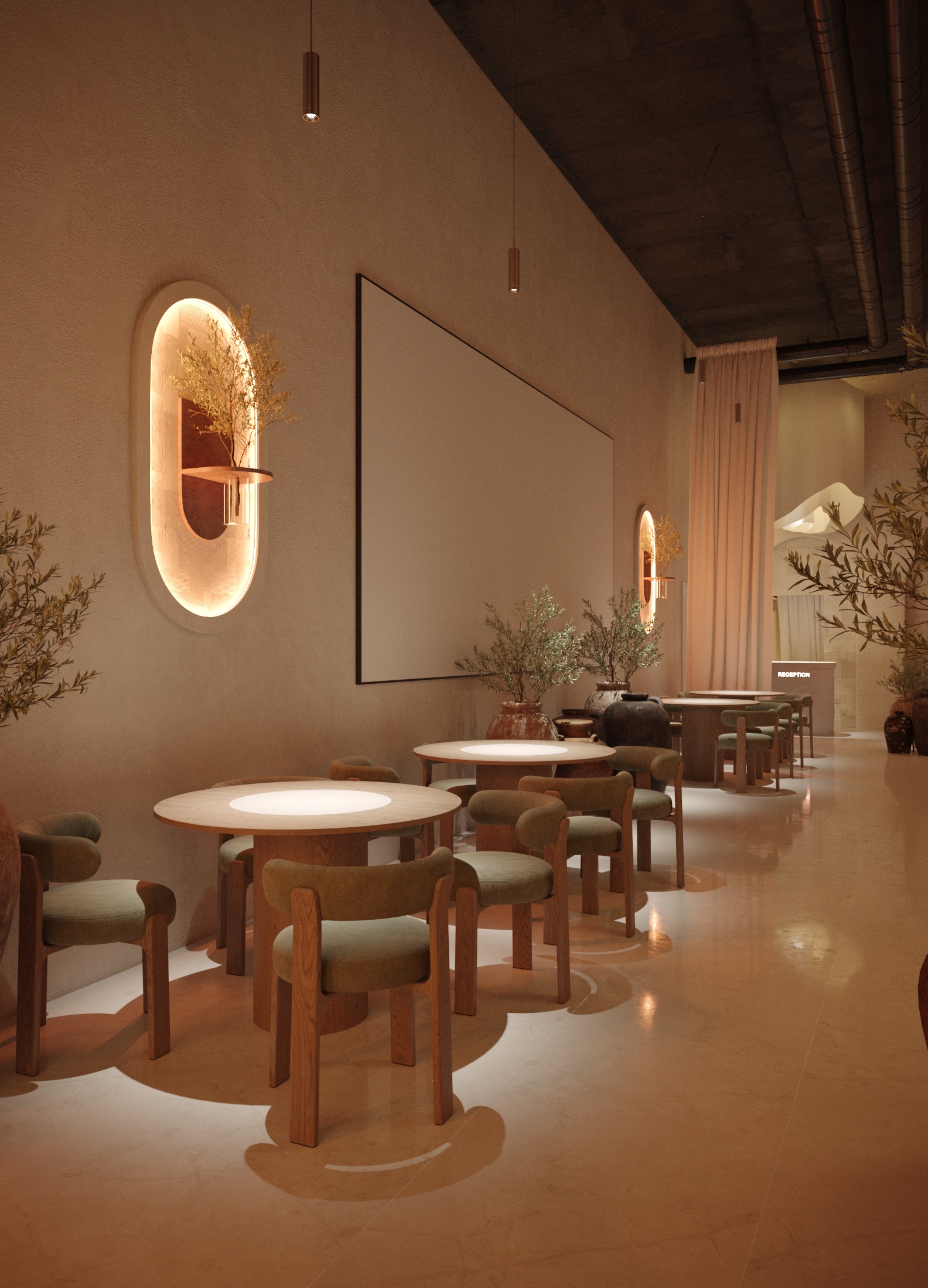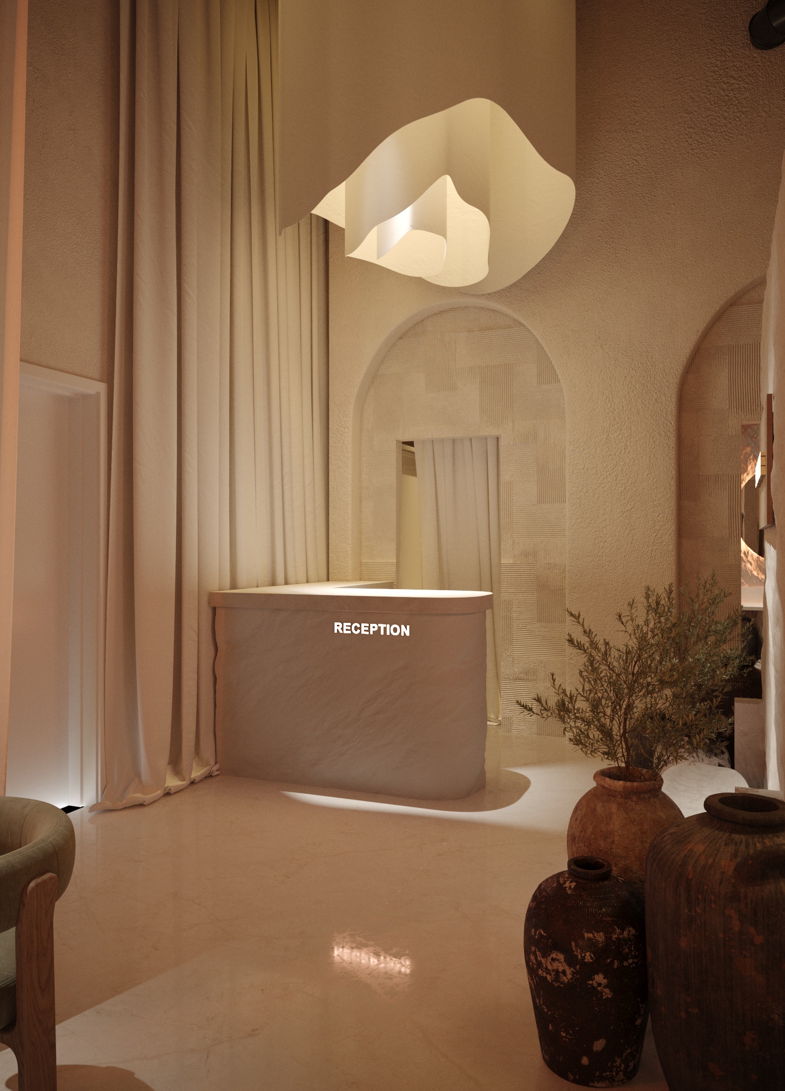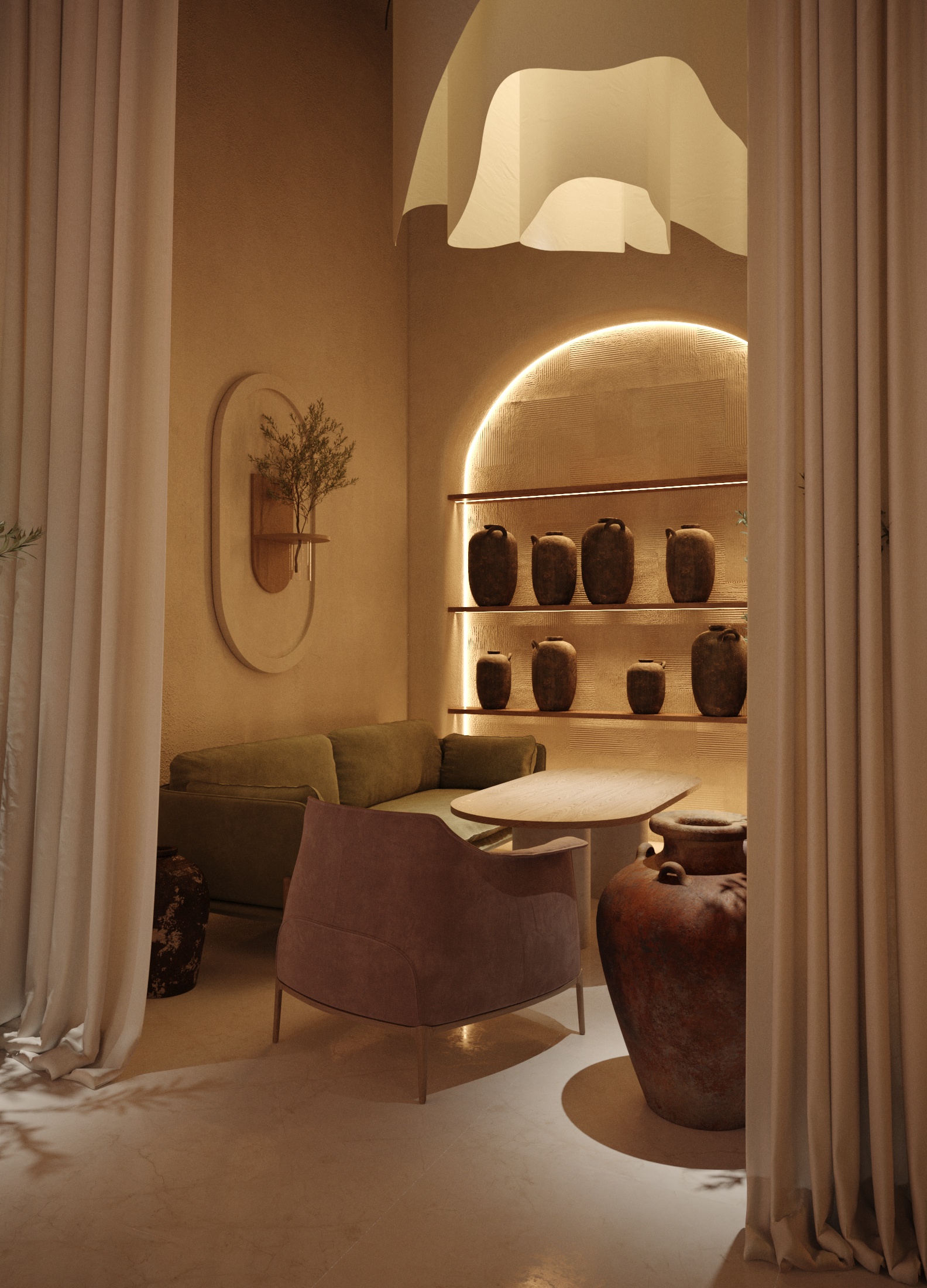 В основе концепции лежит идея «пространства дыхания»: бежевые оттенки, плавные формы и мягкий рассеянный свет формируют ощущение тишины и покоя. Светильники с тканевыми волнами добавляют воздушности, а природные акценты — растения и глиняные вазы — связывают интерьер с землёй.
